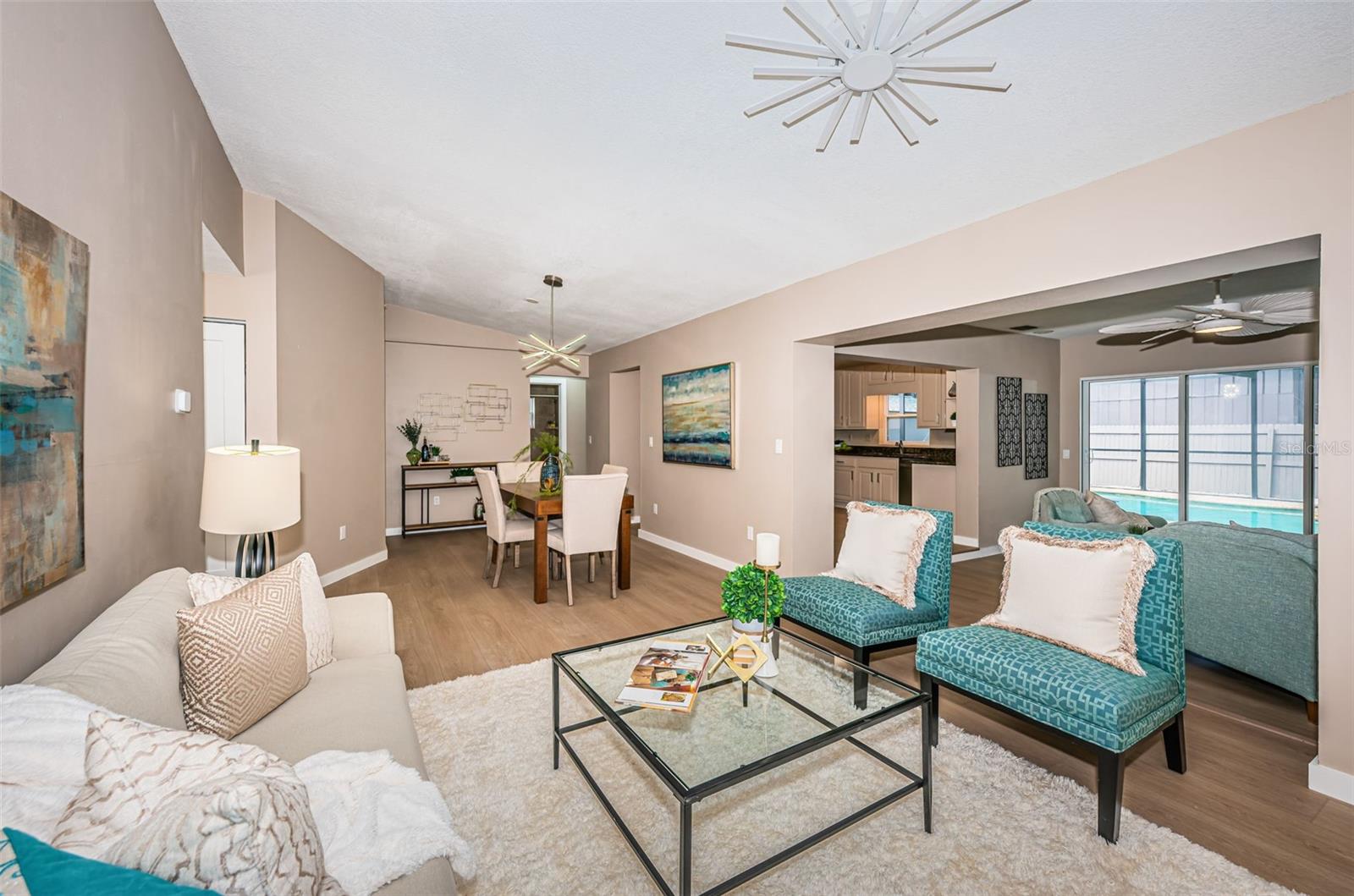Step into this impeccably upgraded pool home oasis, boasting exquisite turn-key living and an expansive driveway perfectly equipped for your RV or boat. This three-bedroom, two-bath retreat showcases a host of modern enhancements for a lifestyle of ease and convenience. Relish in the convenience of smart home features and sleek new light fixtures, complemented by the fresh flair of new paint and new flooring. The recent upgrades are endless: the electrical panel was installed in 2023, and a new roof from 2022 ensures peace of mind, while the recently upgraded air conditioning system from October 2021 promises cool comfort. Dive into Florida living with a beautiful, heated pool and spa (pump replaced in 2024), all enclosed in the expansive lanai, which is also home to the outdoor bar. In the cooler months, you can relish in outdoor/indoor living with the large sliders fully opening to connect the pool area to the rest of the home. The living room, kitchen, and dining room flow together, forming the home's centerpiece. The primary suite features a generous walk-in closet and an en-suite with a dressing area. The remaining two bedrooms and bathrooms sit on the far side of the home, creating a split-plan layout. Rrelish the convenience of a central Pinellas County location. Non-flood zone, proximity to US 19 places you minutes from the vibrant scenes of St. Petersburg and Tampa airports, the sandy shores of Clearwater Beach, and bustling Clearwater Mall. Seamless access to popular stores like Costco, Sam's Club, and Target rounds out this jewel's enviable lifestyle.