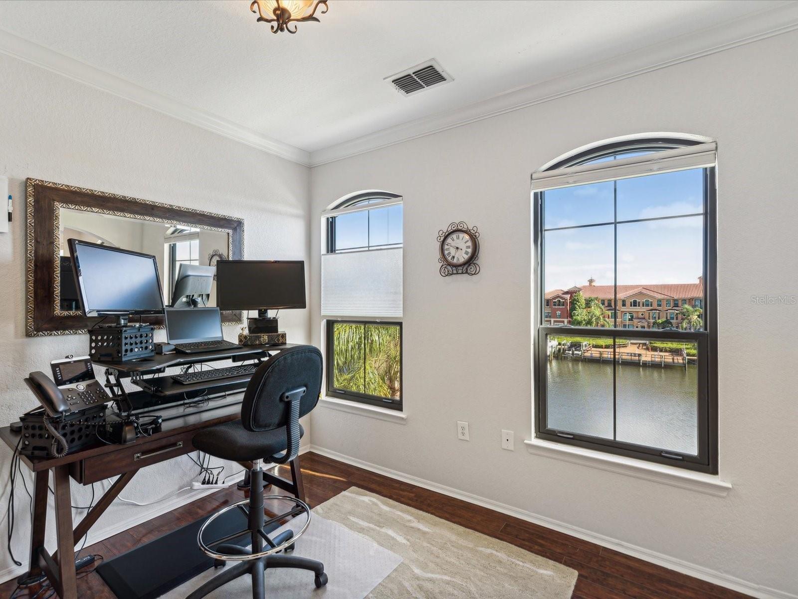 Waterfront resort-style condo on the bay at the desirable Grand Bellagio! And for you boating enthusiasts, a DEEDED BOAT SLIP is included in the sale (the dock/slip fee is included in the HOA fee listed). Serene VIEWS OF THE WATER from the family room, both bedrooms and the balcony! Watch for playful dolphins and manatees! The 3rd floor not only gives you privacy with no one above you, but also enhances that view. This 2 BR /2 Bath condo with 1-car garage even has a BONUS ROOM that would be great for an office/den or a 3rd bedroom. The kitchen boasts elegant granite countertops, complemented by tasteful white cabinets and a gas stove. Ample space is thoughtfully allocated for a cozy breakfast table, creating a welcoming area perfect for enjoying morning meals or casual gatherings The family room with great views of the water, has a gas fireplace for those cooler winter evenings and even a nice size dining room. The Master bedroom is enormous! Bright & beautiful, with windows overlooking the water and a large walk-in closet. Master bath was recently renovated and has a gorgeous walk-in shower, garden tub, and double sinks. There's a laundry closet in the condo for your convenience too. Crown molding adds to the charm of this gem. But the highlights of Grand Bellagio are in the amazing amenities! Featuring a clubhouse with heated pool and poolside cabanas, heated spa/sauna, fitness center, sand volleyball courts, lighted tennis courts, pickleball court, kayak launch points, 2 playgrounds, dog run, car wash/car care center and 24 hr. security. Take a morning or evening walk or jog on the 1.5 mile walking path along the waterfront. One of our favorite features is the community kayaks, ready for you to check out and hit the Old Tampa Bay right from the community! Live the Florida dream at this amazing waterfront resort, come see this condo today!