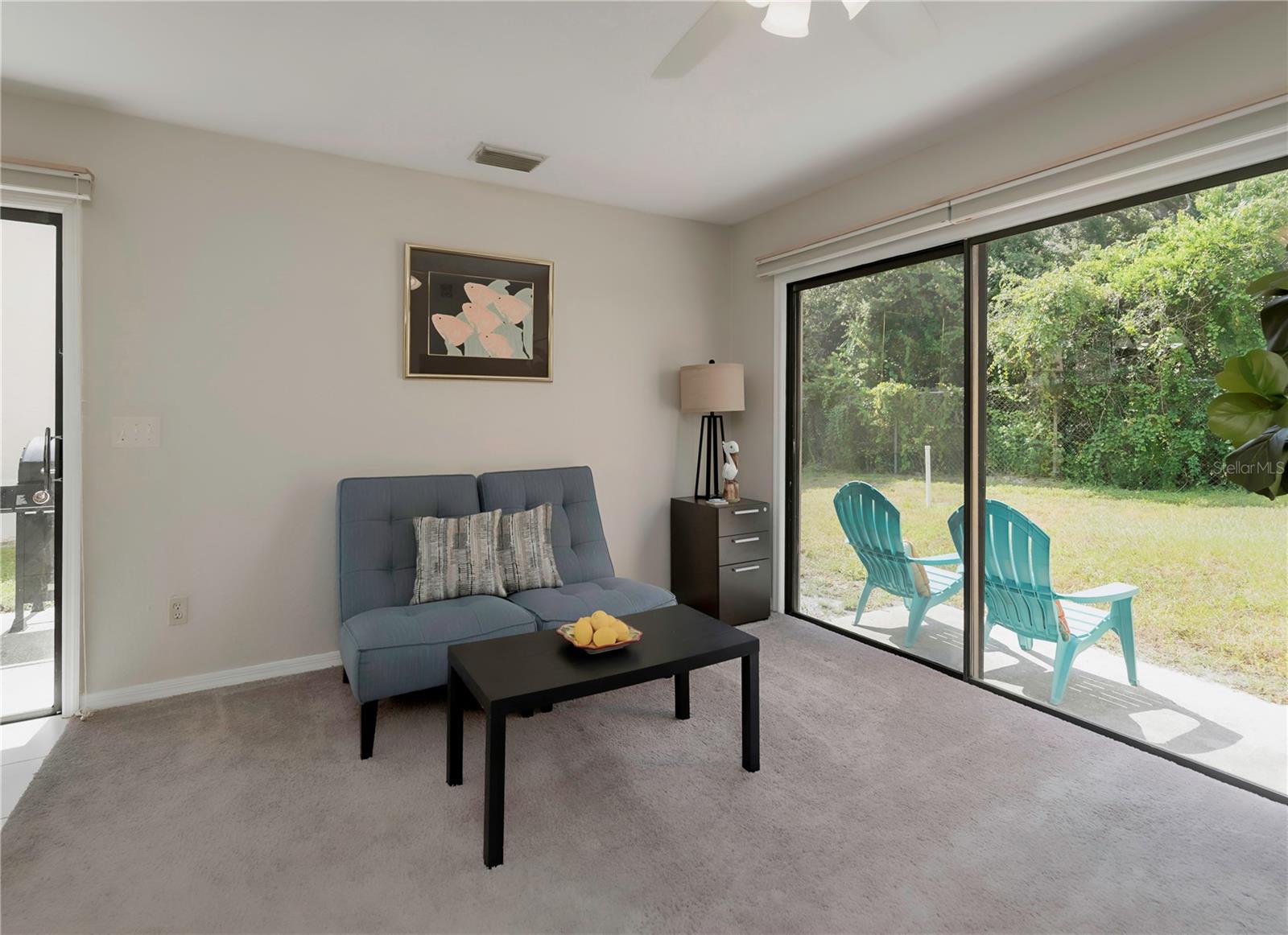 THIS PROPERTY IS NOT IN A FLOOD ZONE. NO FLOOD RISK IN THE FLOOD FACTOR MODEL. NON-EVACUATION ZONE. Welcome to the desirable “Brigadoon of Clearwater” Townhouse community, elevated and isolated among several city parks. HOA $170/month. This recently updated 1120 square-foot, 2 bedroom, 2.5 bath townhouse is a private end unit, with no rear neighbors and a 180-degree green-space in the backyard. Two separate living-rooms on the main floor, divided by the kitchen, leave the ability for the rear living-room to be converted into a third bedroom. Two sets of sliding-glass doors bring an abundance of light inside and opens your home directly into your own private, quiet, green-space which is perfect for outdoor-living, picnics, grilling and get-togethers. HOA fees of $170/month, includes all yard maintenance, sidewalk maintenance, trash, recycling and a heated, gated pool with a shower. This home has one designated parking space and plenty of guest parking spaces. Washer and dryer are included and the community is pet friendly. Cliff-Stephens Park, Kapok Park and the Ream-Wilson Trail are just outside your door; making activities like fishing, biking, jogging, walking, and disc golf easy. This home is centrally located, a 8-mile drive will take you to Clearwater Beach or a 14-mile drive will take you to Tampa International Airport. Downtown Tampa and St. Petersburg are easy to access with Highway 19 and Gulf to Bay Boulevard just outside the gates of Brigadoon. And the home is walkable to a bus stop which takes you to Clearwater Beach. The interior and exterior of the home have recently been painted, carpet has recently been installed, with like-new tile floors in the kitchen and baths. New Custom “Bali Blinds” cover both sets of sliding-glass doors in the second living room and kitchen, featuring UV-heat blocking technology. Wood Kitchen Cabinets made by “American Woodmark Corporation” bring pizazz to the kitchen, along with a new garbage disposal and ceiling fan in the living room. Upstairs you will find the main bathroom has a new bathtub and shower with new subway tile, floor tile, a Kohler toilet, and brushed-nickel Moen shower hardware. The primary bedroom boasts vaulted ceilings and an en suite bathroom with private shower alongside two large closets. Both the primary and secondary bedrooms are spacious and feature large closets and views of nature. The light-switches and doorknobs have been upgraded and a new surge-protector for the electric panel has recently been added. The plumbing water valves in all bathrooms and water valve outlet box to the washing machine have been upgraded as well.