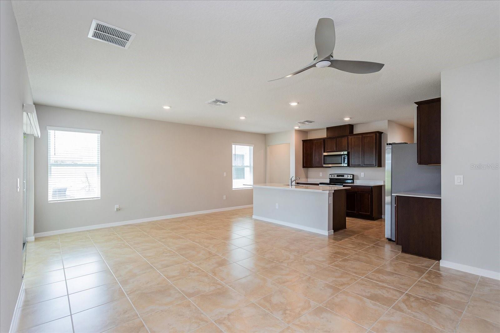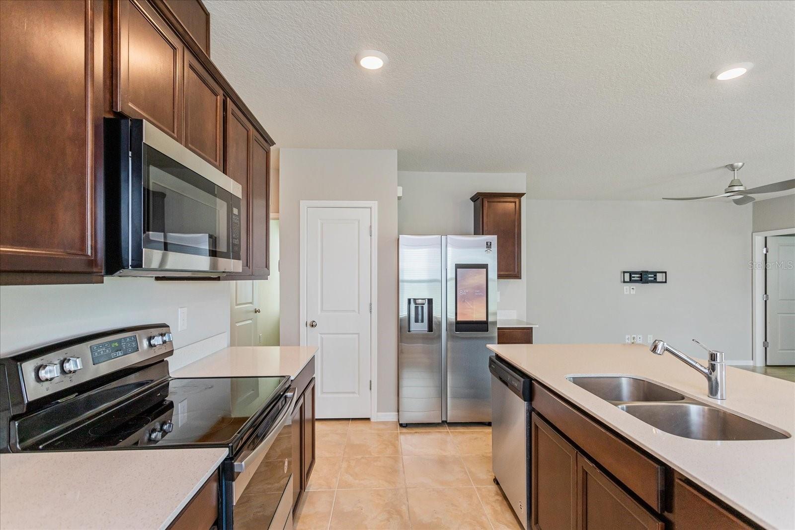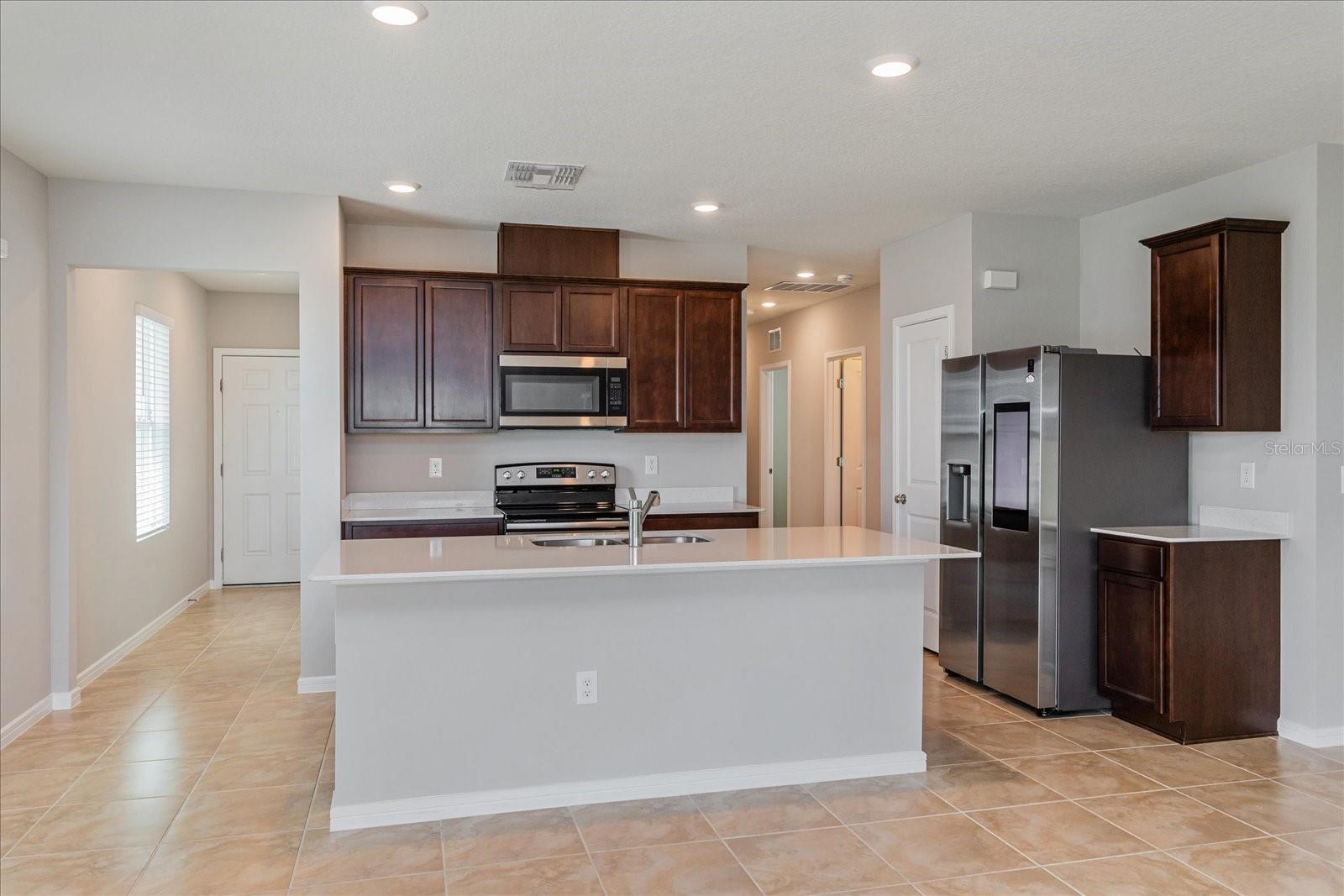 Welcome to your perfect retreat! This beautifully maintained single-story home, nestled in the highly sought-after Wellness Way area, offers convenient access to Schofield Rd, US 27, and HWY 429. Nature lovers will appreciate having Lake Louisa State Park just across the street, and you're only minutes away from the charm of Winter Garden, Disney World and the renowned Orange County National Golf Course. Enjoy the magical Disney fireworks from the comfort of your screened-in back lanai. Inside, you'll find stylish all-tile floors and sleek quartz countertops throughout. The home is energy-efficient, earning an EFL certification for reasonable electric bills. High-end Samsung appliances, including a touchscreen refrigerator and front-loading washer/dryer, are included—along with all window blinds. The two-car garage features a durable epoxy floor coating, and the pristine landscaping adds to the home’s curb appeal. The property is still covered under the builder's 10-year structural warranty and 5-year water intrusion warranty, giving you peace of mind. In this friendly community, you’ll find a resort-style pool with a cabana area, barbecue grills, and a playground for everyone to enjoy. With an HOA fee of only $77/month and no CDD, this home is priced to sell and ready for its new owners!