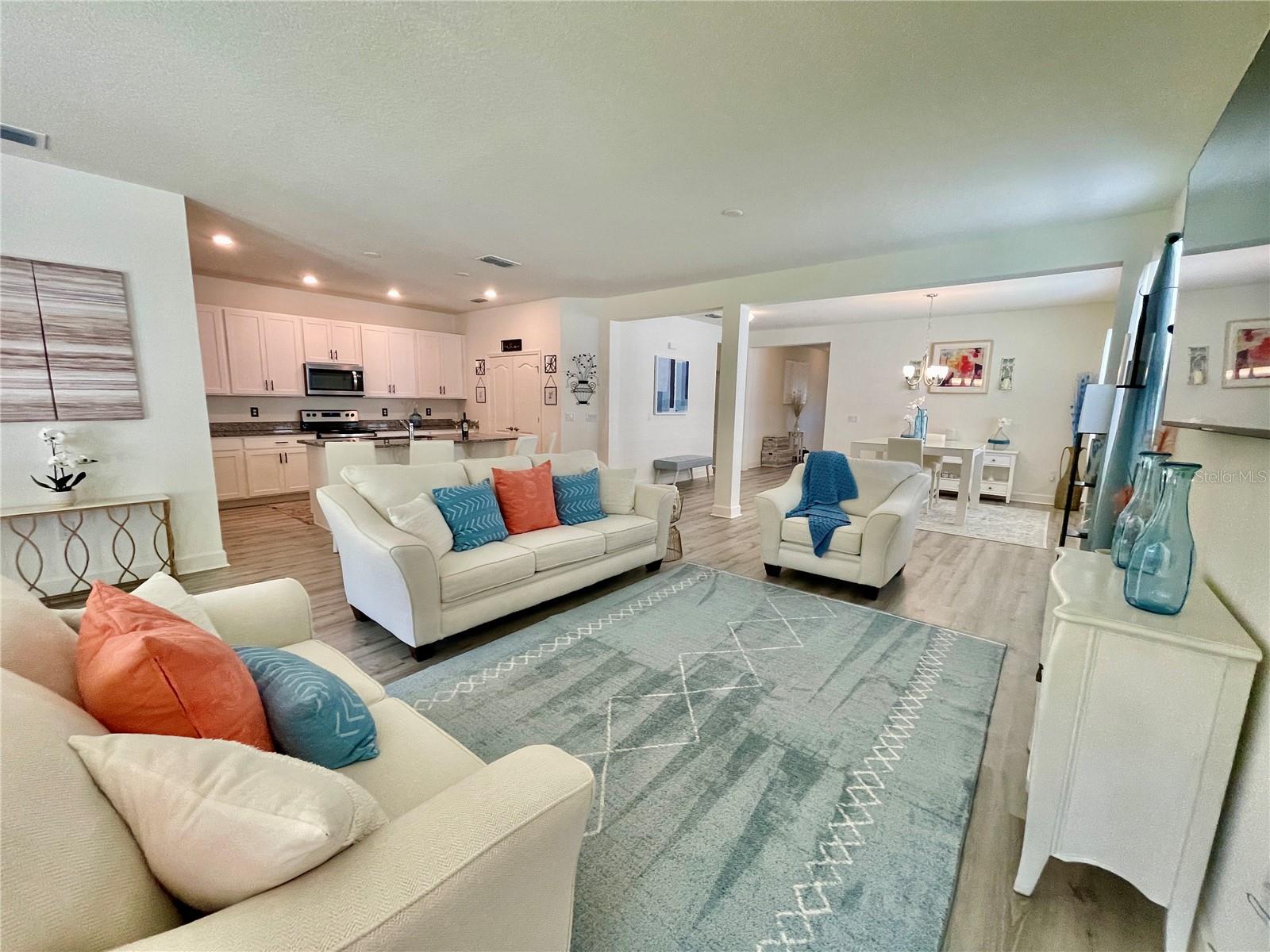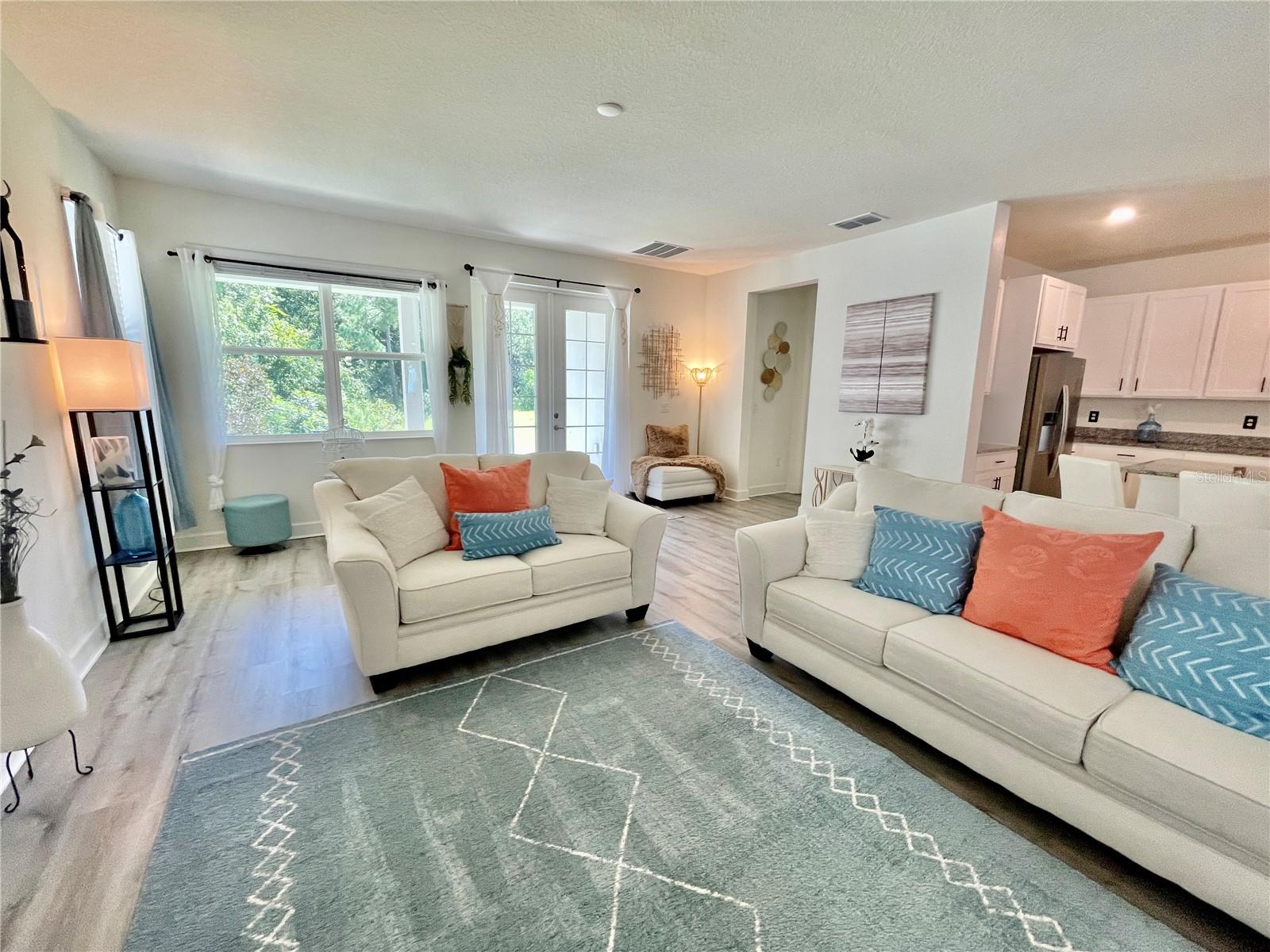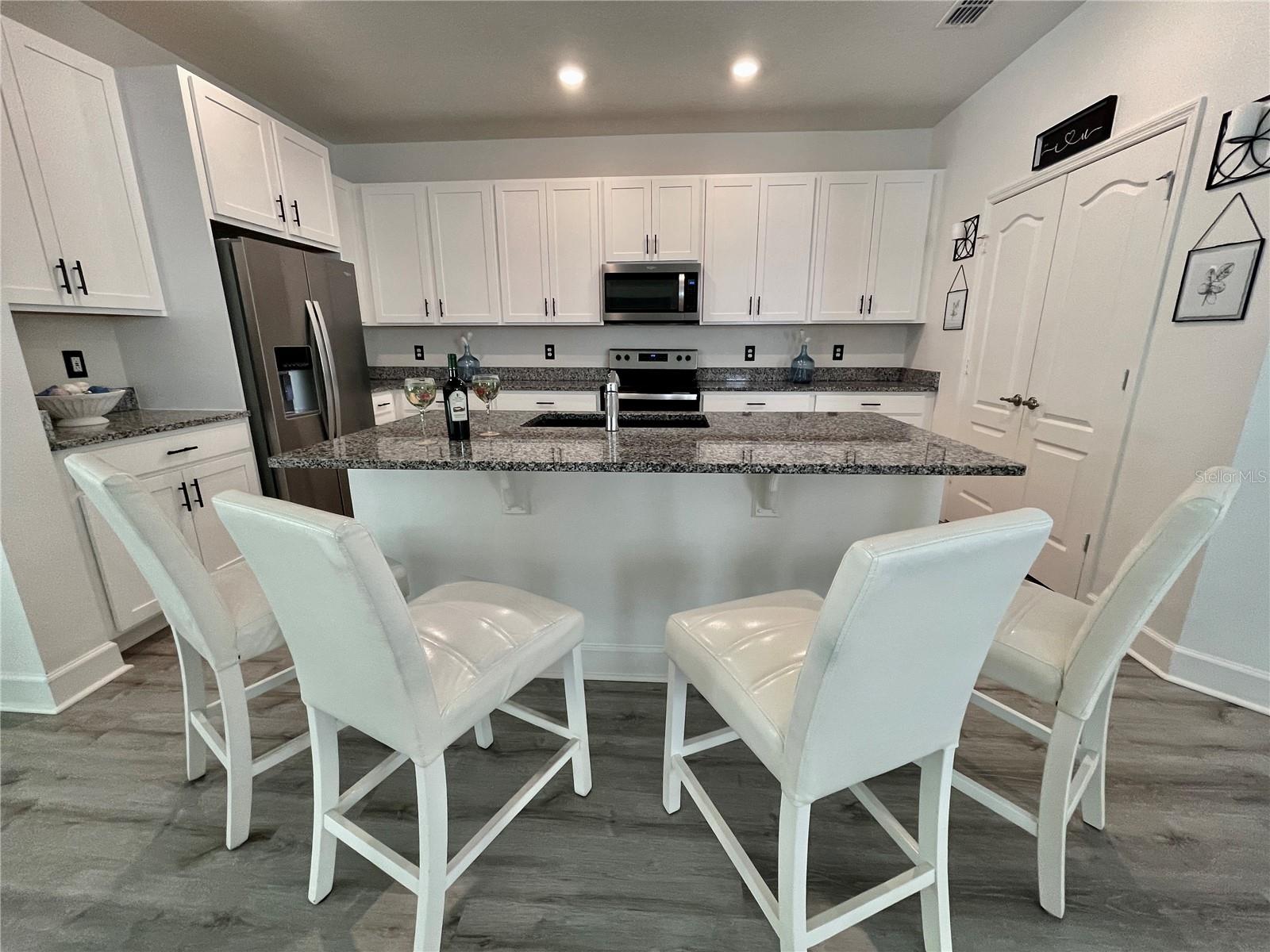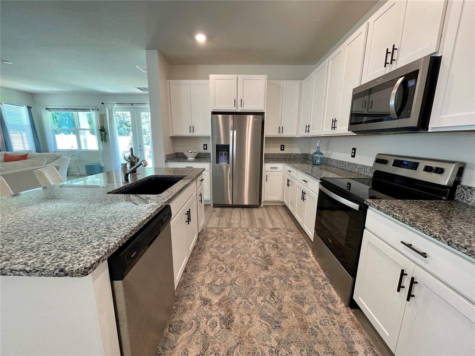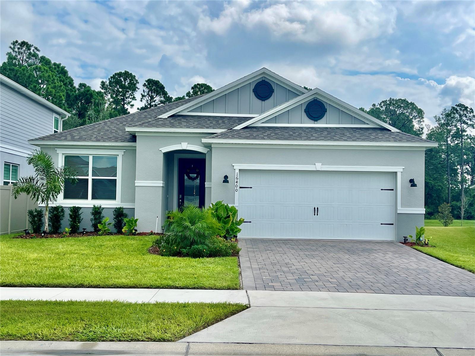 Welcome to this beautiful ranch-style home located in "The Sanctuary" community. This newly built property offers the luxury of modern construction without the inconvenience of a long wait. Constructed just two years ago, this immaculate 2022 property features 4 spacious bedrooms and 3 modern bathrooms, making it an ideal space for comfortable living. This gorgeous property features a spacious open floor plan with 9-foot ceilings, enhanced with stylish vinyl flooring. The modern and spacious kitchen provides ample cabinet storage, while the sleek granite countertops and stainless-steel appliances add a touch of sophistication to the space. The large island enhances the kitchen's functionality and provides an ideal space for meal preparation and casual dining. The exquisite primary suite is a tranquil oasis, boasting an opulent ensuite bathroom with dual sinks, a spacious walk-in shower, a luxurious garden tub, and a generously sized walk-in closet. The additional bedrooms are large and provide a cozy retreat for the entire family. The guest bedroom also has an attached bathroom for added convenience. Step outside through the elegant French doors onto the lanai and bask in the peaceful ambiance of the serene pond and lush green belt views, all while reveling in the privacy of having no rear neighbors. Conveniently located in the southern part of Clermont, this property offers easy access to various shopping and dining options, medical clinics, and hospitals. Additionally, it is only a few minutes away from the renowned Walt Disney World and Universal Studios, as well as the Turnpike and I-4. Eastern and Western Florida beaches are within a 1 ½ hours drive. The Sanctuary Community is putting the finishing touches on its fantastic array of amenities, including a state-of-the-art workout facility, a refreshing pool, a delightful tot lot, and a spacious dog park. It's everything you could ever want for a vibrant and active lifestyle! Don't miss out on the chance to make this extraordinary property your new home and experience the essence of relaxed and peaceful living!