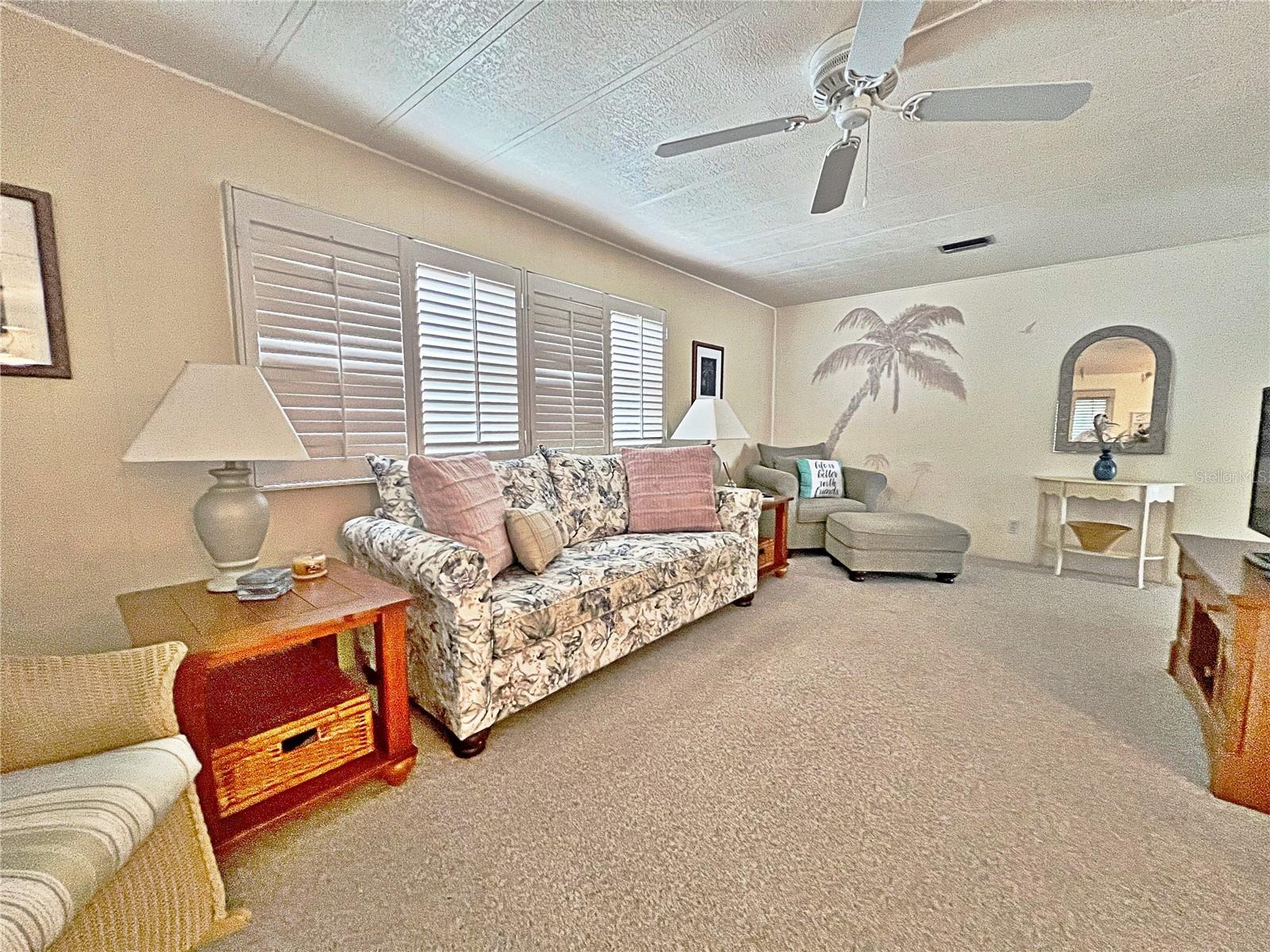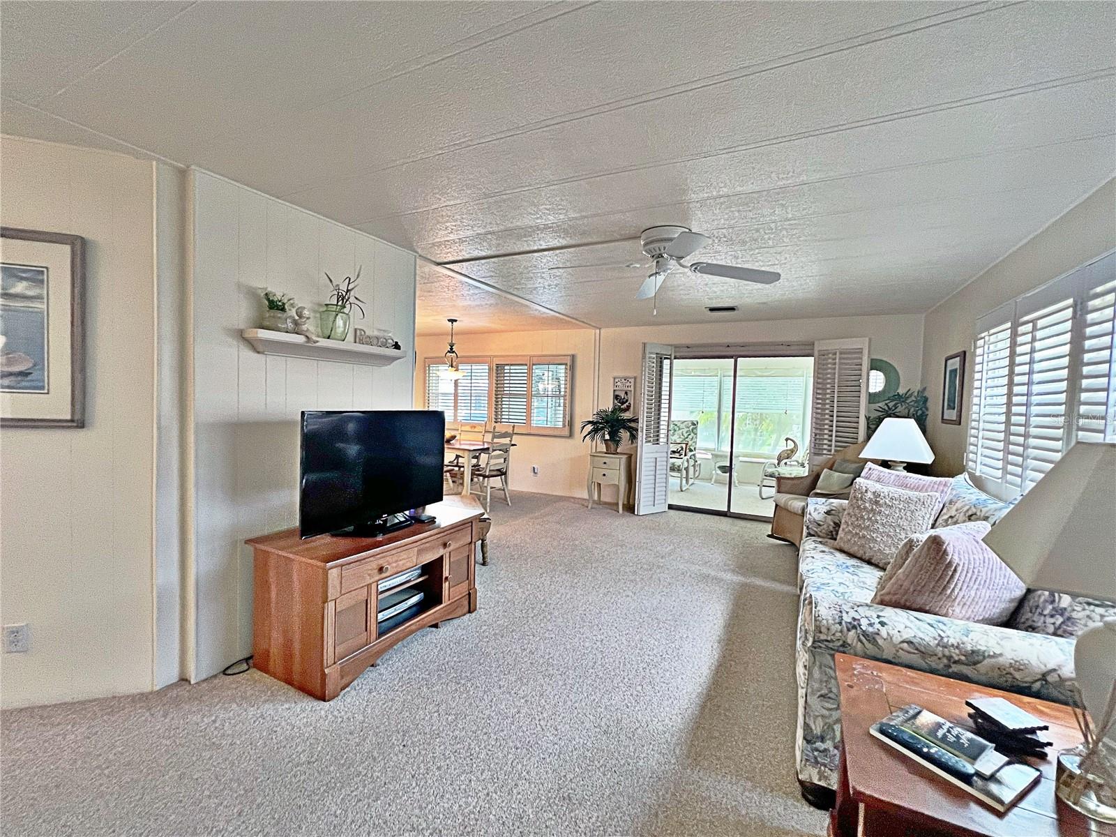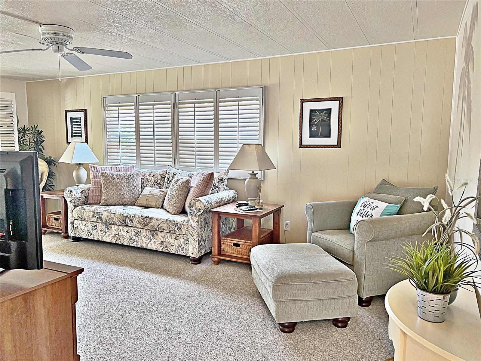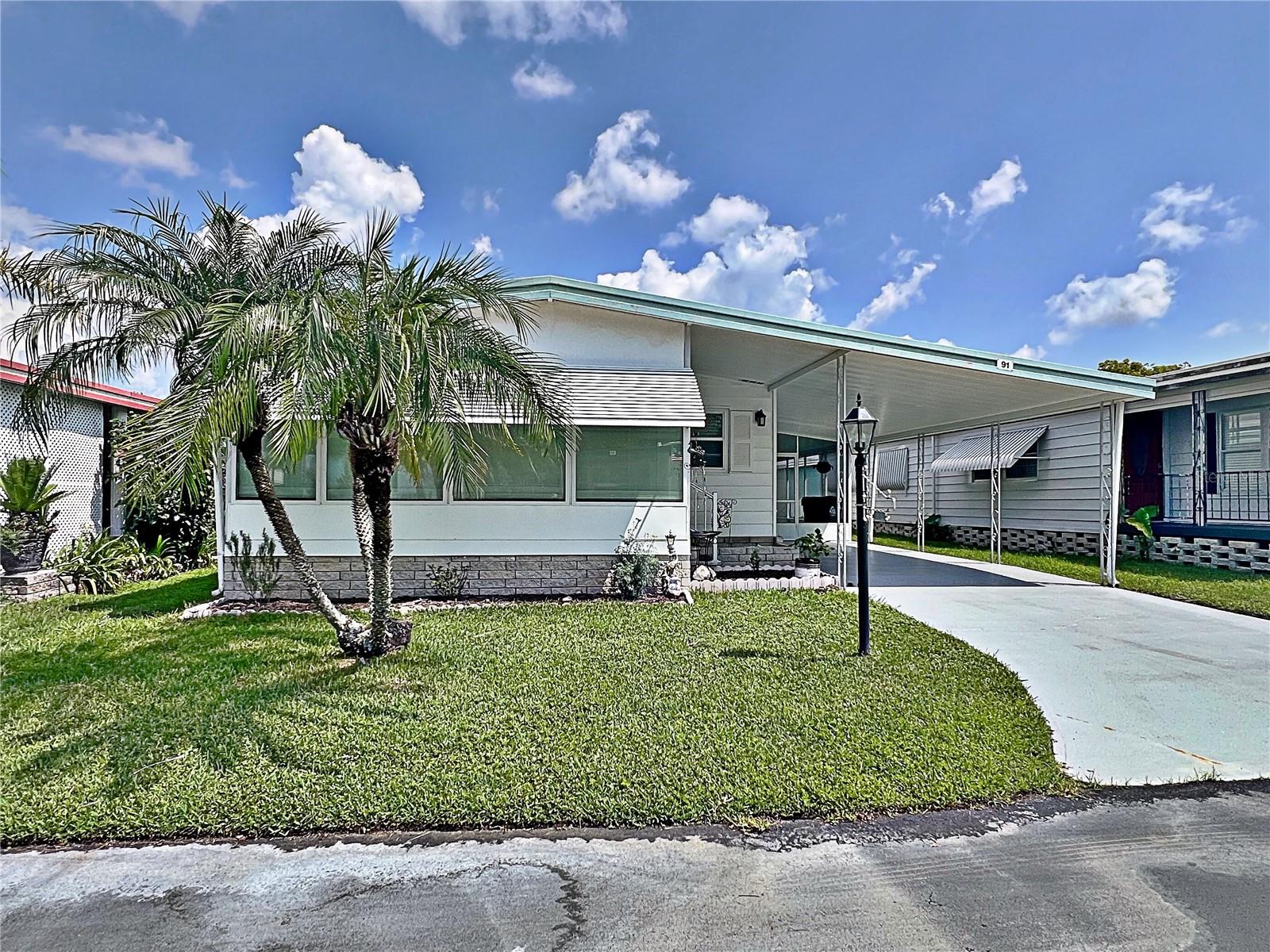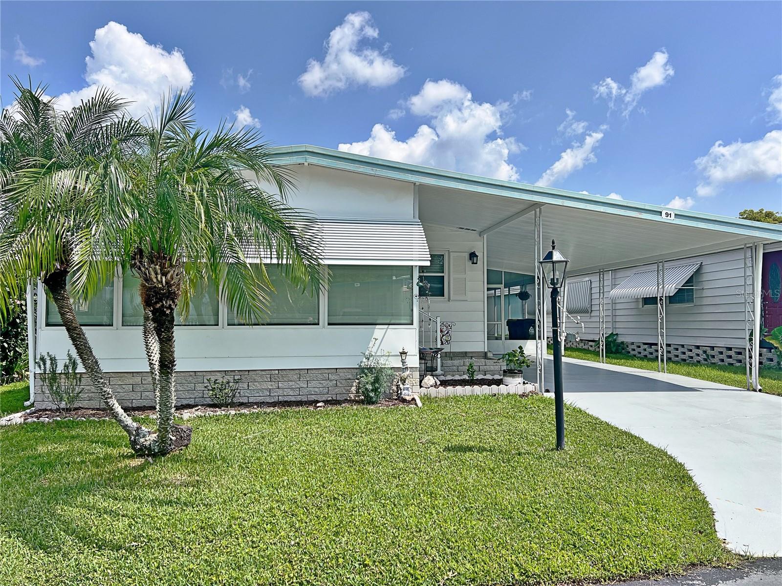 This FURNISHED 2/2 with carport is MOVE-In ready. This home is located in Emerald Lakes. Welcome guests into your home through the front covered and enclosed Lanai or enjoy coffee and conversing with friends on the front Lanai. The sliding glass doors guide you into the main home and into the Living room. The whole house features PlANTATION shutters. The Living room is off the side entry and Dining room and is very open. The Dining room has BUILT IN cabinets to display your wares of choice or use as a Buffet. The Kitchen has BAR top seating. The Primary European. Has a en suite bathroom with walk shower, oversized linen closet and walk in closet. There is a side screened in area to enjoy the outside and entertain guests. Laundry is located outside in its own laundry room with a sink. The AC was replaced in 2023, Water heater in 2024. This Lot has SHARE OWNERSHIP and the HOA includes water, cable, internet, clubhouse, shuffle board, community pool and hot tub, boat ramp, boat dock lease options and so much more.