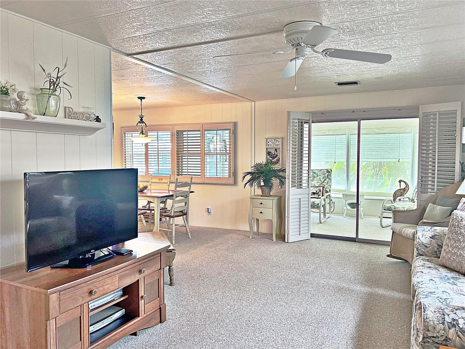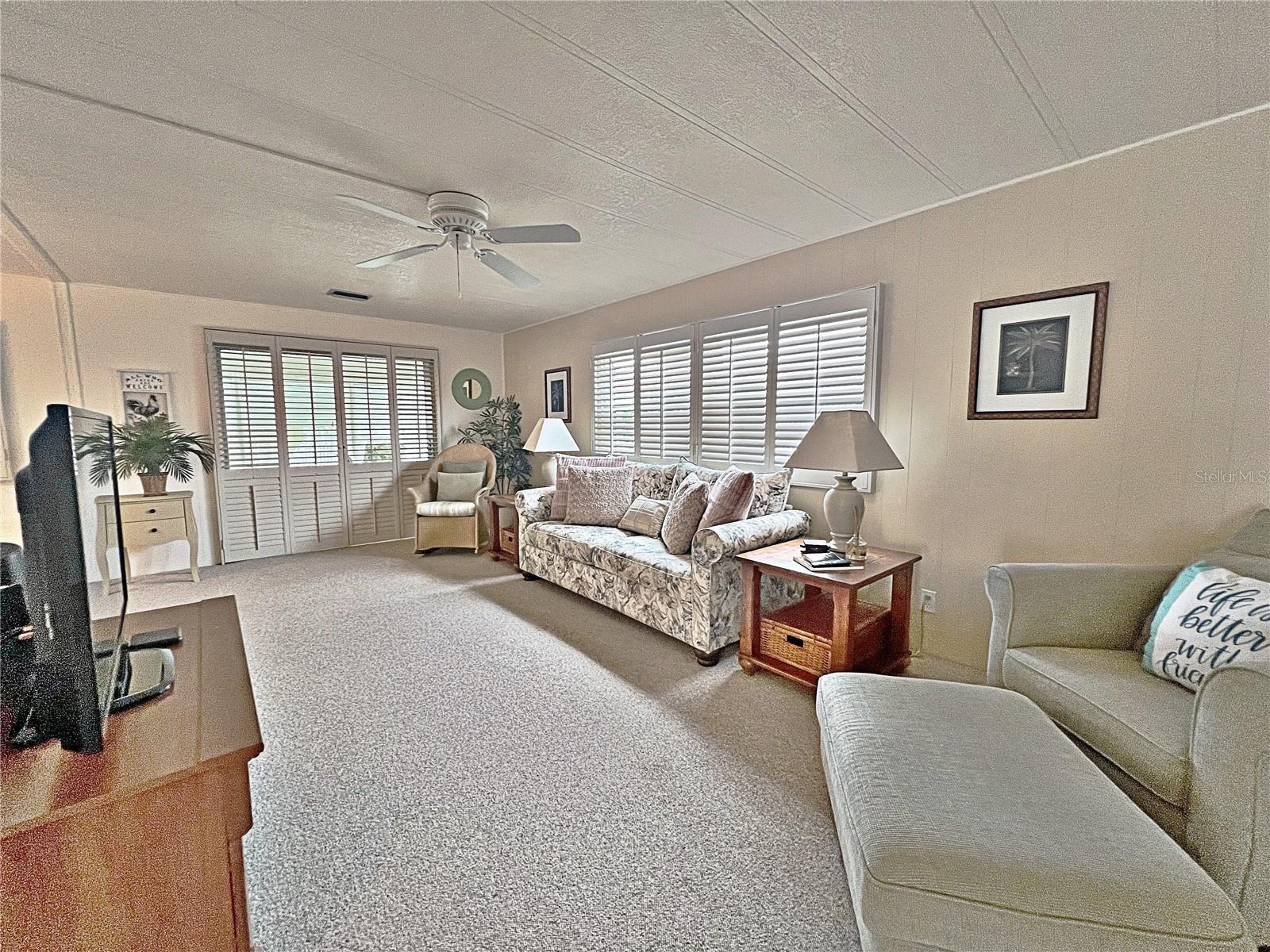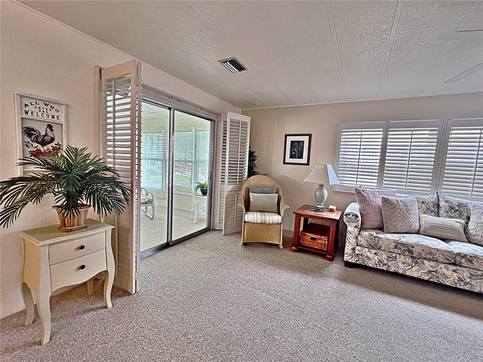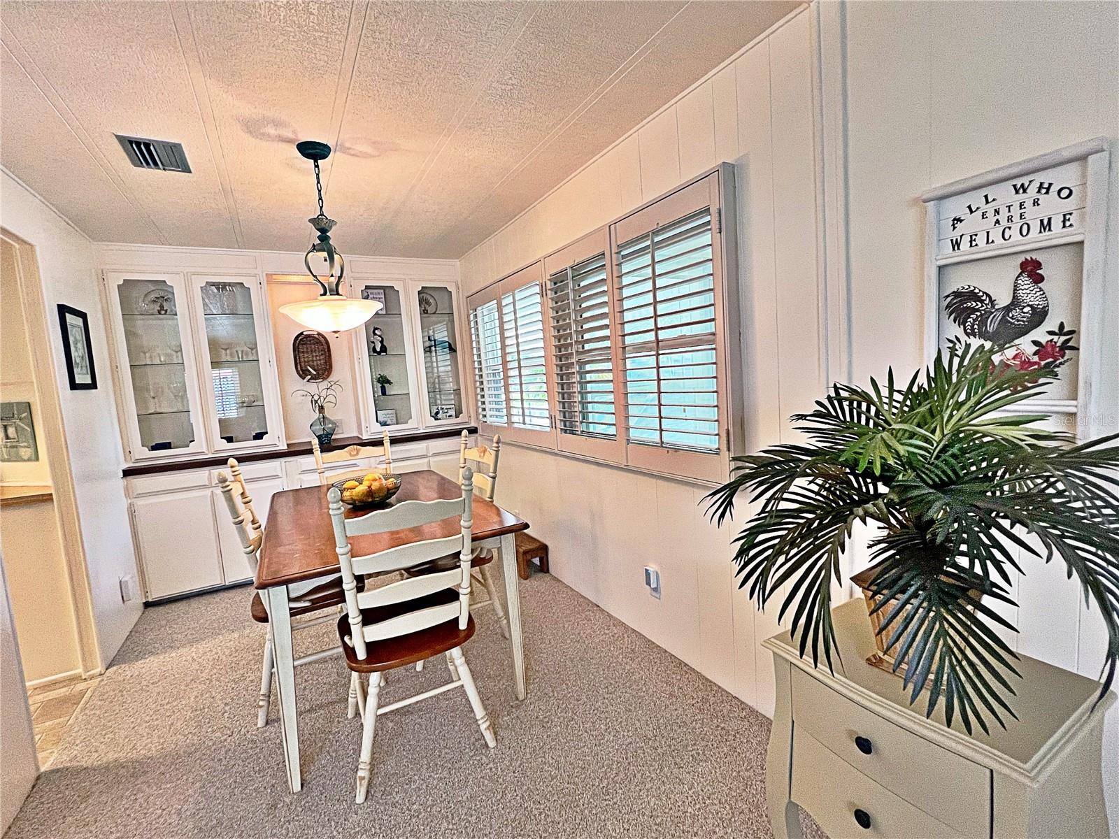 This FURNISHED 2/2 with carport is MOVE-In ready. This home is located in Emerald Lakes. Welcome guests into your home through the front covered and enclosed Lanai or enjoy coffee and conversing with friends on the front Lanai. The sliding glass doors guide you into the main home and into the Living room. The whole house features PlANTATION shutters. The Living room is off the side entry and Dining room and is very open. The Dining room has BUILT IN cabinets to display your wares of choice or use as a Buffet. The Kitchen has BAR top seating. The Primary European. Has a en suite bathroom with walk shower, oversized linen closet and walk in closet. There is a side screened in area to enjoy the outside and entertain guests. Laundry is located outside in its own laundry room with a sink. The AC was replaced in 2023, Water heater in 2024. This Lot has SHARE OWNERSHIP and the HOA includes water, cable, internet, clubhouse, shuffle board, community pool and hot tub, boat ramp, boat dock lease options and so much more.