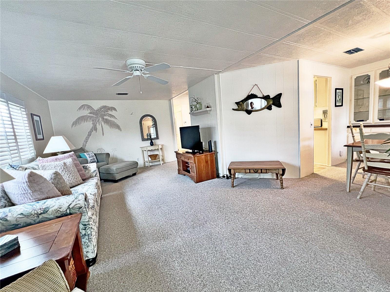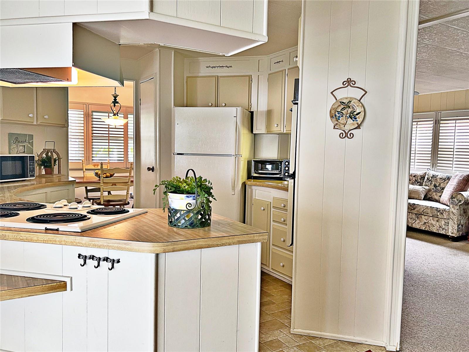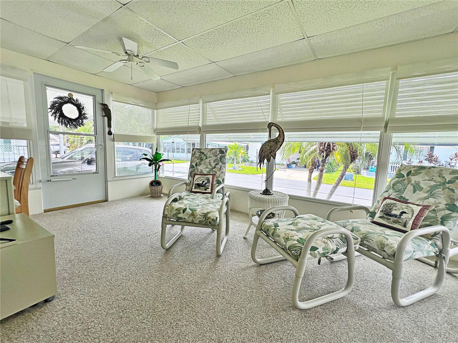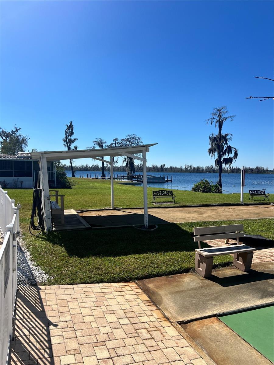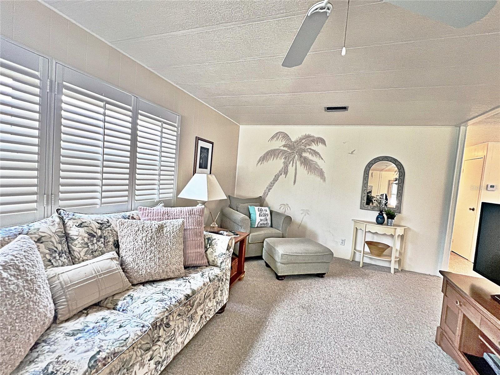 This FURNISHED 2/2 with carport is MOVE-In ready. This home is located in Emerald Lakes. Welcome guests into your home through the front covered and enclosed Lanai or enjoy coffee and conversing with friends on the front Lanai. The sliding glass doors guide you into the main home and into the Living room. The whole house features PlANTATION shutters. The Living room is off the side entry and Dining room and is very open. The Dining room has BUILT IN cabinets to display your wares of choice or use as a Buffet. The Kitchen has BAR top seating. The Primary European. Has a en suite bathroom with walk shower, oversized linen closet and walk in closet. There is a side screened in area to enjoy the outside and entertain guests. Laundry is located outside in its own laundry room with a sink. The AC was replaced in 2023, Water heater in 2024. This Lot has SHARE OWNERSHIP and the HOA includes water, cable, internet, clubhouse, shuffle board, community pool and hot tub, boat ramp, boat dock lease options and so much more.