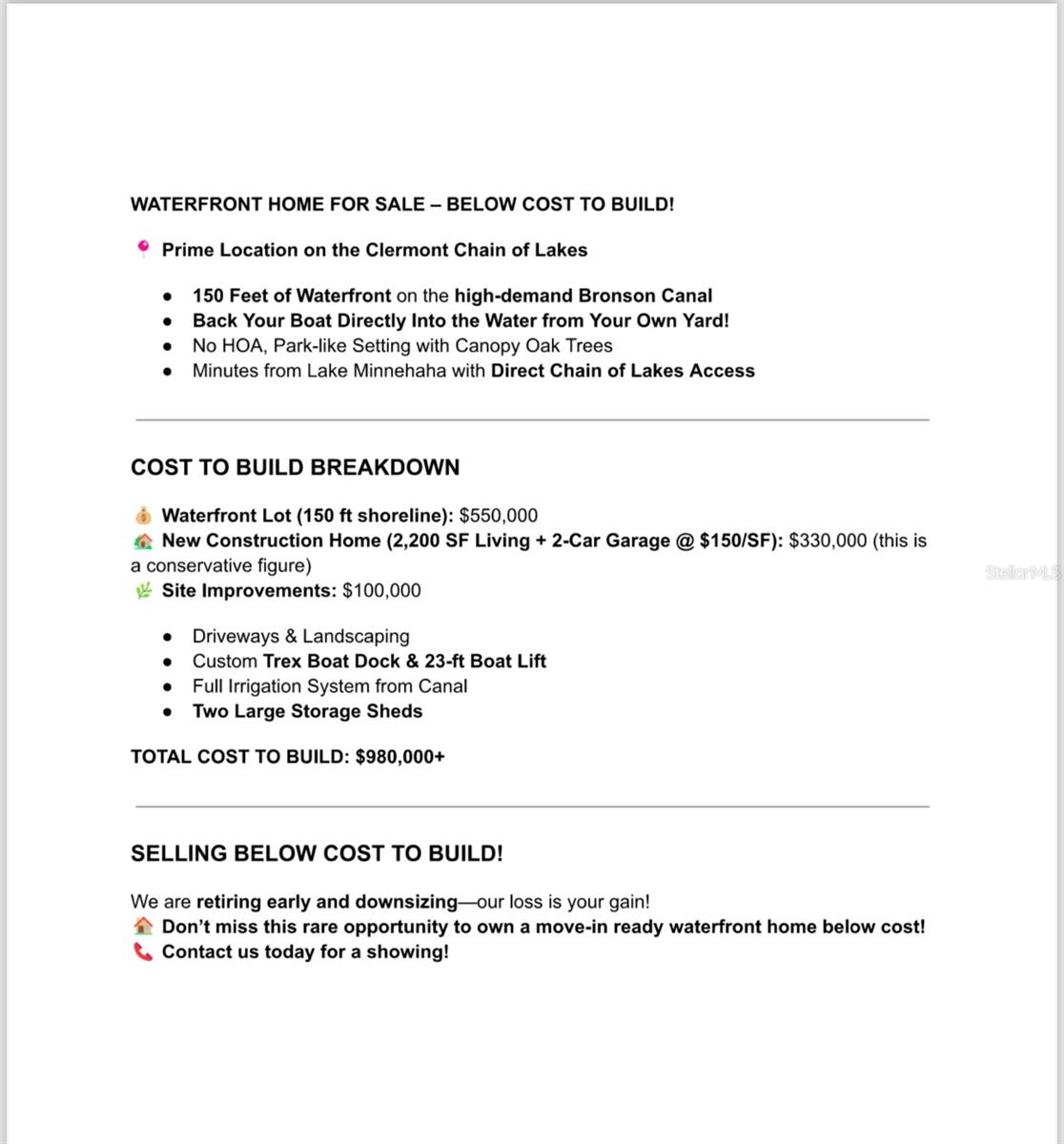 PRICED TO SELL!!! RARE FIND! No HOA – Back your boat into the Bronson Canal on the Clermont Chain of Lakes from your own backyard! Lake Minnehaha is just one house away!Step into a world of luxury and tranquility with this captivating waterfront property on the most sought-after canal of the Clermont Chain of Lakes. This classic 3-bedroom, 2-bath brick home, with 2,200 sq ft of elegant living space, offers the largest and closest waterfront on the canal with 150 feet of pristine shoreline. Imagine the freedom of no HOA, where you can launch your boat from your own backyard and soak in the serene beauty of the canopy oak trees. This is more than a home; it’s a dream come true.Key Features: Boater’s Paradise: Enjoy direct access from your backyard with a new Trex dock, 23 ft boat lift, and a 3-kayak stand. Entertainer’s Dream: Host gatherings for up to 75 guests in a park-like setting beneath the shade of majestic canopy oak trees. Spacious and Upgraded: Complete remodel includes new drywall, electrical, interior/exterior paint, high-end stainless kitchen appliances, granite countertops, new flooring, ceiling fans, custom blinds, new roof, vinyl fencing, double-insulated attic area above the house and garage, new interior doors, and all new trim work. Extra Storage: Two large storage sheds for all your tools and outdoor equipment. Attached 2.5-Car Garage: Plenty of space for vehicles, storage, or a workshop. Exclusive Perks: Private irrigation system from the canal (no water bill!), and a full RV port with power and water hookups. This meticulously remodeled home offers everything you need for a luxurious lakeside lifestyle. Don’t miss your chance to own this entertainer’s paradise!