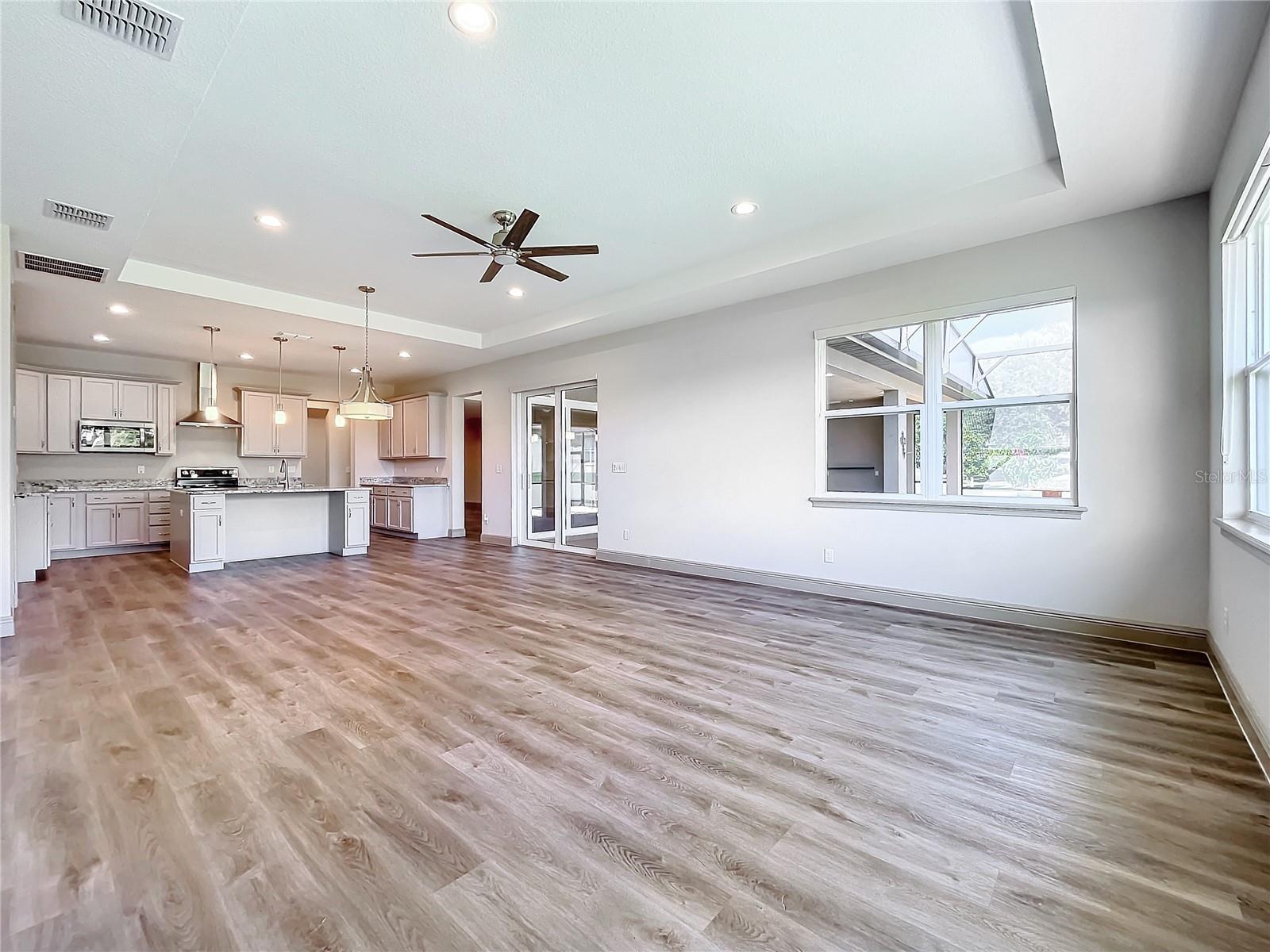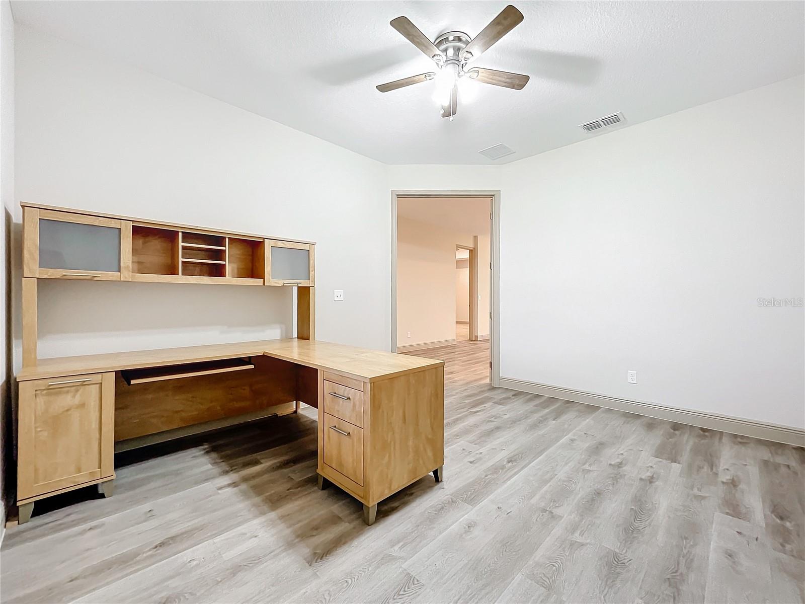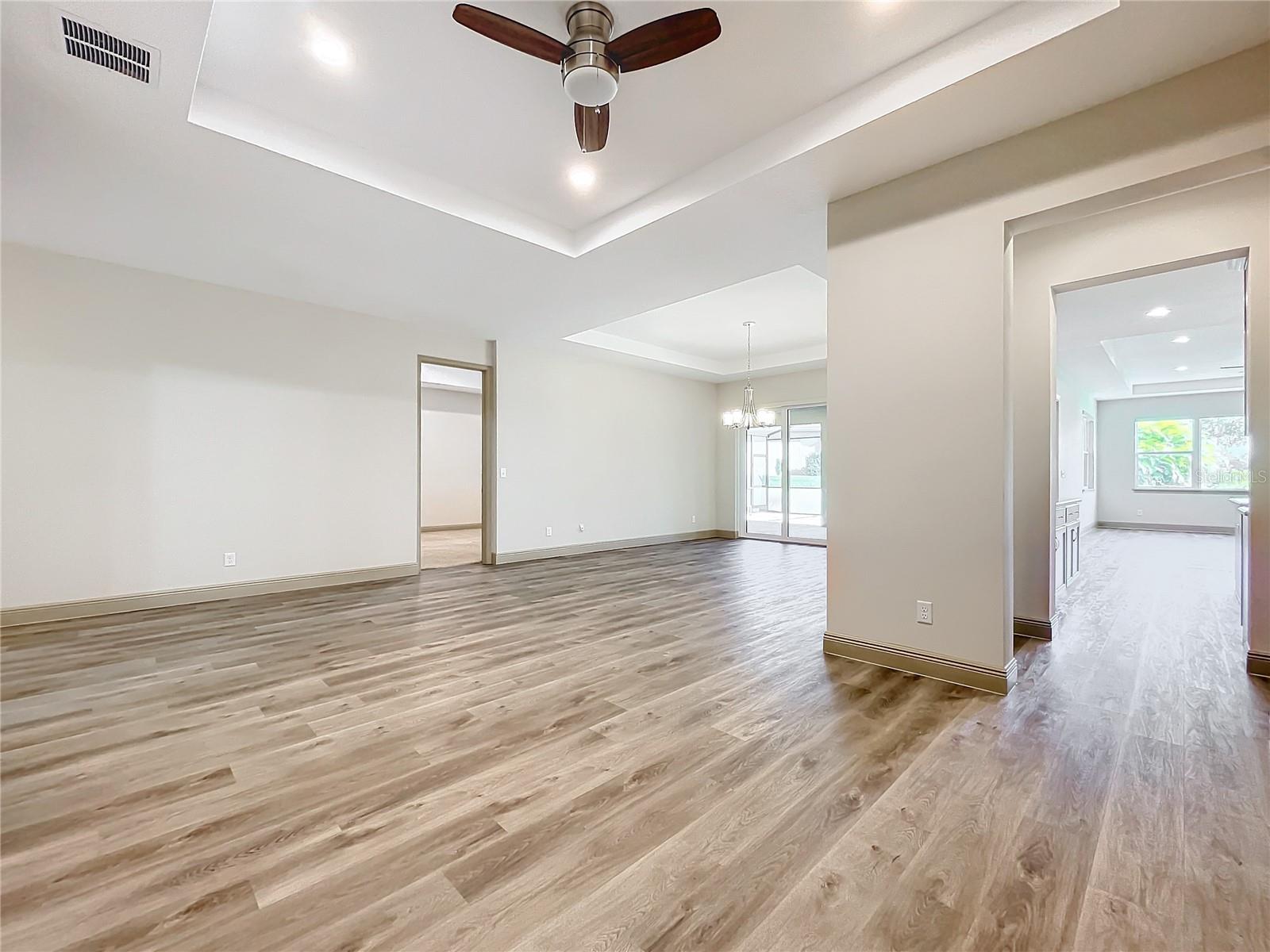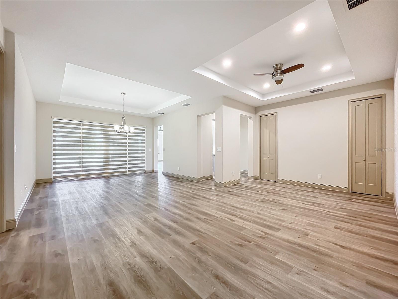 Welcome to this unique extra-large corner semi-custom home featuring four spacious bedrooms and three full bathrooms on a 0.41-acre corner lot. This home offers a blend of luxury and comfort with a versatile office/den, a two-car garage, and additional golf cart or jet ski space. Inside, you'll find luxury vinyl flooring throughout the house, except in the four carpeted bedrooms, glass French doors in the office/den, and ceiling fans. The family room boasts a tray ceiling, ceiling fans, and sliding glass doors leading to a stunning lanai. The kitchen has granite countertops, an island, a double oven range, pendant lighting, abundant cabinet space, a large pantry, and a breakfast bar with an eat-in nook. All bedrooms feature ceiling fans and plantation shutters, with roller shades throughout the rest of the house. The primary suite has a ceiling fan, tray ceiling, his and hers walk-in closets, and an ensuite bathroom with dual sinks, a large shower, a linen closet, and a water closet. The additional bedrooms are carpeted with ceiling fans and spacious closets. Bathroom two has a granite countertop and a tub/shower combo, while bathroom three features a granite countertop and a standalone shower. The extended, covered, and screened lanai has brick pavers and ceiling fans, while the front porch is also screened for added comfort. The garage has an insulated block wall and door with AC installed on the ceiling to maximize space. The laundry room includes a tub and ample shelving. The landscaping is upgraded with various fruit trees, including avocado, lemon, tangerine, mango, and more. The community offers an expansive clubhouse, a private boat ramp, a fishing pier, a playground, a pool, and courts for tennis, pickleball, and basketball. Also, the HOA fee includes the internet and basic cable for up to 3 TVs. Conveniently located close to Downtown Clermont, shopping centers, schools, and major highways, this home offers both luxury and practicality. Schedule your appointment today and make this dream home yours!