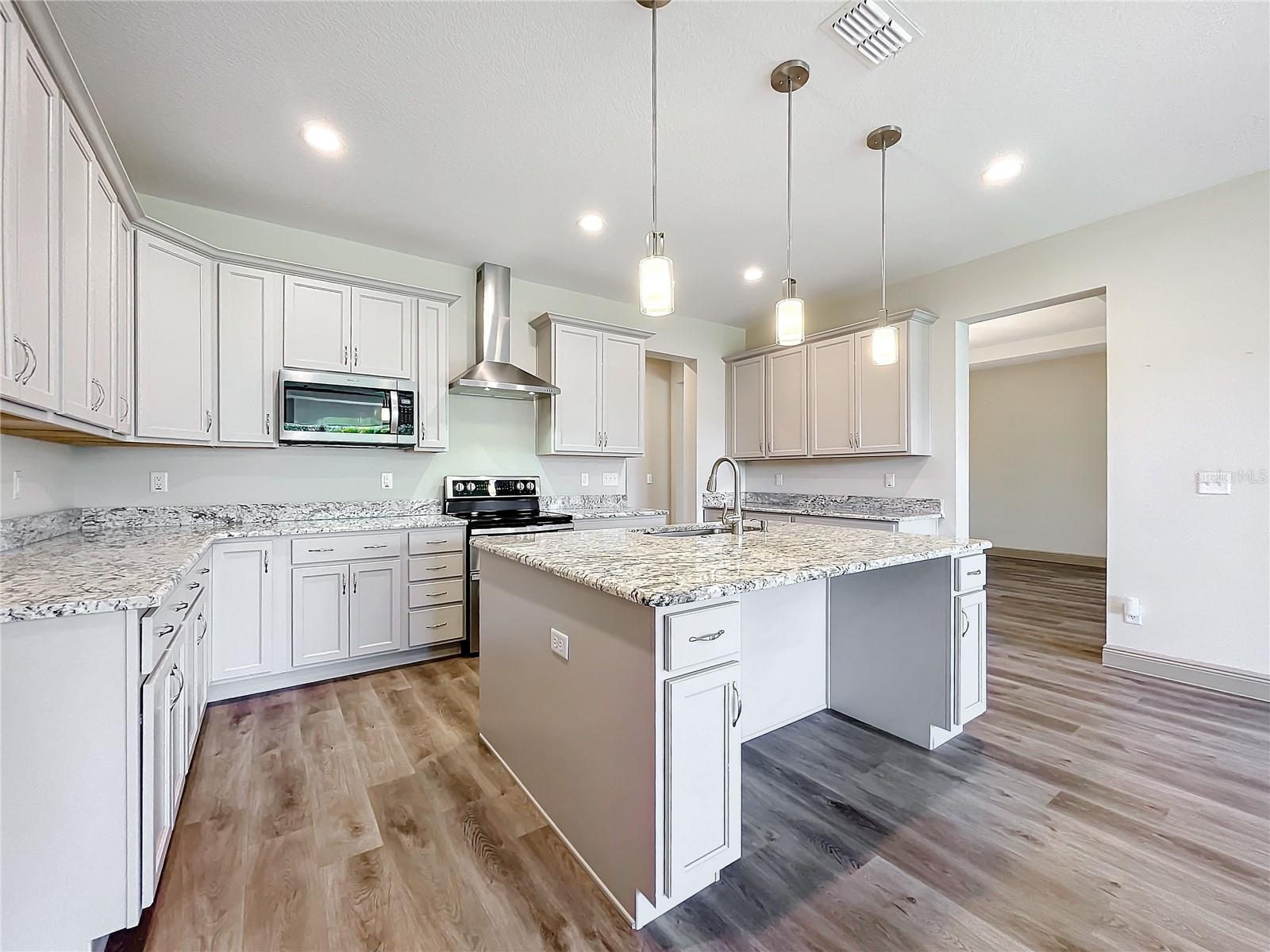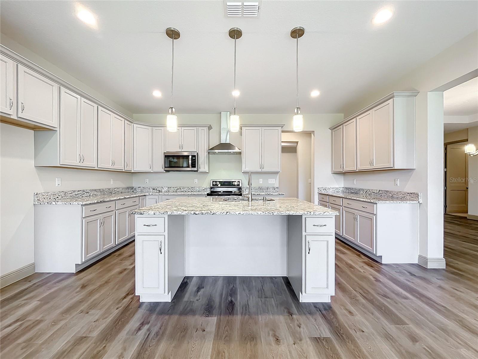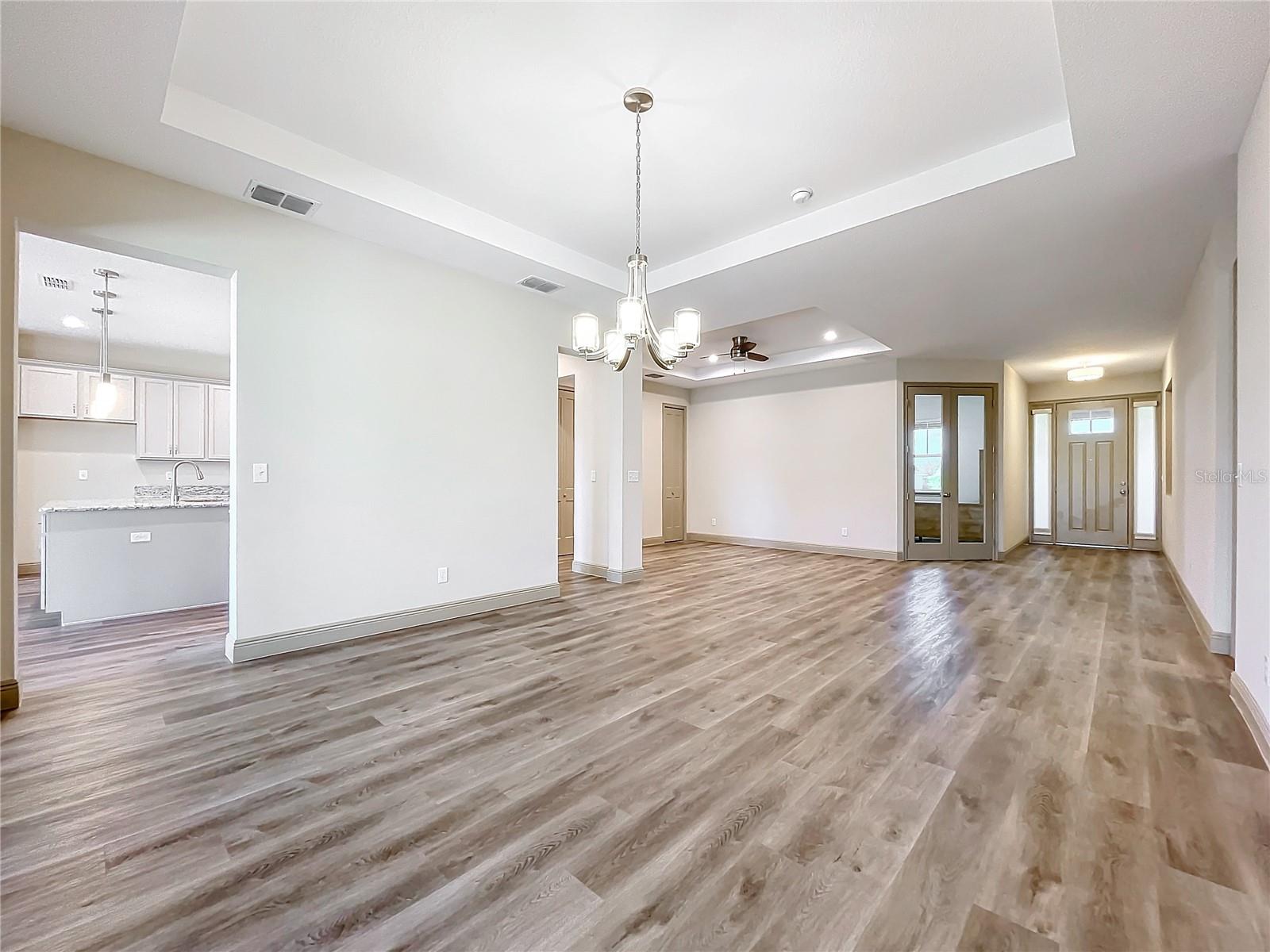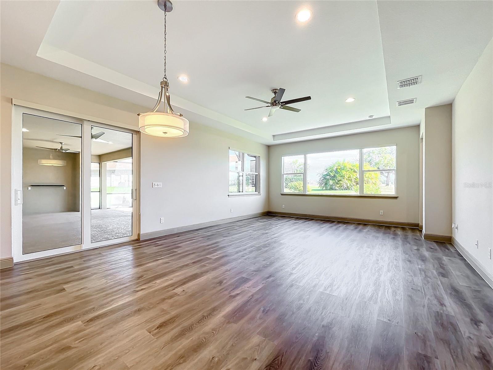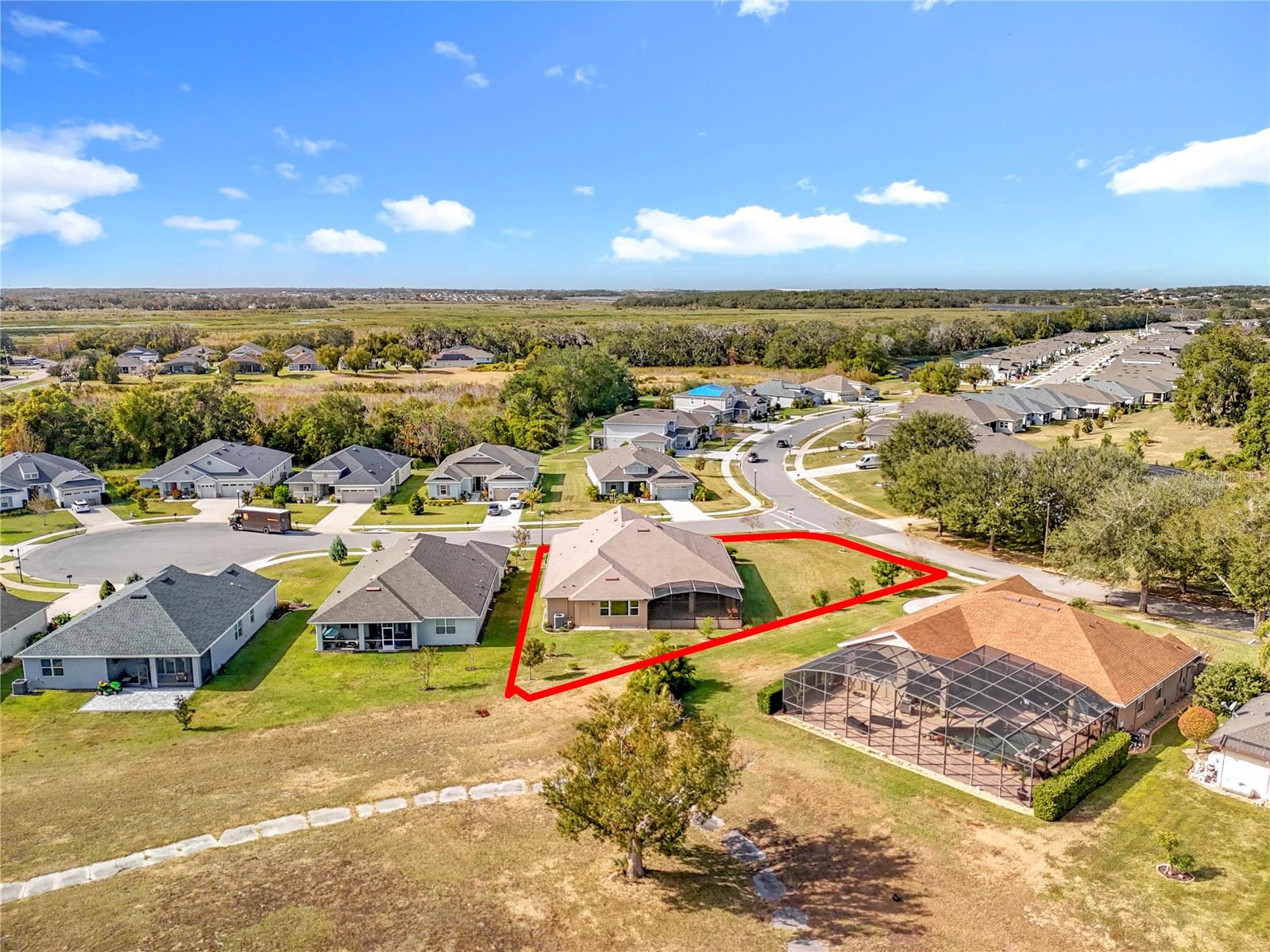 Welcome to this unique extra-large corner semi-custom home featuring four spacious bedrooms and three full bathrooms on a 0.41-acre corner lot. This home offers a blend of luxury and comfort with a versatile office/den, a two-car garage, and additional golf cart or jet ski space. Inside, you'll find luxury vinyl flooring throughout the house, except in the four carpeted bedrooms, glass French doors in the office/den, and ceiling fans. The family room boasts a tray ceiling, ceiling fans, and sliding glass doors leading to a stunning lanai. The kitchen has granite countertops, an island, a double oven range, pendant lighting, abundant cabinet space, a large pantry, and a breakfast bar with an eat-in nook. All bedrooms feature ceiling fans and plantation shutters, with roller shades throughout the rest of the house. The primary suite has a ceiling fan, tray ceiling, his and hers walk-in closets, and an ensuite bathroom with dual sinks, a large shower, a linen closet, and a water closet. The additional bedrooms are carpeted with ceiling fans and spacious closets. Bathroom two has a granite countertop and a tub/shower combo, while bathroom three features a granite countertop and a standalone shower. The extended, covered, and screened lanai has brick pavers and ceiling fans, while the front porch is also screened for added comfort. The garage has an insulated block wall and door with AC installed on the ceiling to maximize space. The laundry room includes a tub and ample shelving. The landscaping is upgraded with various fruit trees, including avocado, lemon, tangerine, mango, and more. The community offers an expansive clubhouse, a private boat ramp, a fishing pier, a playground, a pool, and courts for tennis, pickleball, and basketball. Also, the HOA fee includes the internet and basic cable for up to 3 TVs. Conveniently located close to Downtown Clermont, shopping centers, schools, and major highways, this home offers both luxury and practicality. Schedule your appointment today and make this dream home yours!