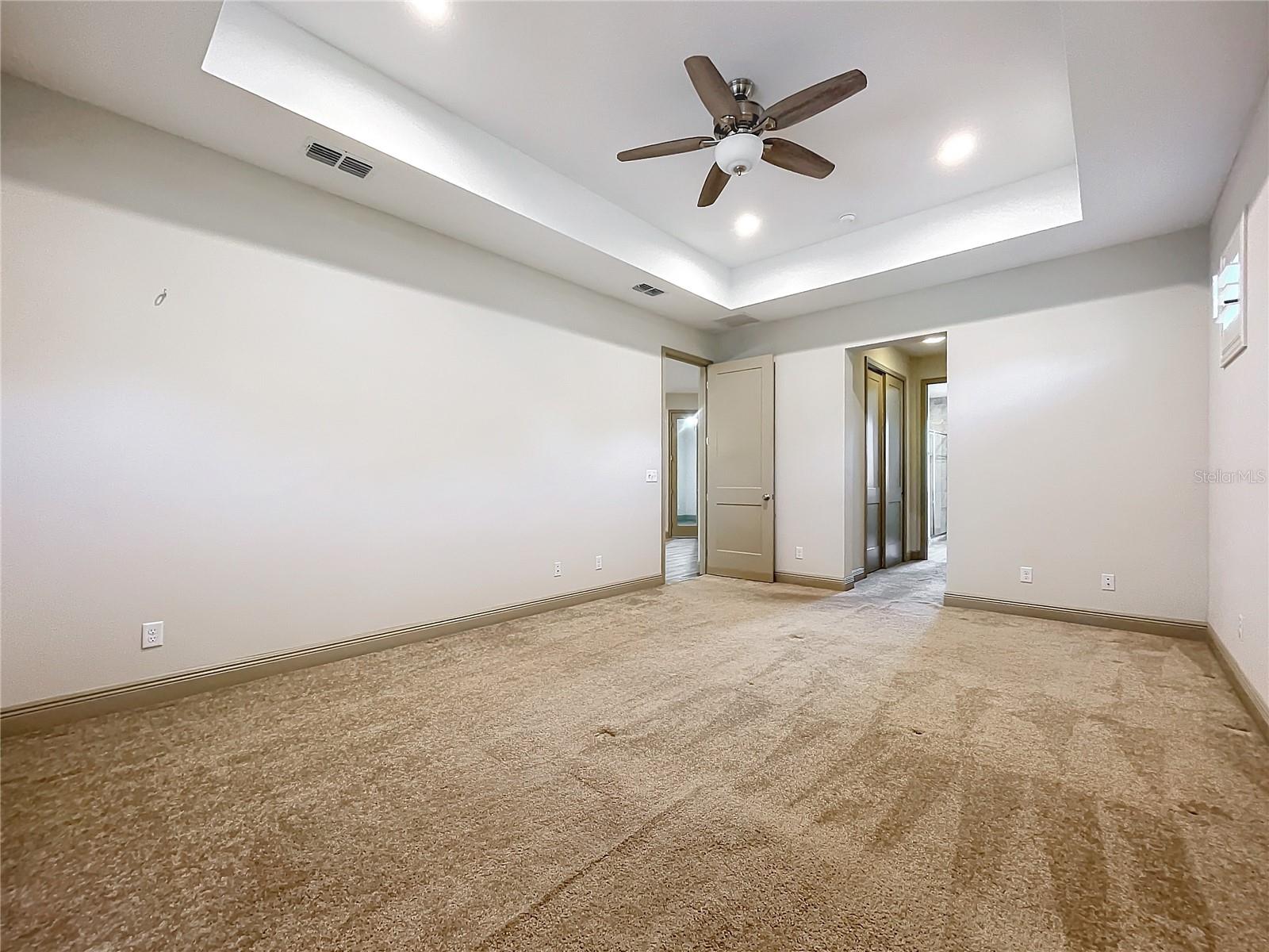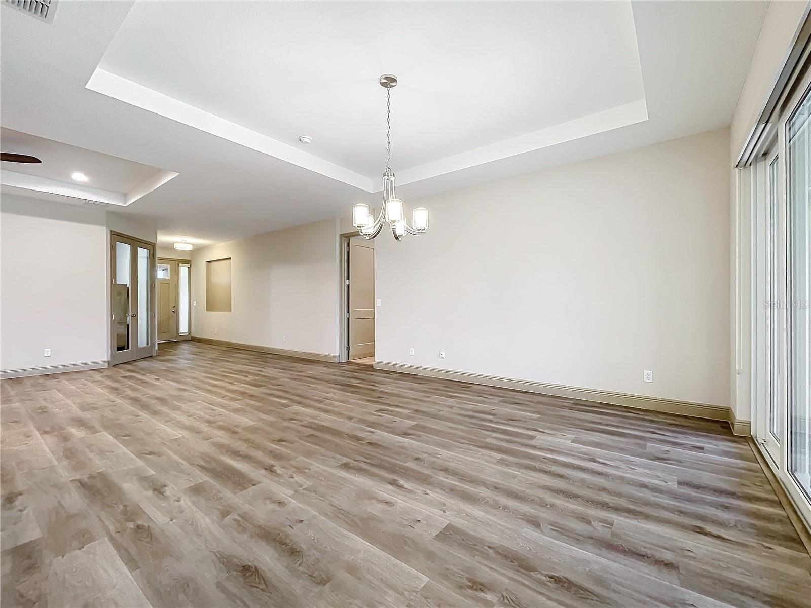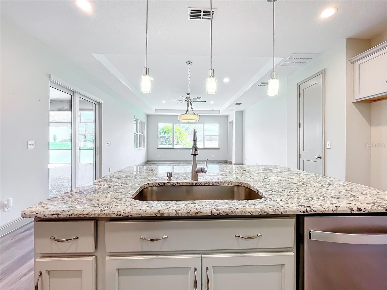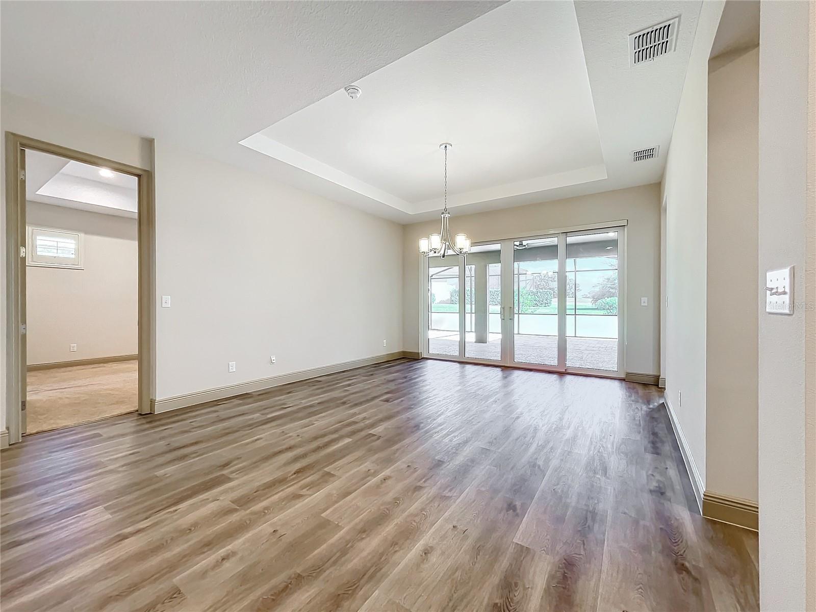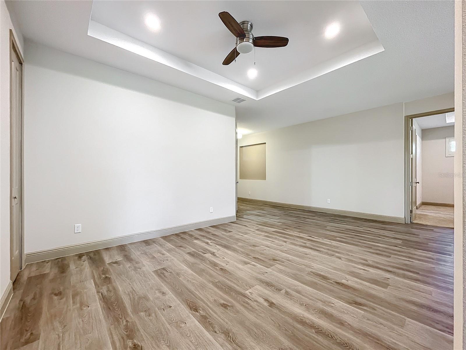 Welcome to this unique extra-large corner semi-custom home featuring four spacious bedrooms and three full bathrooms on a 0.41-acre corner lot. This home offers a blend of luxury and comfort with a versatile office/den, a two-car garage, and additional golf cart or jet ski space. Inside, you'll find luxury vinyl flooring throughout the house, except in the four carpeted bedrooms, glass French doors in the office/den, and ceiling fans. The family room boasts a tray ceiling, ceiling fans, and sliding glass doors leading to a stunning lanai. The kitchen has granite countertops, an island, a double oven range, pendant lighting, abundant cabinet space, a large pantry, and a breakfast bar with an eat-in nook. All bedrooms feature ceiling fans and plantation shutters, with roller shades throughout the rest of the house. The primary suite has a ceiling fan, tray ceiling, his and hers walk-in closets, and an ensuite bathroom with dual sinks, a large shower, a linen closet, and a water closet. The additional bedrooms are carpeted with ceiling fans and spacious closets. Bathroom two has a granite countertop and a tub/shower combo, while bathroom three features a granite countertop and a standalone shower. The extended, covered, and screened lanai has brick pavers and ceiling fans, while the front porch is also screened for added comfort. The garage has an insulated block wall and door with AC installed on the ceiling to maximize space. The laundry room includes a tub and ample shelving. The landscaping is upgraded with various fruit trees, including avocado, lemon, tangerine, mango, and more. The community offers an expansive clubhouse, a private boat ramp, a fishing pier, a playground, a pool, and courts for tennis, pickleball, and basketball. Also, the HOA fee includes the internet and basic cable for up to 3 TVs. Conveniently located close to Downtown Clermont, shopping centers, schools, and major highways, this home offers both luxury and practicality. Schedule your appointment today and make this dream home yours!