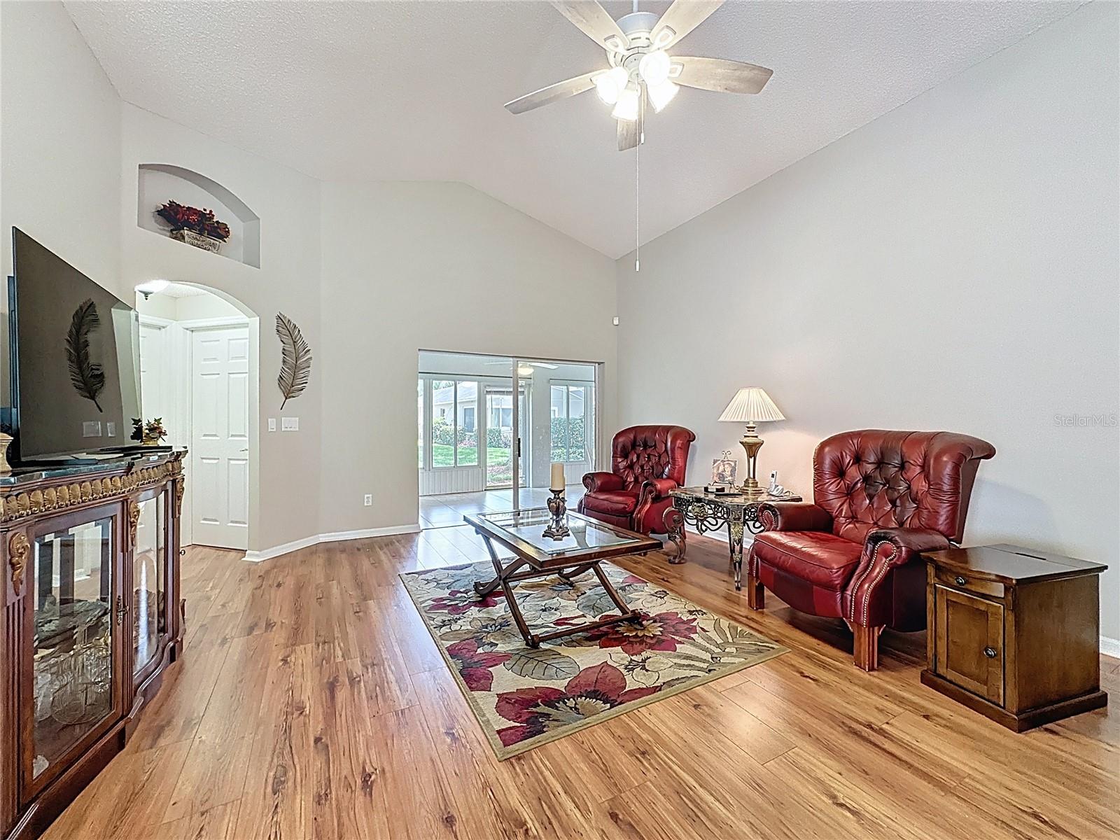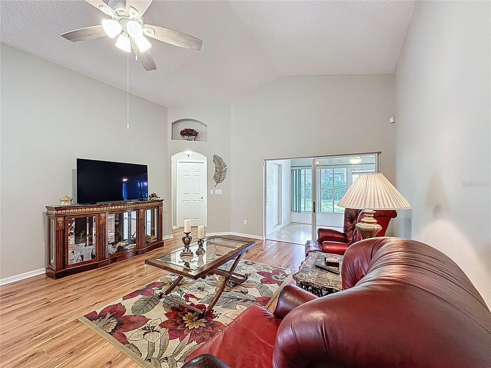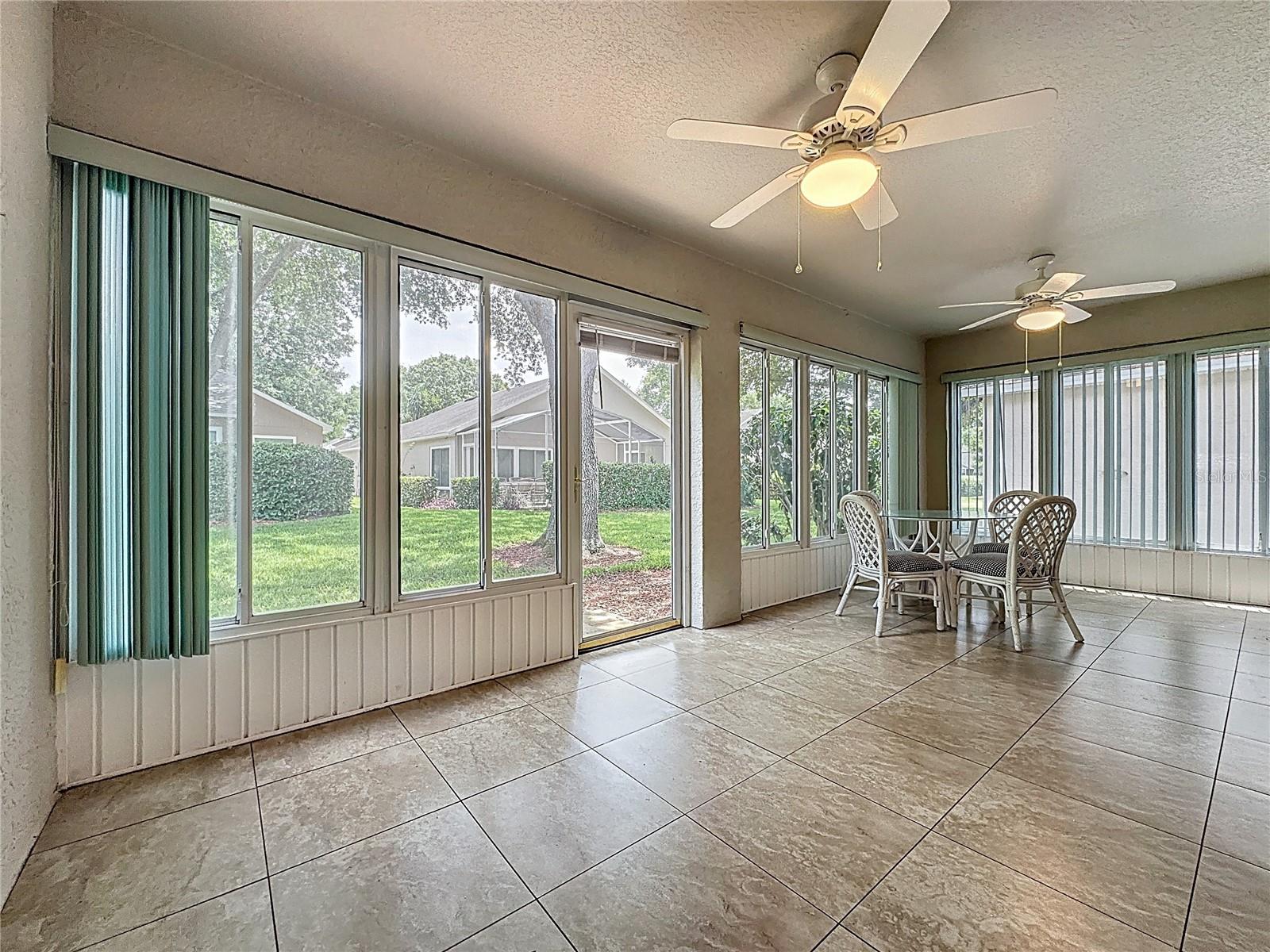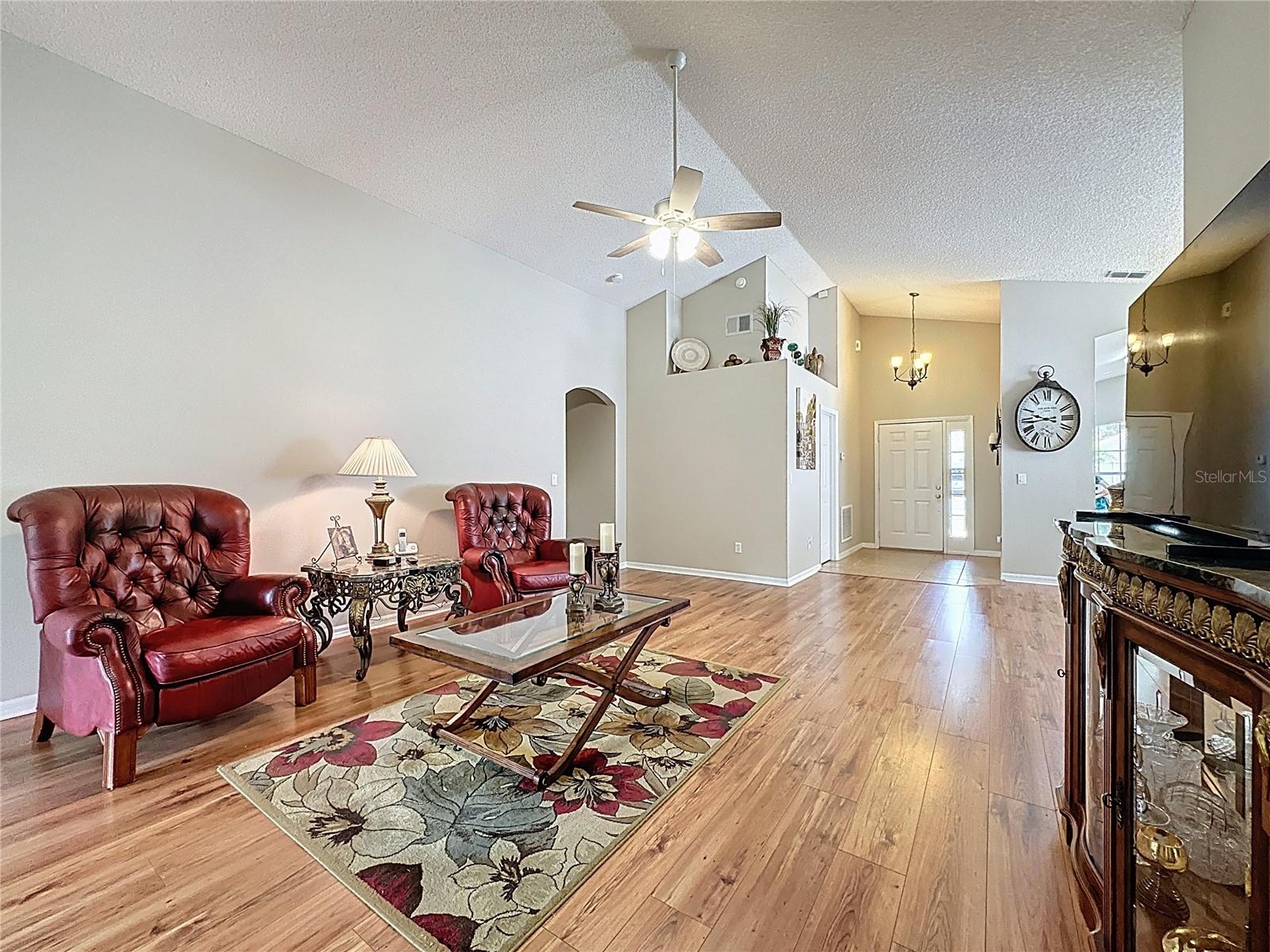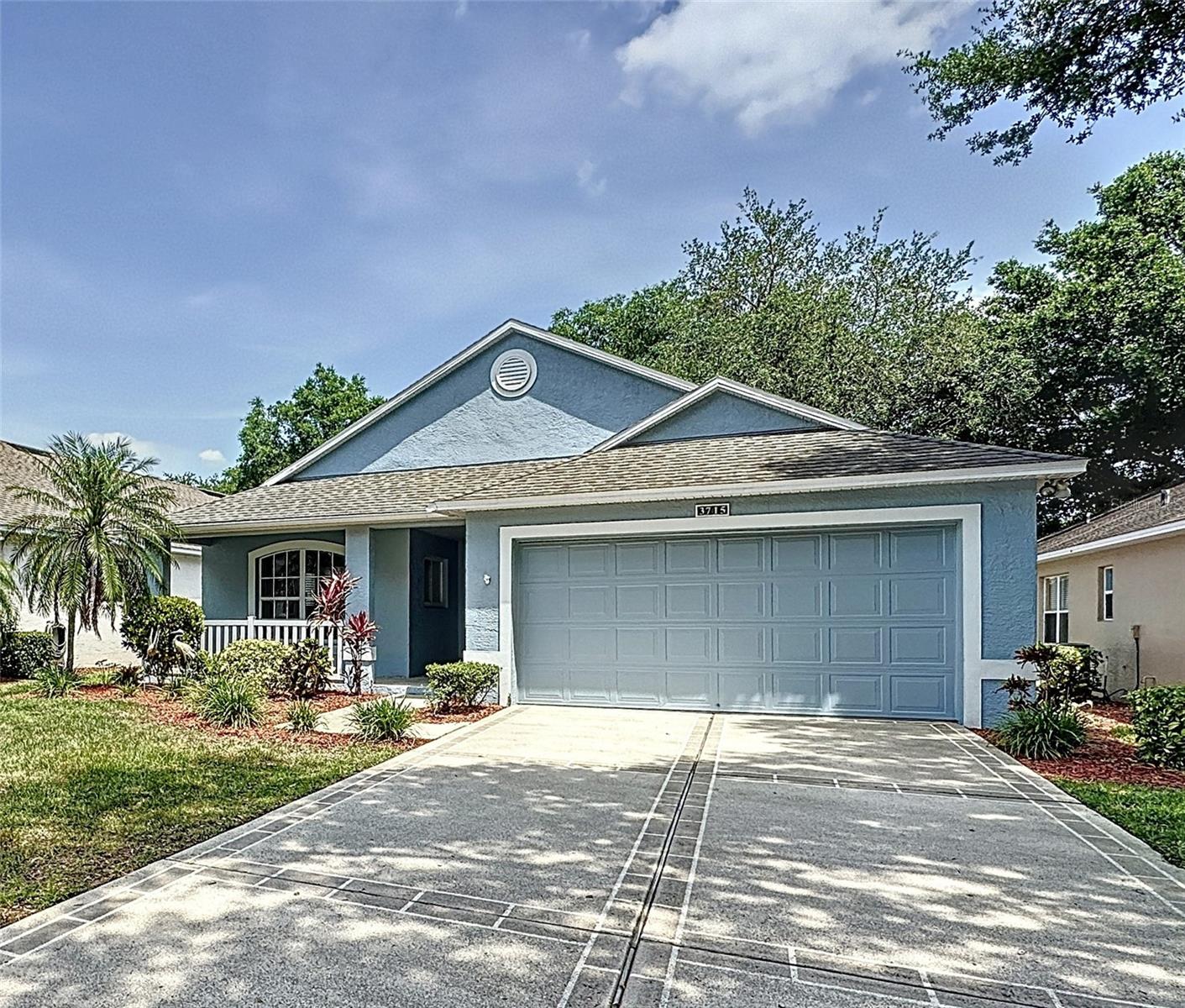 REDUCED $10,000! Expanded Kent model with front porch that is move in ready! Located in the 55+ gated golf community of Kings Ridge. The entire inside of the home has been painted within the last few months. New laminate flooring in 2018 in the great room, dining room, den and both bedrooms. Tile in kitchen and bathrooms. Brand new HVAC in 2024, roof was replaced in Nov 2017 and a new water heater in Jan 2025. Home has 1784 heated SF, 2 BD/2 BA, den and a 2 car garage. The kitchen has new countertops, deep stainless sink & faucet plus stainless steel appliances. The microwave is almost brand new. The garage floor has a new acrylic painted floor & freshly painted walls. The outside of the home was just painted in 2024. The Florida room is tiled, vented for air conditioning and has plexiglass windows. This added 220 heated SF. The primary and 2nd bathrooms have new countertops, sinks, faucets and lighting. The washer & dryer will remain and are pretty new. Pull down attic stairs were added in the garage. Kings Ridge is a 55 Plus gated golf community located in the rolling hills of Clermont, FL. Enjoy the Royal life style in the multi-million $ clubhouse with 3 heated pools, spas, tennis & pickle ball courts, billiards, shuffle board, shows, Bingo, cards and clubs galore. The monthly maintenance fees include: lawn maintenance including trimming of shrubs, care of irrigation system & irrigation water, internet, TV & home phone thru Opticaltel, maintenance of roads and outside painting of home every 7 years. Take your golf cart to the Kings Ridge Plaza where you can do your grocery shopping, banking or dining out.