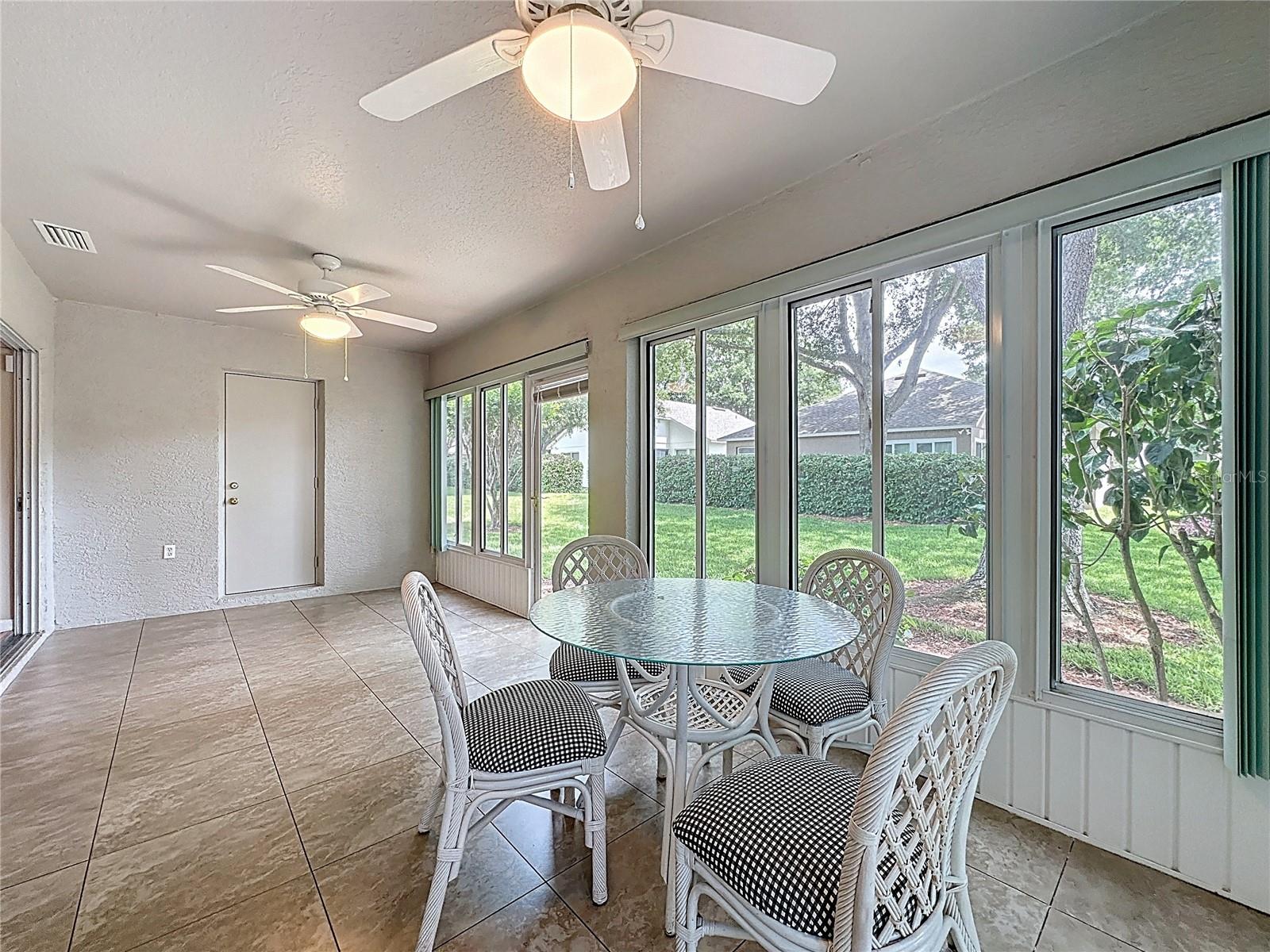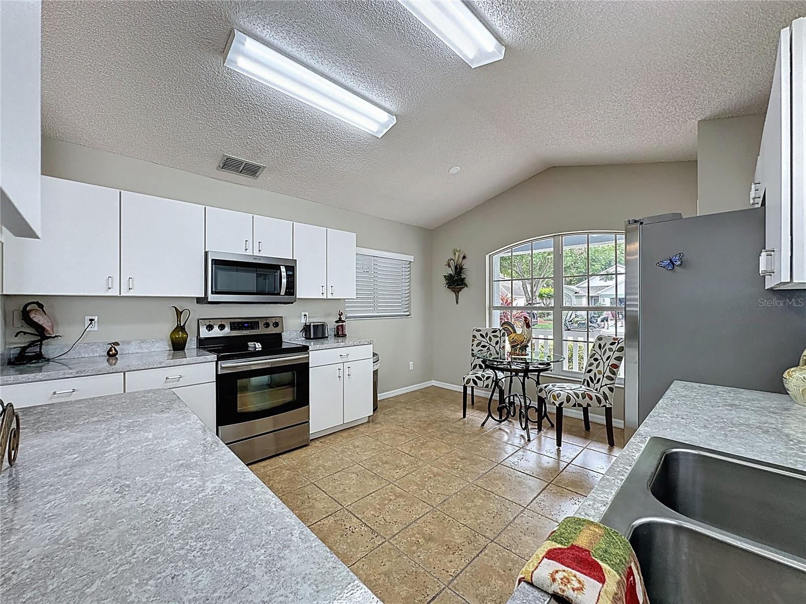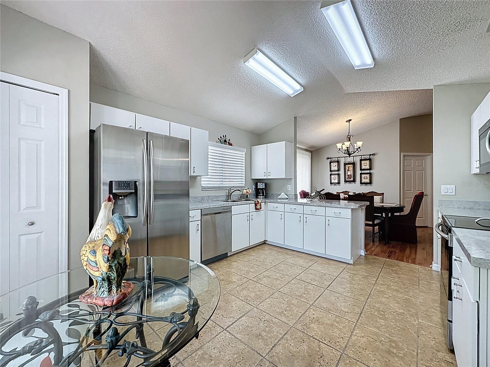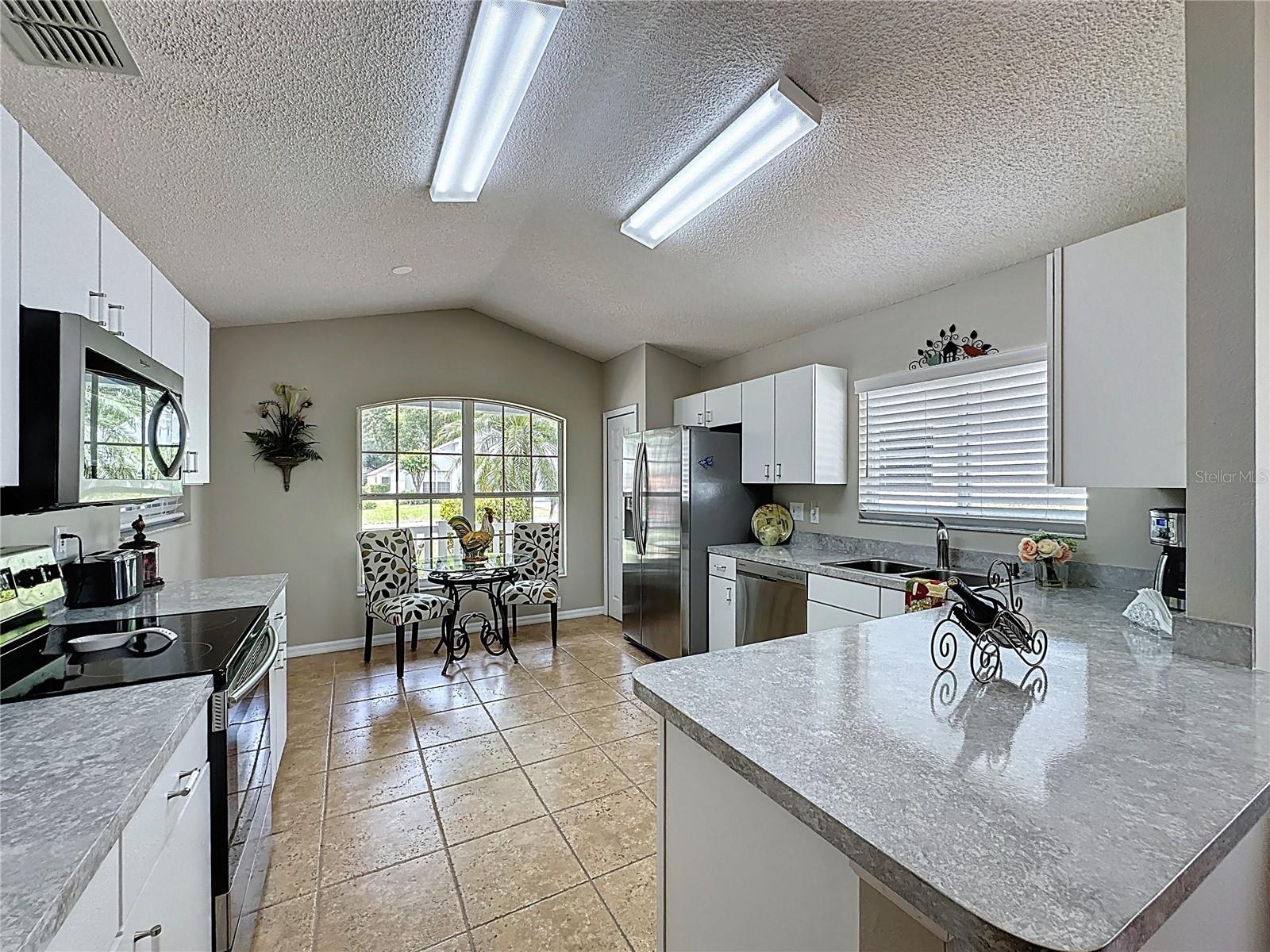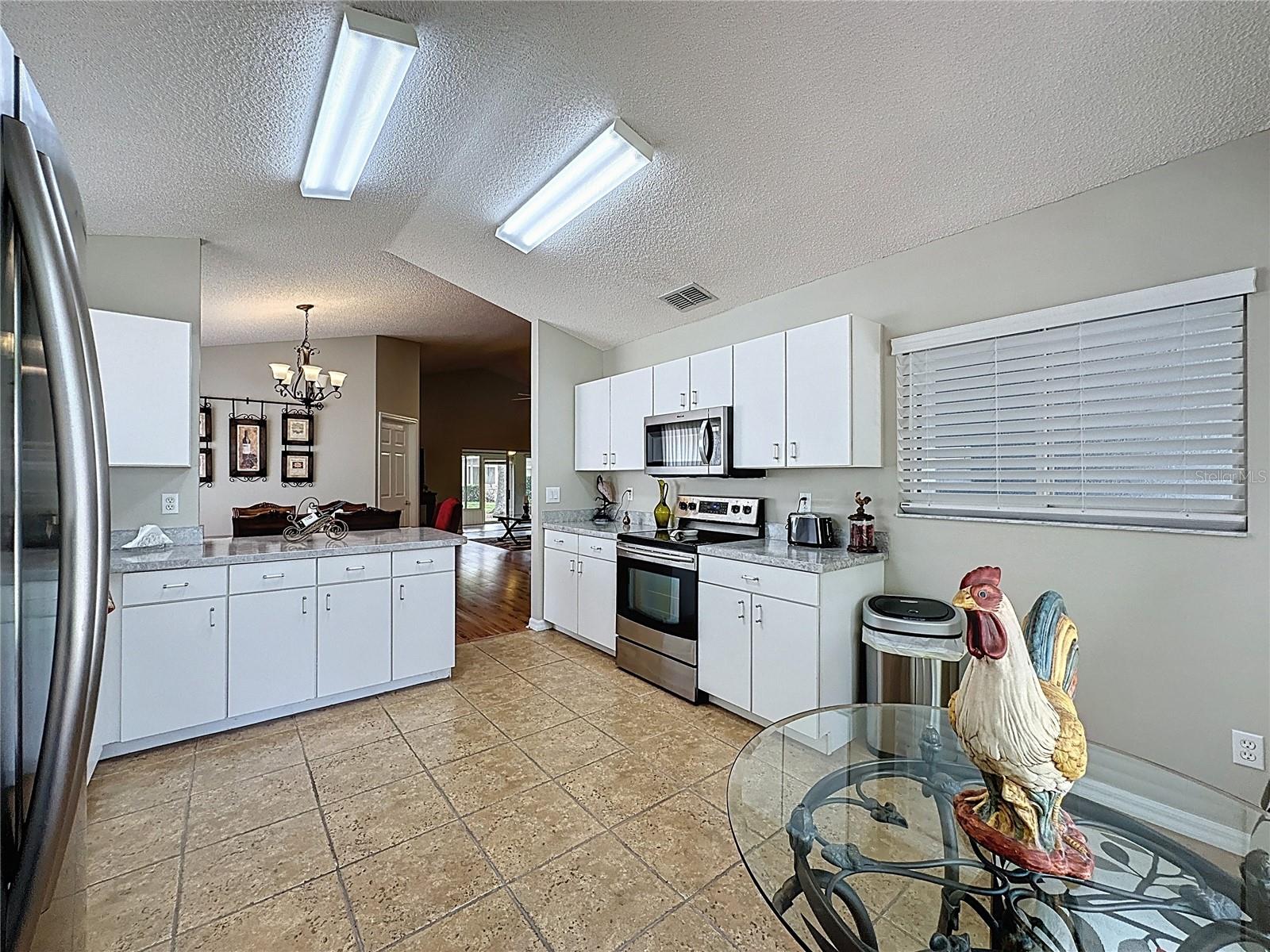 REDUCED $10,000! Expanded Kent model with front porch that is move in ready! Located in the 55+ gated golf community of Kings Ridge. The entire inside of the home has been painted within the last few months. New laminate flooring in 2018 in the great room, dining room, den and both bedrooms. Tile in kitchen and bathrooms. Brand new HVAC in 2024, roof was replaced in Nov 2017 and a new water heater in Jan 2025. Home has 1784 heated SF, 2 BD/2 BA, den and a 2 car garage. The kitchen has new countertops, deep stainless sink & faucet plus stainless steel appliances. The microwave is almost brand new. The garage floor has a new acrylic painted floor & freshly painted walls. The outside of the home was just painted in 2024. The Florida room is tiled, vented for air conditioning and has plexiglass windows. This added 220 heated SF. The primary and 2nd bathrooms have new countertops, sinks, faucets and lighting. The washer & dryer will remain and are pretty new. Pull down attic stairs were added in the garage. Kings Ridge is a 55 Plus gated golf community located in the rolling hills of Clermont, FL. Enjoy the Royal life style in the multi-million $ clubhouse with 3 heated pools, spas, tennis & pickle ball courts, billiards, shuffle board, shows, Bingo, cards and clubs galore. The monthly maintenance fees include: lawn maintenance including trimming of shrubs, care of irrigation system & irrigation water, internet, TV & home phone thru Opticaltel, maintenance of roads and outside painting of home every 7 years. Take your golf cart to the Kings Ridge Plaza where you can do your grocery shopping, banking or dining out.