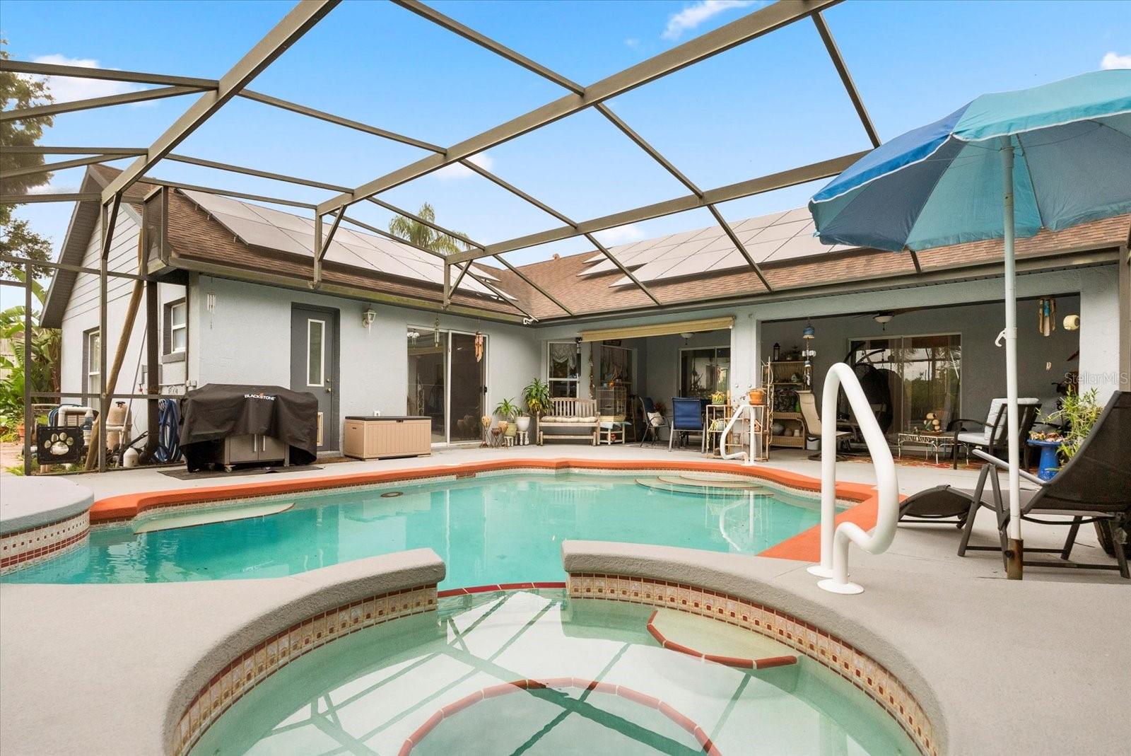 Welcome to your Florida dream home! This beautifully updated 4-bedroom, 3-bathroom pool home offers over 2,500 square feet of thoughtfully designed living space, blending comfort, functionality, and modern upgrades. Freshly painted both inside and out in 2024, this home greets you with a dedicated office or den just off the entryway—perfect for remote work or a quiet retreat. Just off this space you'll find a 20 X 20 den/living room/playroom/mancave/extra bedroom or whatever your heart desires. The gourmet kitchen is a true standout, boasting brand-new stainless-steel appliances, quartz countertops, a gas stove, double ovens (including an air fryer oven), and a gas water heater. With 20 cabinets and a breakfast counter that opens into a bright and airy breakfast nook, there’s plenty of space for everyday living and entertaining. A formal dining room offers the perfect setting for hosting holiday meals or dinner parties. The kitchen opens up to a spacious living room which features an elegant electric fireplace & a large TV which conveys with the property, creating a warm and inviting atmosphere. The primary suite is a private sanctuary, complete with tray ceilings, direct access to the lanai, and a luxurious en suite bathroom featuring an updated vanity, a walk-in shower & the washer & dryer are in this bathroom; making it super easy to do laundry. Bathroom three is conveniently connected to the pool area, ideal for guests and outdoor gatherings. Step outside to enjoy the screened-in lanai and pool area, designed for relaxing and entertaining year-round. The pool has a spa and uses salt for chlorination. The backyard is fully fenced with 2 gates to enter in through, lots of fruit trees, hammocks & an irrigation system. Additional highlights include 55 solar panels with 2 Tesla batteries for energy efficiency, a spacious driveway with ample room to park an RV or boat & offers a 18 X 25 foot deep shed that is permitted with the county. The roof was replaced in 2014. The septic tank is located on the front left side of the house & was cleaned out in 2024. With every detail thoughtfully considered, this home offers the perfect blend of style, convenience, and Florida living. Schedule your private tour today and discover everything this exceptional property has to give.
