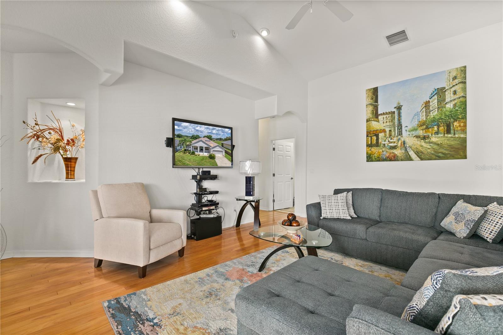 Under contract-accepting backup offers. Brand-New Kitchen Appliances. Welcome to this spacious and beautiful 3-bedroom, 3-bath pool home, with a separate study/den that can be used as a 4th bedroom. It is located in the highly desirable community of Palisades. Situated on a former golf course, now green space, leaves you with no rear neighbors, privacy, and stunning views. Inside, you’ll find a bright, open floor plan, along with beautiful wood flooring, freshly painted rooms, and plenty of natural light. The kitchen features brand-new stainless steel appliances, 42-inch wood cabinets, beautiful countertops, a large pantry, and a breakfast bar that flows into the family room, along with separate formal dining and formal living rooms. Roof (2022), AC (2022), Hot Water Heater powered by solar panel. The primary master suite is a private retreat, complete with tray ceilings, French doors leading to the lanai, two separate closets, a walk-in for her, with dual sinks, a luxurious whirlpool tub, and a separate shower. The den/study can be used as a bedroom. Step outside and the first thing you notice is no rear neighbors, only green space and the fruit trees. The rear has a screened-in pool, a generous and large lanai which has plenty of cover, and looks out to the greenspace of a former golf course, making it a perfect area for relaxing or entertaining. Great price, this is the one.
