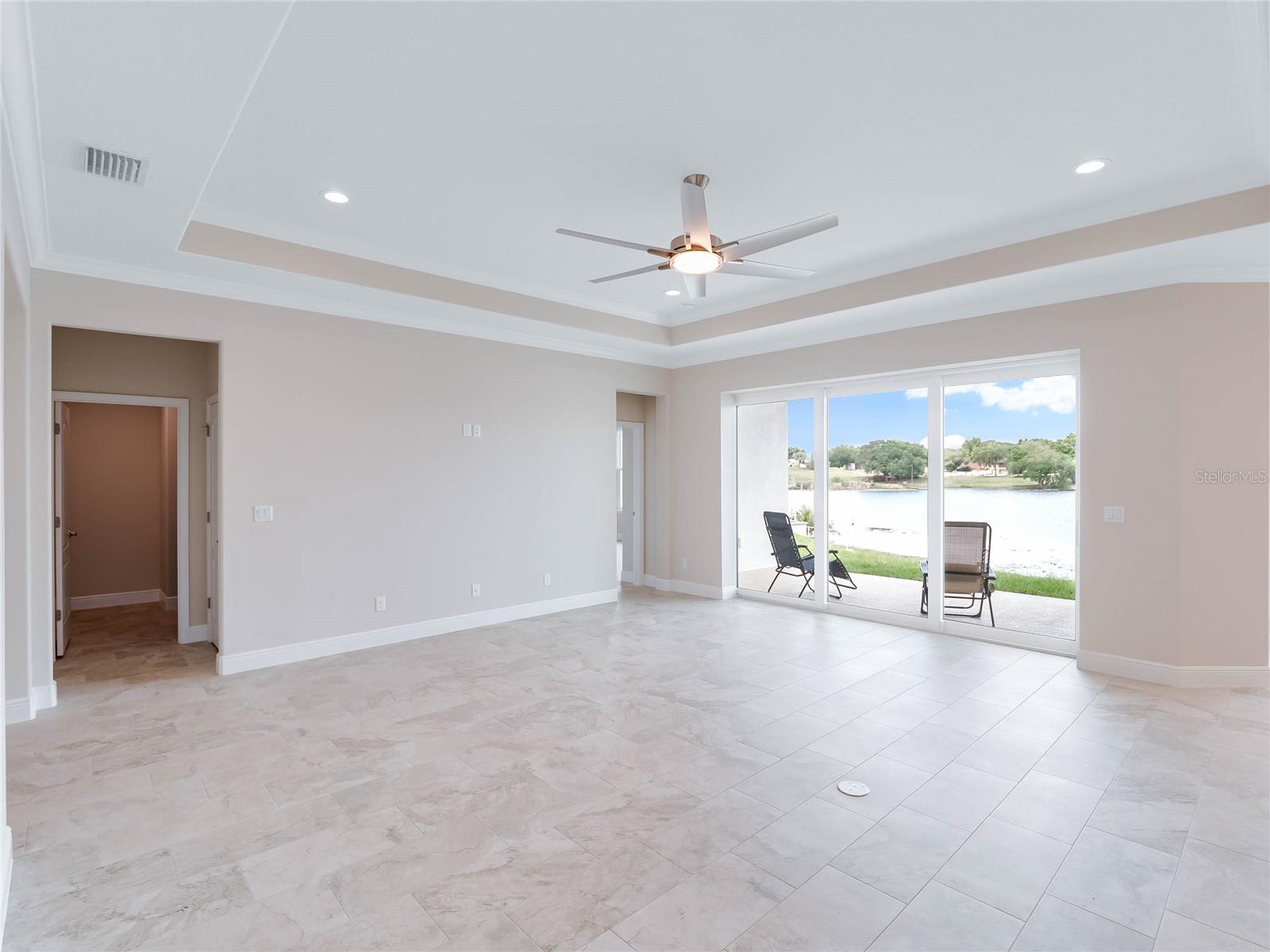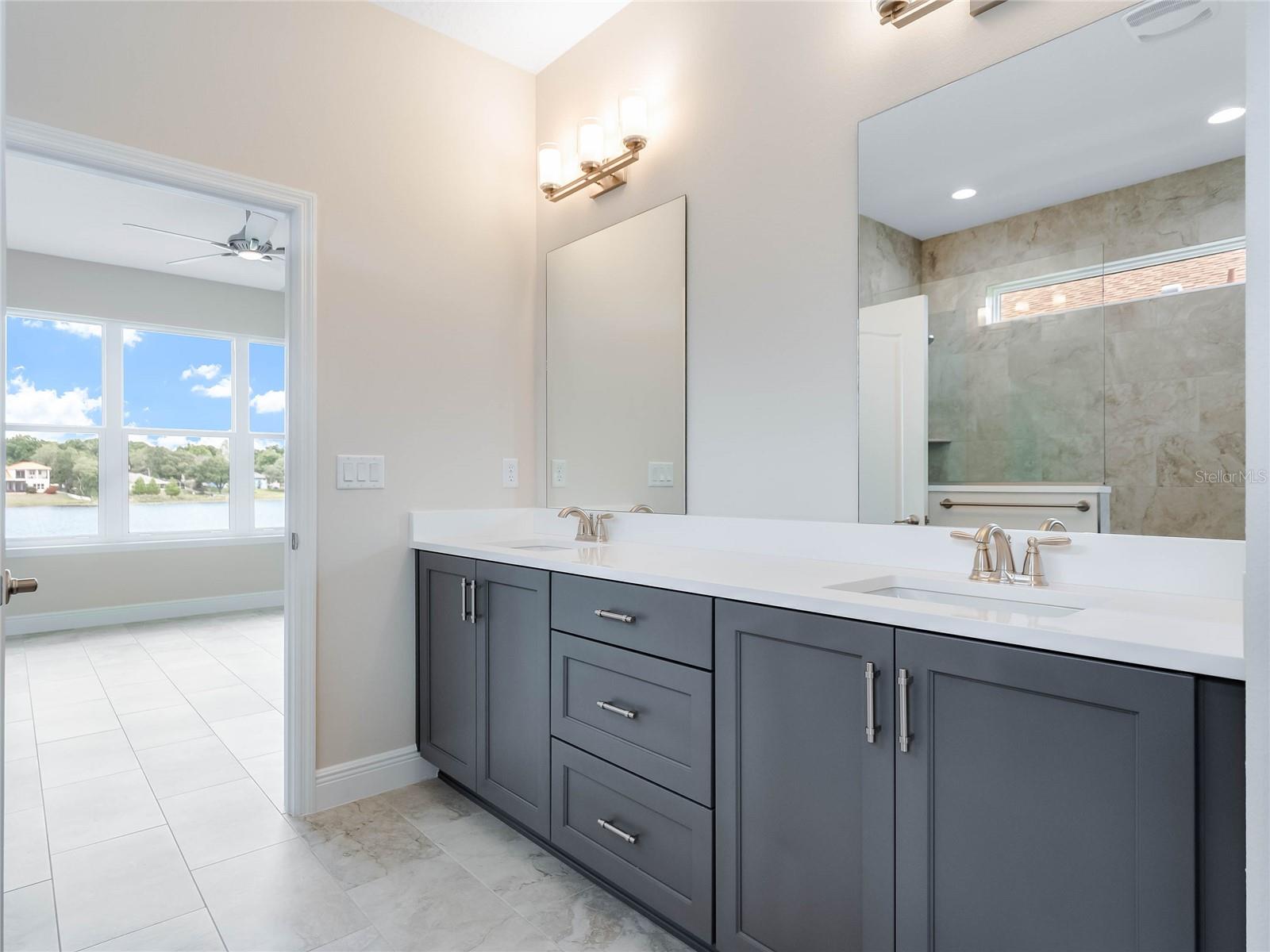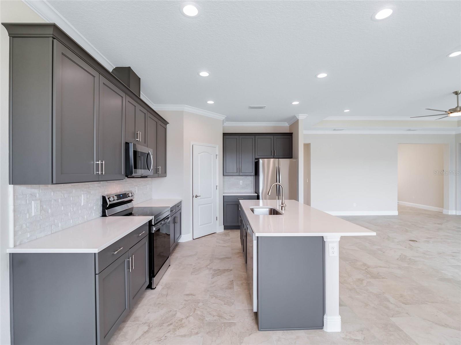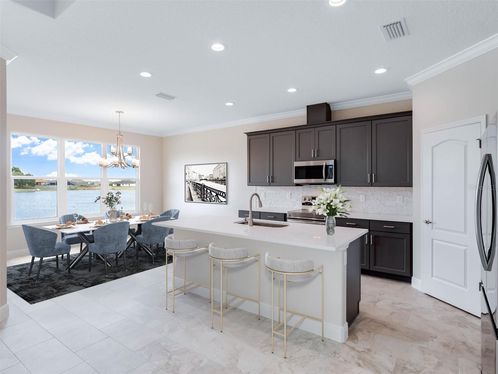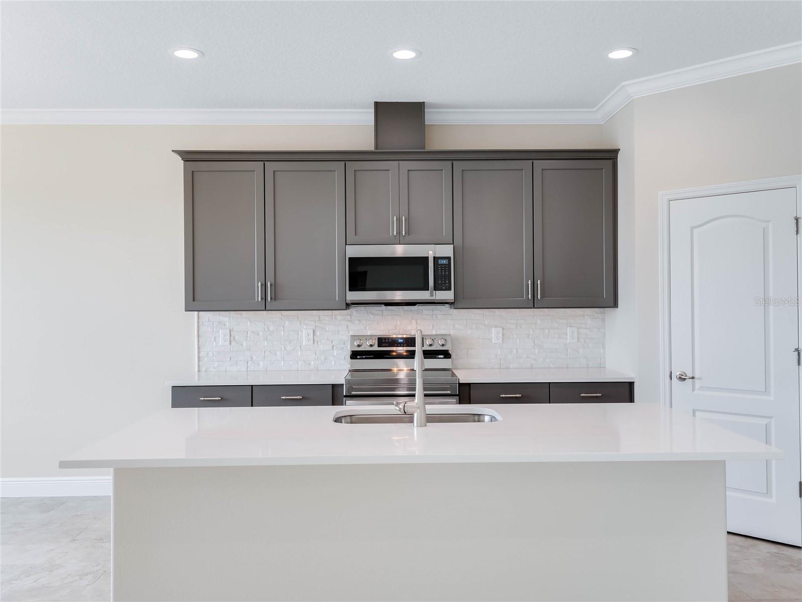 One or more photo(s) has been virtually staged. This beautiful home is truly MOVE-IN READY! BRAND NEW, 4 bedroom, 2 bath LAKEFRONT home in a tranquil neighborhood with gorgeous views of Lake Clair in Clermont. You will be amazed at the amount of UPGRADES you will enjoy: Quartz counter tops in the Kitchen and throughout, all lighting fixtures, crown molding, entry door with glass inserts, enlarged driveway and walkway, upgraded landscape package, upscale modern tile throughout...it goes on & on! Some pictures have been virtually staged. The modern appointed kitchen has a large under-mount stainless steel sink, sprayer, self-close drawers, elegant backsplash, and a large Walk In Pantry. This open home concept allows you to share special moments with family and guests, and affords privacy in all bedrooms. The main bedroom also has an enchanting lake view, a Spa-like bathroom suite offering large shower w/ pebble rock flooring, large shower head & sprayer, double sinks, quartz counter tops...The sliding doors disappear within the wall to fully appreciate the best part: The grandiose back yard view to Lake Clair. Priceless! Welcome to your own paradise! Builder warranty in place. Confirm most updated school zones. Just added brand new back porch screen!