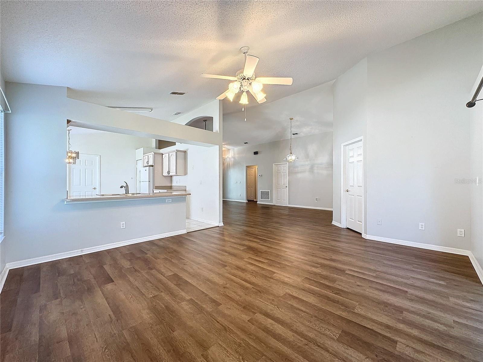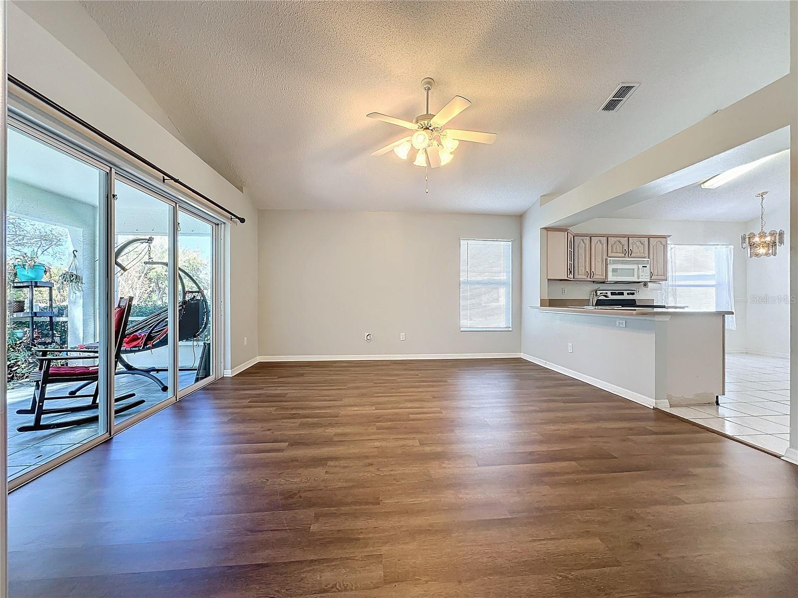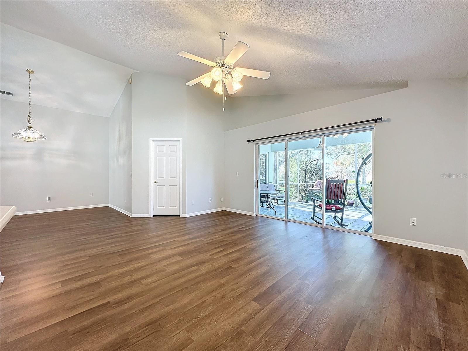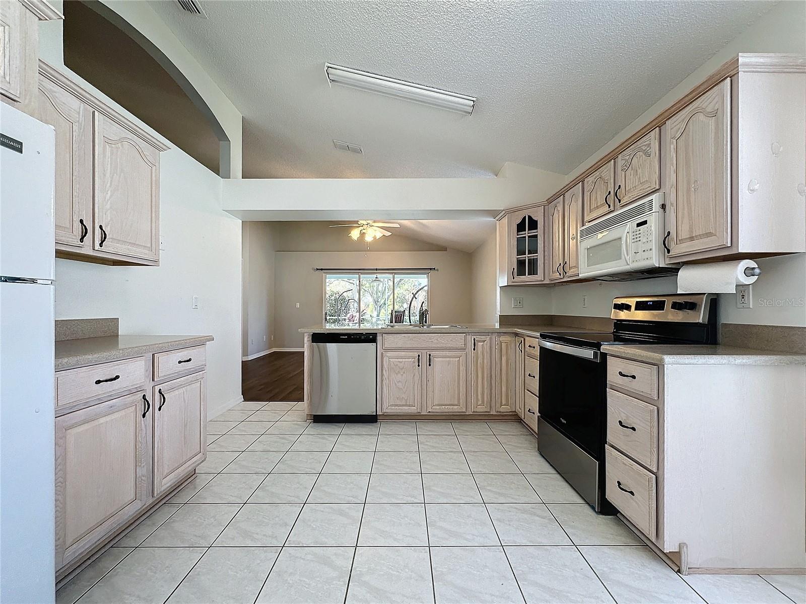 Welcome to the sought after 55+ Golf Course Community of Kings Ridge in beautiful hills of Clermont. This spacious 2 bedroom. plus Den/Study/Office which can be turned into a 3rd bedroom has everything to offer. Oversize garage, car plus golf cart parking. Beautiful Airy OPEN FLOOR PLAN, vaulted ceilings. New Dishwasher and Range;2023 new laminate floors; A/C 2023, Roof 2018. Eat in Kitchen; full beveled glass front door to allow natural light to flow throughout home; Enclosed front screen entryway for added security; Extended screened in lanai; PRIVATE backyard. It is a MUST SEE! Kings Ridge is located on 2 golf courses, Executive & Championship .. HOA fees include the use of the multi million dollar clubhouse, 3 pools, 2 spas, pickle ball and tennis ball courts, clubs to join, bingo, movies, etc. Lawn maintenance, basic cable, internet included. Hop on your golf cart and drive to the local shopping center, grocery store, banks, restaurants, doctor offices, hair/nail salon, Starbucks. Enjoy the day trip to local attractions like Disney, Sea World, Universal, NASA Kennedy Space Center, world famous shopping or a trip to one of our beautiful beaches. Kings Ridge is centrally located in the middle of it all. Orlando Airport is only a short 45 minute drive. Come live the good life in Kings Ridge and see what you have been missing. This one is a must see, it will not last long. Room Feature: Linen Closet In Bath (Primary Bedroom).