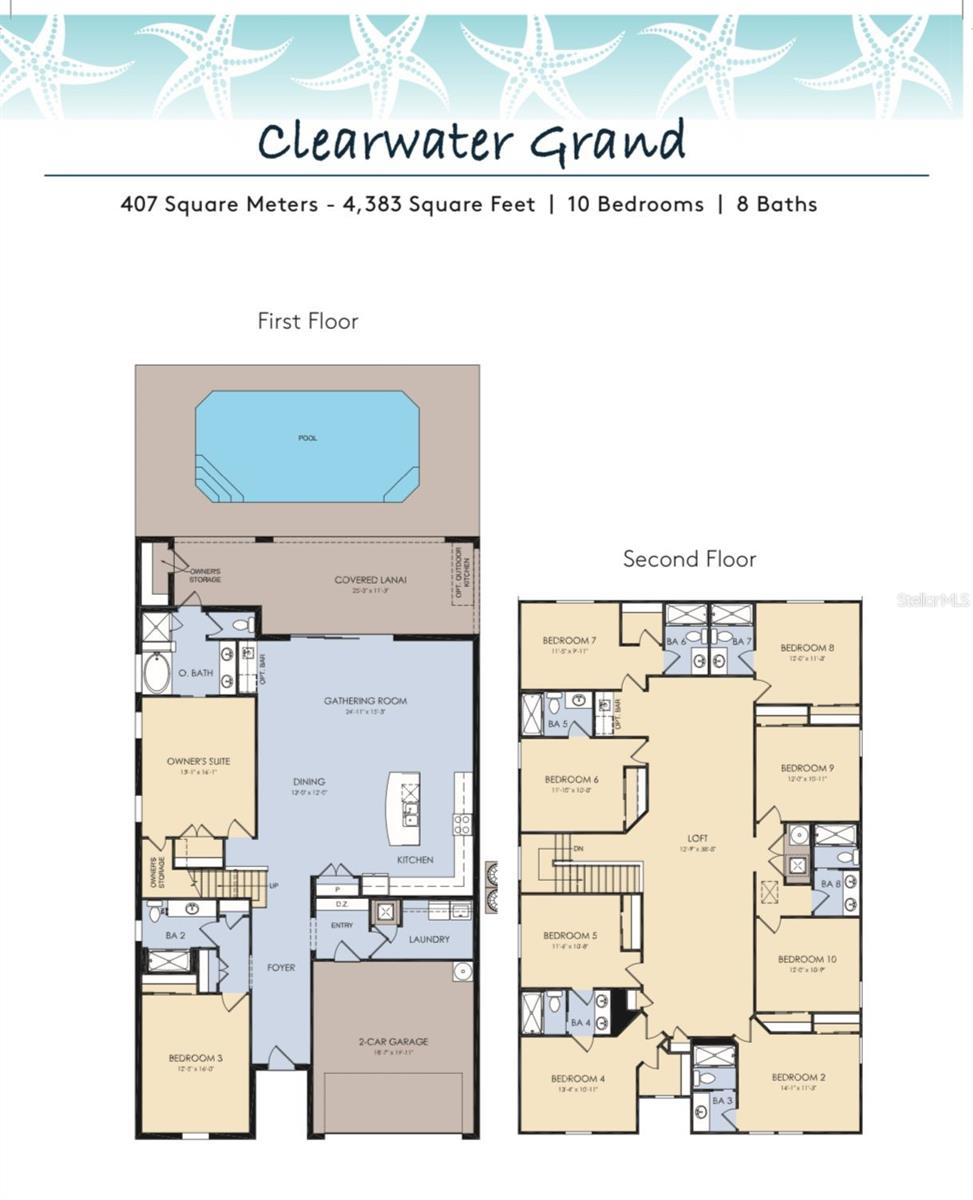 Presenting the Clearwater Grand, a magnificent 10-bedroom vacation retreat nestled in the exclusive Windsor Cay Resort, the newest hot spot in Orlando. This brand-new home, never rented, is a showstopper with 10 bedrooms, 8 bathrooms, a 2-car garage, a spacious kitchen, a cozy gathering room, and a dining area. You'll also find a roomy loft, a luxurious lanai with a private pool, spa, and a safety fence for peace of mind. As you enter, you'll be impressed by the grand two-story foyer, modern grey cabinets, sleek quartz countertops, and a stylish tile backsplash in the kitchen. The owner's suite is a sanctuary with dual walk-in closets, a lavish bathroom, and access to the lanai. Convenience is key with a laundry room, guest bedroom, and bathroom on the first floor. Upstairs, you'll discover more suites, guest rooms, a spacious loft perfect for entertaining, and a host of amenities. This home boasts upgraded flooring, cabinets, and more, exuding sophistication and luxury. Enjoy the practicality of pendant lighting, window blinds, and exterior lighting. The resort amenities are second to none, including a waterpark, mini-golf, arcade, fitness center, and sports courts. Experience the ultimate in vacation living at Windsor Cay Resort, where luxury, leisure, and prime location combine for an unforgettable Orlando escape.