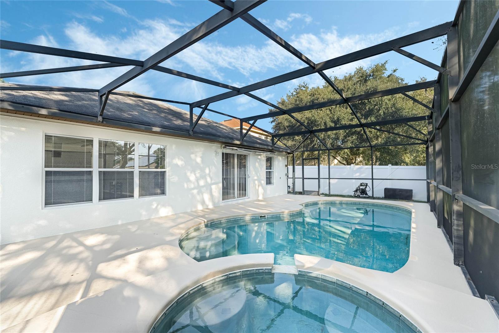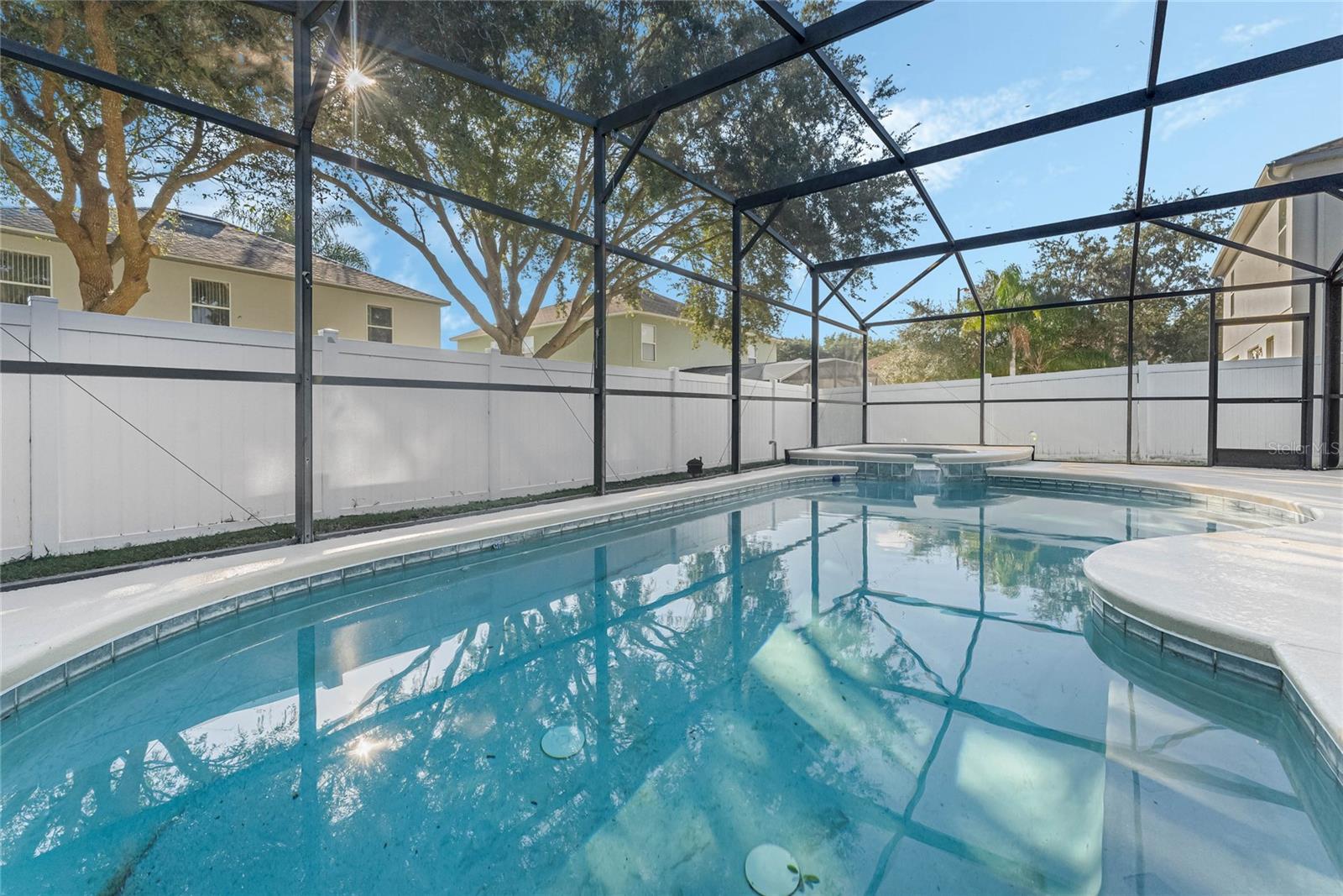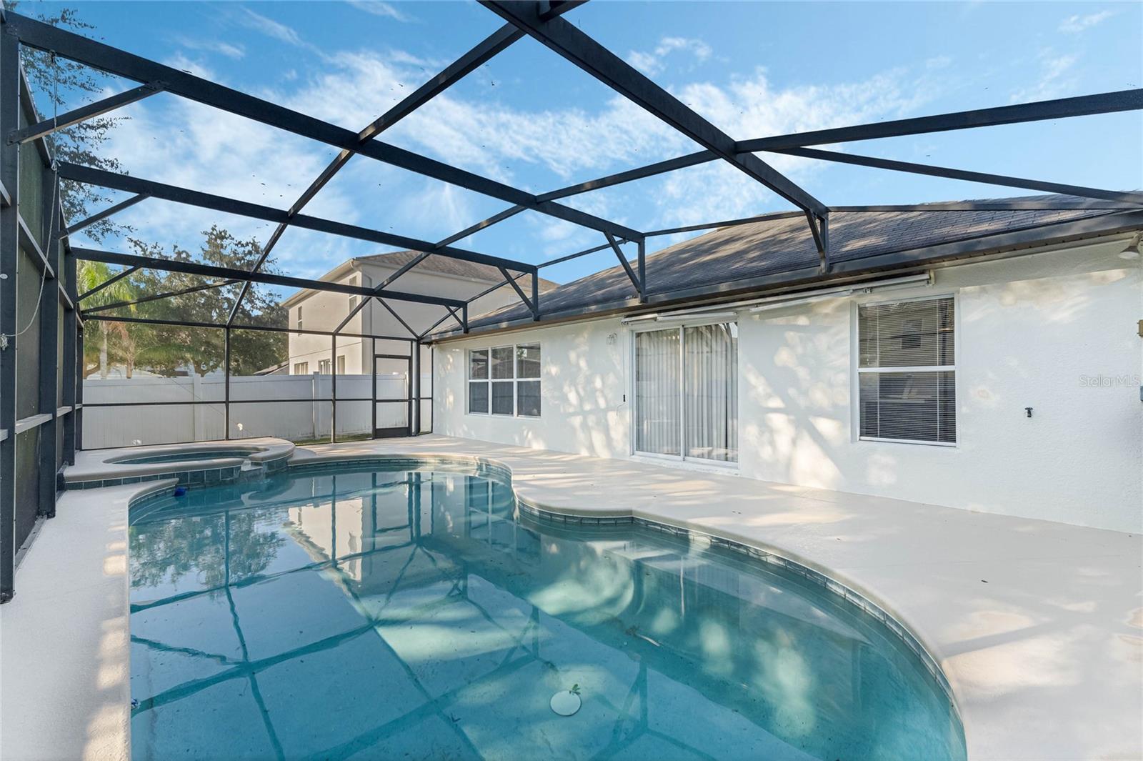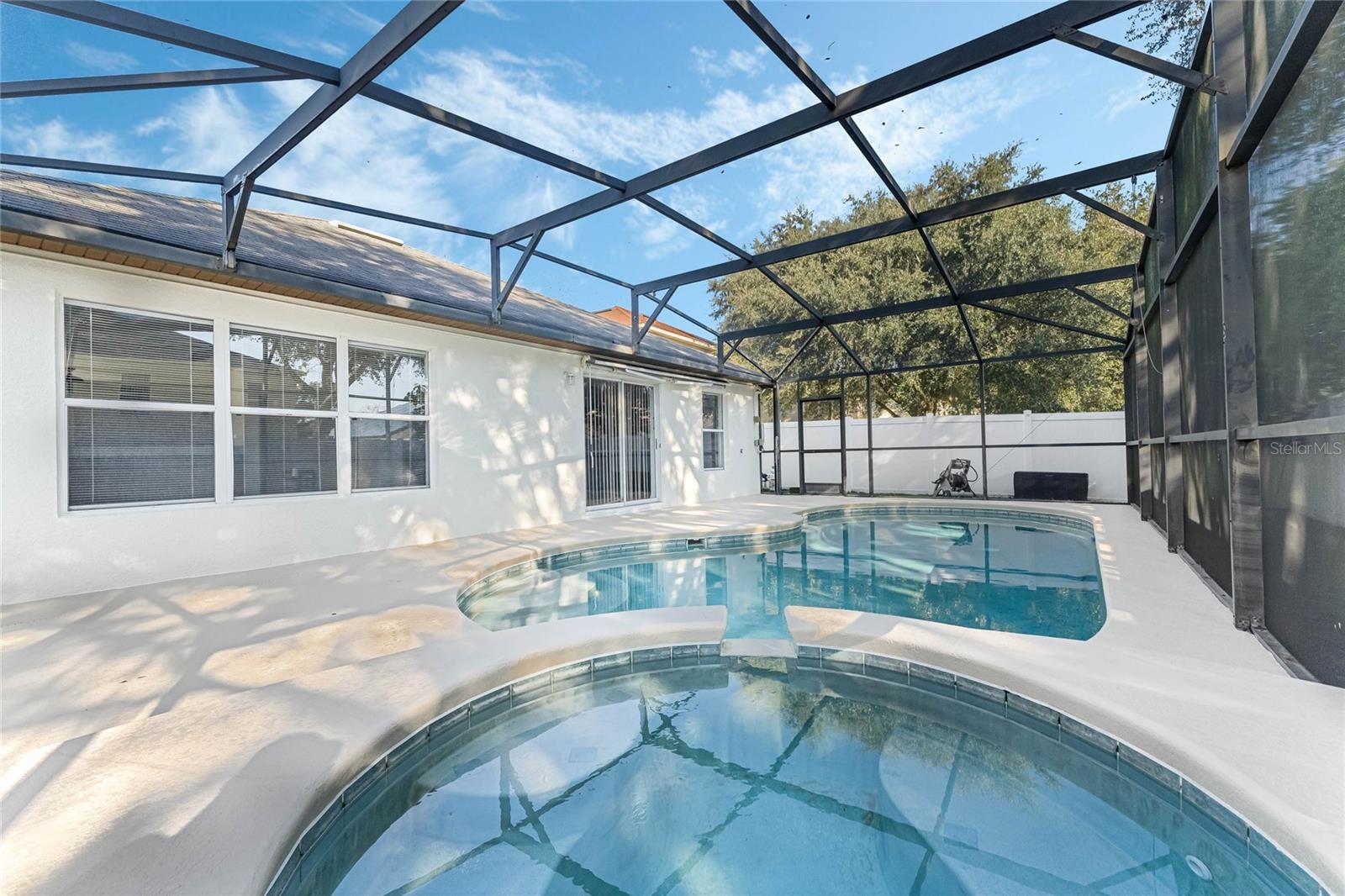 ***$10K PRICE REDUCTION***. NEWLY PAINTED EXTERIOR AND DECK. Welcome to your new home. Just 30 minutes from Disney. A large 3 bedroom 2 bath house feels like you are coming home. As soon as you walk into the front door the home just opens up. A lovely tile entry lead into an open concept dining room and living room. The luxury vinyl plank flooring with a deep walnut color extends from the dining room, living room and all the bedrooms. No carpet anywhere in the house. A large kitchen that has a wonderful island which opens up to the dining/living room combo. Sliding doors take you out to the screened in porch with a pool and spa. This home can be used for your personal use or it can be used a vacation home since it is allowed by the HOA. THE ROOF WILL BE REPLACED PRIOR TO CLOSING. A/C was replaced in 2023. A home warranty will be provided at closing.