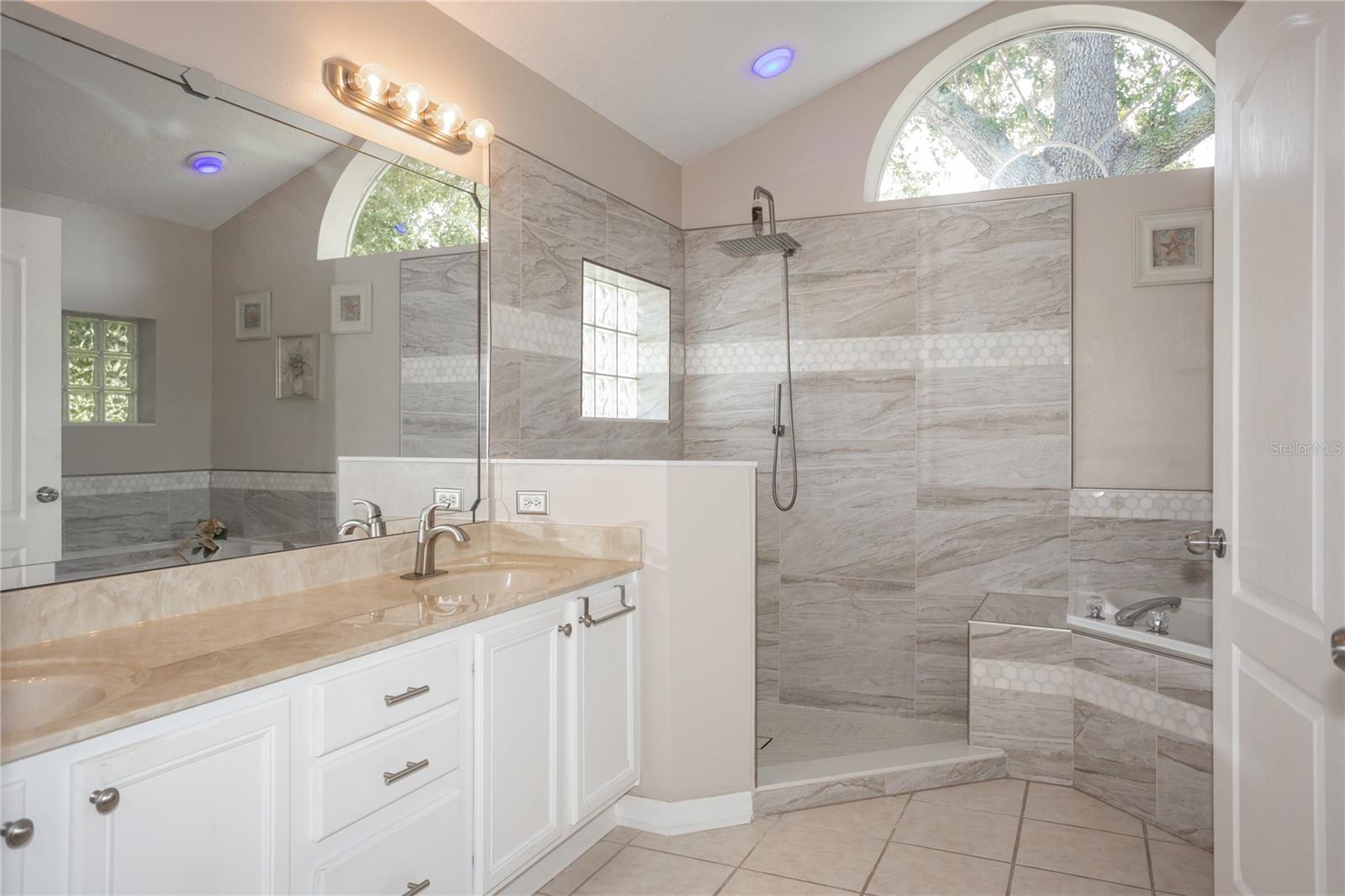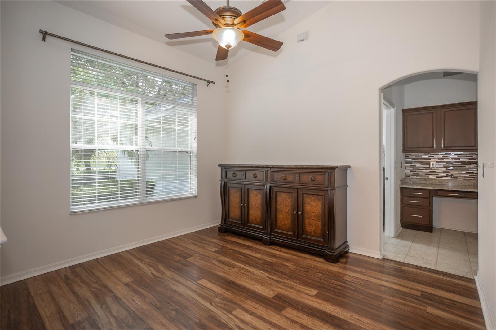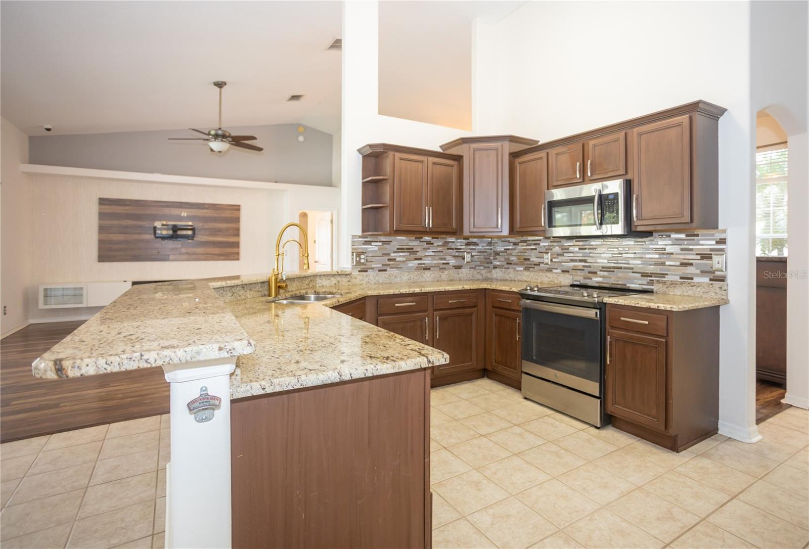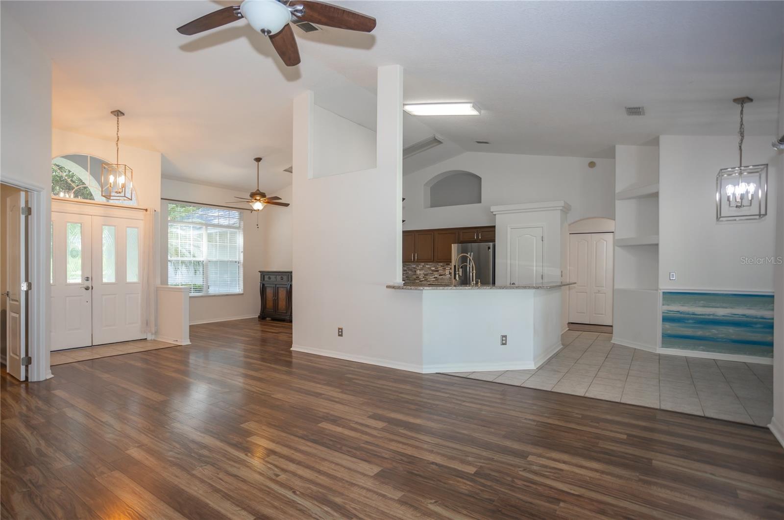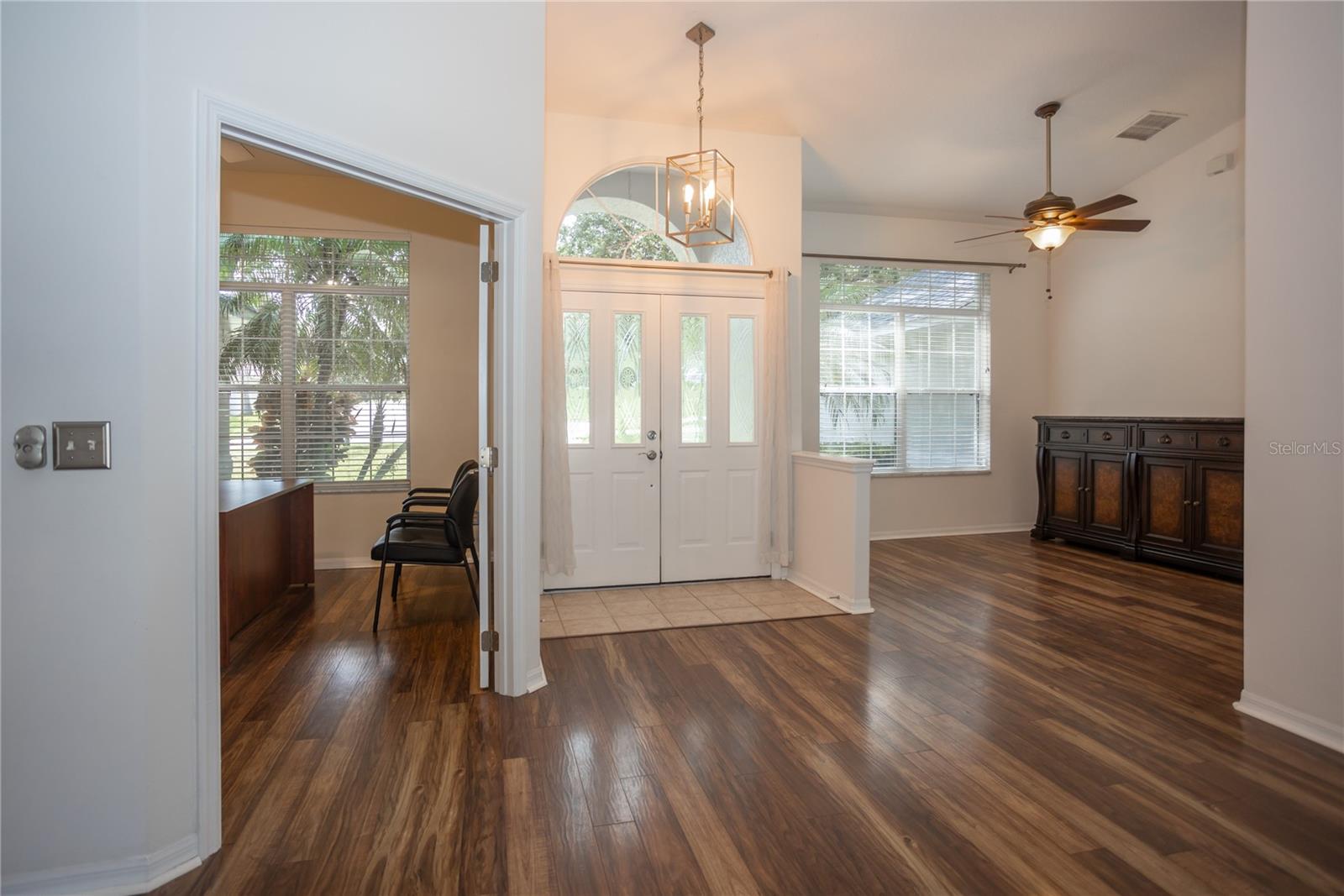 SOUTH LAKE FOREST community located in beautiful Clermont features 3 bedroom, 2 bath home with Bonus Office which can be used as a 4th bedroom. Welcoming double door entrance opens to Great room, eat-in kitchen with breakfast bar and separate dining room. Vaulted ceilings, custom TV panel entertainment center which includes built in soundbar, floating shelves, Philips HUE lighting system and LED fireplace. Kitchen features updated granite countertops, new backsplash and pantry closet. Large primary suite with private access to screened lanai, his and her closets, and updated ensuite bath with large walk in shower, garden tub and double sinks. Separate Laundry Room including washer and dryer. Living area opens to large screened lanai over looking completely fenced, manicured, over-sized backyard with fruit trees. A separate pad with beautiful pavers perfect for fire pit and cookouts. Double car garage. Conveniently located to schools, shopping and the beautiful downtown Clermont. New roof 2021. Exterior painting 2021.