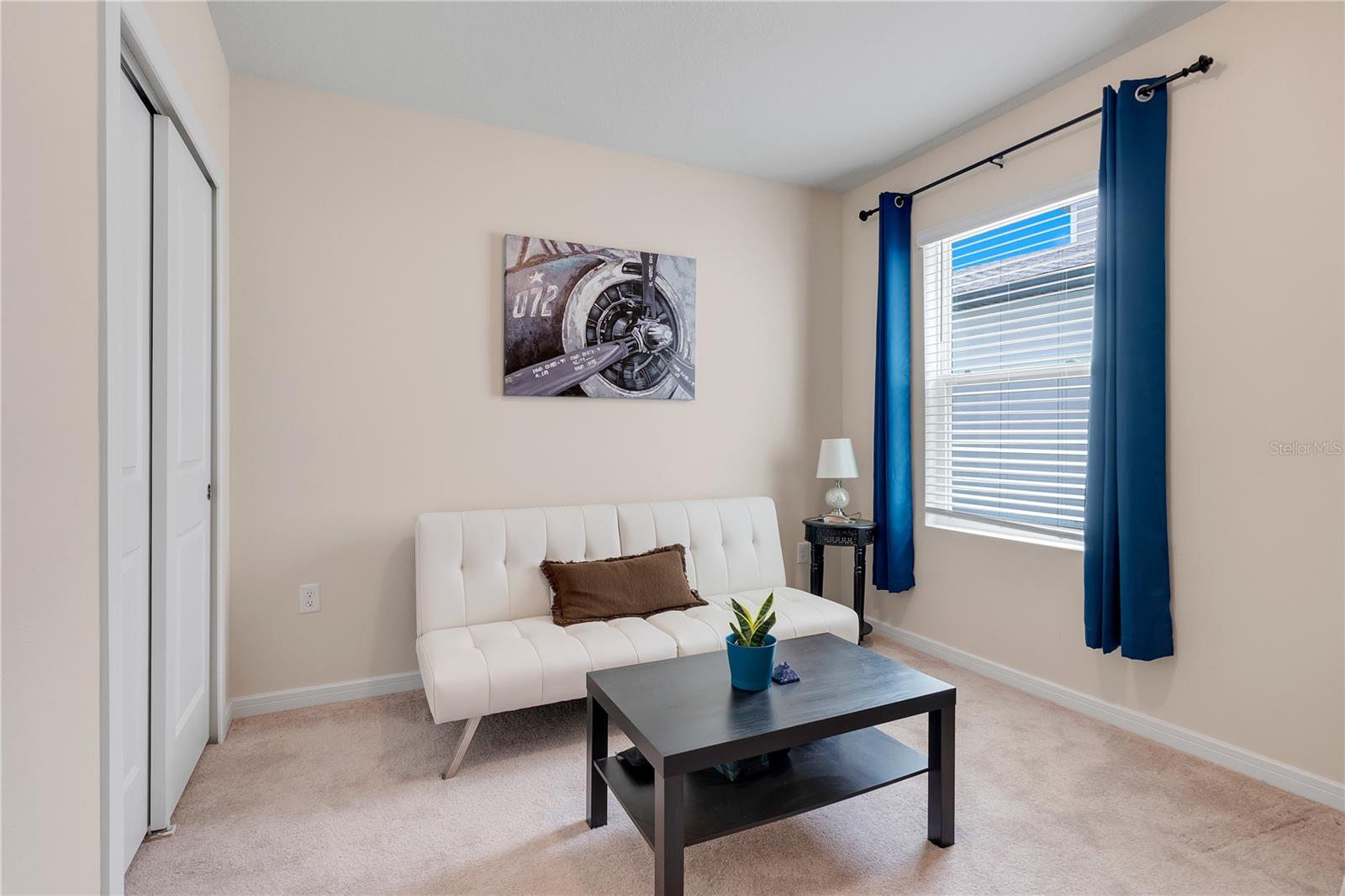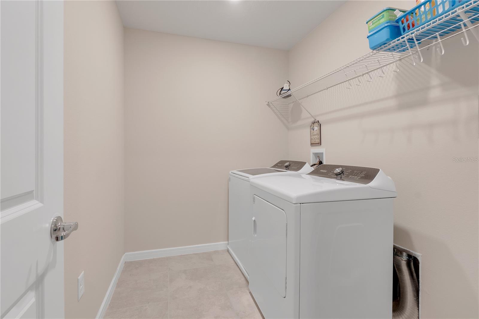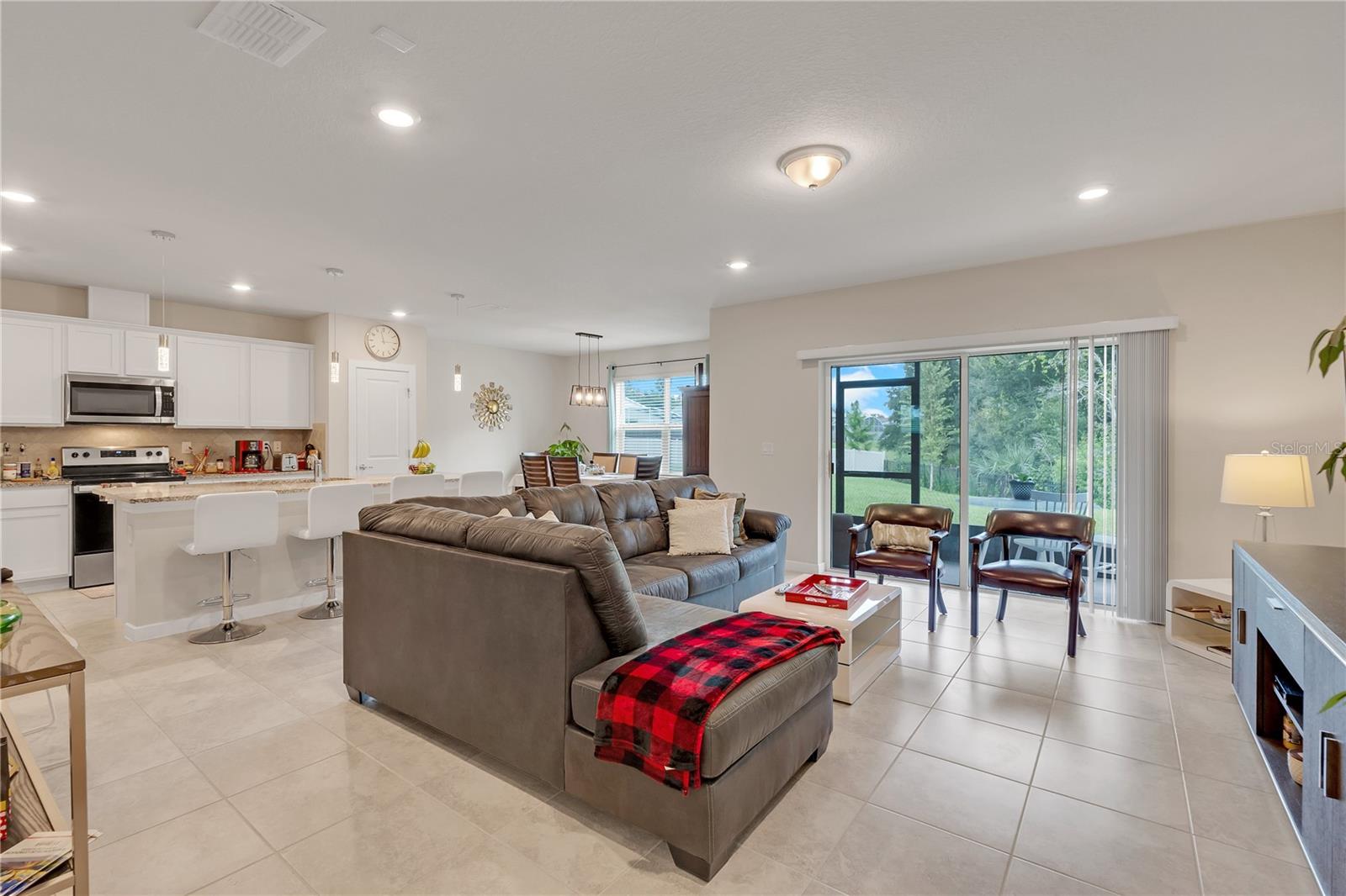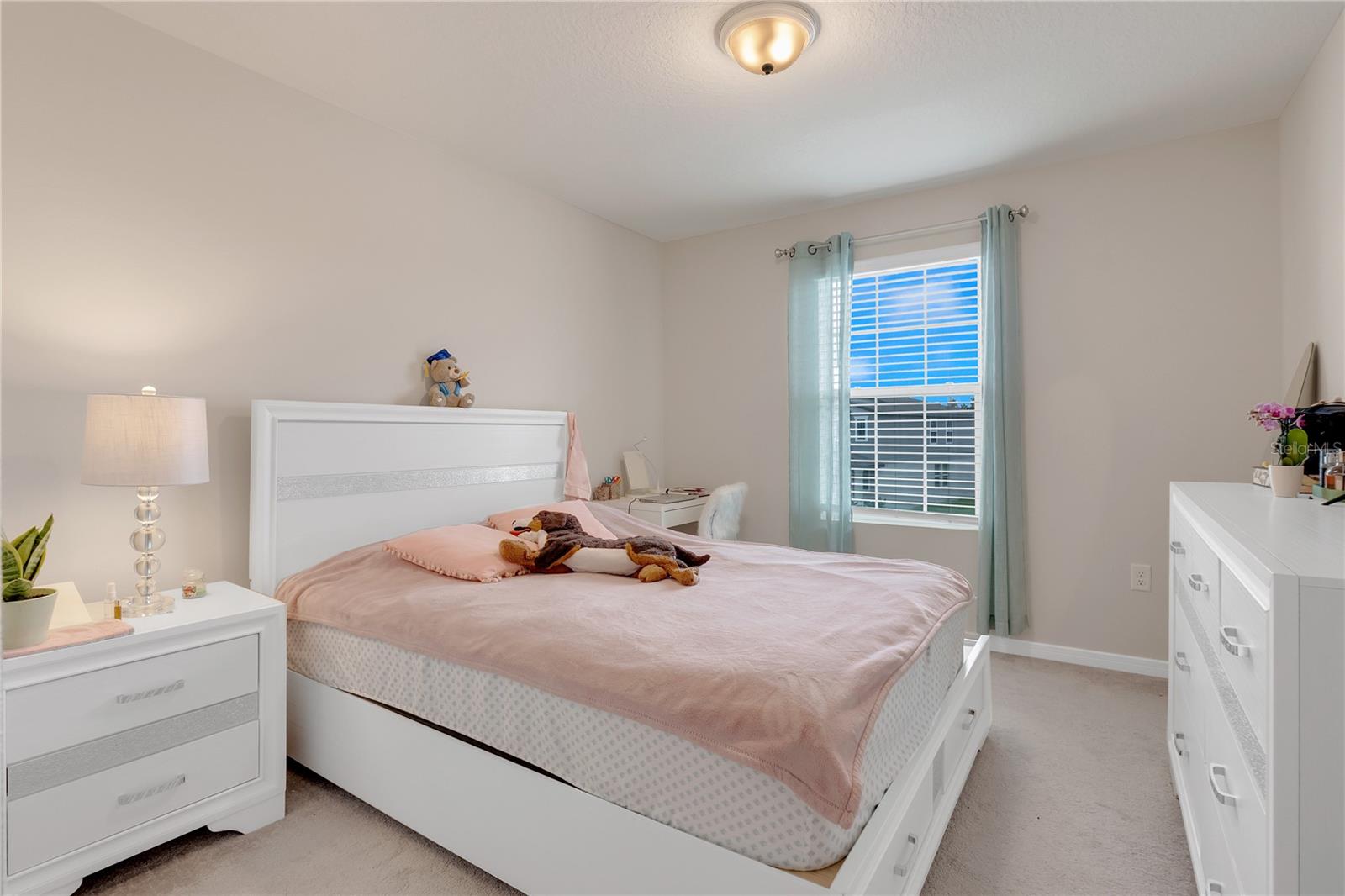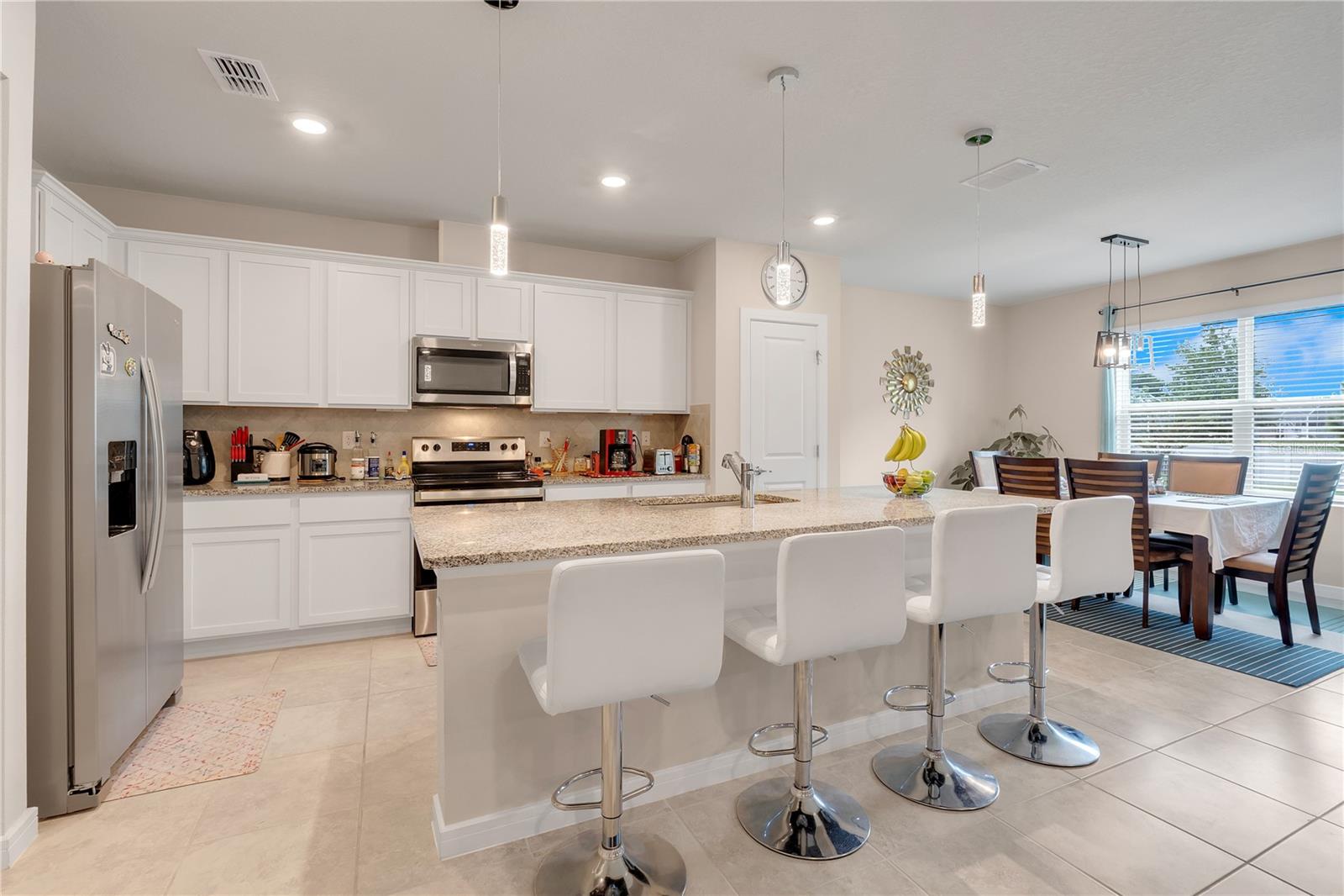 Built in 2023 this home is Turn key and ready for a new owner! Featuring stunning preservation views. This spacious property includes 5 bedrooms, 3 bathrooms, an upstairs loft, and a 2-car garage, thoughtfully designed with modern conveniences such as a washer, dryer, refrigerator, window blinds, and ample storage throughout. Solar panels to save on electricity and water softener system throughout the entire home. The open-concept first floor seamlessly integrates the kitchen, café, and gathering room, creating an ideal space for entertaining. The kitchen boasts a center island, storage pantry, stainless steel Whirlpool appliances, elegant cabinetry, and granite countertops. Step out to the lanai, located just beyond the café, for effortless indoor and outdoor entertaining. The main level also features a bedroom and full bathroom, perfect for accommodating guests or creating a private home office. Upstairs, the second floor offers ample space for the entire family, including a spacious loft, laundry room, three additional bedrooms, a third full bathroom, and the luxurious Owner’s Suite. The Owner’s Suite is a true retreat, complete with a large walk-in closet, en suite bathroom featuring a double quartz-topped vanity, dual sinks, a linen closet, and a walk-in shower. This home comes equipped with premium features, including a washer, dryer, refrigerator, blinds, a direct vented range hood, and our professionally curated Preferred design package. The kitchen is adorned with Villanova cabinetry, Majestic granite countertops, and Maple quartz countertops in the bathrooms. The first-floor living areas, bathrooms, and laundry room are graced with Boston Perla ceramic tile flooring, while stain-resistant Bare Mineral carpet adds comfort to the bedrooms and loft. This spacious Tybee home is perfect for relaxing and entertaining with family and friends. Located in the gated community of Cagan Crossings, this property offers affordable living with easy access to nearby attractions, shopping, and dining. The community features family-friendly amenities, including a pool with a cabana, playground, covered picnic area, and scenic wetland views. With highly ranked schools nearby, a convenient location just off Hwy-27, nine miles from I-4, and less than ten minutes to Disney, this is an opportunity you don’t want to miss!