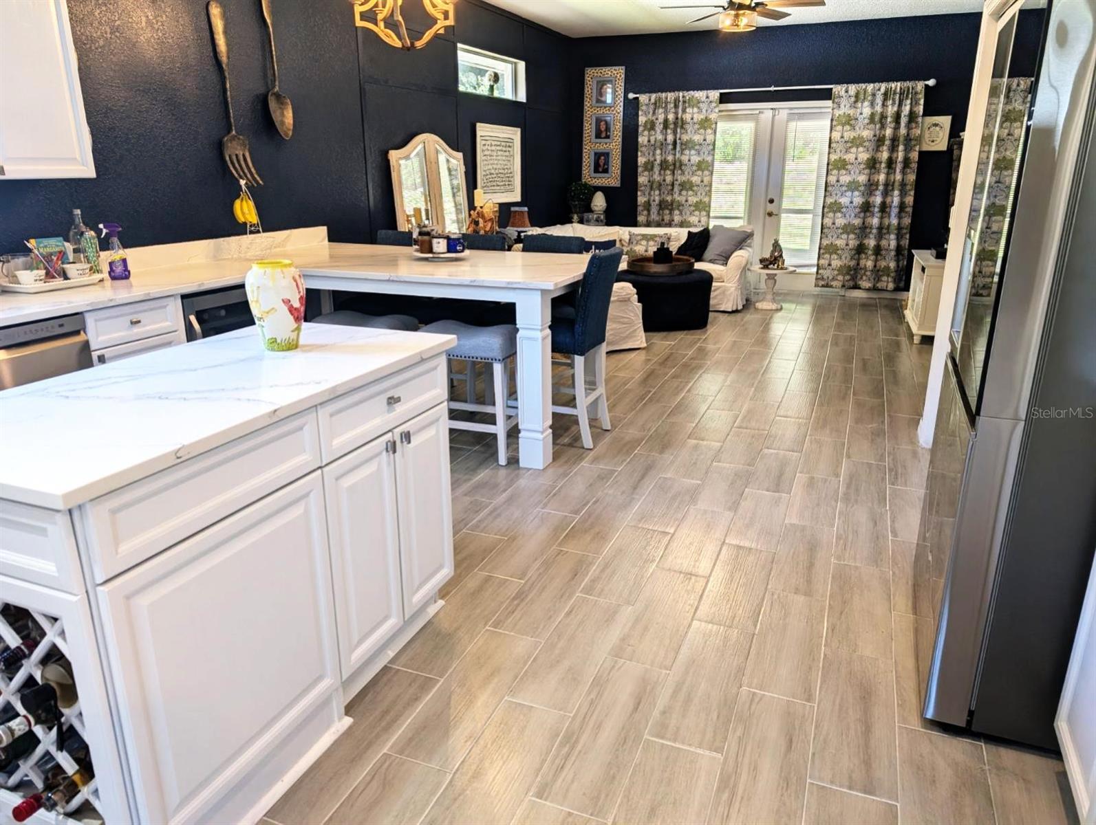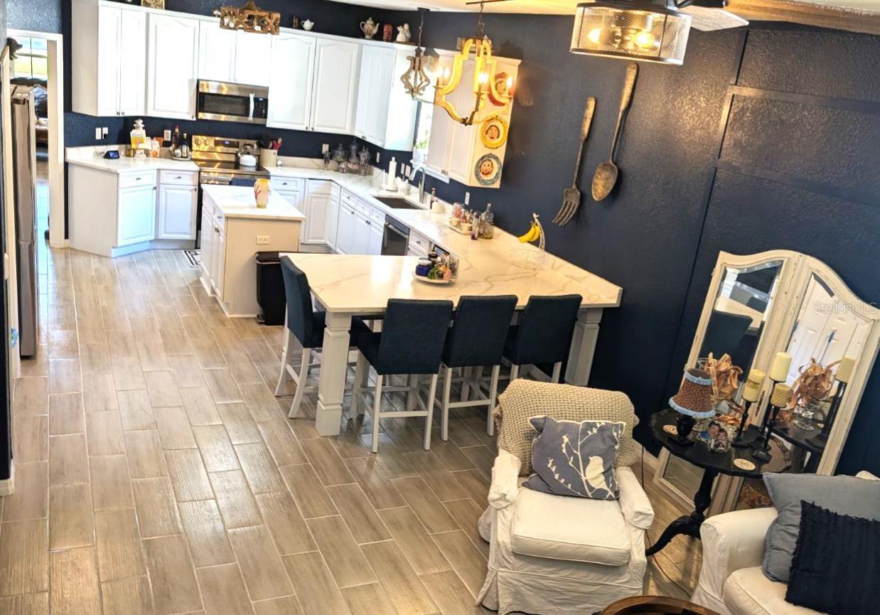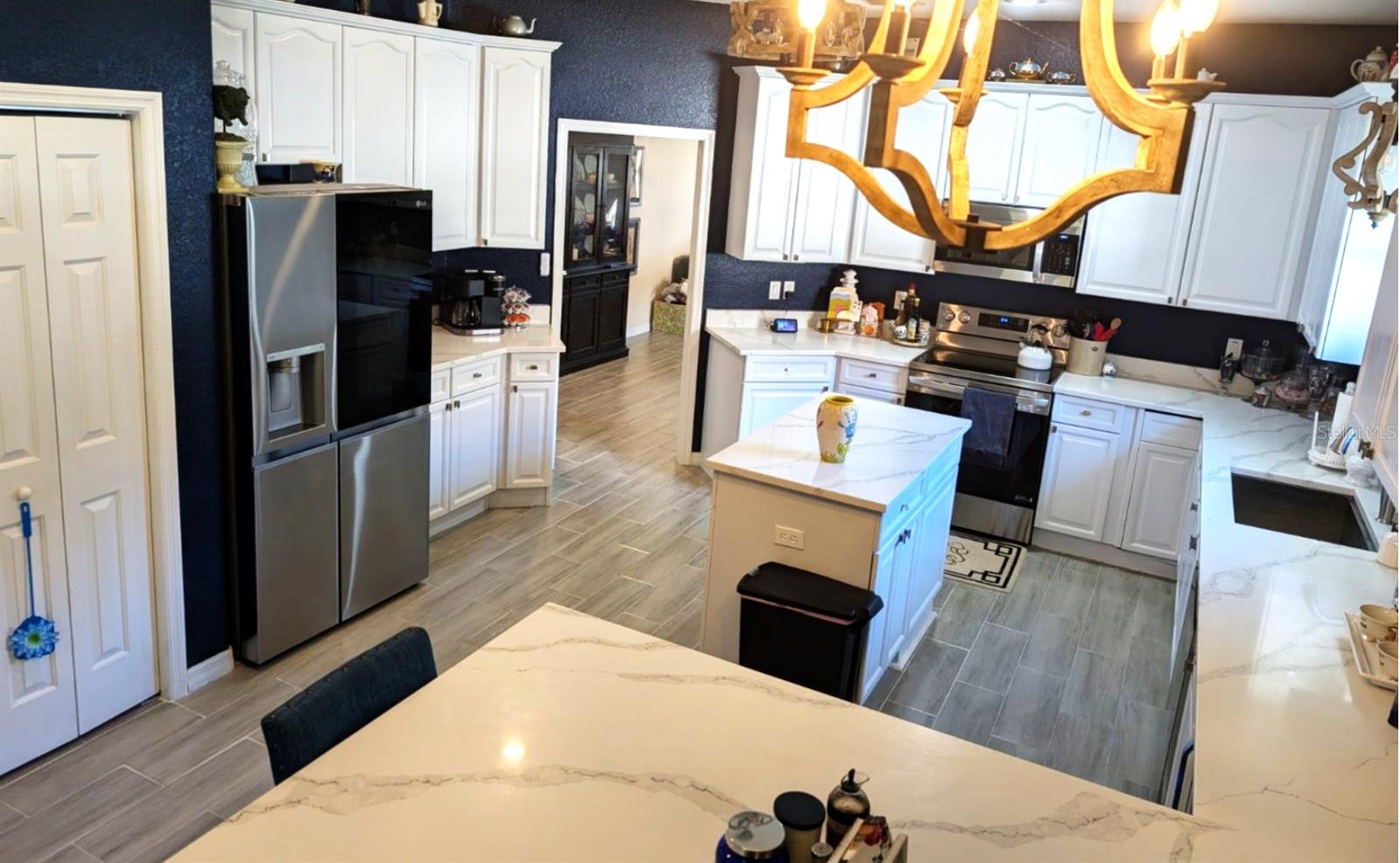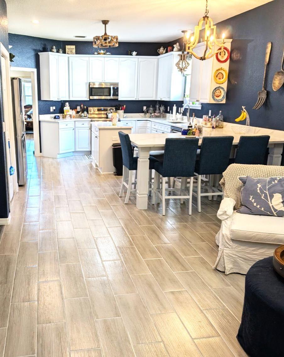 Come tour this well appointed single-story home, located on a canopy lined street in the picturesque community of Palisades. This home offers open living areas for easy entertaining. Upon entering the home, you will find new gray wood-look ceramic tile that flows throughout the main living areas. An open Dining Room/Living Room combination offers ample space to host family gatherings or parties with friends. Directly behind the formal living area is the recently updated Kitchen. This room features a completely new stainless steel appliance package, refaced wood cabinets, new Kraus sink and trash compactor as well as a custom designed quartz countertop featuring a large peninsula to enjoy meals. Any chef would be pleased with the double door pantry, and plenty of counterspace for meal prep. Partake in an evening libation to relax? This Kitchen has two storage options for your wine collection. The island features a wine rack and directly behind it, you will find a wine refrigerator. The main refrigerator features a craft ice maker for your high-ball drinks.The Great Room flows directly onto a screened lanai where you can enjoy the beautiful Florida weather. Dine”al fresco” in the comfort of this space or curl up with a book. The Owner’s Retreat sits off the back of the house as well, and has its own private door to access the screened lanai. This Primary Bath offers a spa like bathroom with a walk-in shower and garden tub. Are you a shopper? No need to worry about your shoe collection, the Owner’s Retreat also features and oversized walk-in closet! Most light fixtures throughout the home have been updated. The Guest Bath has new wallpaper and fixtures that have been added to give it a custom look. AC unit is 3 years old. This home is conveniently located close to Florida theme parks, golf courses, shopping, and restaurants. Schedule your appointment today to see this charming home.
