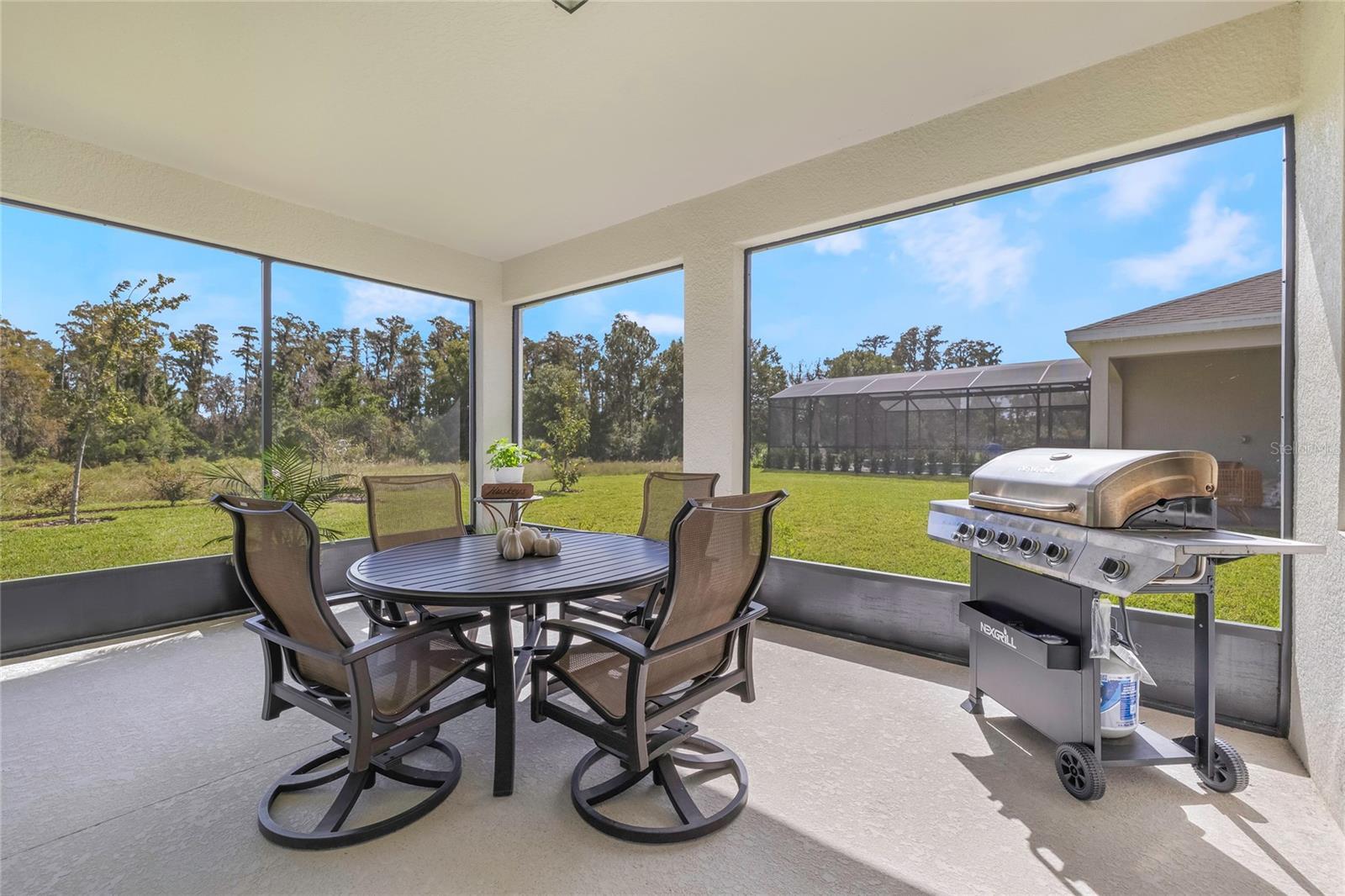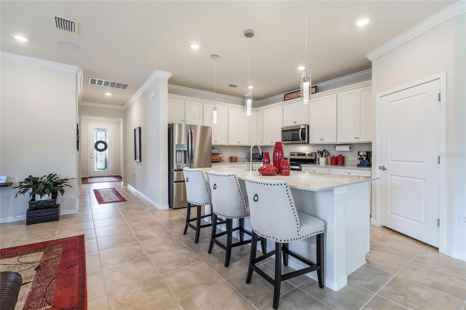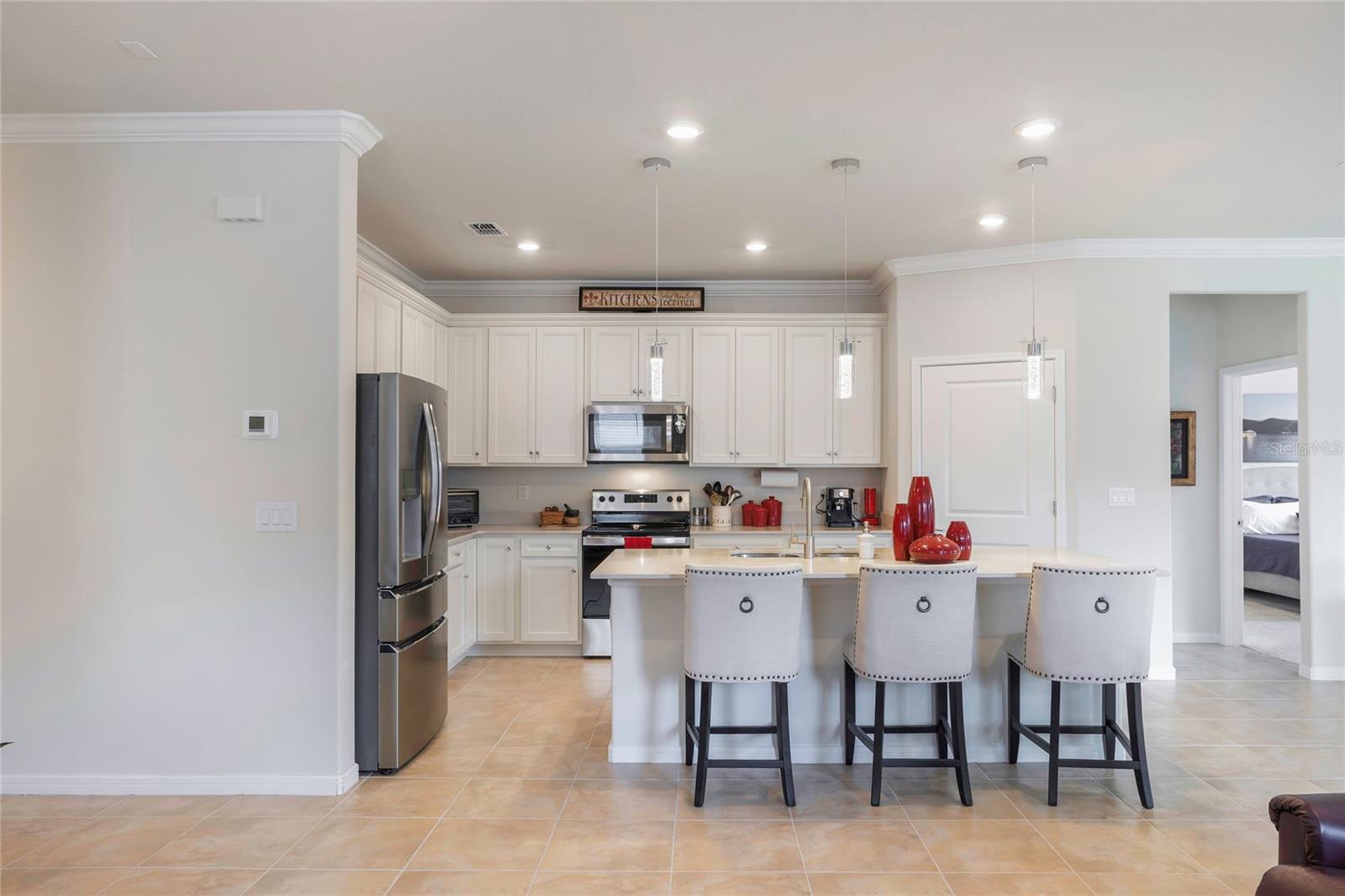 This nearly new beautiful four-bedroom, three-bathroom home sits on a spacious oversized conservation lot, offering privacy and a serene natural setting. The extended screened-in lanai is perfect for enjoying Florida's outdoor lifestyle year-round and for gazing at the nightly Disney Fireworks...yes, your own private view! Inside, each bedroom is generously sized, providing ample space and comfort for family or guests. The heart of the home is the upgraded kitchen, featuring elegant white cabinets, sleek quartz countertops, and a large island adorned with three modern pendant lights—ideal for entertaining or casual dining. The laundry room boasts built-in cabinets to keep everything organized. Beyond the home itself, the community offers a range of top-tier amenities, including a resort-style pool, clubhouse, fitness center, and playground. Conveniently located in Clermont, the future connector road will provide quick access to Disney and other nearby attractions, making this home not only a sanctuary but also a central hub for everything the area has to offer. WELCOME HOME!