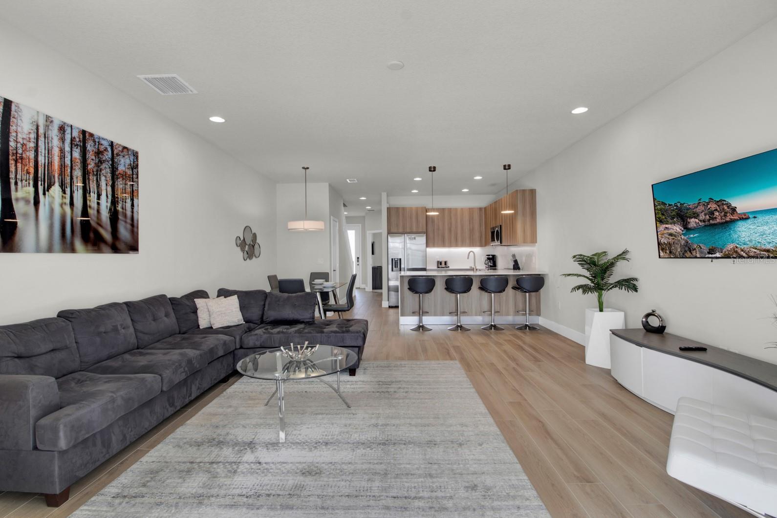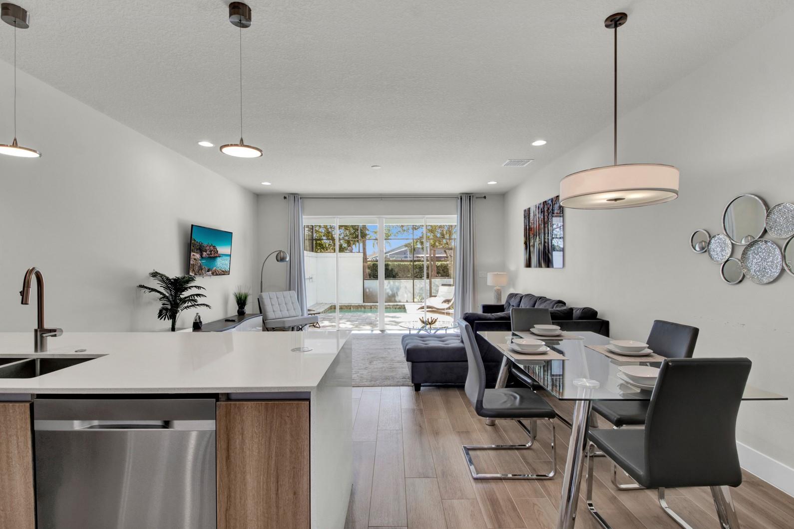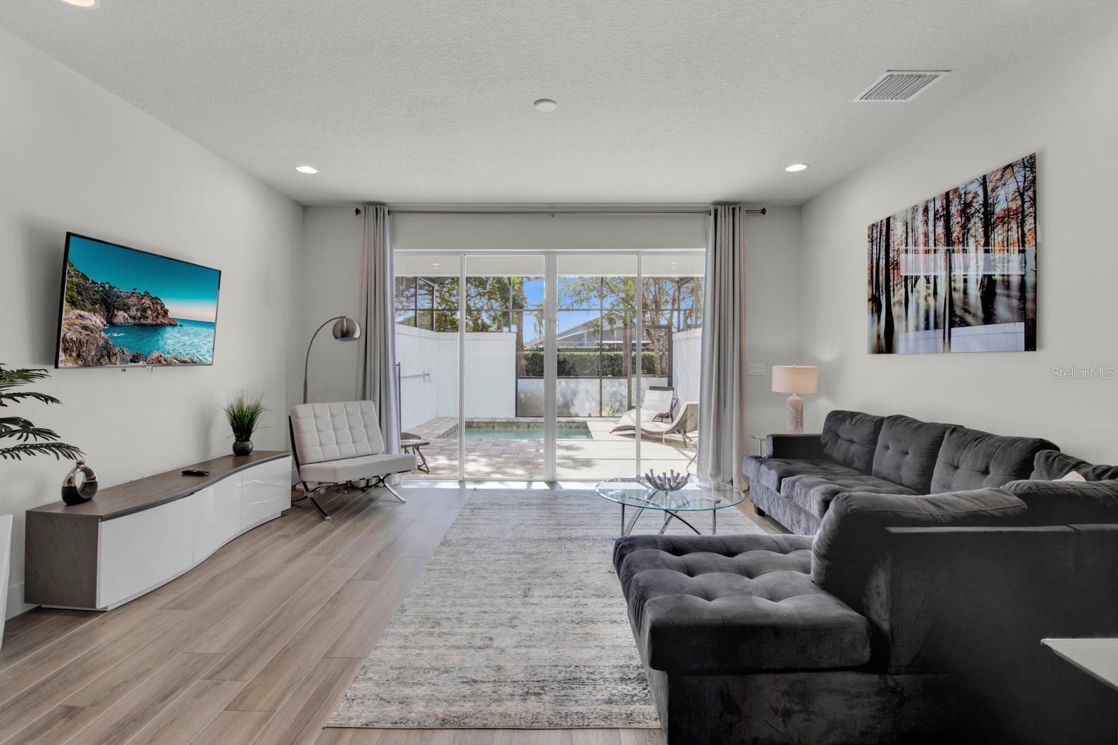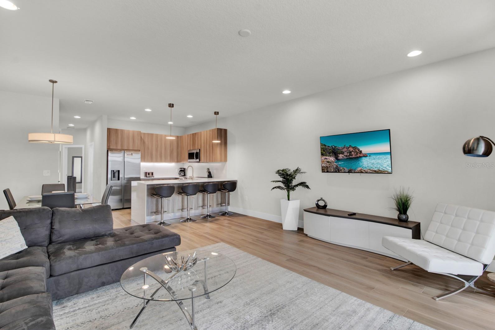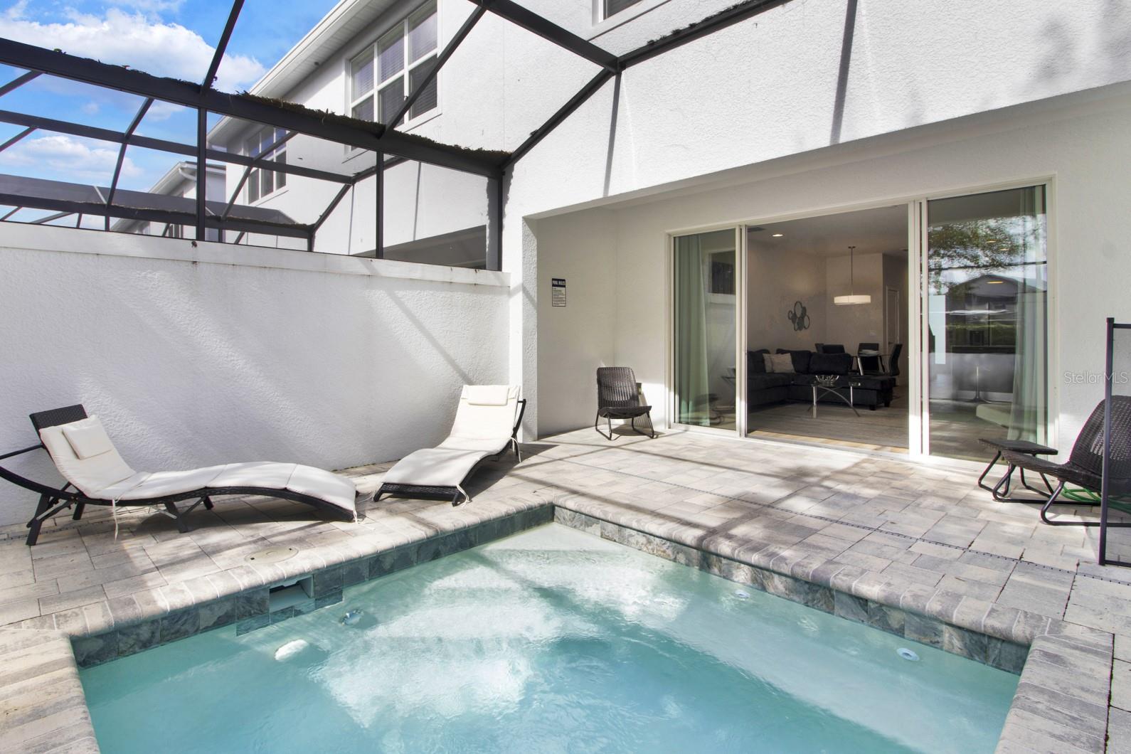 Check out this small community of luxury townhomes just 8 miles from Disney parks where you can live full-time or lease as a short-term investment. Every corner of this home exudes modern sophistication, from the open-concept living spaces to the designer finishes and tasteful decor. FULLY FURNISHED this turn-key home features 3-bedrooms and 3-full bathrooms, a private swim spa and tons of upgrades! The light and bright open floor plan on the main floor has faux wood tile, making maintenance breeze, a wall of sliding glass doors for natural light and a chef’s dream kitchen! The contemporary kitchen features a waterfall quartz countertop, matching backsplash, sleek cabinetry with under cabinet lighting and stainless appliances. One bedroom/bathroom is located on the ground floor for those that have trouble with stairs or to use as an office. Upstairs you will find a versatile loft, second bedroom and the huge primary suite. Relax and unwind at the end of a long day in your tranquil retreat space that has a walk-in closet and must see en-suite bath with a floating vanity, lighted mirrors and large walk-in shower. The back screened-in lanai features a private and heated swim-spa, take a dip before heading out to spend a day at the theme parks or cookout poolside and enjoy a day at home. This community is surrounded by nature, has an affordable HOA and is within close proximity to world-class theme parks, attractions, golf courses, shopping, and restaurants!