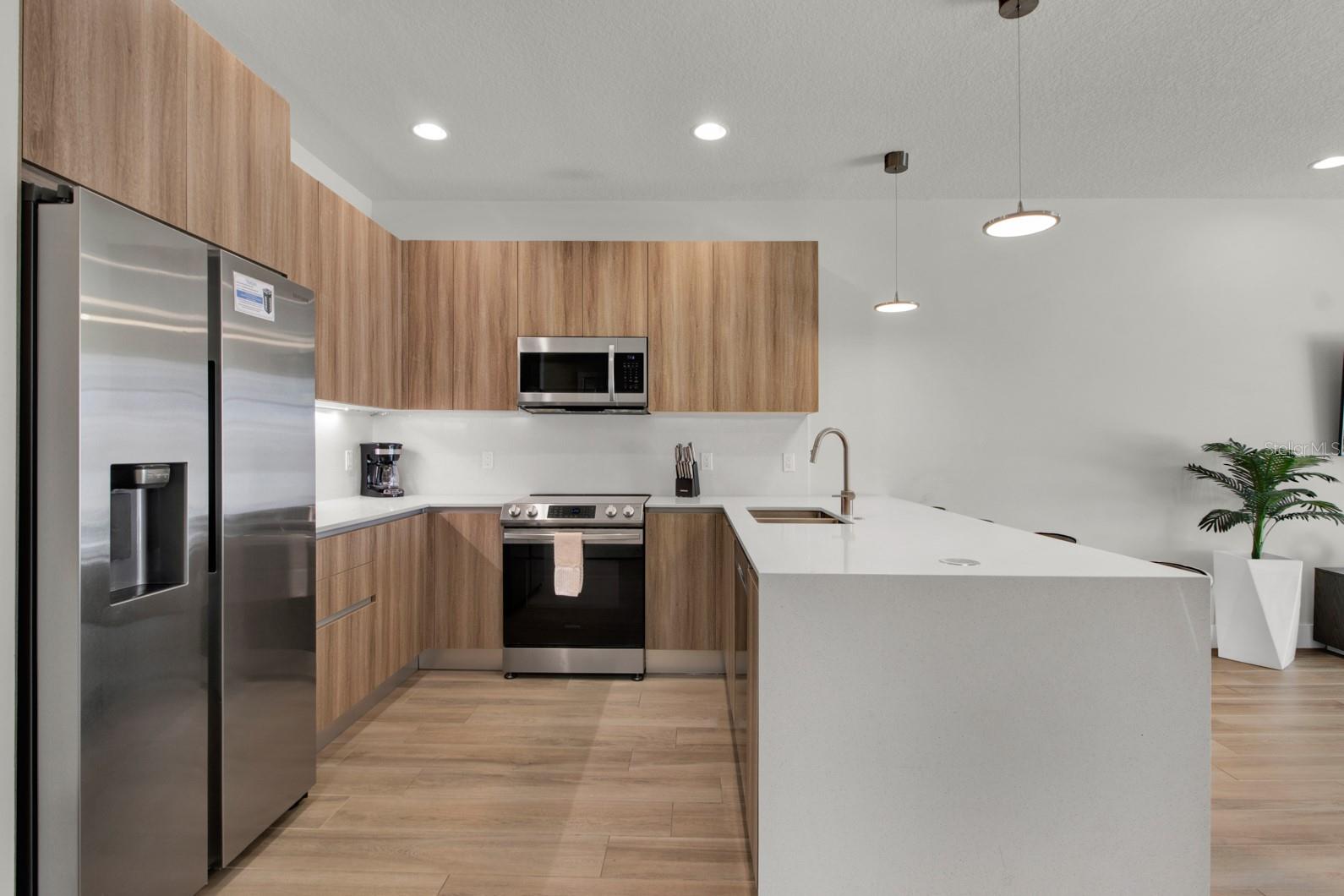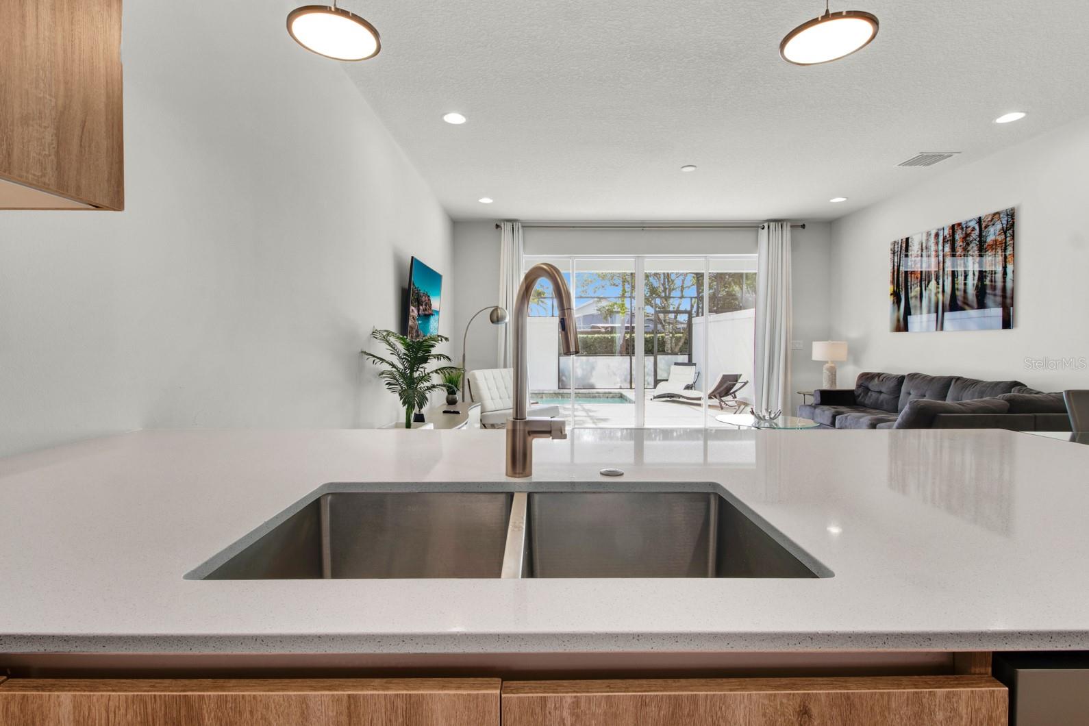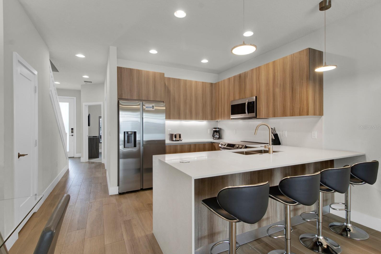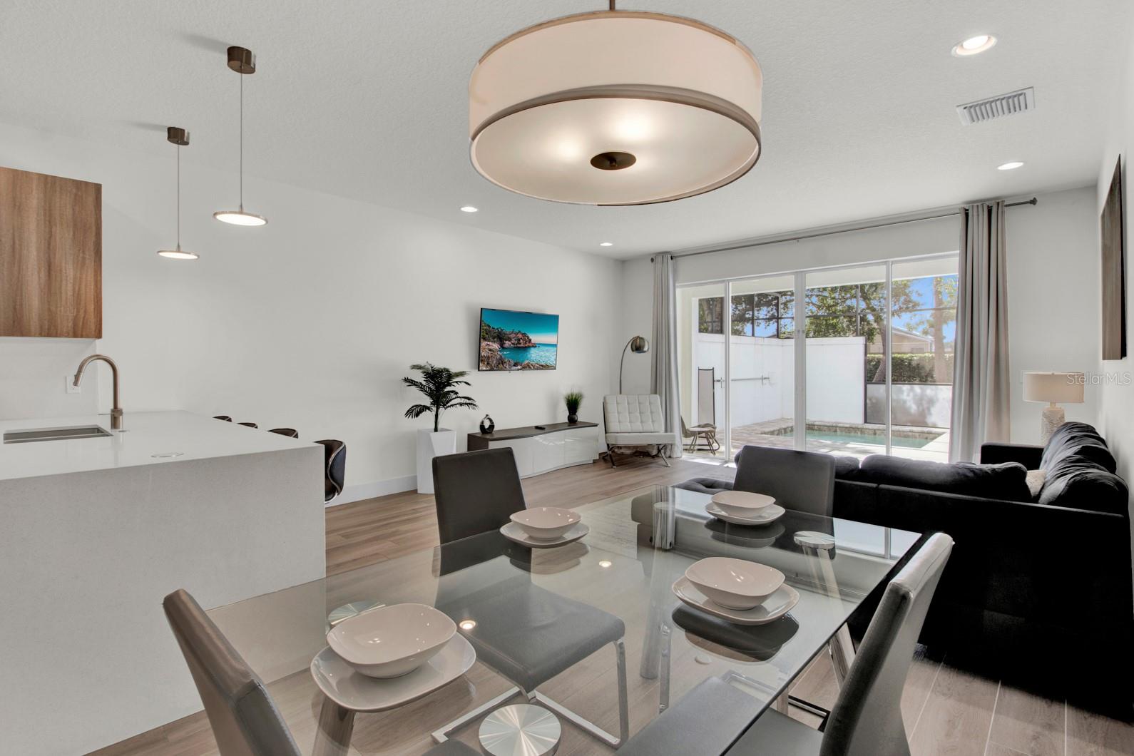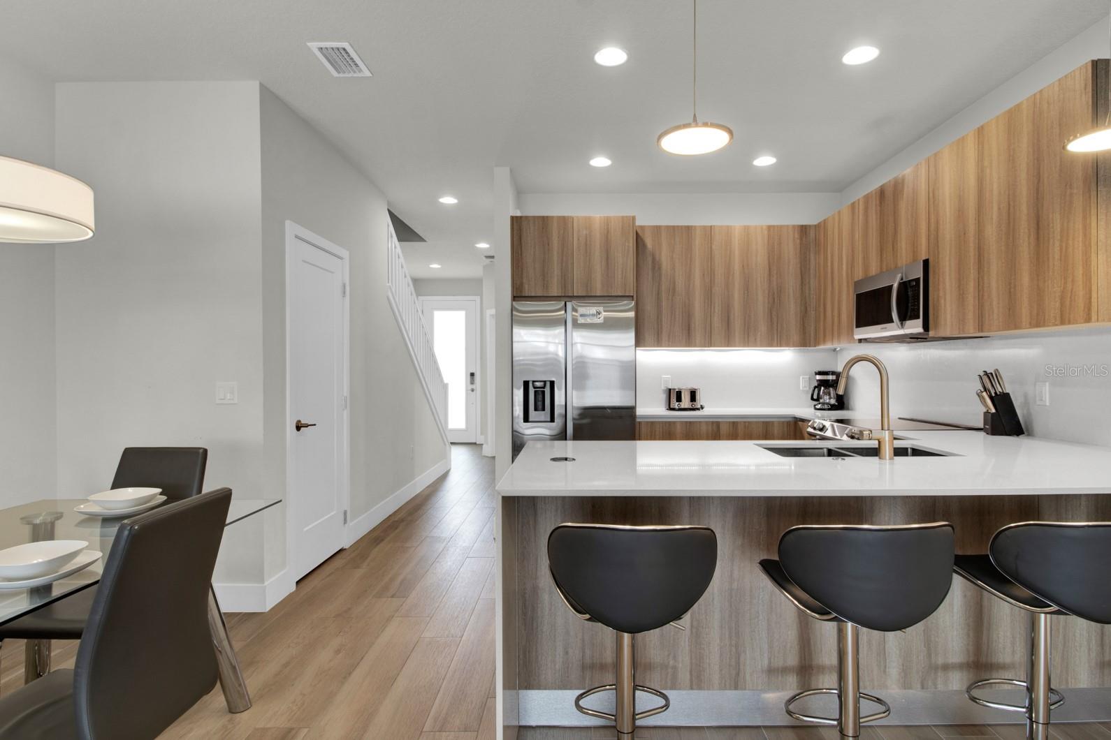 Check out this small community of luxury townhomes just 8 miles from Disney parks where you can live full-time or lease as a short-term investment. Every corner of this home exudes modern sophistication, from the open-concept living spaces to the designer finishes and tasteful decor. FULLY FURNISHED this turn-key home features 3-bedrooms and 3-full bathrooms, a private swim spa and tons of upgrades! The light and bright open floor plan on the main floor has faux wood tile, making maintenance breeze, a wall of sliding glass doors for natural light and a chef’s dream kitchen! The contemporary kitchen features a waterfall quartz countertop, matching backsplash, sleek cabinetry with under cabinet lighting and stainless appliances. One bedroom/bathroom is located on the ground floor for those that have trouble with stairs or to use as an office. Upstairs you will find a versatile loft, second bedroom and the huge primary suite. Relax and unwind at the end of a long day in your tranquil retreat space that has a walk-in closet and must see en-suite bath with a floating vanity, lighted mirrors and large walk-in shower. The back screened-in lanai features a private and heated swim-spa, take a dip before heading out to spend a day at the theme parks or cookout poolside and enjoy a day at home. This community is surrounded by nature, has an affordable HOA and is within close proximity to world-class theme parks, attractions, golf courses, shopping, and restaurants!