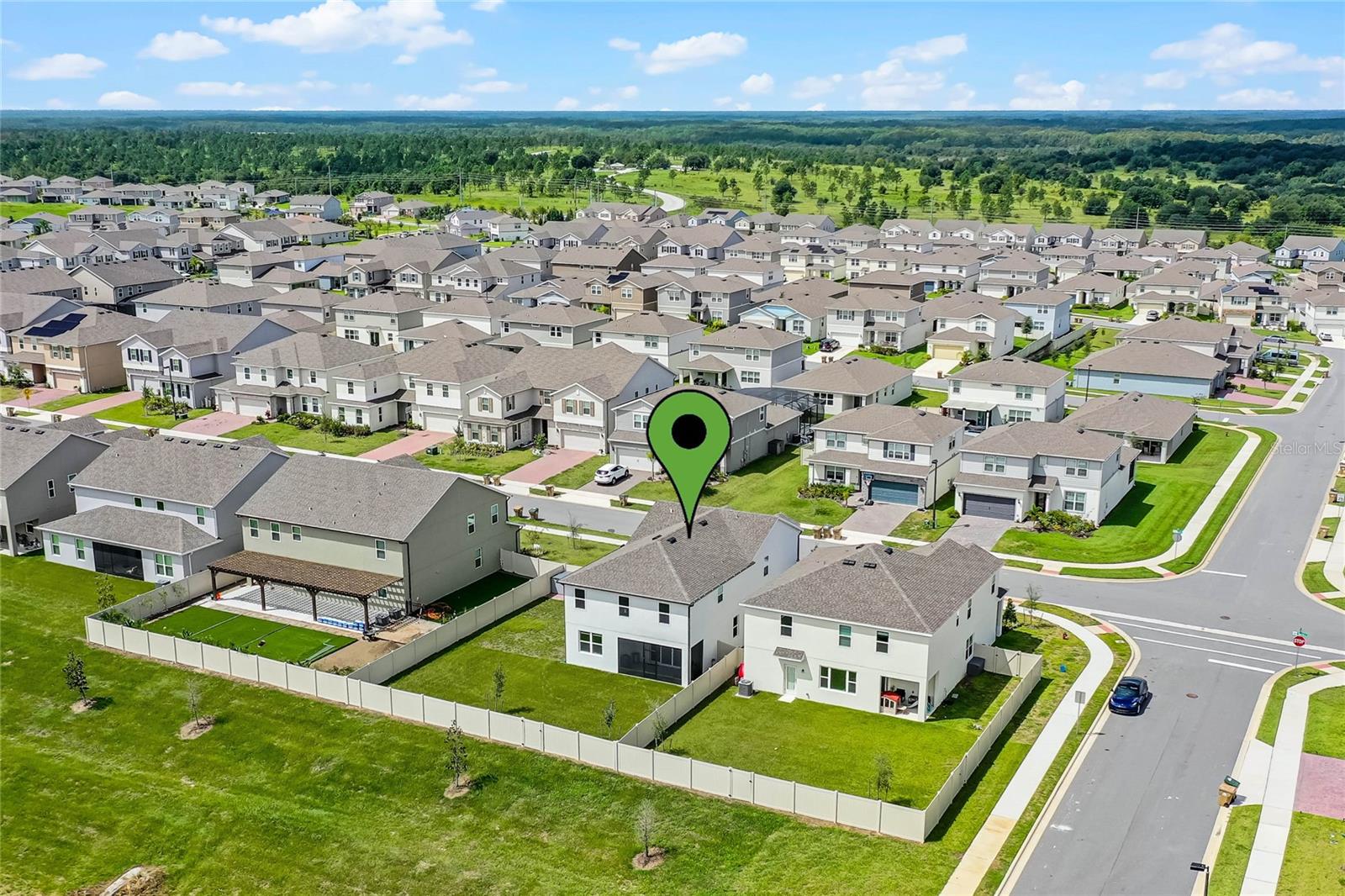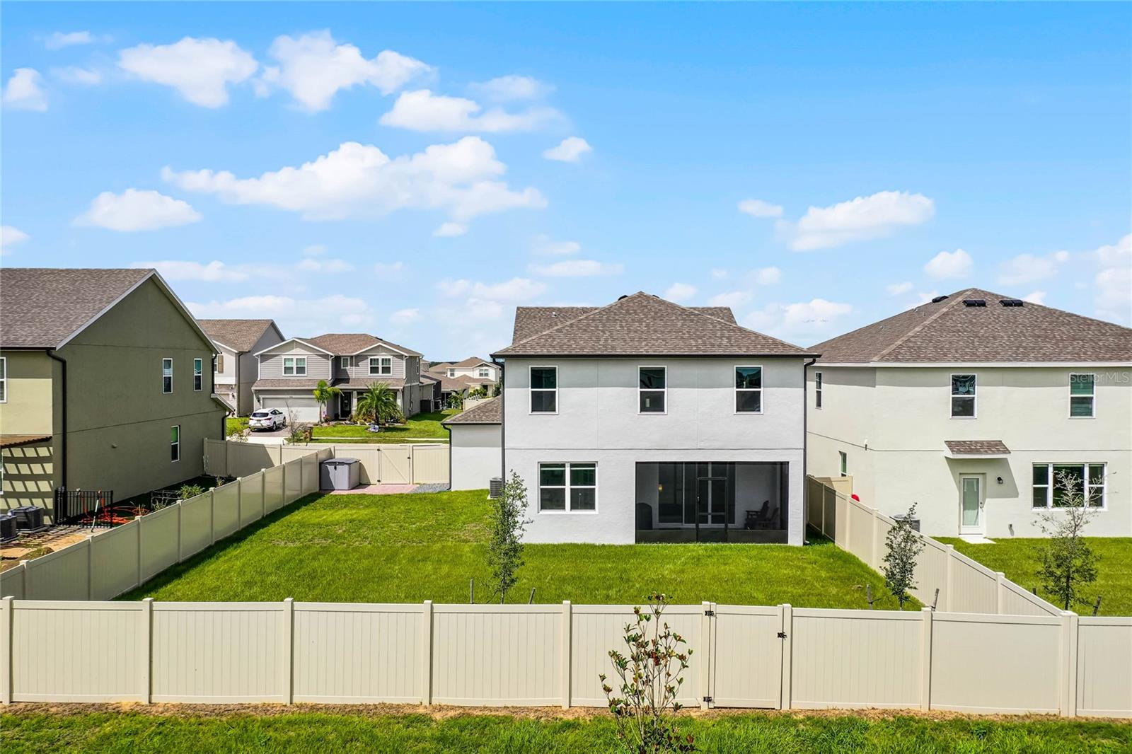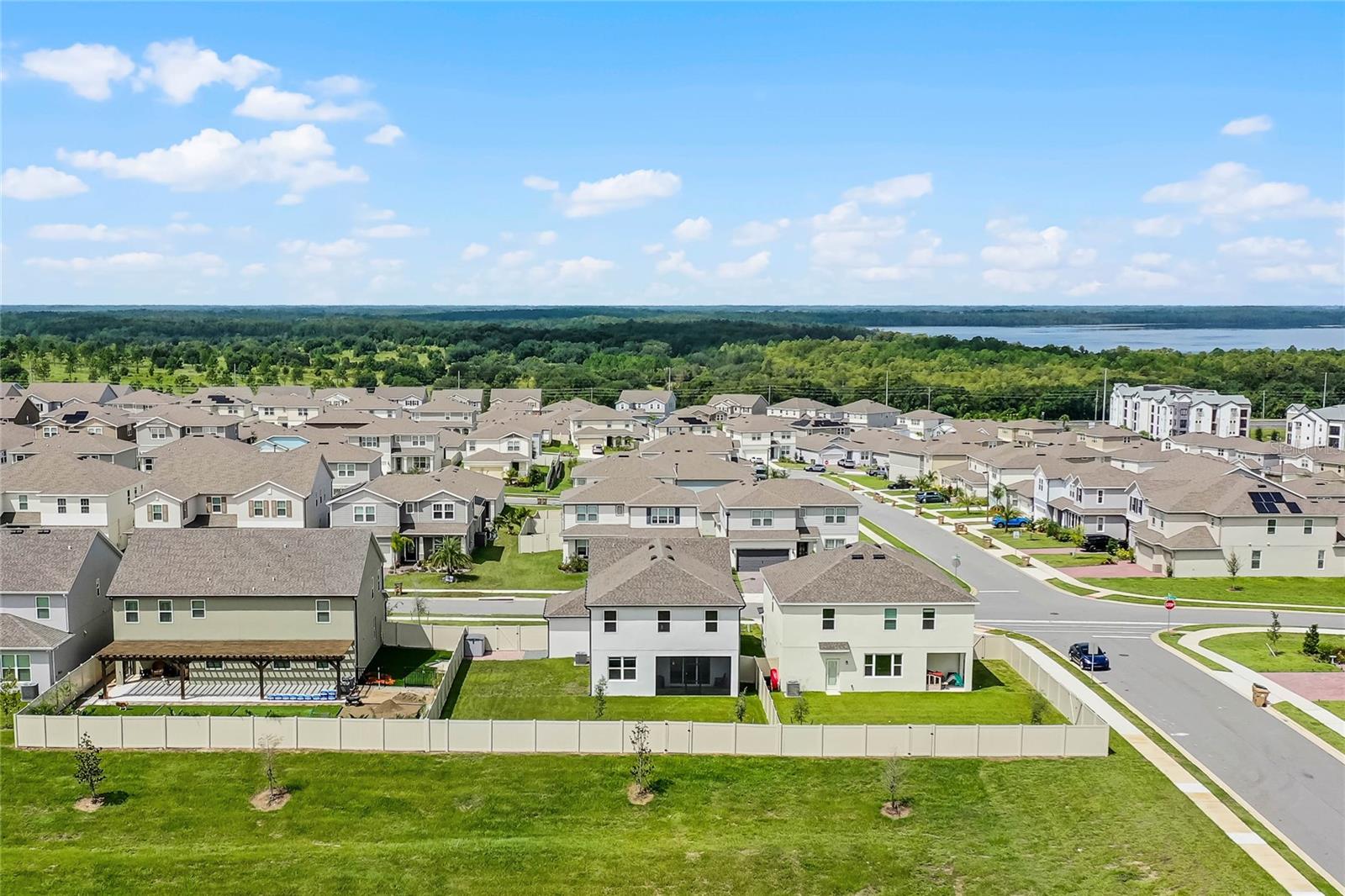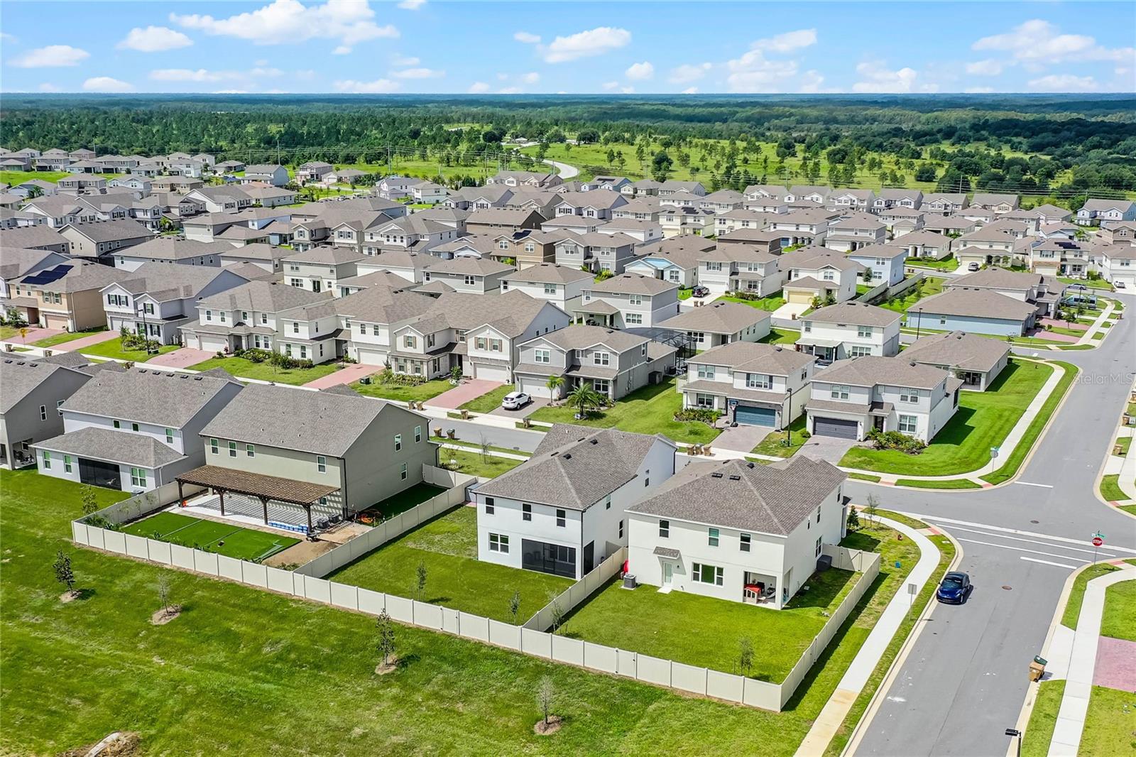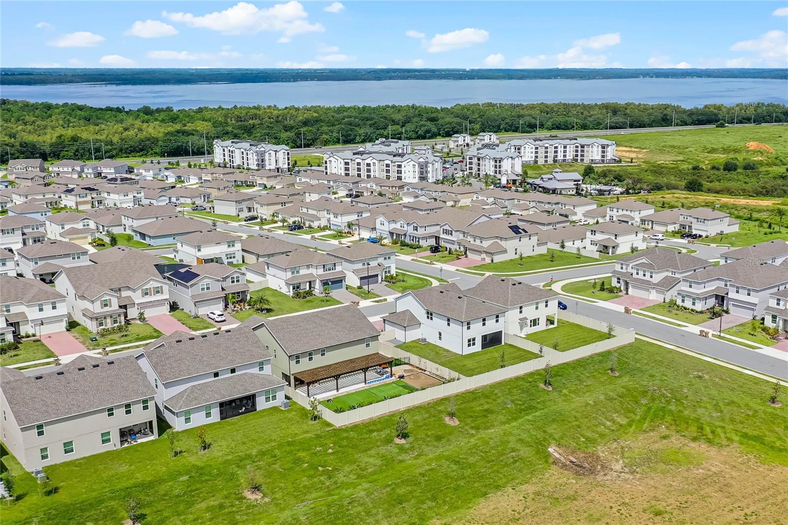 Why wait to build when you can own this stunning, better than new 4-bedroom, 2.5-bath home with an office and loft, perfectly situated on a private lot with no rear neighbors, backing up to a serene retention area. Lived in for less than a year, this home is in pristine condition and boasts over $100,000 in luxurious upgrades. From the moment you arrive, the beautiful stone front façade and paver driveway and walkway create an inviting first impression. The large, fenced backyard offers ample room to design your dream pool, with a paver walkway extending from the front yard to the gate. Step inside through the charming covered front porch, where luxury vinyl plank floors flow seamlessly throughout the main level. The spacious foyer features a drop zone/mudroom for convenient storage. The open-concept living space includes a bright and airy dining area, living room, and a chef’s dream kitchen. The kitchen is a true showpiece, with under-cabinet lighting, quartz countertops, stainless steel appliances, a subway-tile backsplash, and a large counter-height island with pendant lighting perfect for casual dining. The kitchen also offers a pantry with custom shelving and an additional storage closet, ideal for a second pantry. Adjacent to the living area, a dedicated office space provides a quiet retreat with views of the backyard. The first floor also includes a half bath and a functional laundry room equipped with built-in cabinetry and a quartz-topped folding station for added convenience. Upstairs, plush upgraded carpeting guides you to a spacious loft, perfect for additional living space. The primary suite is an impressive retreat, featuring a separate sitting area ideal for a home gym, nursery, or private relaxation space. The en-suite bath is beautifully appointed with a double-sink quartz vanity, a glass enclosed shower, and a large walk-in closet with a custom closet system. Additional upgrades in the primary suite include a Brondell Swash toilet seat for a spa-like experience. The remaining bedrooms are generously sized and share a well-appointed second full bath with a double quartz vanity and another upgraded toilet seat. Outside, enjoy the peaceful view from the screened lanai, overlooking the expansive backyard, which extends along the side of the house. The home is packed with modern conveniences, including smart features such as WiFi-enabled lighting, a doorbell camera, a smart thermostat, a WiFi garage door opener, and a front door keypad. Ceiling fans with remote controls are installed in every room, and thoughtful touches like nightlight outlets throughout the hallways and bathrooms add to the home’s charm. The garage and lanai floors have been upgraded with durable Polyaspartic floor coating, and the exterior is equipped with gutters for added functionality. Located just across from Lake Louisa State Park, this home is surrounded by natural beauty and offers easy access to outdoor adventures such as swimming, boating, hiking, and biking. The Ridgeview community, conveniently located on US 27 with nearby SR 429 access, is next to the upcoming Olympus Sports Project, promising future recreational opportunities.