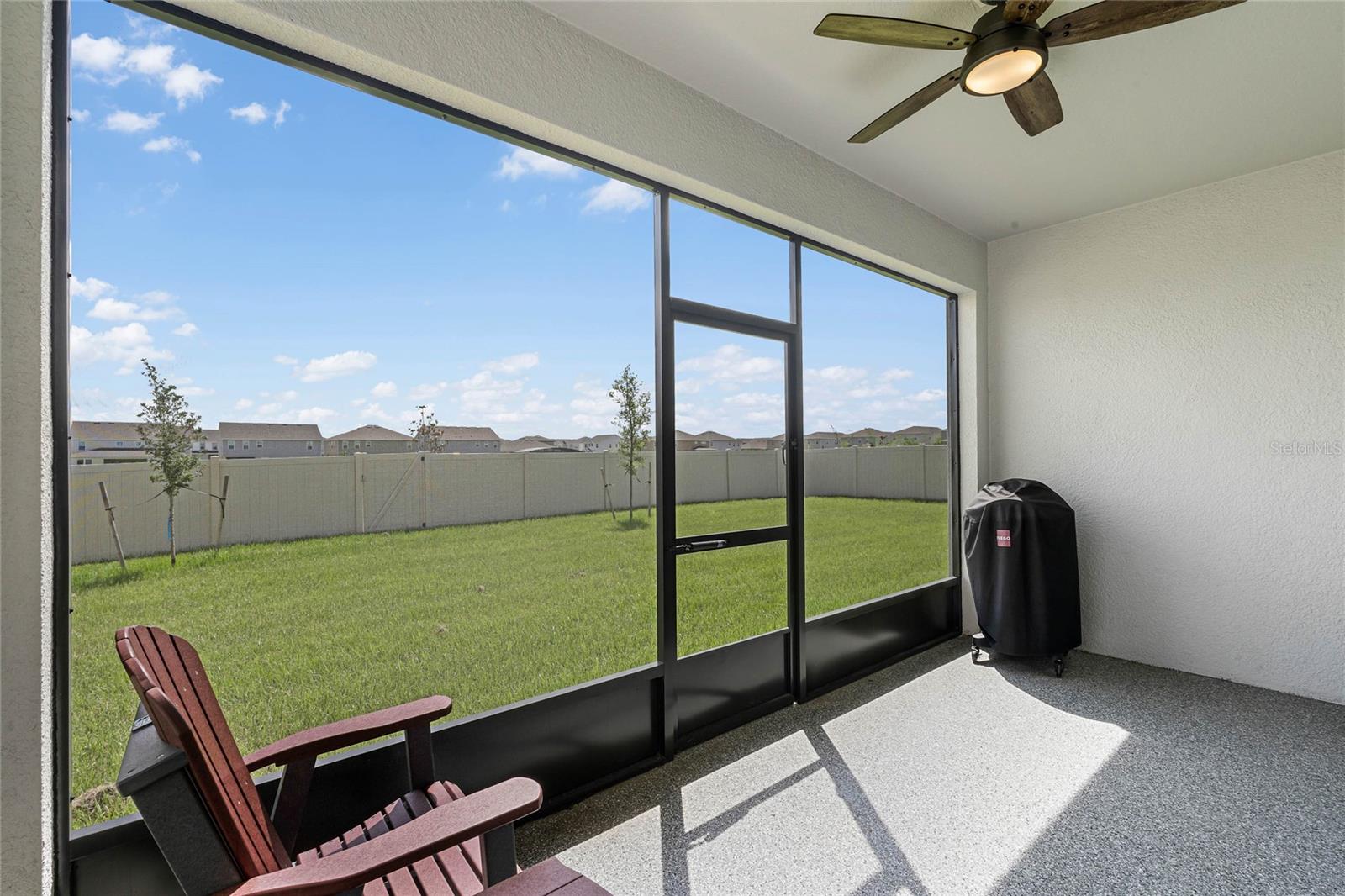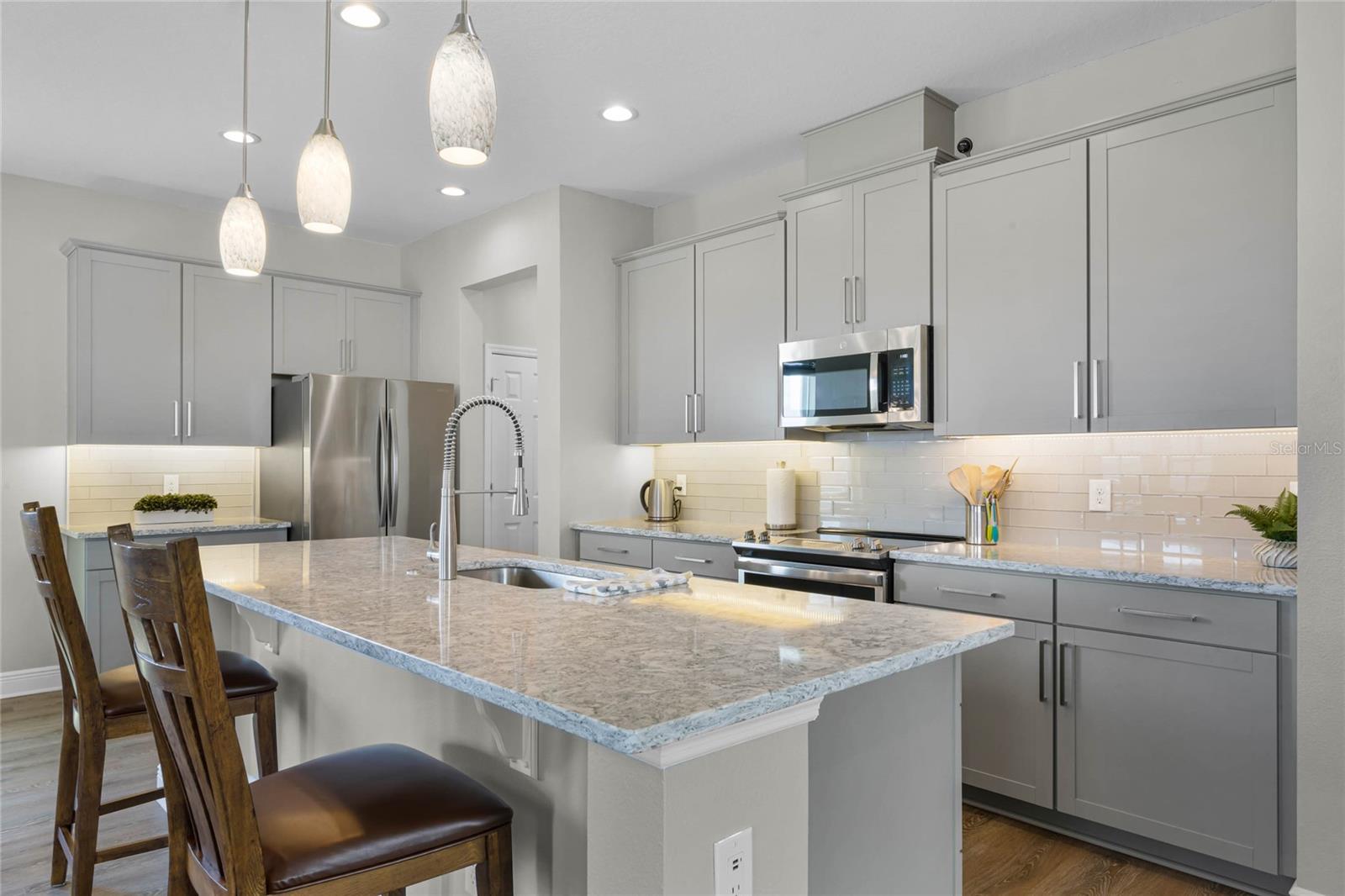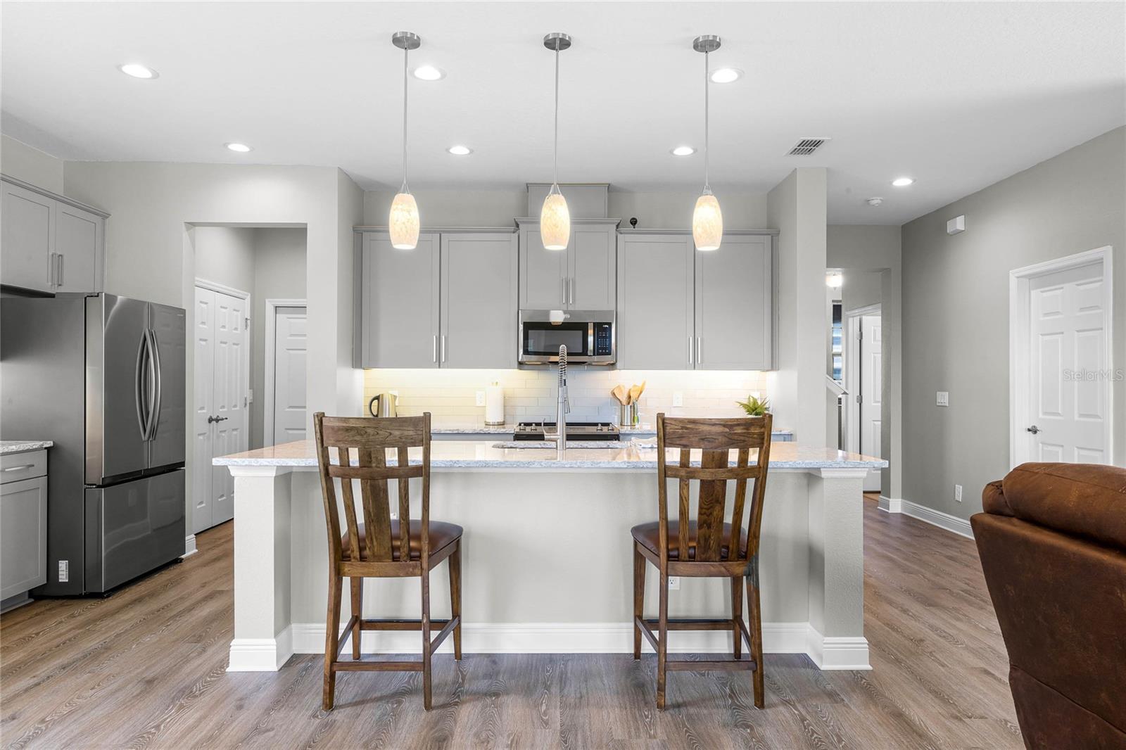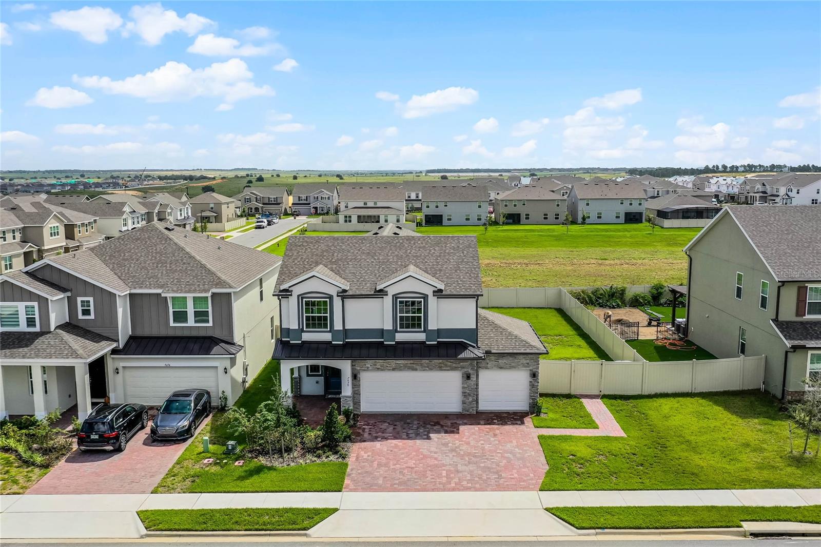 Why wait to build when you can own this stunning, better than new 4-bedroom, 2.5-bath home with an office and loft, perfectly situated on a private lot with no rear neighbors, backing up to a serene retention area. Lived in for less than a year, this home is in pristine condition and boasts over $100,000 in luxurious upgrades. From the moment you arrive, the beautiful stone front façade and paver driveway and walkway create an inviting first impression. The large, fenced backyard offers ample room to design your dream pool, with a paver walkway extending from the front yard to the gate. Step inside through the charming covered front porch, where luxury vinyl plank floors flow seamlessly throughout the main level. The spacious foyer features a drop zone/mudroom for convenient storage. The open-concept living space includes a bright and airy dining area, living room, and a chef’s dream kitchen. The kitchen is a true showpiece, with under-cabinet lighting, quartz countertops, stainless steel appliances, a subway-tile backsplash, and a large counter-height island with pendant lighting perfect for casual dining. The kitchen also offers a pantry with custom shelving and an additional storage closet, ideal for a second pantry. Adjacent to the living area, a dedicated office space provides a quiet retreat with views of the backyard. The first floor also includes a half bath and a functional laundry room equipped with built-in cabinetry and a quartz-topped folding station for added convenience. Upstairs, plush upgraded carpeting guides you to a spacious loft, perfect for additional living space. The primary suite is an impressive retreat, featuring a separate sitting area ideal for a home gym, nursery, or private relaxation space. The en-suite bath is beautifully appointed with a double-sink quartz vanity, a glass enclosed shower, and a large walk-in closet with a custom closet system. Additional upgrades in the primary suite include a Brondell Swash toilet seat for a spa-like experience. The remaining bedrooms are generously sized and share a well-appointed second full bath with a double quartz vanity and another upgraded toilet seat. Outside, enjoy the peaceful view from the screened lanai, overlooking the expansive backyard, which extends along the side of the house. The home is packed with modern conveniences, including smart features such as WiFi-enabled lighting, a doorbell camera, a smart thermostat, a WiFi garage door opener, and a front door keypad. Ceiling fans with remote controls are installed in every room, and thoughtful touches like nightlight outlets throughout the hallways and bathrooms add to the home’s charm. The garage and lanai floors have been upgraded with durable Polyaspartic floor coating, and the exterior is equipped with gutters for added functionality. Located just across from Lake Louisa State Park, this home is surrounded by natural beauty and offers easy access to outdoor adventures such as swimming, boating, hiking, and biking. The Ridgeview community, conveniently located on US 27 with nearby SR 429 access, is next to the upcoming Olympus Sports Project, promising future recreational opportunities.