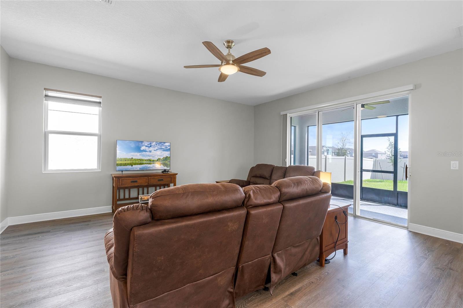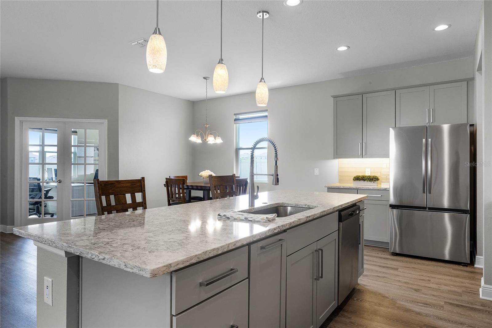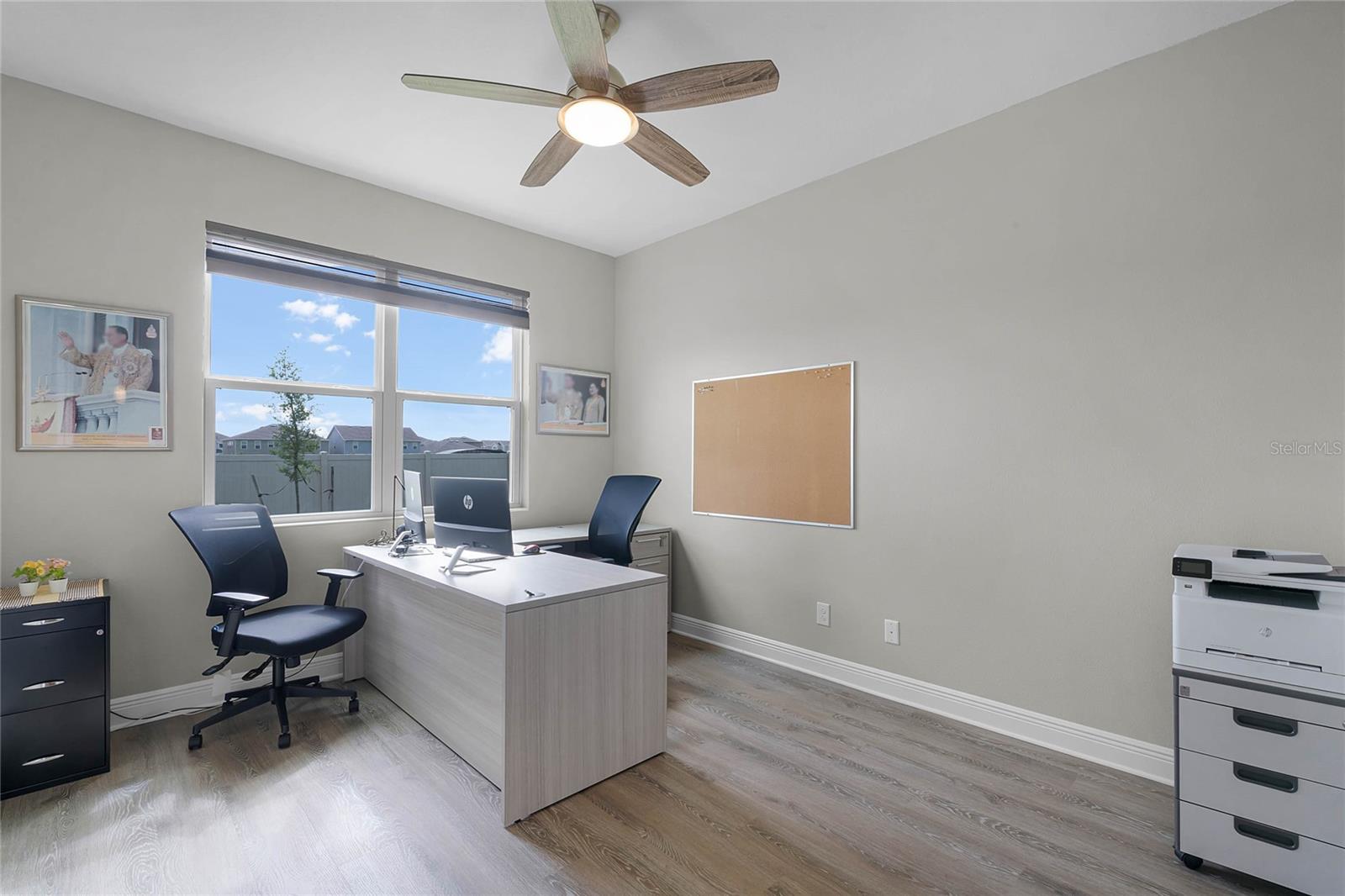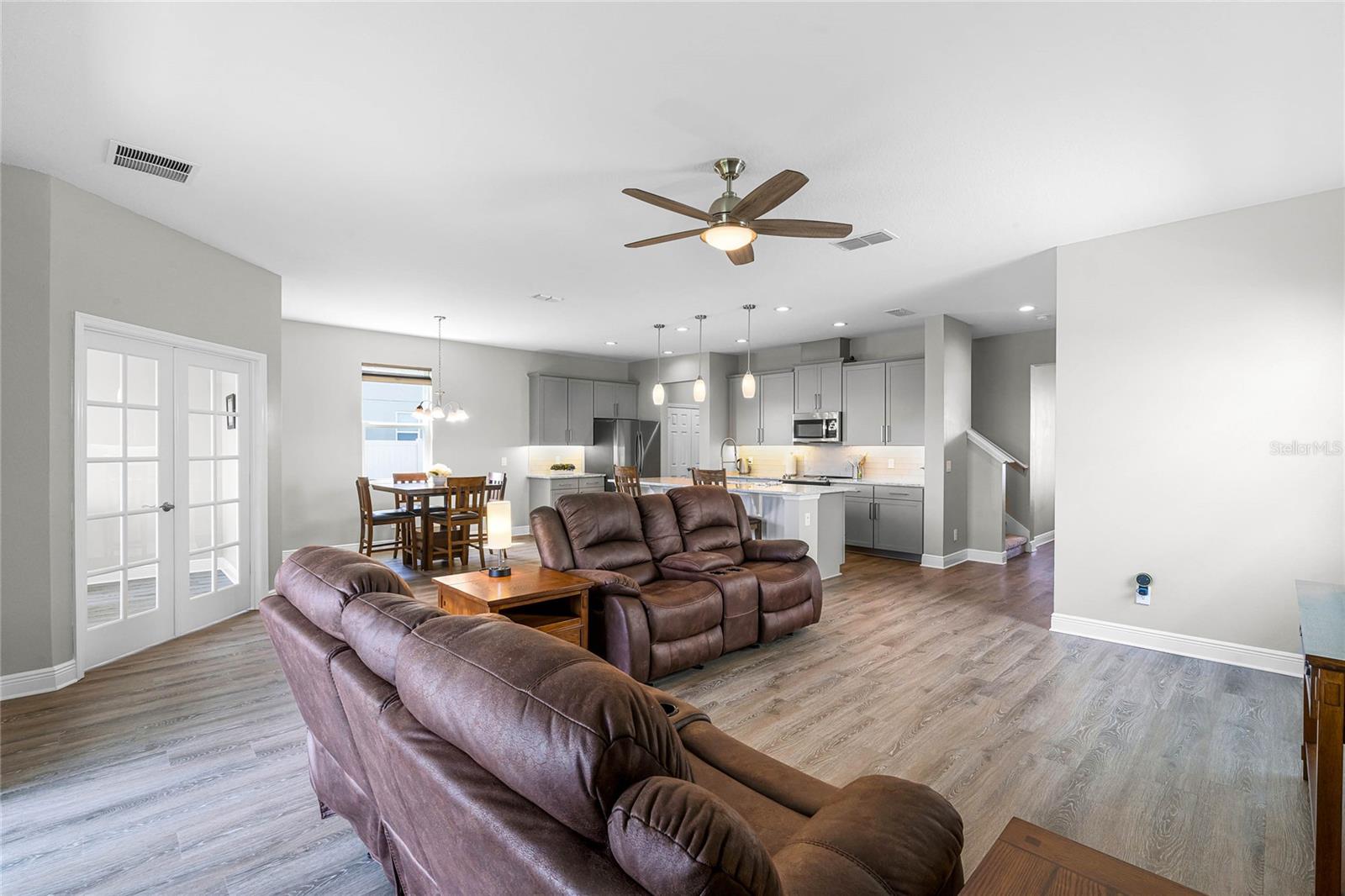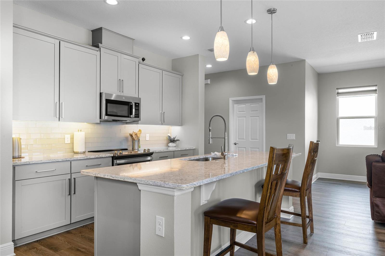 Why wait to build when you can own this stunning, better than new 4-bedroom, 2.5-bath home with an office and loft, perfectly situated on a private lot with no rear neighbors, backing up to a serene retention area. Lived in for less than a year, this home is in pristine condition and boasts over $100,000 in luxurious upgrades. From the moment you arrive, the beautiful stone front façade and paver driveway and walkway create an inviting first impression. The large, fenced backyard offers ample room to design your dream pool, with a paver walkway extending from the front yard to the gate. Step inside through the charming covered front porch, where luxury vinyl plank floors flow seamlessly throughout the main level. The spacious foyer features a drop zone/mudroom for convenient storage. The open-concept living space includes a bright and airy dining area, living room, and a chef’s dream kitchen. The kitchen is a true showpiece, with under-cabinet lighting, quartz countertops, stainless steel appliances, a subway-tile backsplash, and a large counter-height island with pendant lighting perfect for casual dining. The kitchen also offers a pantry with custom shelving and an additional storage closet, ideal for a second pantry. Adjacent to the living area, a dedicated office space provides a quiet retreat with views of the backyard. The first floor also includes a half bath and a functional laundry room equipped with built-in cabinetry and a quartz-topped folding station for added convenience. Upstairs, plush upgraded carpeting guides you to a spacious loft, perfect for additional living space. The primary suite is an impressive retreat, featuring a separate sitting area ideal for a home gym, nursery, or private relaxation space. The en-suite bath is beautifully appointed with a double-sink quartz vanity, a glass enclosed shower, and a large walk-in closet with a custom closet system. Additional upgrades in the primary suite include a Brondell Swash toilet seat for a spa-like experience. The remaining bedrooms are generously sized and share a well-appointed second full bath with a double quartz vanity and another upgraded toilet seat. Outside, enjoy the peaceful view from the screened lanai, overlooking the expansive backyard, which extends along the side of the house. The home is packed with modern conveniences, including smart features such as WiFi-enabled lighting, a doorbell camera, a smart thermostat, a WiFi garage door opener, and a front door keypad. Ceiling fans with remote controls are installed in every room, and thoughtful touches like nightlight outlets throughout the hallways and bathrooms add to the home’s charm. The garage and lanai floors have been upgraded with durable Polyaspartic floor coating, and the exterior is equipped with gutters for added functionality. Located just across from Lake Louisa State Park, this home is surrounded by natural beauty and offers easy access to outdoor adventures such as swimming, boating, hiking, and biking. The Ridgeview community, conveniently located on US 27 with nearby SR 429 access, is next to the upcoming Olympus Sports Project, promising future recreational opportunities.