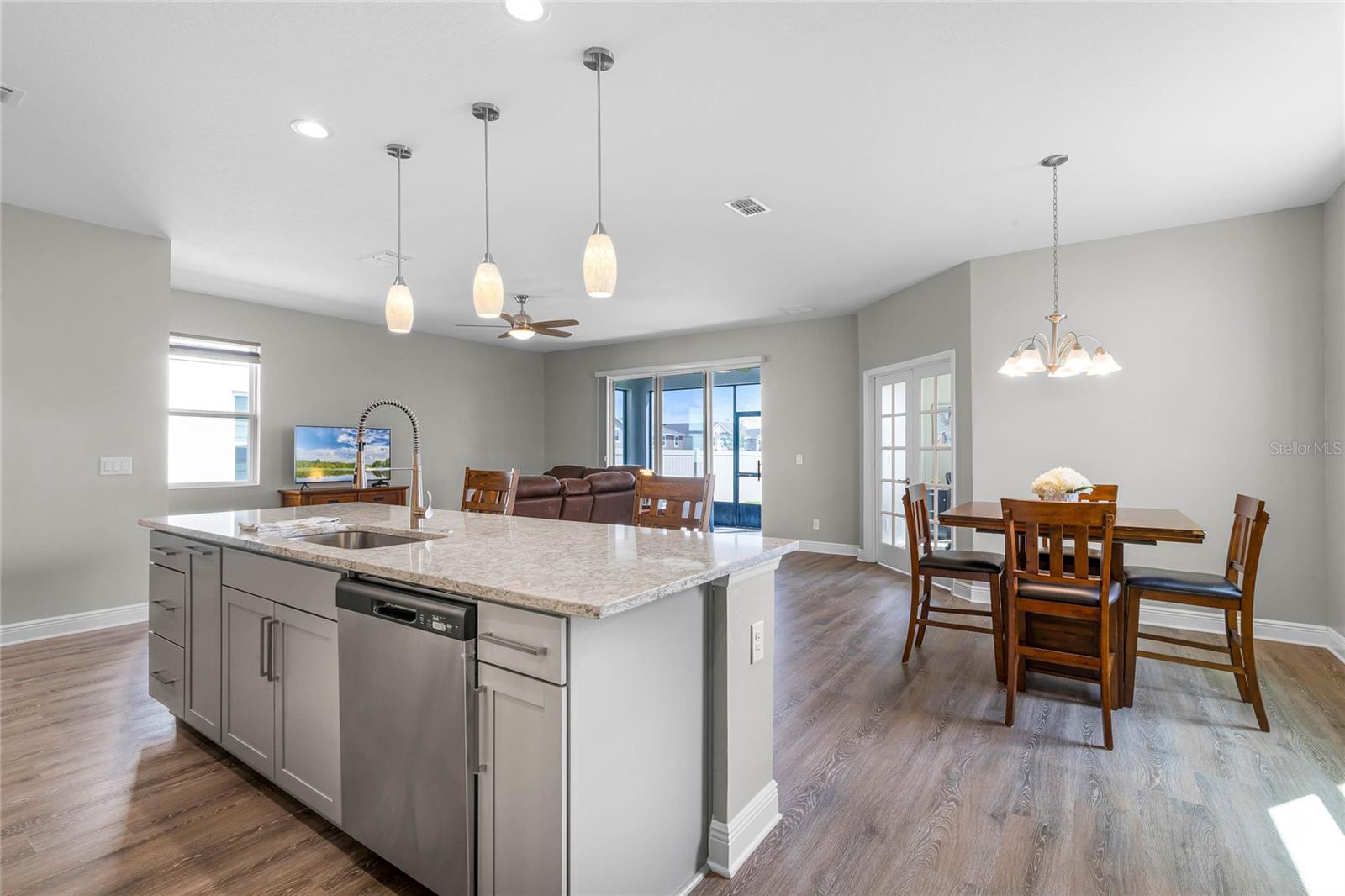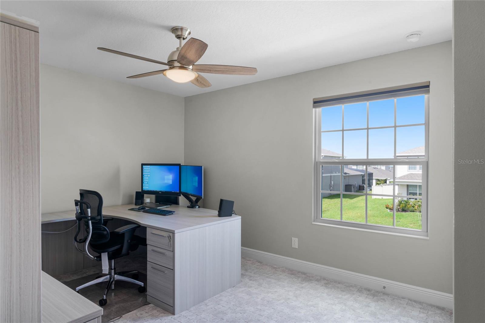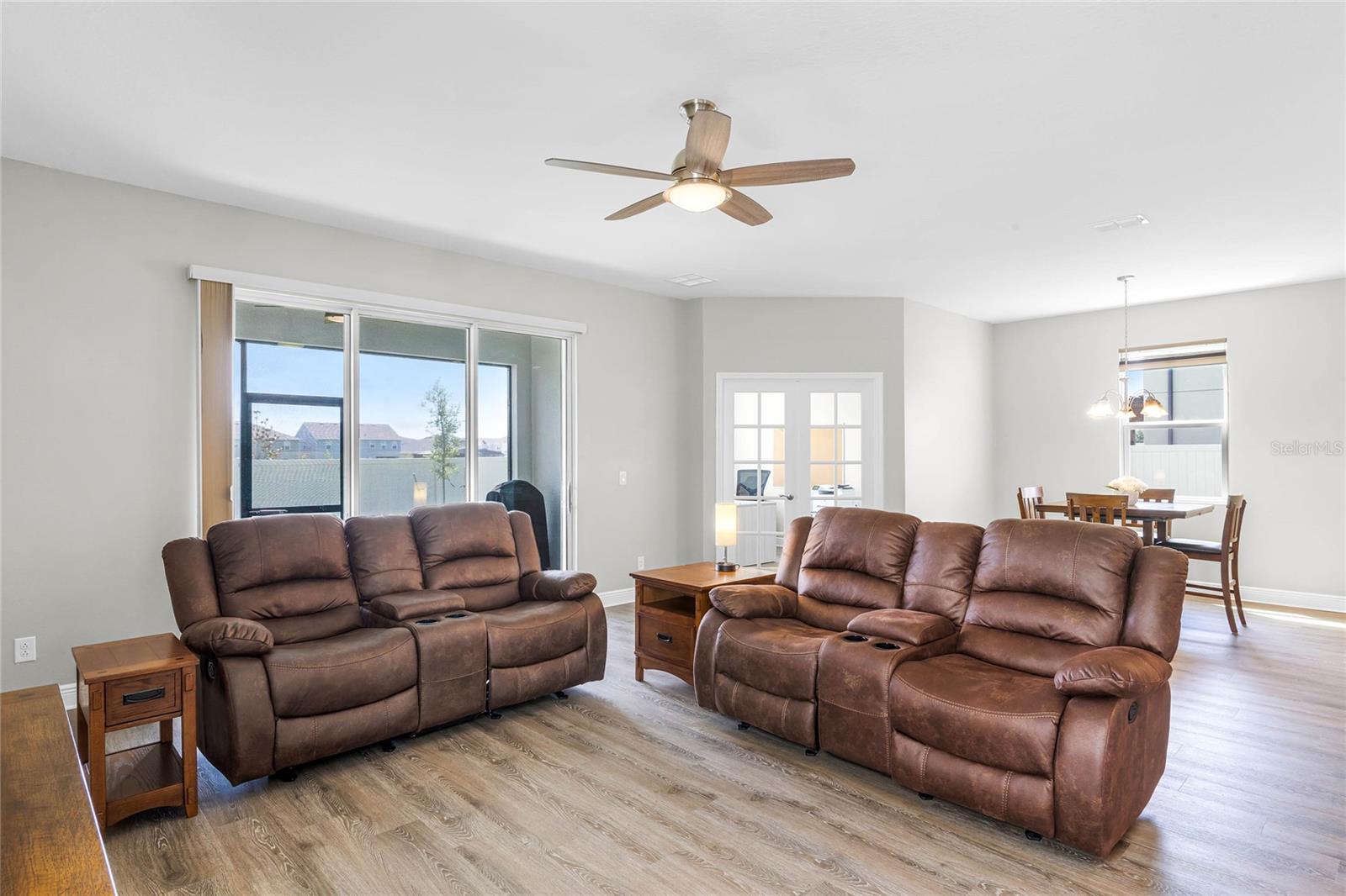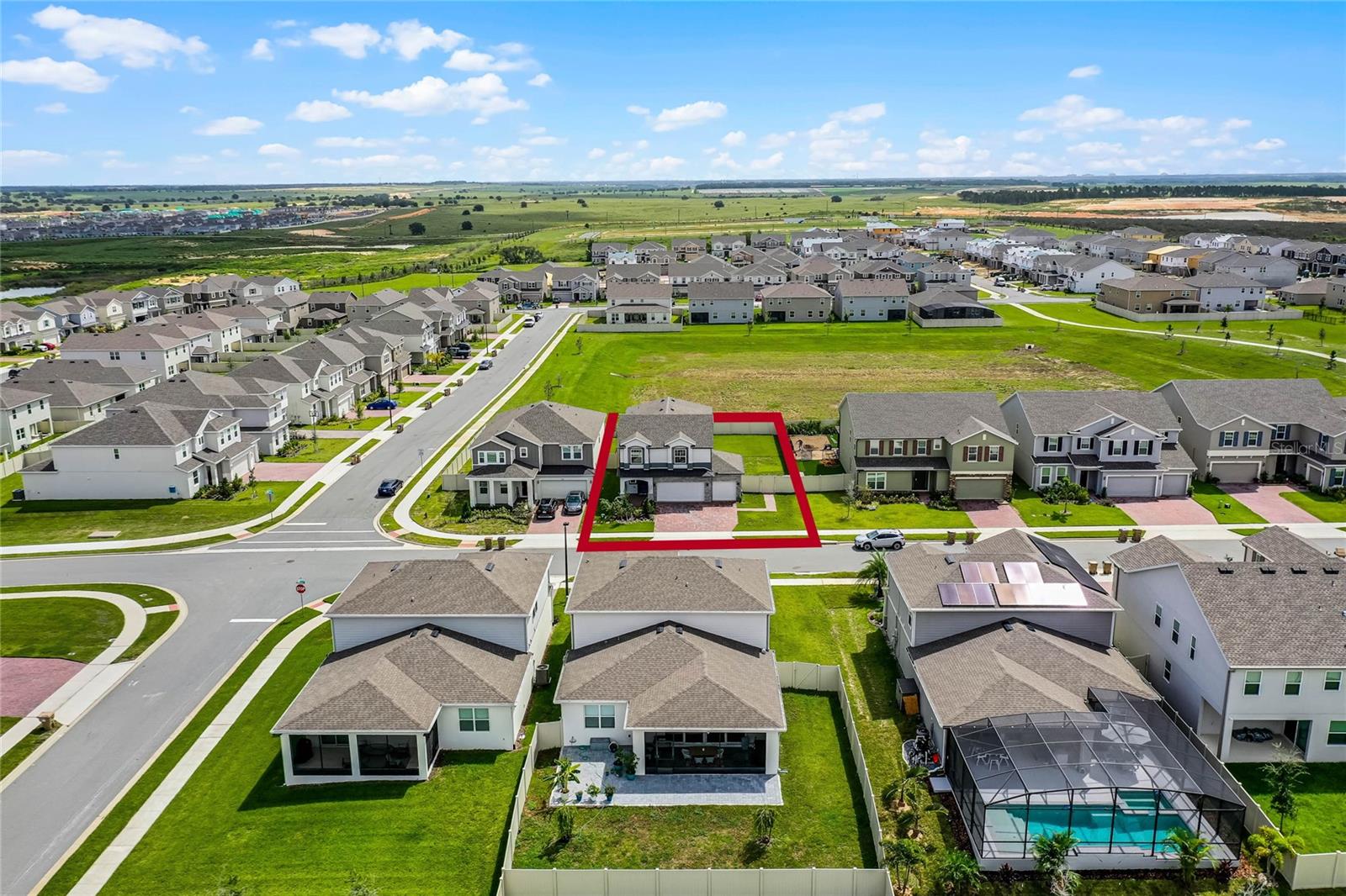 Why wait to build when you can own this stunning, better than new 4-bedroom, 2.5-bath home with an office and loft, perfectly situated on a private lot with no rear neighbors, backing up to a serene retention area. Lived in for less than a year, this home is in pristine condition and boasts over $100,000 in luxurious upgrades. From the moment you arrive, the beautiful stone front façade and paver driveway and walkway create an inviting first impression. The large, fenced backyard offers ample room to design your dream pool, with a paver walkway extending from the front yard to the gate. Step inside through the charming covered front porch, where luxury vinyl plank floors flow seamlessly throughout the main level. The spacious foyer features a drop zone/mudroom for convenient storage. The open-concept living space includes a bright and airy dining area, living room, and a chef’s dream kitchen. The kitchen is a true showpiece, with under-cabinet lighting, quartz countertops, stainless steel appliances, a subway-tile backsplash, and a large counter-height island with pendant lighting perfect for casual dining. The kitchen also offers a pantry with custom shelving and an additional storage closet, ideal for a second pantry. Adjacent to the living area, a dedicated office space provides a quiet retreat with views of the backyard. The first floor also includes a half bath and a functional laundry room equipped with built-in cabinetry and a quartz-topped folding station for added convenience. Upstairs, plush upgraded carpeting guides you to a spacious loft, perfect for additional living space. The primary suite is an impressive retreat, featuring a separate sitting area ideal for a home gym, nursery, or private relaxation space. The en-suite bath is beautifully appointed with a double-sink quartz vanity, a glass enclosed shower, and a large walk-in closet with a custom closet system. Additional upgrades in the primary suite include a Brondell Swash toilet seat for a spa-like experience. The remaining bedrooms are generously sized and share a well-appointed second full bath with a double quartz vanity and another upgraded toilet seat. Outside, enjoy the peaceful view from the screened lanai, overlooking the expansive backyard, which extends along the side of the house. The home is packed with modern conveniences, including smart features such as WiFi-enabled lighting, a doorbell camera, a smart thermostat, a WiFi garage door opener, and a front door keypad. Ceiling fans with remote controls are installed in every room, and thoughtful touches like nightlight outlets throughout the hallways and bathrooms add to the home’s charm. The garage and lanai floors have been upgraded with durable Polyaspartic floor coating, and the exterior is equipped with gutters for added functionality. Located just across from Lake Louisa State Park, this home is surrounded by natural beauty and offers easy access to outdoor adventures such as swimming, boating, hiking, and biking. The Ridgeview community, conveniently located on US 27 with nearby SR 429 access, is next to the upcoming Olympus Sports Project, promising future recreational opportunities.