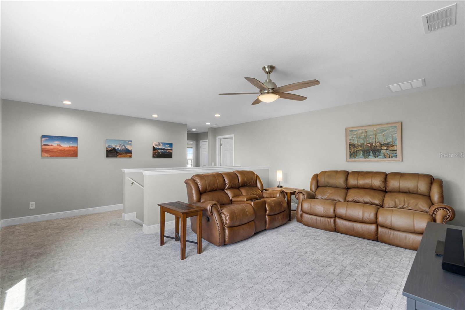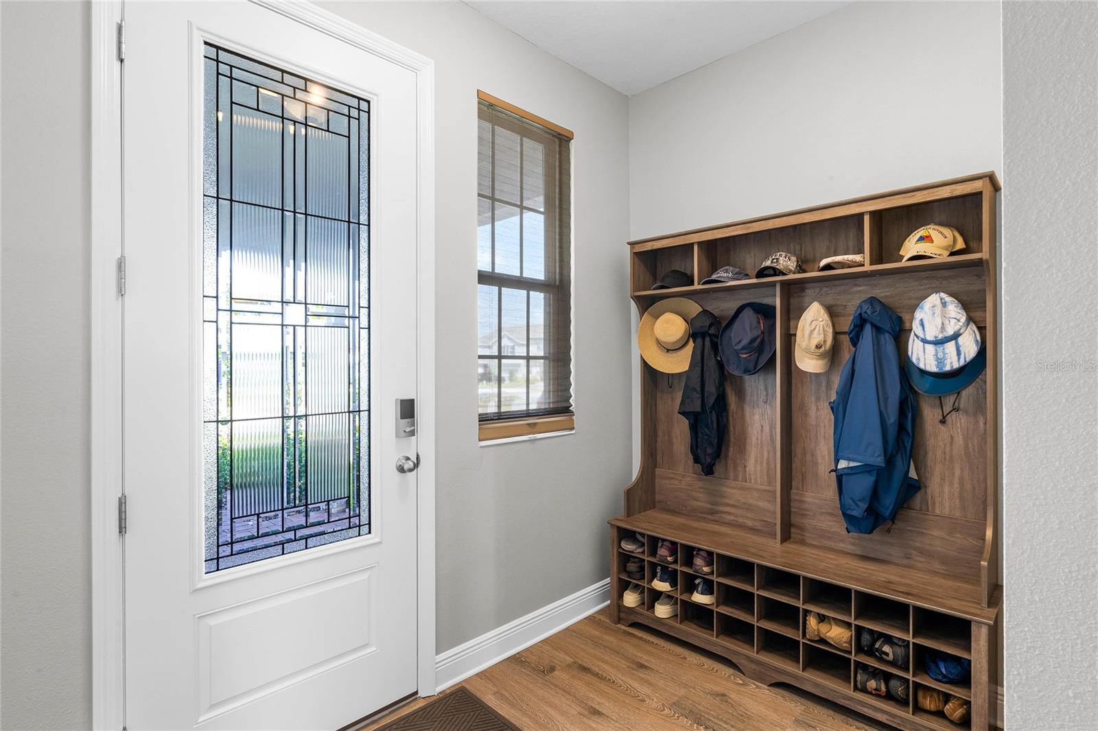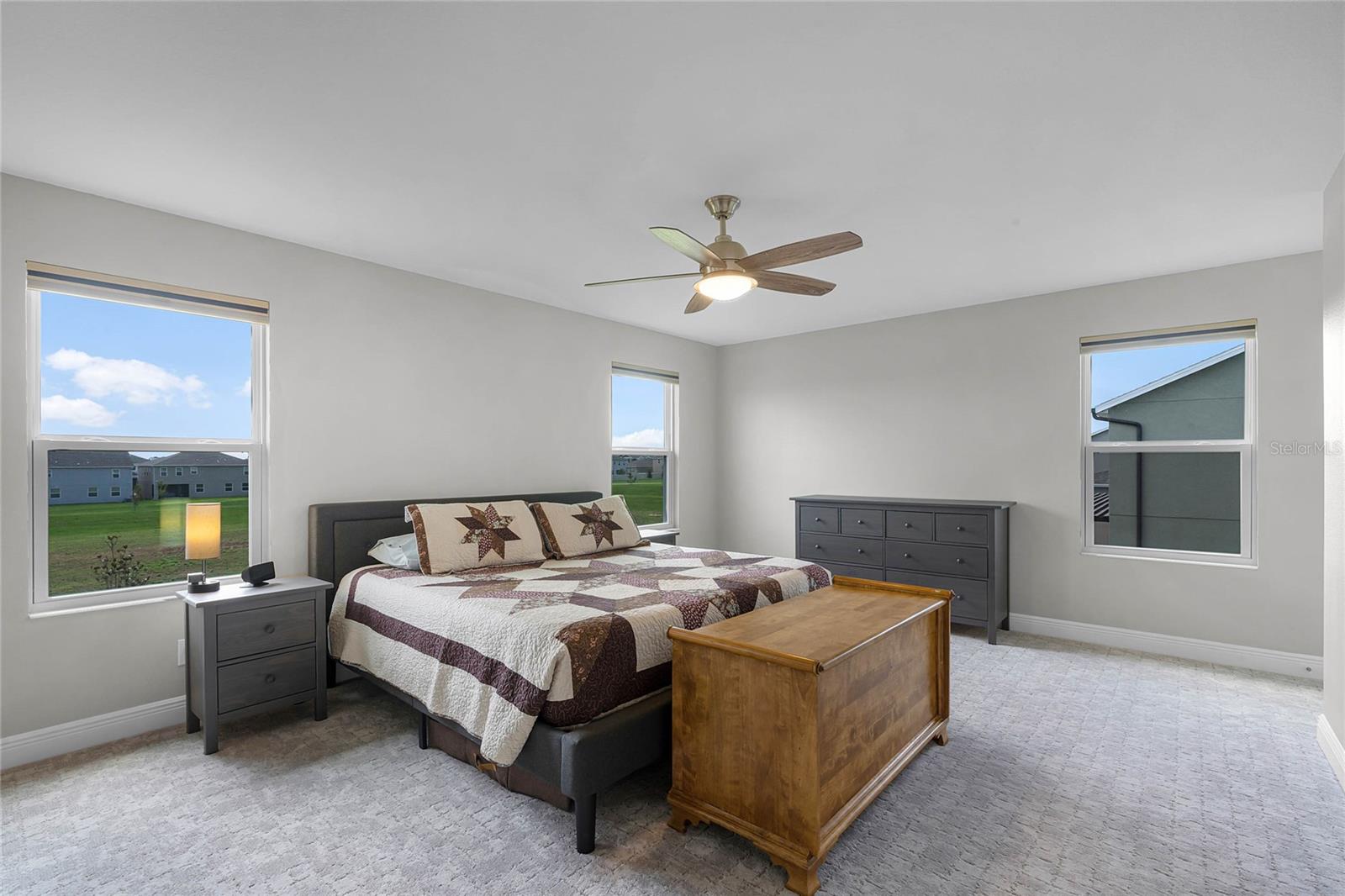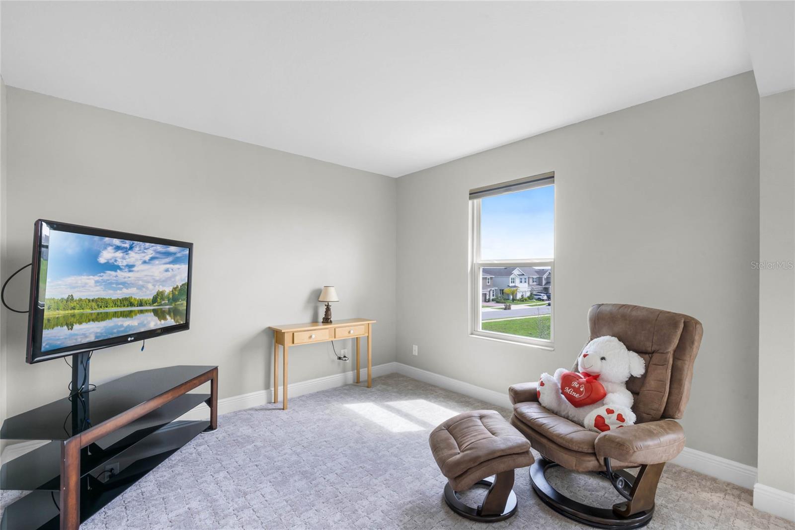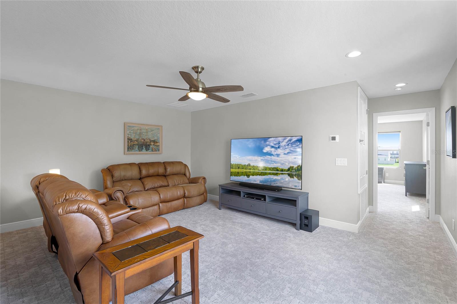 Why wait to build when you can own this stunning, better than new 4-bedroom, 2.5-bath home with an office and loft, perfectly situated on a private lot with no rear neighbors, backing up to a serene retention area. Lived in for less than a year, this home is in pristine condition and boasts over $100,000 in luxurious upgrades. From the moment you arrive, the beautiful stone front façade and paver driveway and walkway create an inviting first impression. The large, fenced backyard offers ample room to design your dream pool, with a paver walkway extending from the front yard to the gate. Step inside through the charming covered front porch, where luxury vinyl plank floors flow seamlessly throughout the main level. The spacious foyer features a drop zone/mudroom for convenient storage. The open-concept living space includes a bright and airy dining area, living room, and a chef’s dream kitchen. The kitchen is a true showpiece, with under-cabinet lighting, quartz countertops, stainless steel appliances, a subway-tile backsplash, and a large counter-height island with pendant lighting perfect for casual dining. The kitchen also offers a pantry with custom shelving and an additional storage closet, ideal for a second pantry. Adjacent to the living area, a dedicated office space provides a quiet retreat with views of the backyard. The first floor also includes a half bath and a functional laundry room equipped with built-in cabinetry and a quartz-topped folding station for added convenience. Upstairs, plush upgraded carpeting guides you to a spacious loft, perfect for additional living space. The primary suite is an impressive retreat, featuring a separate sitting area ideal for a home gym, nursery, or private relaxation space. The en-suite bath is beautifully appointed with a double-sink quartz vanity, a glass enclosed shower, and a large walk-in closet with a custom closet system. Additional upgrades in the primary suite include a Brondell Swash toilet seat for a spa-like experience. The remaining bedrooms are generously sized and share a well-appointed second full bath with a double quartz vanity and another upgraded toilet seat. Outside, enjoy the peaceful view from the screened lanai, overlooking the expansive backyard, which extends along the side of the house. The home is packed with modern conveniences, including smart features such as WiFi-enabled lighting, a doorbell camera, a smart thermostat, a WiFi garage door opener, and a front door keypad. Ceiling fans with remote controls are installed in every room, and thoughtful touches like nightlight outlets throughout the hallways and bathrooms add to the home’s charm. The garage and lanai floors have been upgraded with durable Polyaspartic floor coating, and the exterior is equipped with gutters for added functionality. Located just across from Lake Louisa State Park, this home is surrounded by natural beauty and offers easy access to outdoor adventures such as swimming, boating, hiking, and biking. The Ridgeview community, conveniently located on US 27 with nearby SR 429 access, is next to the upcoming Olympus Sports Project, promising future recreational opportunities.