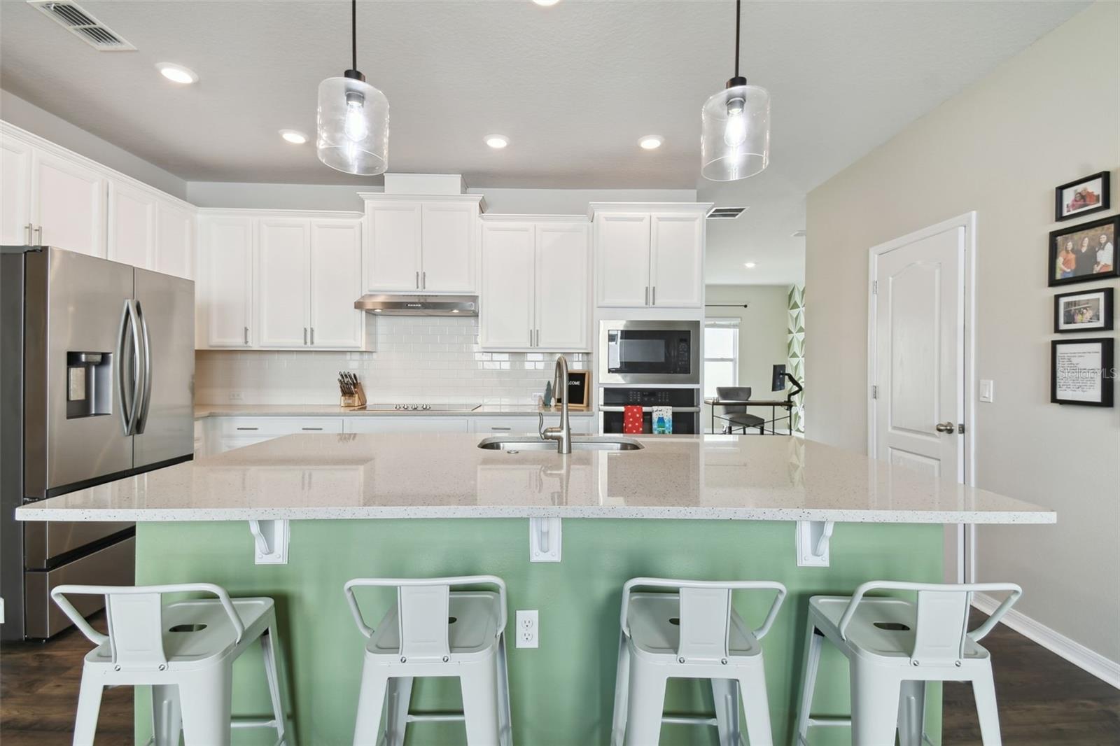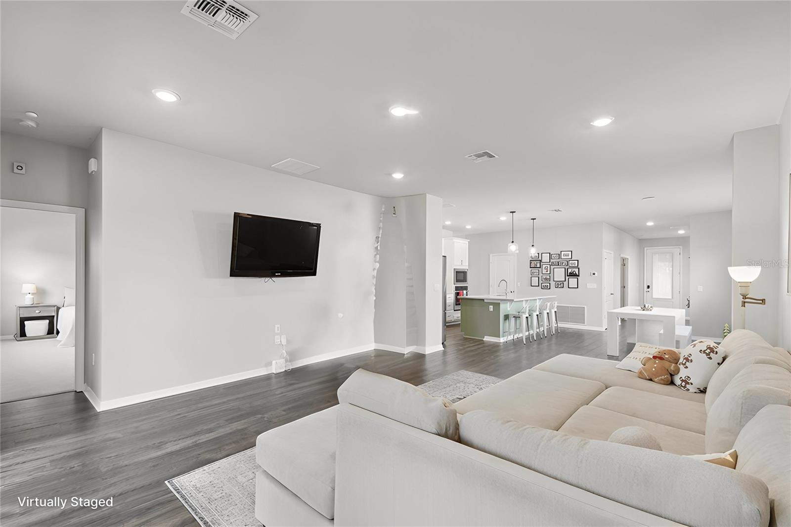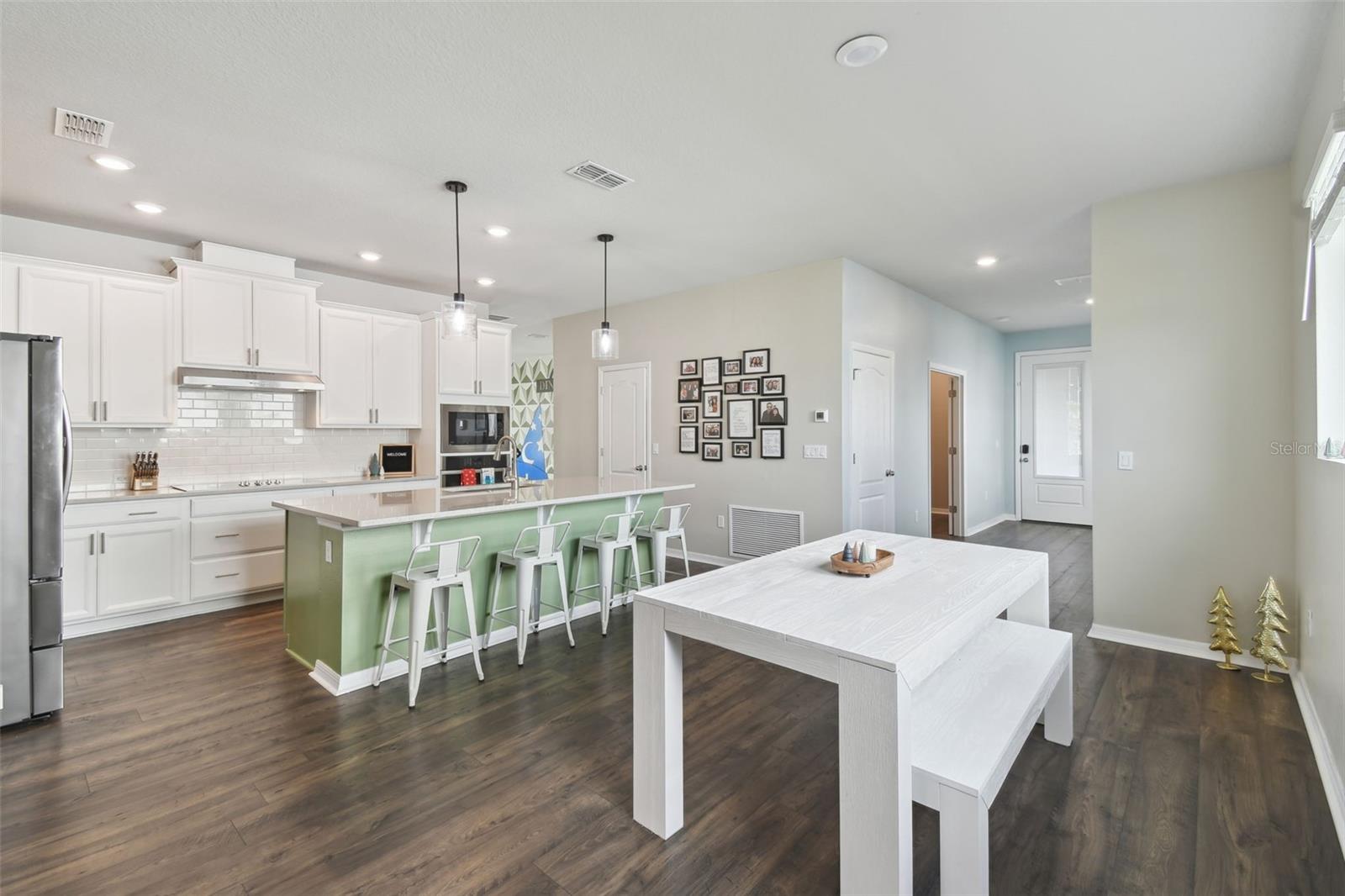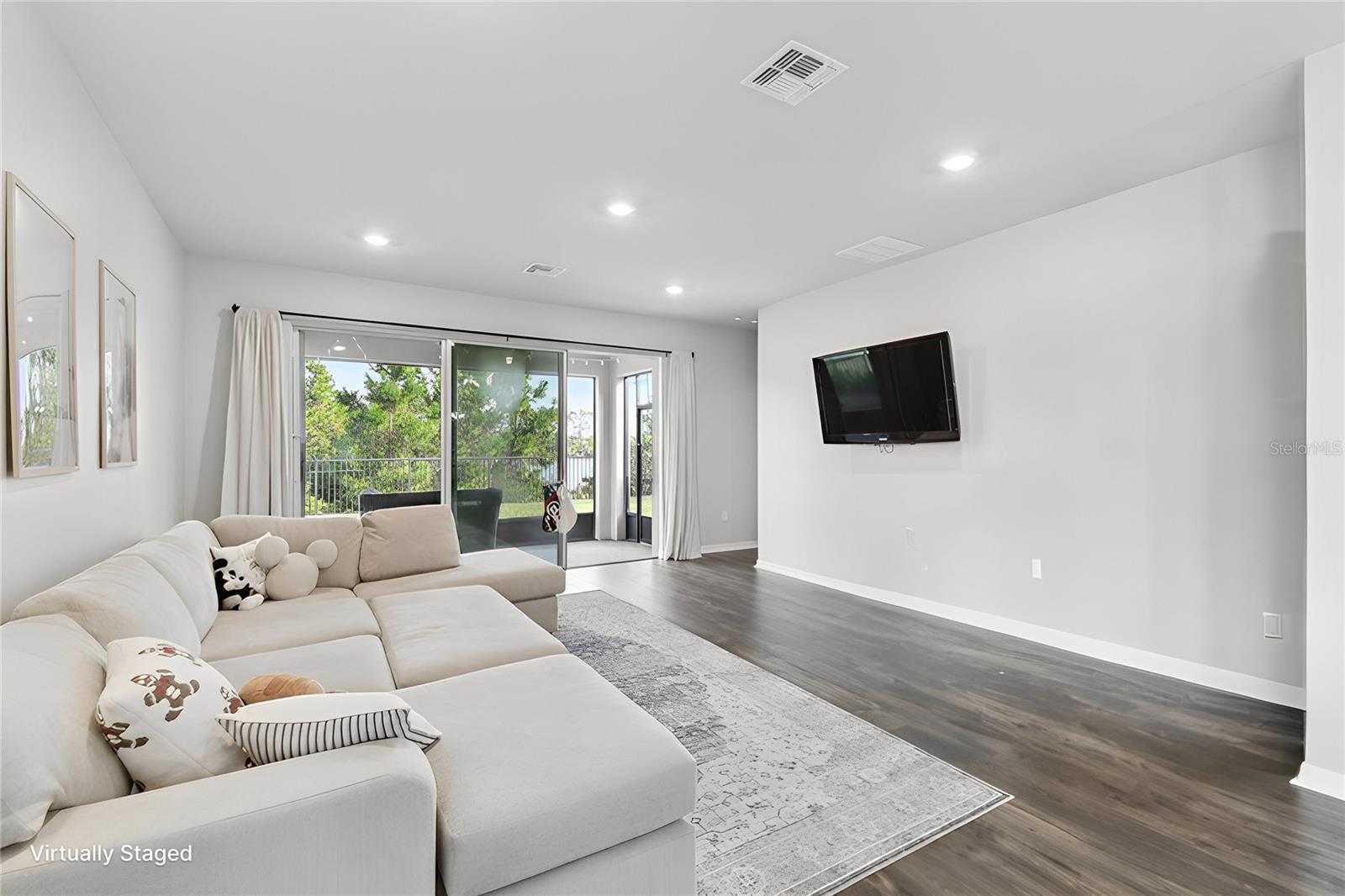 This stunning 4-year-old home is nestled in the gated community of Serenoa Village, featuring a beautiful conservation lot with serene lake views. The property boasts large square footage, 4 bedrooms and 2 bathrooms, plus a bonus room perfect for use as a media room or office. The flexible second bonus room can serve as an office but is currently being used as a 4th bedroom. Inside, you'll enjoy an open floor plan with a modern kitchen, complete with stainless steel appliances, including a wall oven and microwave, and a large island with eat-in space—ideal for entertaining and family gatherings. The dining area flows seamlessly into the spacious living room, which opens onto a screened-in patio through sliding doors. The master bedroom features an en-suite bathroom and a generous walk-in closet. Bedrooms two and three are located off the bonus area and share the second bathroom. The home also includes a large 3-car garage, providing ample storage space and additional parking for up to 3 cars on the driveway. Relish in the tranquil lake views and catch the Disney fireworks in the evenings. Residents of Serenoa Village enjoy access to the Community Center, which offers amenities such as a 24-hour gym, pool, splash pad, playgrounds, walking trails, and scenic ponds. The community hosts various activities for residents and has low HOA fees that cover access to these excellent facilities and amenities. Located just 25 minutes from Walt Disney World, Serenoa Village is planned for future direct access to Highway 429 and Disney's Western Way, ensuring convenient transportation. The area is well-served by major stores and restaurants and is centrally located to both the east and west coasts.