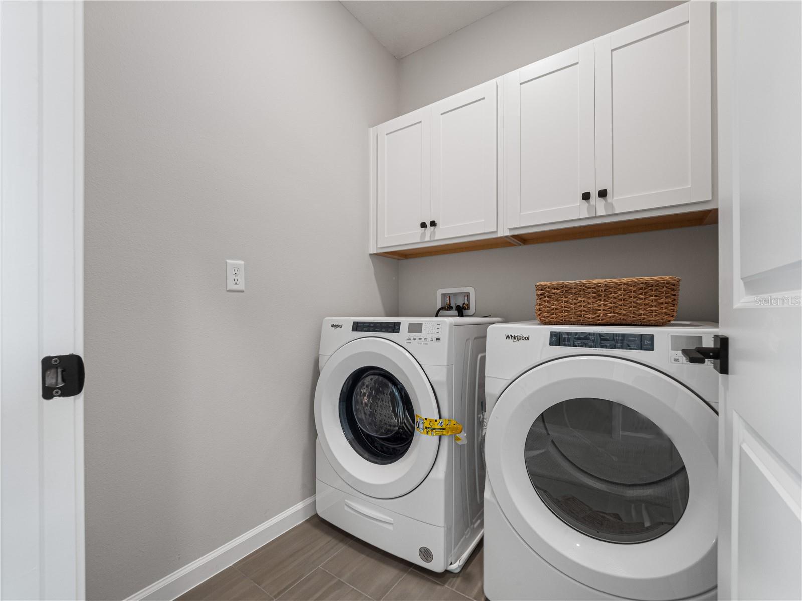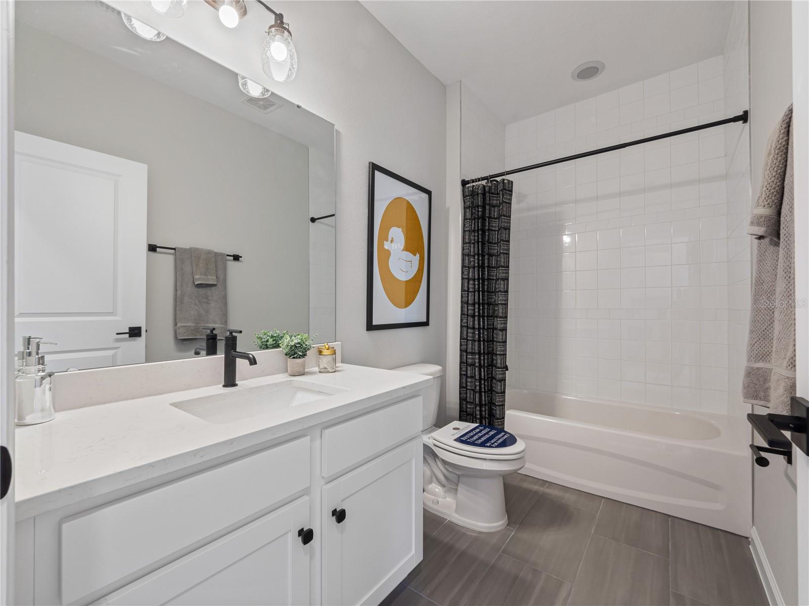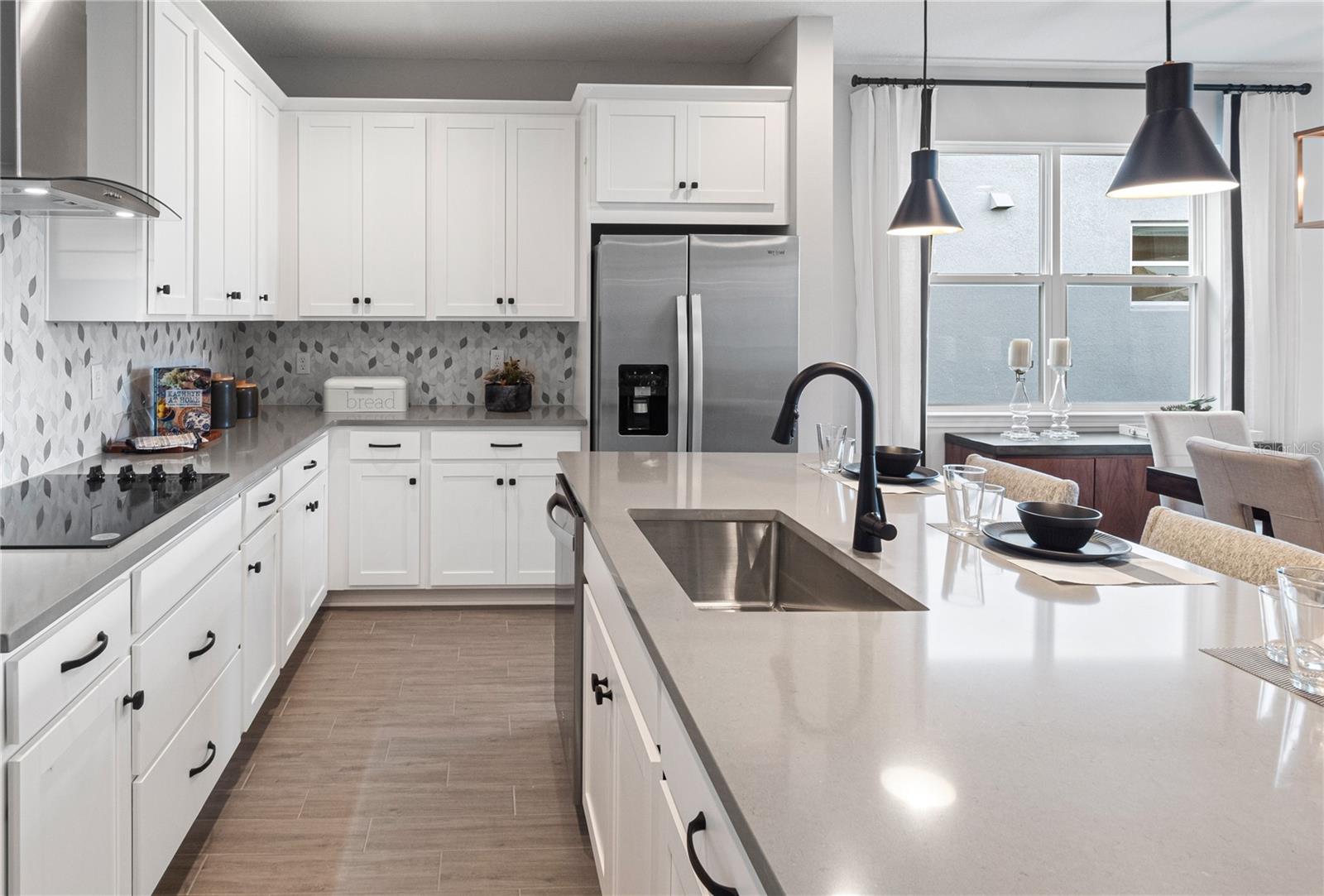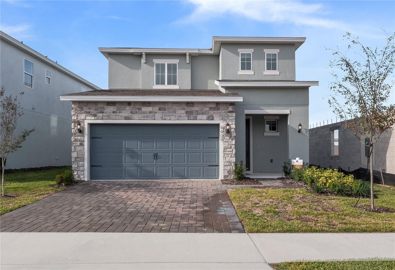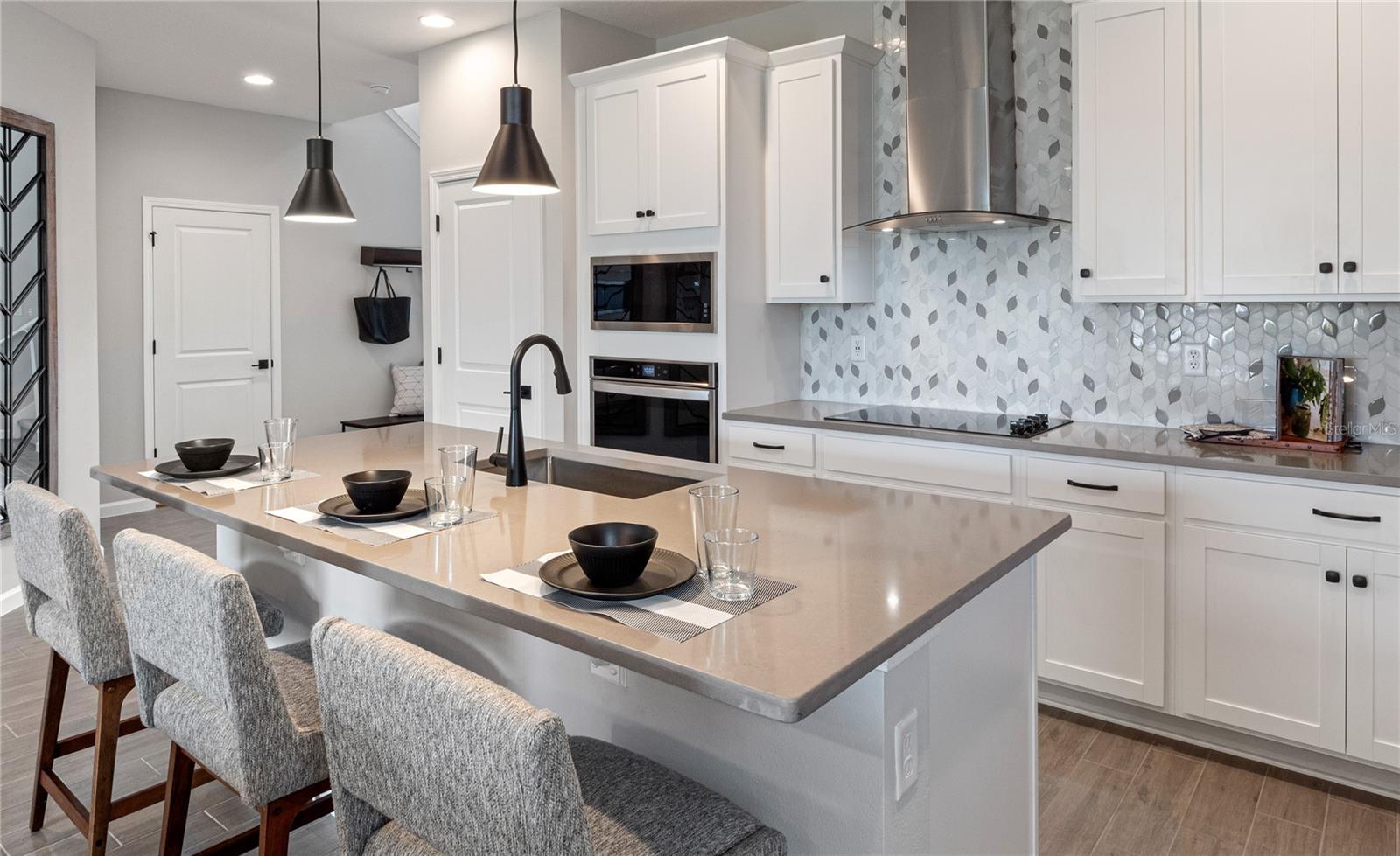Welcome to this exquisite two-story, 4-bedroom, 2.5-bath residence in the sought-after Hartwood Landing community! As a never-lived-in model home, it offers a fresh and contemporary living environment. The primary bedroom, conveniently located on the first floor, includes an ensuite bathroom with a luxurious walk-in shower. Upstairs, three additional bedrooms and a laundry room provide convenience and privacy. The open-concept layout seamlessly connects the spacious kitchen, dining, and living areas, creating a perfect space for gatherings. The kitchen is a chef's delight, featuring quartz countertops, a cooktop, a built-in oven, a tiled backsplash, a pantry, and a breakfast bar. Sunlight floods the main living spaces, highlighting the elegant tile flooring, while plush carpeting adds comfort to the bedrooms. Step outside to the covered lanai, an ideal spot for relaxation or entertaining. This home beautifully combines style, comfort, and practicality, awaiting its first residents. Don’t miss your chance to call this stunning house your home!