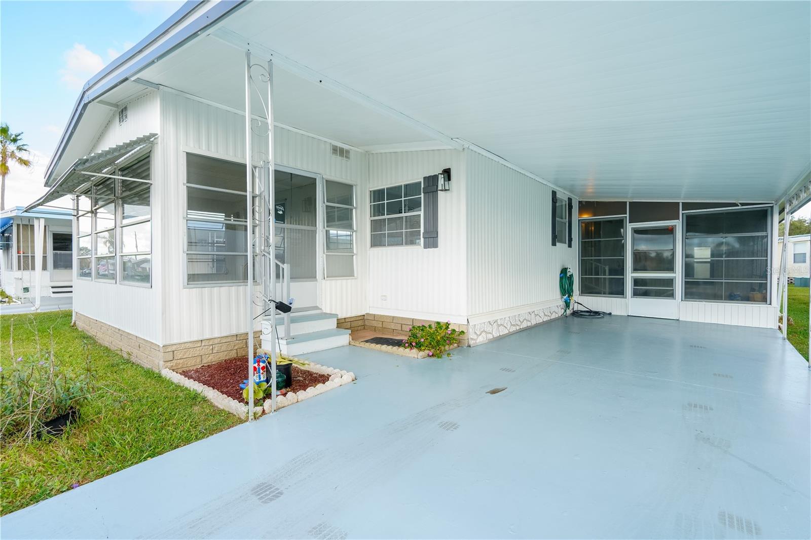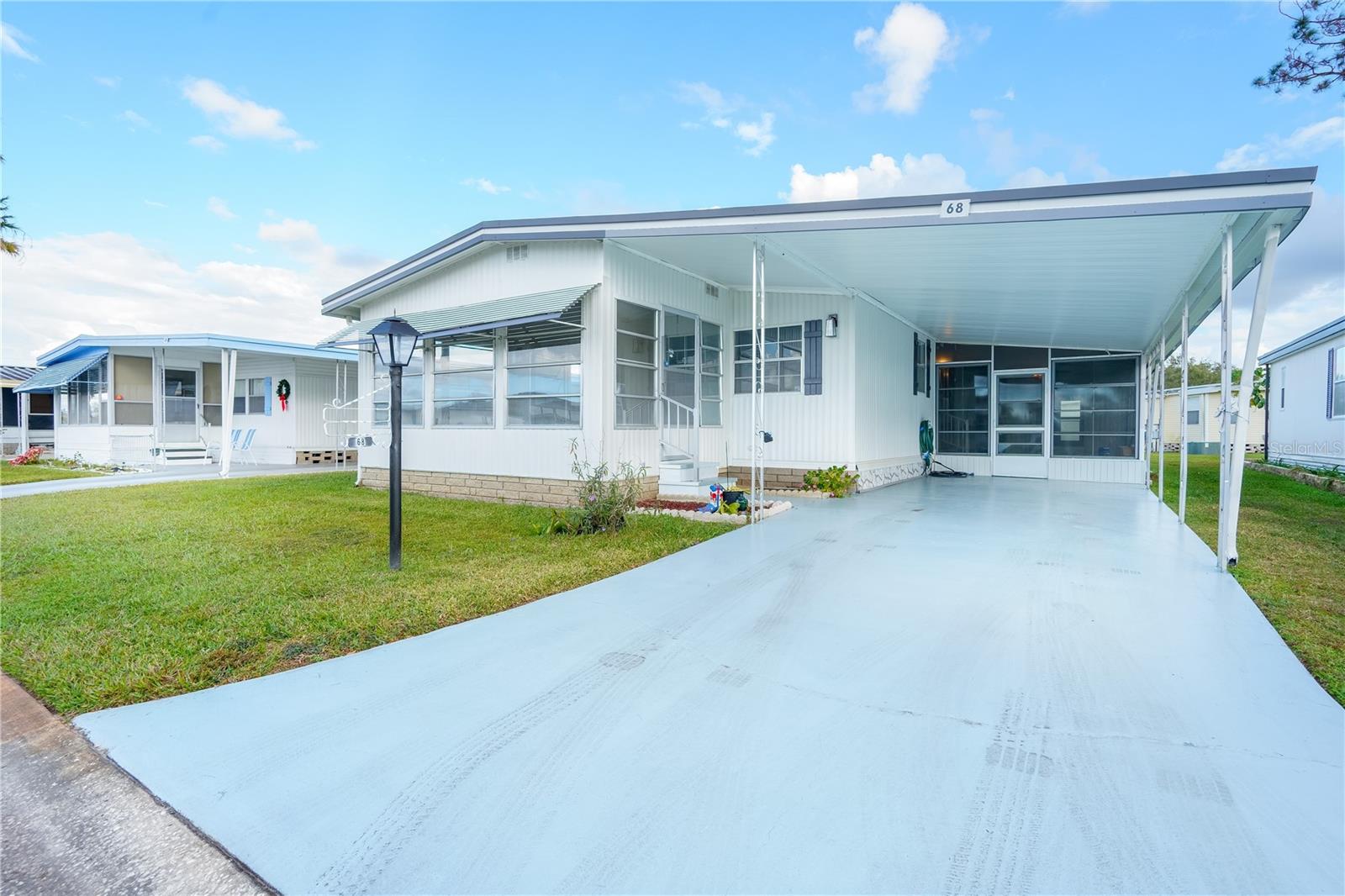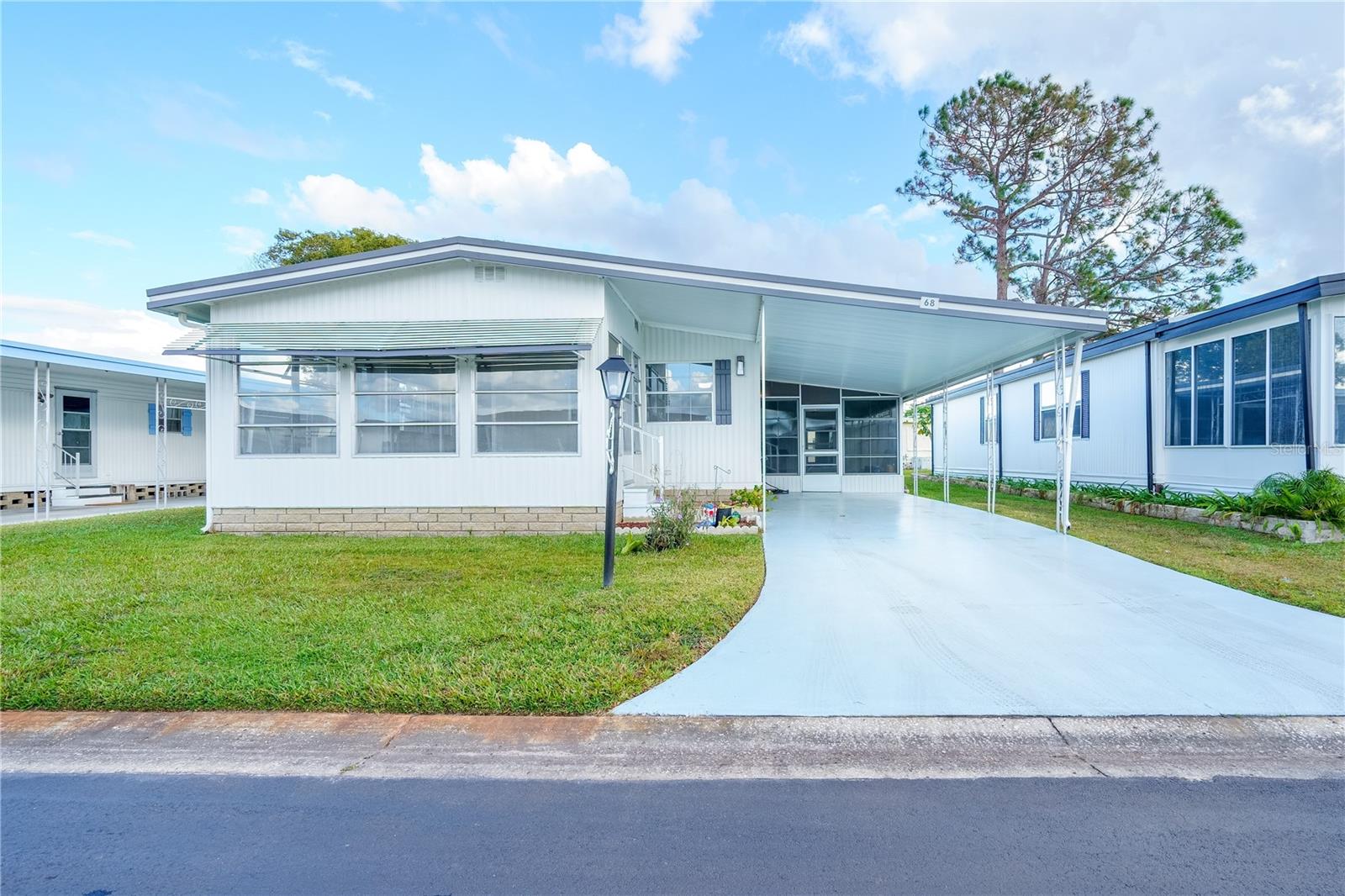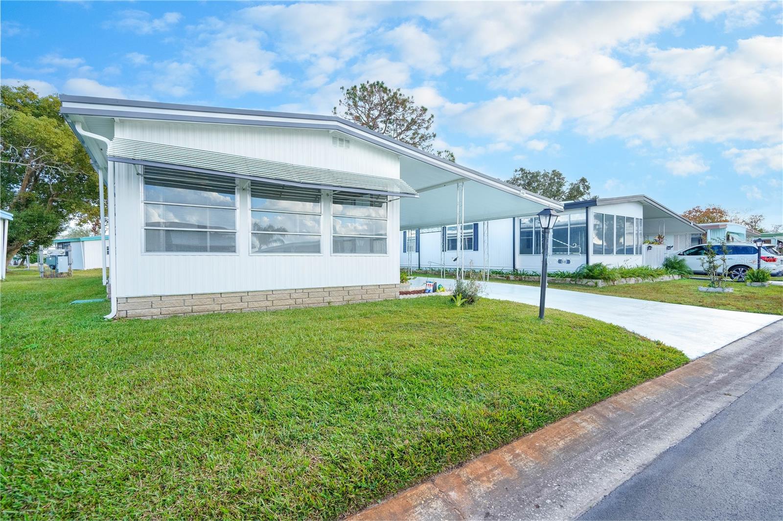 Charming renovated mobile home in lakefront Emerald Lakes Co-op 55-plus community. This home is a beautiful and affordable way to enjoy the Florida lake lifestyle. It has a new sub floor and gorgeous luxury vinyl plank flooring throughout. Fresh, light contemporary paint throughout entire home makes it feel and smell open and airy. The open floor plan is fabulous for entertaining. Large living and dining areas with a built-in hutch/buffet add to the charm of the home. The kitchen features ample cabinetry, a double oven and sleek countertops, and also has room for a small breakfast table. The primary bedroom is a great size with a walk -in closet. Primary bath has updated fixtures and a walk-in shower. The guest bedroom is also ample, and the guest bath has gorgeous, modern fixtures and vanity. The Florida room is a fantastic place to sit, enjoy a cocktail and read a book. It is so bright with all the windows. There is a laundry and storage room with washer and dryer included. A large carport to shelter your vehicle from the Florida sun. Co-Op property share included with benefit from ownership that includes a share in the property, enhancing your investment in this desirable community. With the share comes a lower HOA fee which includes lawn care, cable, water, sewer and all amenities. Emerald Lakes is a serene retirement community comprising only 211 homes. Residents have access to a variety of amenities and activities, including community pool, clubhouse, library, pool table, dock, boat slips for rent, boat ramp to chain of lakes. The community is in the heart of Clermont. Just minutes from vibrant downtown Clermont area with lakefront restaurants, bike trail, pubs, quaint shops, waterfront park and more. See this beautiful move-in ready home and start enjoying life!