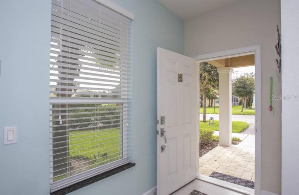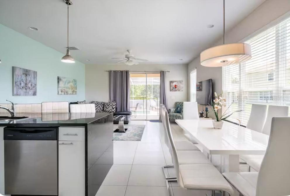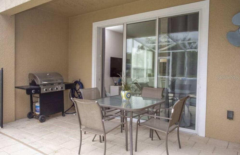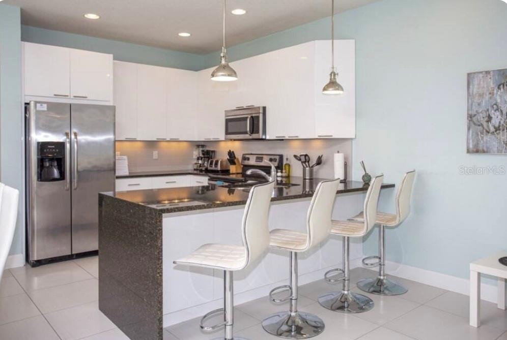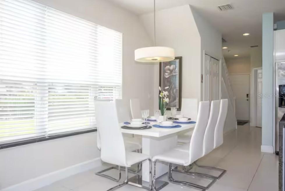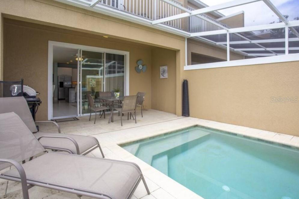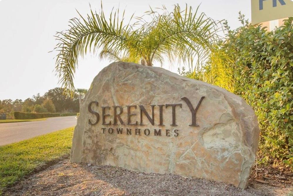 FULLY FURNISHED END UNIT 3 BED/3 FULL BATH Townhome in the Serenity community, located across the street from the clubhouse community. Great open floor, well-lit home with contemporary finishes. The living areas are adorned with tile flooring, and the kitchen with a granite island, a dual under-mount sink, and STAINLESS STEEL APPLIANCES. The ground floor offers a bedroom with easy access and a full bathroom that connects to both the bedroom and the foyer. The open-plan kitchen, dining, and family room extend to a SCREENED PRIVATE POOL via sliding glass doors. Upstairs, the master suite features a balcony with views of the natural surroundings and a bathroom with a granite double vanity. A very spacious third bedroom completes this amazing townhome. A conveniently placed laundry room is also located on the upper floor between bedrooms. This home is zoned for short-term or long-term rental. Clubhouse offers fitness center, game room, hot tub, and a resort style pool. Schedule a showing today!