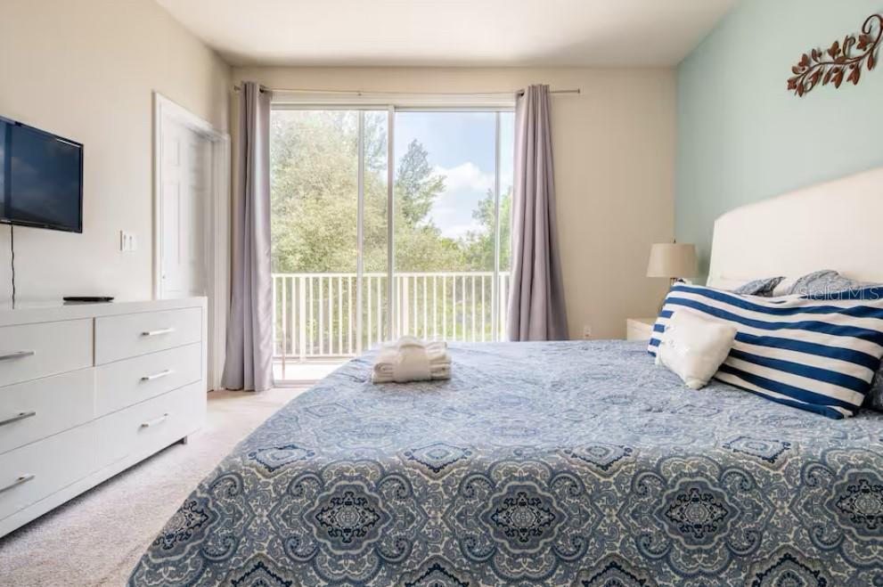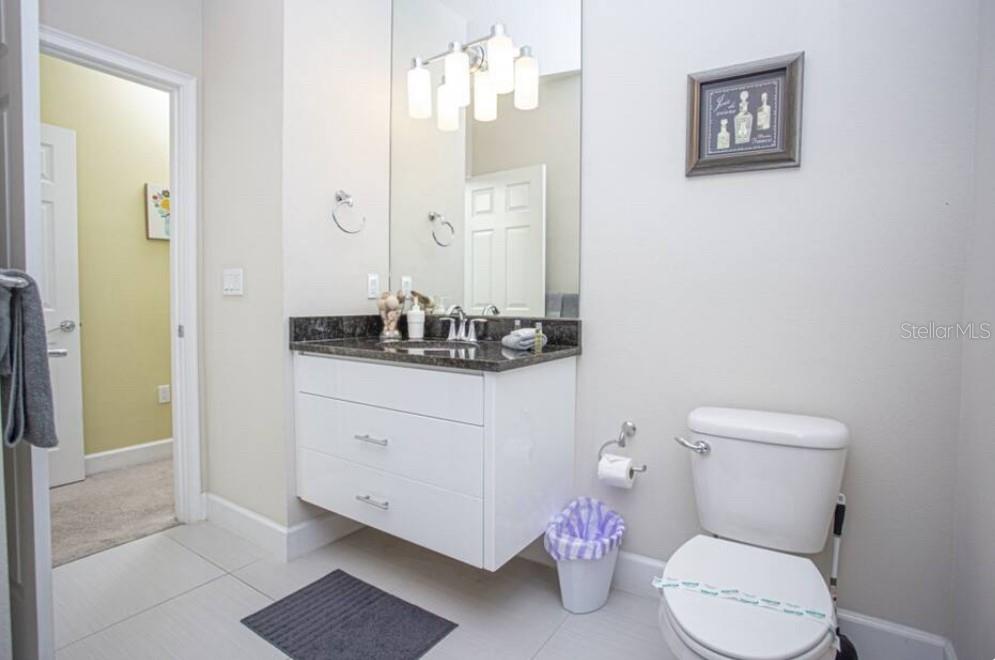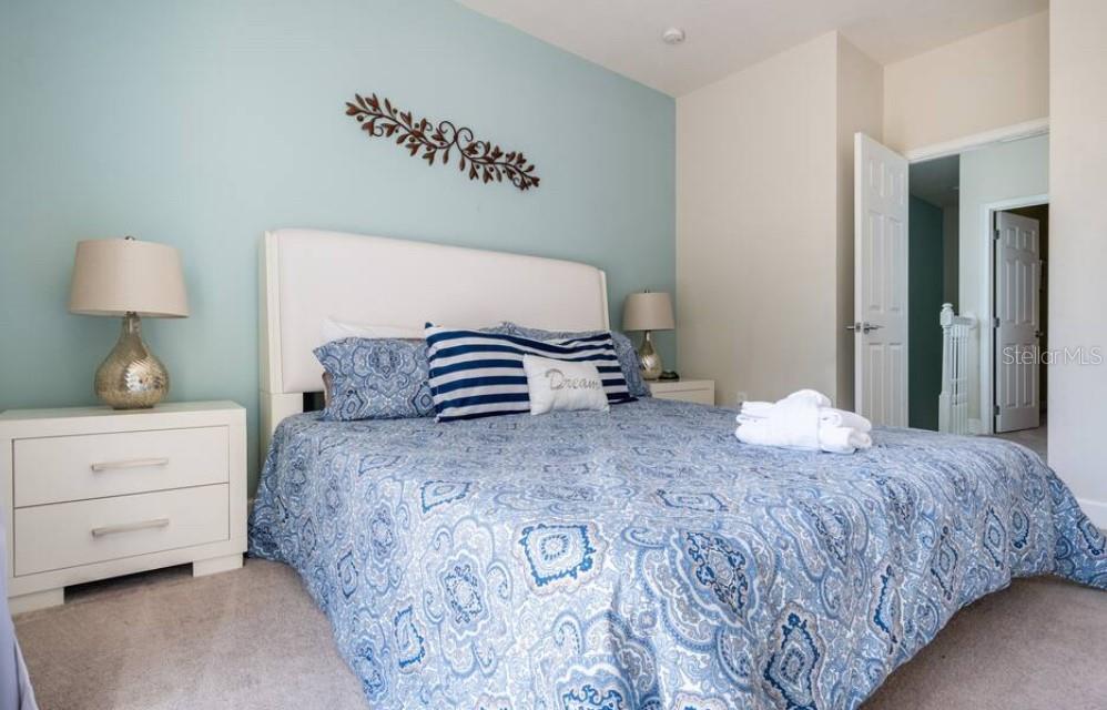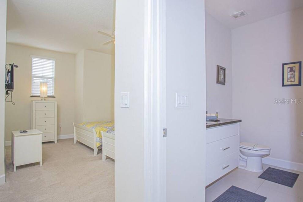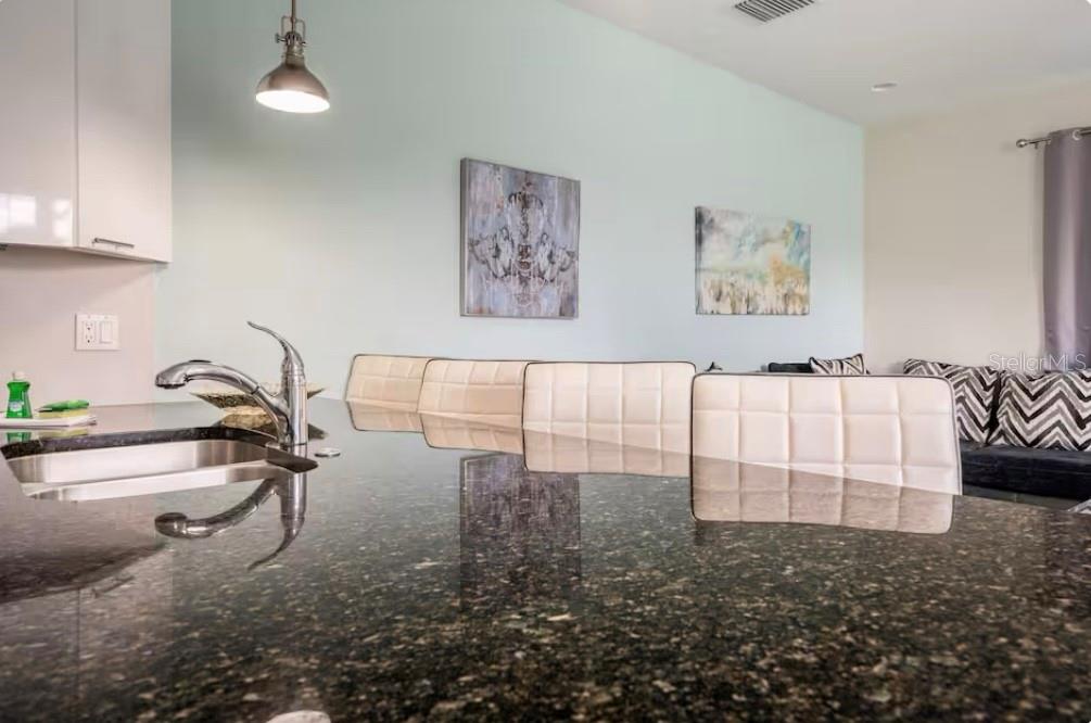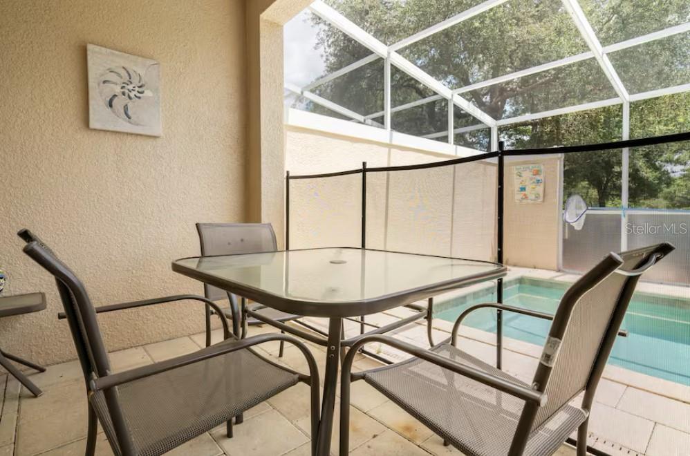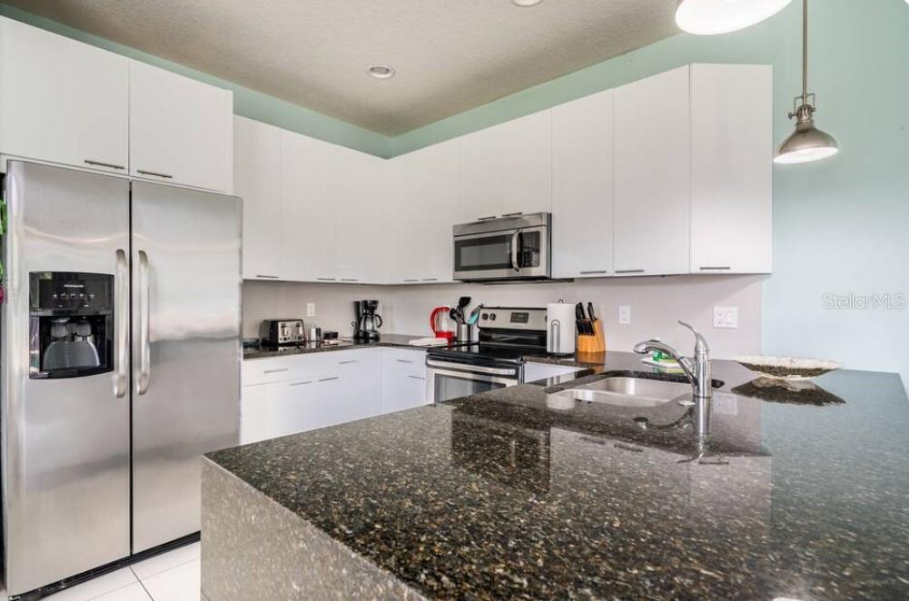 FULLY FURNISHED END UNIT 3 BED/3 FULL BATH Townhome in the Serenity community, located across the street from the clubhouse community. Great open floor, well-lit home with contemporary finishes. The living areas are adorned with tile flooring, and the kitchen with a granite island, a dual under-mount sink, and STAINLESS STEEL APPLIANCES. The ground floor offers a bedroom with easy access and a full bathroom that connects to both the bedroom and the foyer. The open-plan kitchen, dining, and family room extend to a SCREENED PRIVATE POOL via sliding glass doors. Upstairs, the master suite features a balcony with views of the natural surroundings and a bathroom with a granite double vanity. A very spacious third bedroom completes this amazing townhome. A conveniently placed laundry room is also located on the upper floor between bedrooms. This home is zoned for short-term or long-term rental. Clubhouse offers fitness center, game room, hot tub, and a resort style pool. Schedule a showing today!