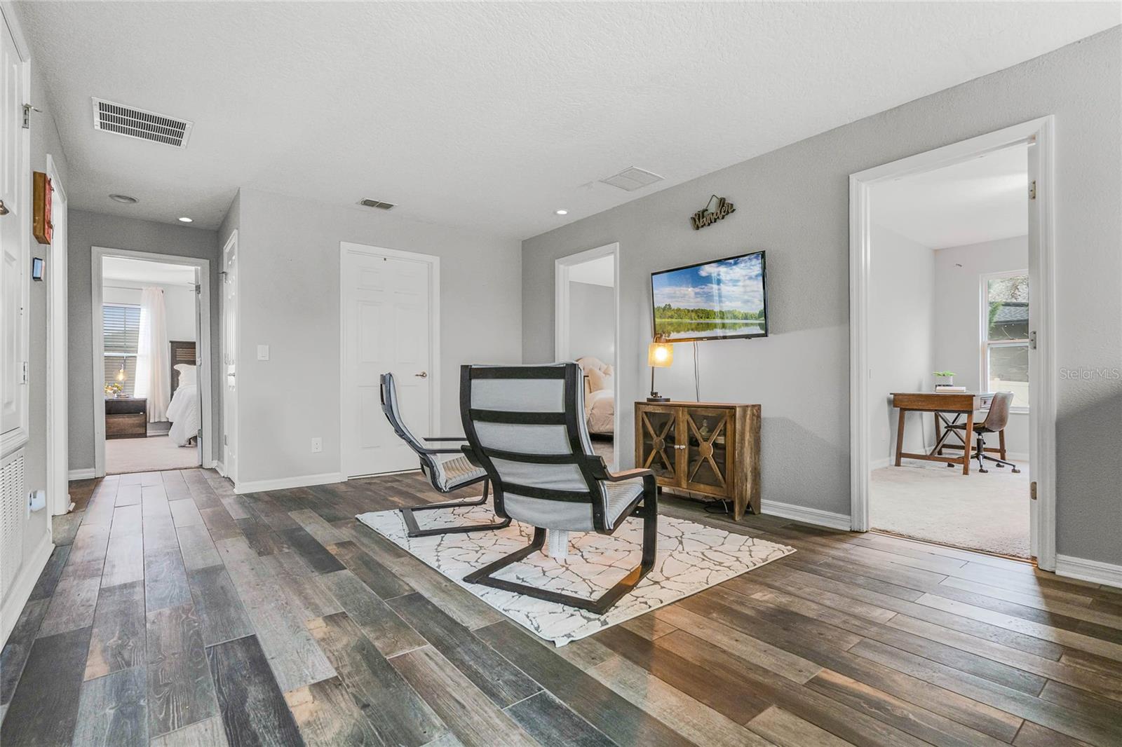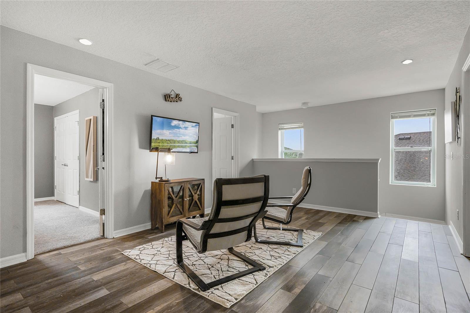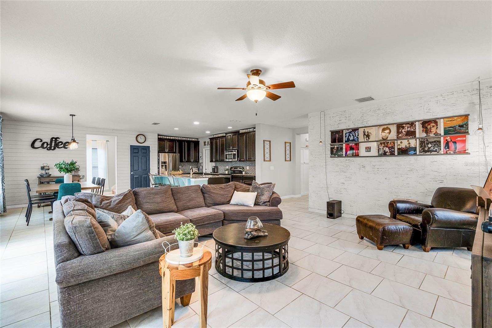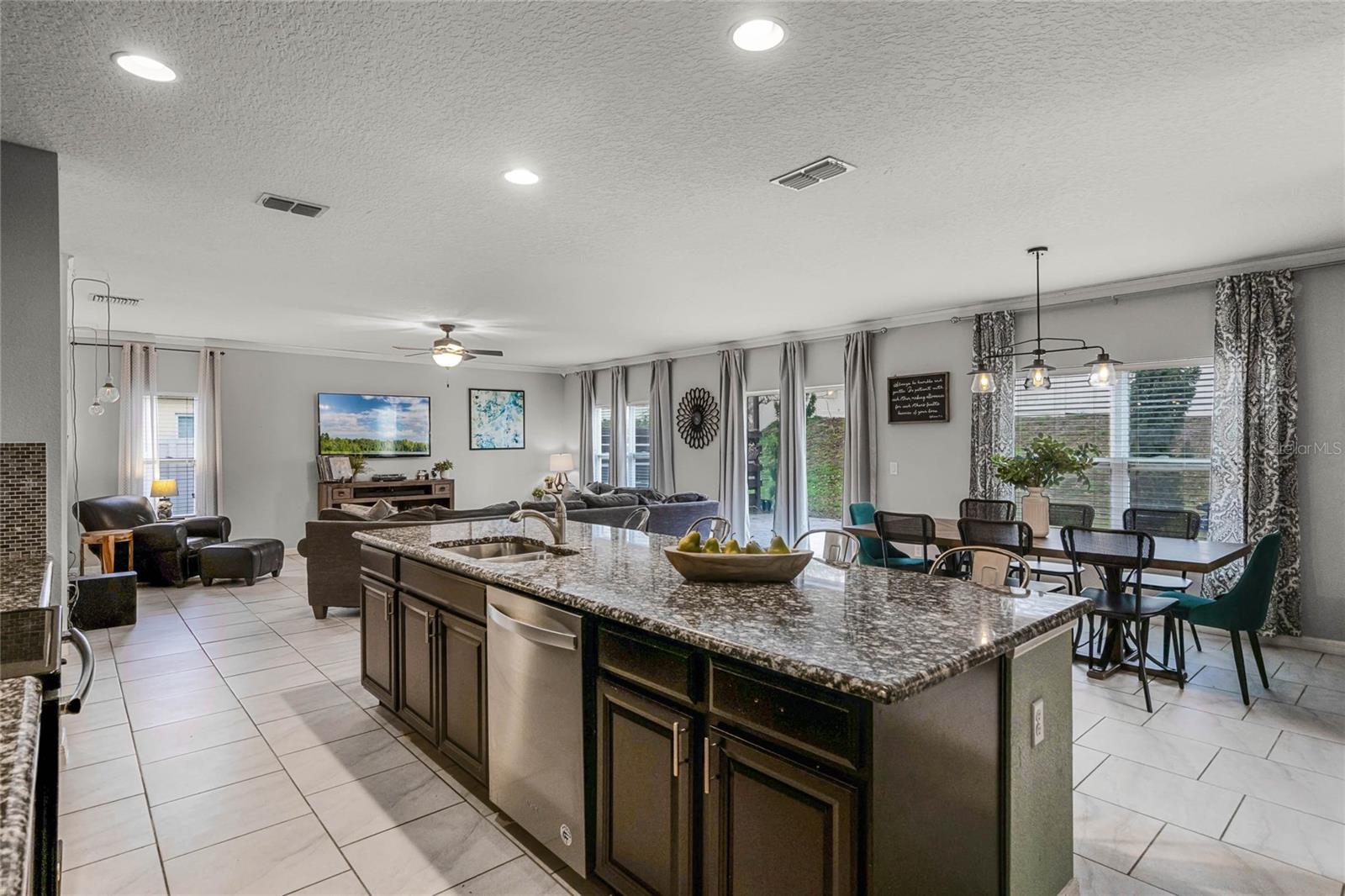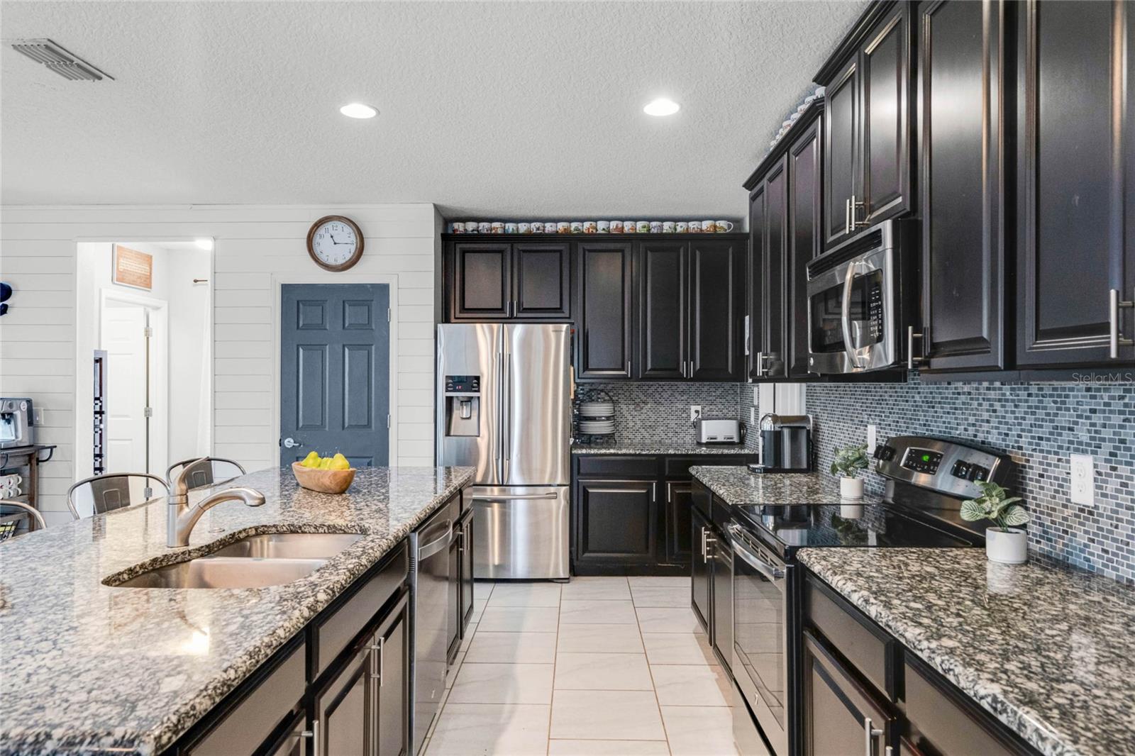 Under contract-accepting backup offers. Welcome to your dream home in the charming community of Vista Grande, where rolling hills and serene water views create a picturesque backdrop for everyday living. This magnificent 2,592-square-foot residence offers five bedrooms and three and a half bathrooms, thoughtfully designed to accommodate both comfort and style. Step inside to discover an open floor plan that seamlessly connects living spaces, featuring an artful blend of modern farmhouse and Florida living. The chef's kitchen stands as a culinary masterpiece with its impressive island, elegant mosaic tile backsplash, and granite countertops. Stainless steel appliances and 42-inch cabinets complete this gourmet space, while a charming shiplap accent wall adds character to the adjacent dining area. Convenience meets comfort with a first-floor bedroom and full bathroom, perfect for guests or multi-generational living. Upstairs, you'll find a versatile loft space and a cozy office nook ideal for remote work or studying. The primary bedroom suite is a peaceful retreat, boasting a generous walk-in closet and a spa-like ensuite bathroom featuring dual sinks, granite counters, a private water closet, luxurious soaking tub, and separate shower. All of the bedrooms are very generously sized, and the upstairs laundry room is perfectly placed for convenience. Outdoor living is a pleasure with an oversized, gently sloping yard, enhanced by a spacious brick paver patio bordered by Italian cypress, and surrounded by partial privacy fencing. Additional amenities include a new roof installed in 2020, energy saving double-pane windows, attached two-car garage, new carpeting on the staircase and bedrooms, and tile floors throughout the rest of the home. If you love the outdoors, the neighborhood offers easy access to local amenities, including nature preserves and boat ramps. This thoughtfully designed home perfectly balances modern comfort with practical living in one of Clermont's most desirable communities.