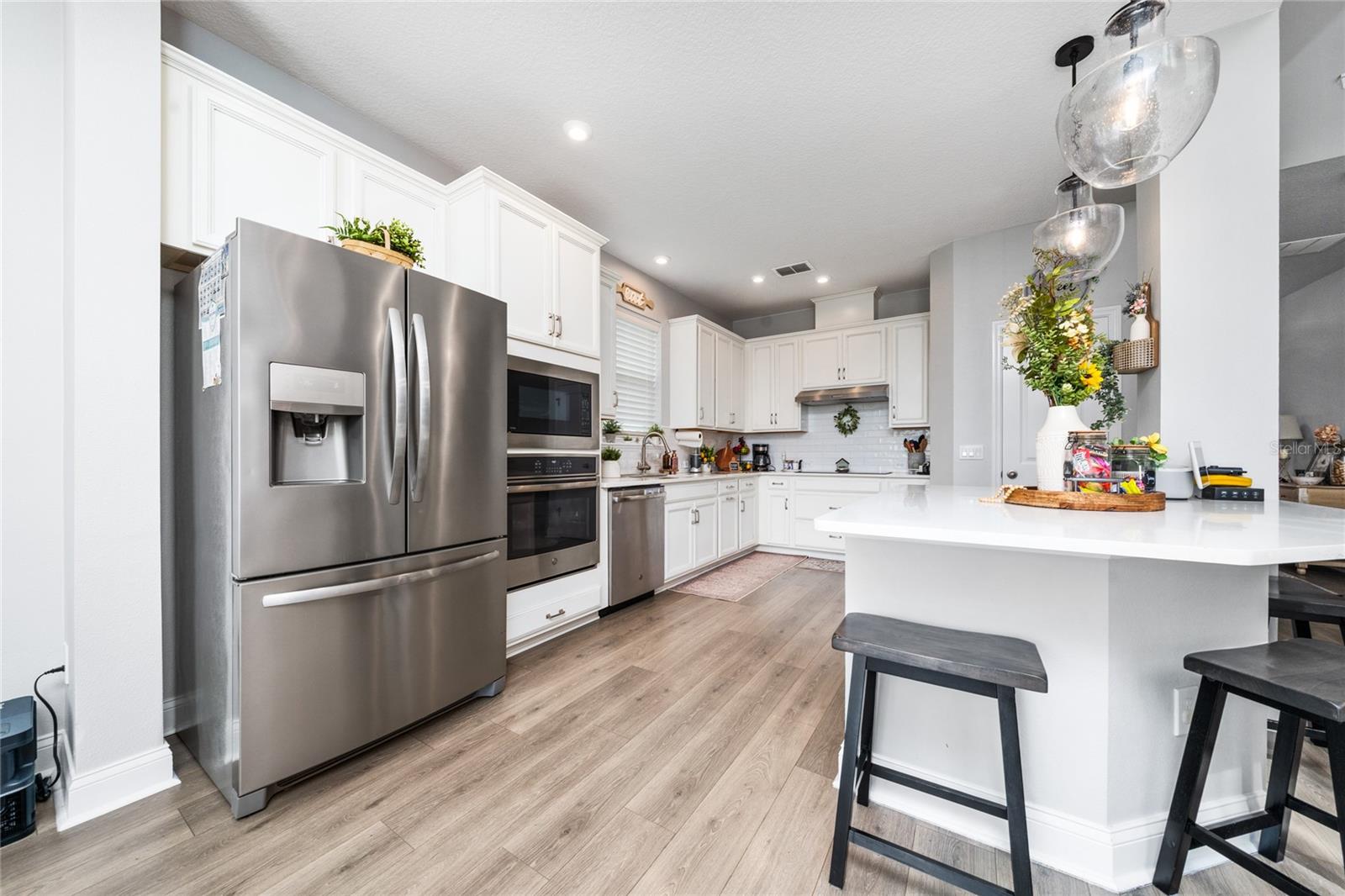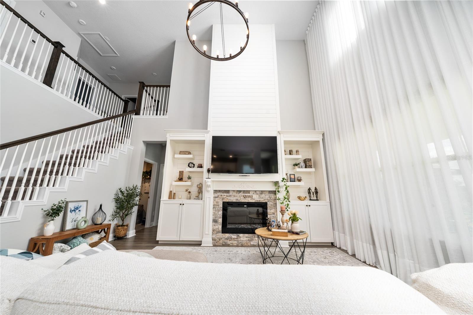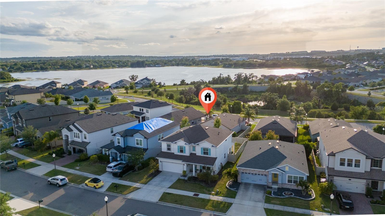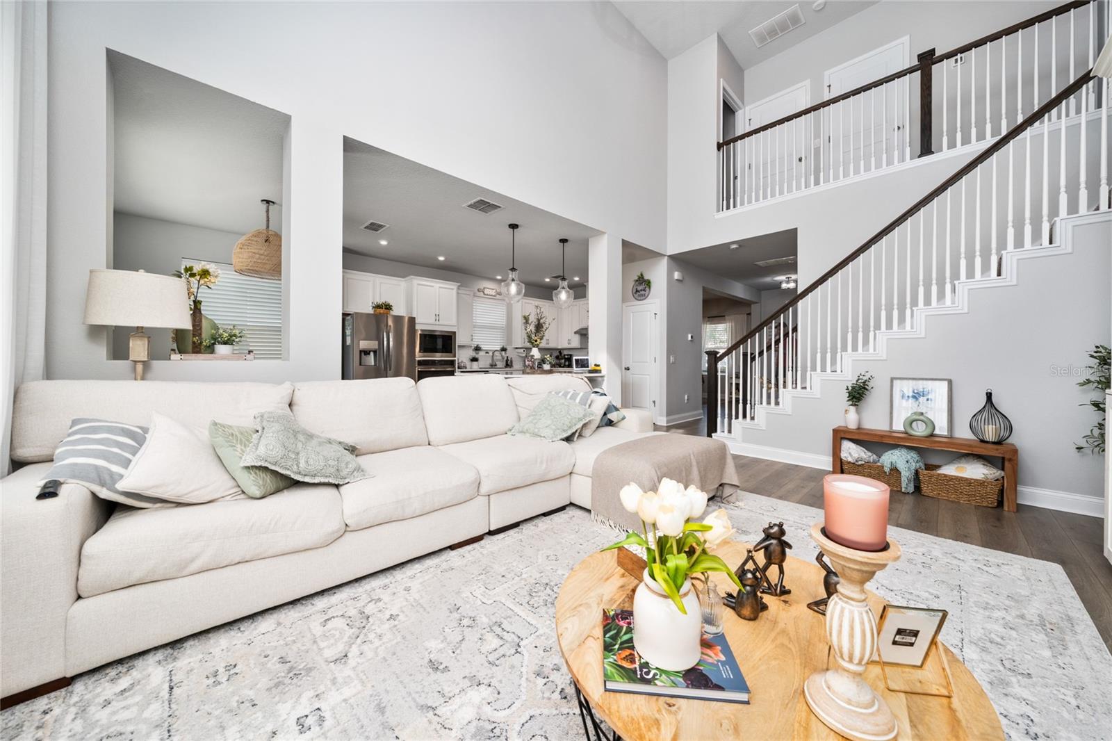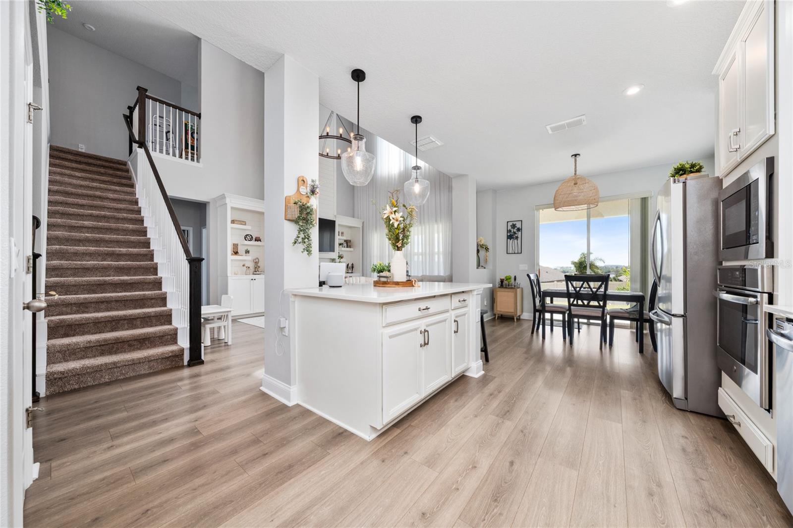 Welcome to this thoughtfully upgraded and meticulously maintained 4-bedroom, 3-bathroom home located in the highly sought-after community of John’s Lake Landing. From the moment you arrive, you’ll be captivated by the beautiful curb appeal and the inviting covered front porch — perfect for enjoying peaceful mornings or evening conversations. Step inside to a bright, open-concept floor plan featuring luxury vinyl plank flooring, soaring ceilings, and abundant natural light. The gourmet kitchen is a chef’s dream, boasting quartz countertops, subway tile backsplash, stainless steel appliances, wall oven and microwave, vented hood, glass cooktop, spacious pantry, and a large center island that offers ample prep space and seating. The kitchen flows seamlessly into the family room, which is bathed in natural light thanks to oversized windows and high ceilings — creating a warm, welcoming space ideal for entertaining. Thoughtfully designed upgrades include a stunning custom-built TV tower and beautifully tailored curtains that add a touch of elegance and coziness to the living space. Upstairs, the handcrafted staircase with stained wood handrails and spindles leads to a versatile loft area — ideal for a home office, second living room, playroom, or gym. The owner’s suite features a spacious layout with a large walk-in closet and custom organization system, dual vanities with quartz countertops, a frameless glass shower, and private water closet. Two additional bedrooms share a full bath with quartz finishes and tile surround. Downstairs, the fourth bedroom is conveniently located near a full bathroom and laundry room — perfect for guests or multigenerational living. Step outside to a fully fenced backyard, ideal for children, pets, or even the addition of a future pool. From the back of the home, you’ll enjoy breathtaking sunset views over the lake, making every evening feel special. Additional features include a whole-house water softener system, which is not included in the sale but can be assumed with the existing loan — a valuable addition for future homeowners. This home is located near top-rated schools, shopping, and dining, with easy access to the Florida Turnpike. The community also offers a resort-style pool for residents. Don’t miss your chance to own this upgraded, move-in-ready home with sunset views and thoughtful touches throughout — schedule your showing today! Washer, dryer, and water softener system do not convey.