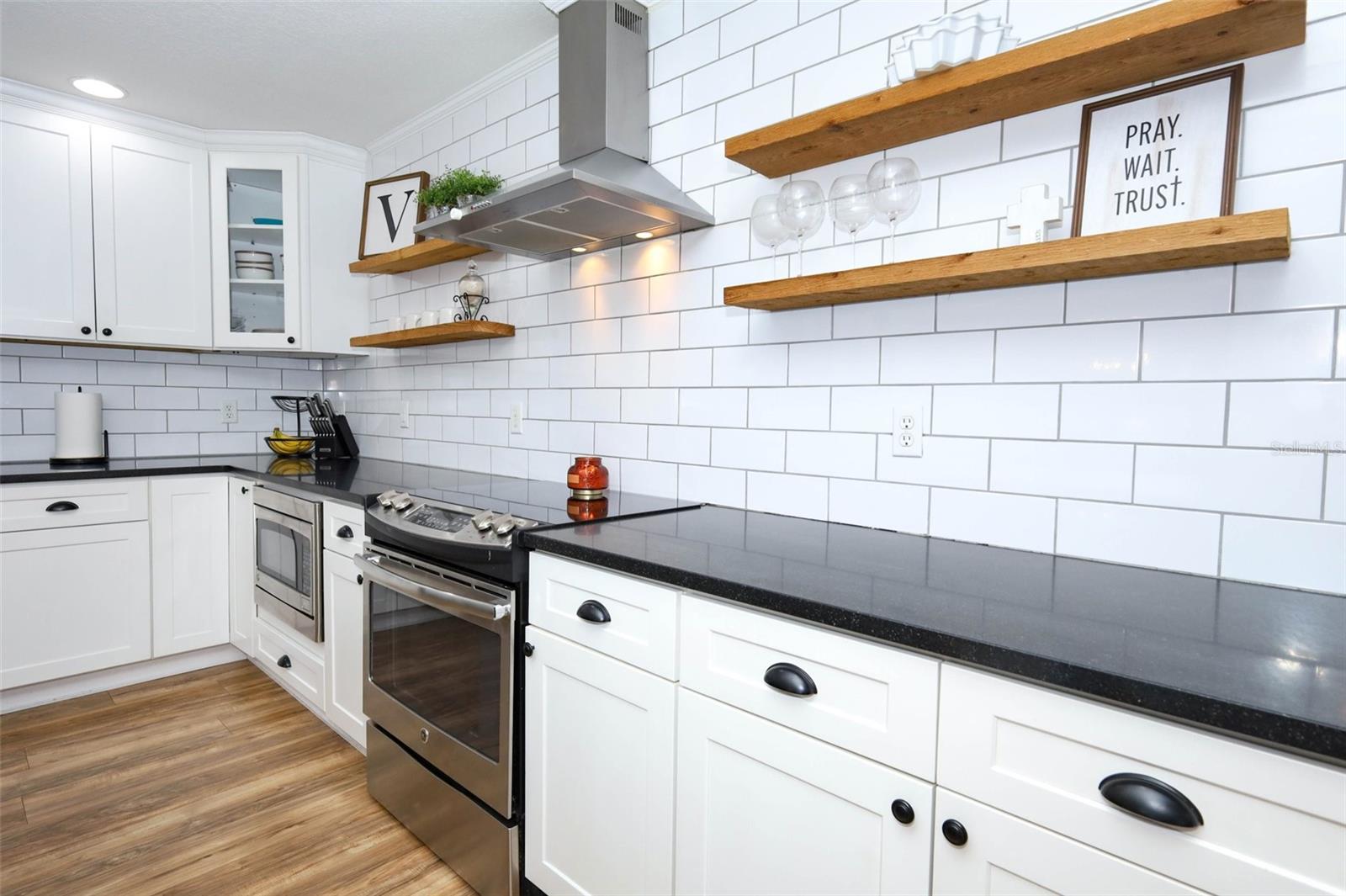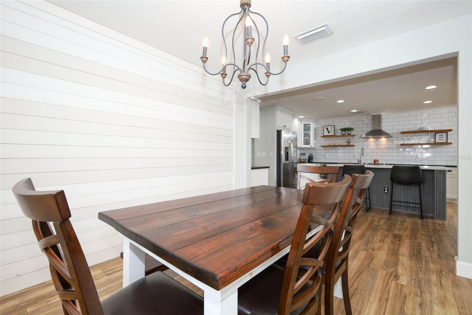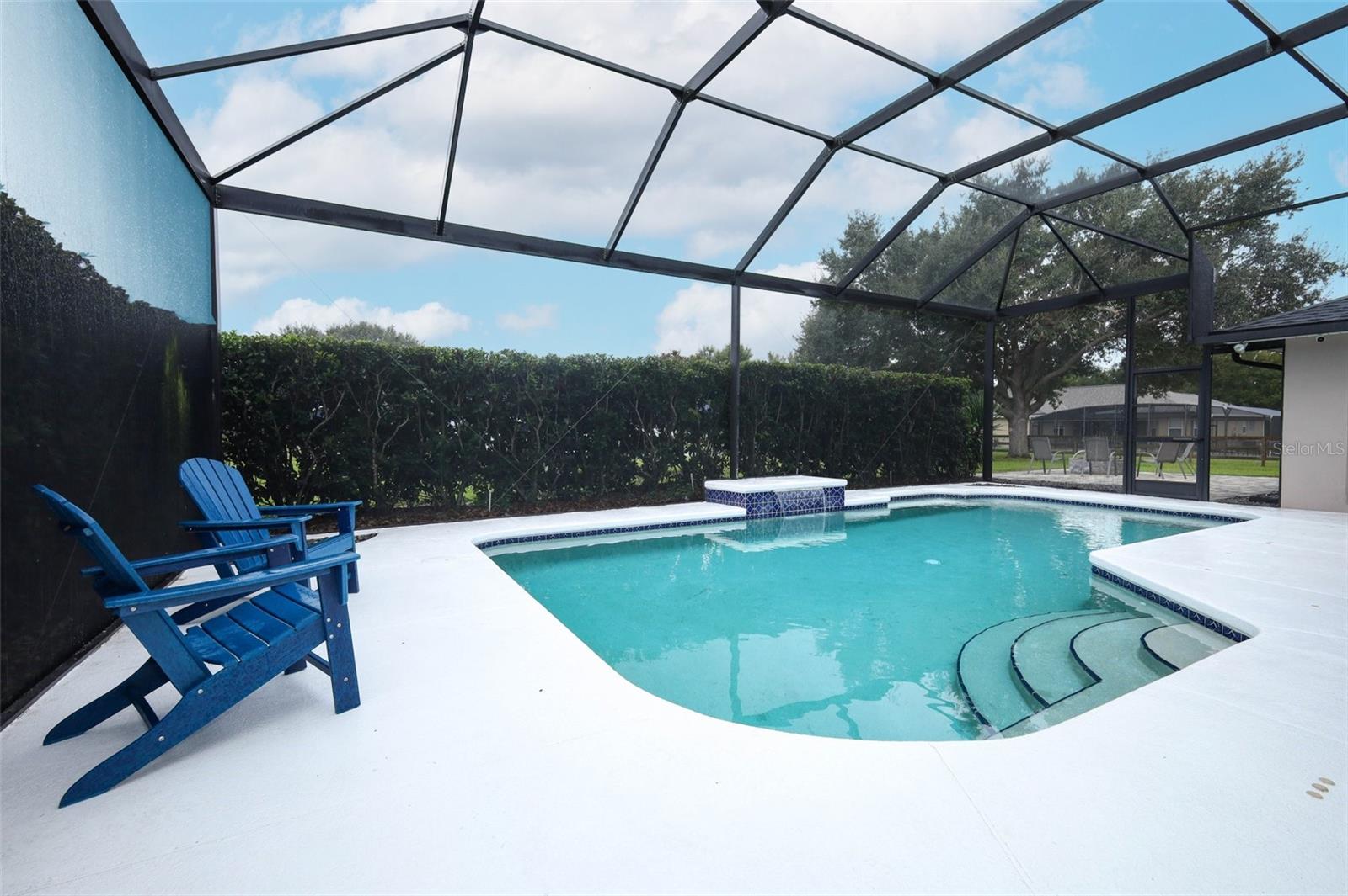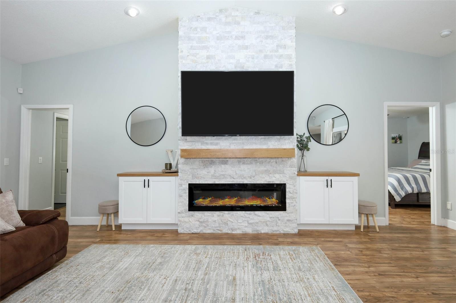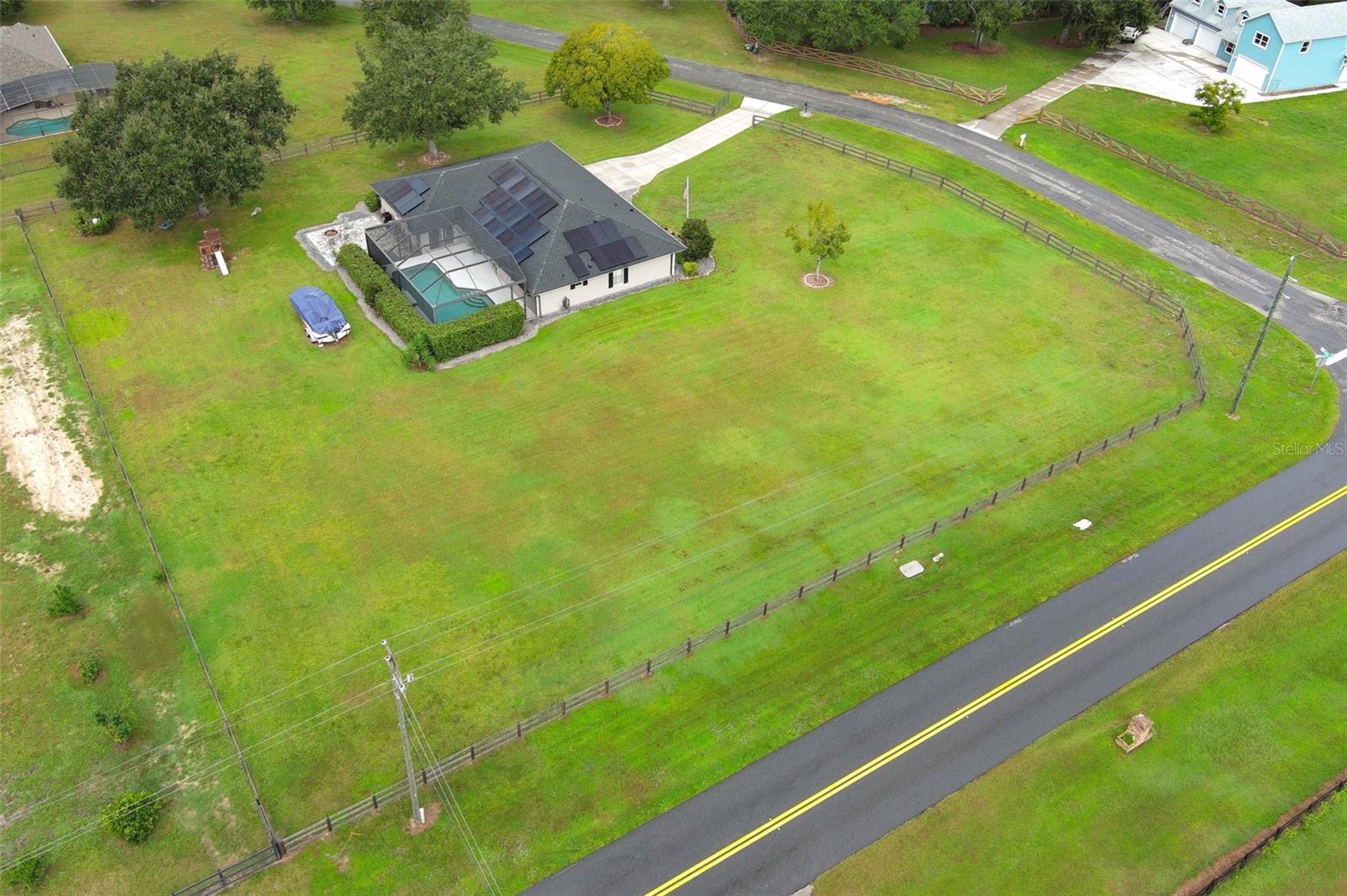 Welcome to Lake Monte Vista! This stunning 4-bedroom, 2.5-bath pool home sits on a spacious 1.13-acre corner lot with lake views, no HOA, and solar power—offering the ultimate combination of comfort, style, and everyday convenience. Inside, the expansive great room wows with vaulted ceilings, a stone accent wall, an elegant electric fireplace, and wide-open views of the sparkling heated pool. Natural light floods the home’s 3-way split floor plan, beautifully finished with luxury vinyl plank flooring throughout. The chef’s kitchen is a showstopper with quartz countertops, GE appliances, wine refrigerator, custom pull-out shelving, and a massive marble-topped island. A walk-in pantry ensures plenty of storage, while the oversized laundry room adds everyday ease. The master suite feels like a retreat with sliding doors leading directly to the pool, a stylish barn door entry, spa-like bath with rainfall shower, and a generous walk-in closet. Two additional bedrooms share an updated bath with subway tile, while the fourth bedroom is perfect as an office or flex space, complete with built-ins and a wall-length closet system. Stacking sliders create a seamless indoor-outdoor flow to the covered lanai—perfect for entertaining. Step outside to your private oasis: relax by the screened pool, or enjoy nights under the stars roasting marshmallows over the 20' x 26' paver patio and wood-burning firepit. The fully fenced yard offers room to roam, and there’s plenty of space for your boat or RV. The oversized 2-car garage with workbench and shelving adds even more function. Enjoy the peace of country living while still being just minutes from shopping, dining, and all that Clermont has to offer. Schedule your private showing today!