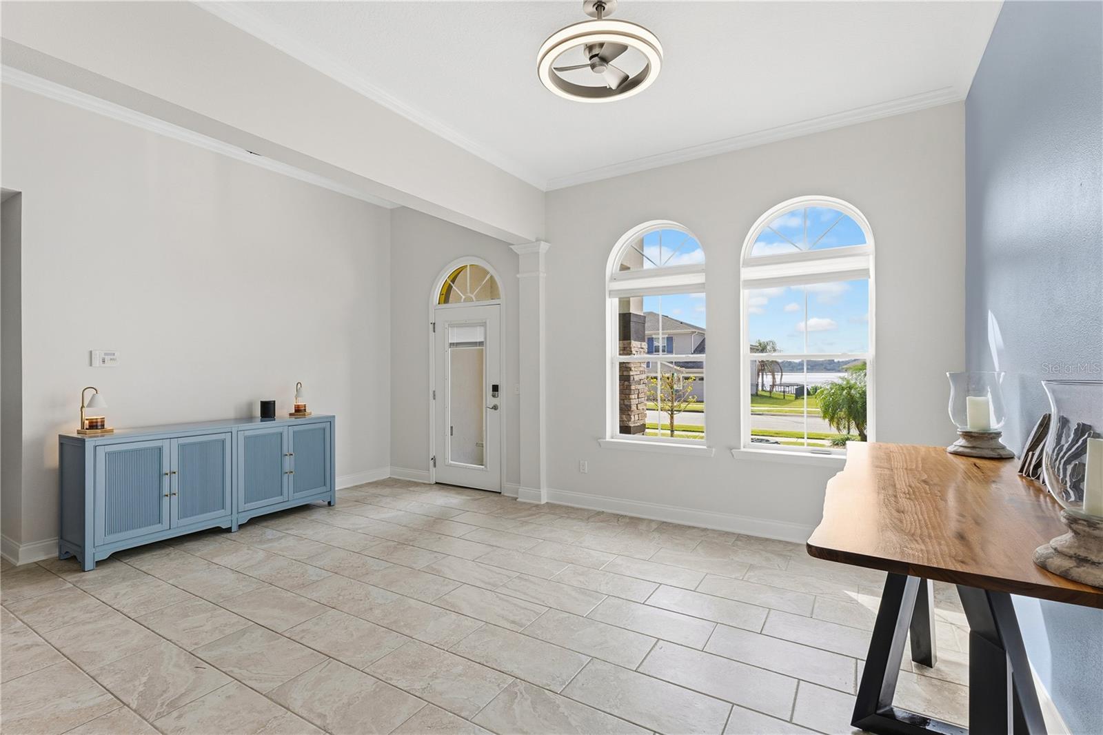 Exceptional one story home, perfectly situated on an oversized corner lot with views of Johns Lake. Thoughtfully designed open floor plan creates comfortable spaces for family lifestyle. Soaring ceilings and abundant natural light throughout. The elegant living room features a built-in fireplace, creating a warm and inviting atmosphere with views of the tropical outdoor pool. The gourmet kitchen is a chef's dream, equipped with granite countertops, stainless steel appliances, and ample cabinetry. The expansive primary bedroom includes a luxurious ensuite bathroom with a super shower, double sinks, granite counters, and a spacious walk-in closet. The versatile bonus retreat area includes a 2nd bathroom and two additional bedrooms, offering a private area for family and guests. The outdoor space is truly the highlight, with a magnificent solar heated pool and outdoor patio. The home is conveniently located near shopping, dining, major highways, and top-rated schools. This home truly combines comfort, style, and convenience!