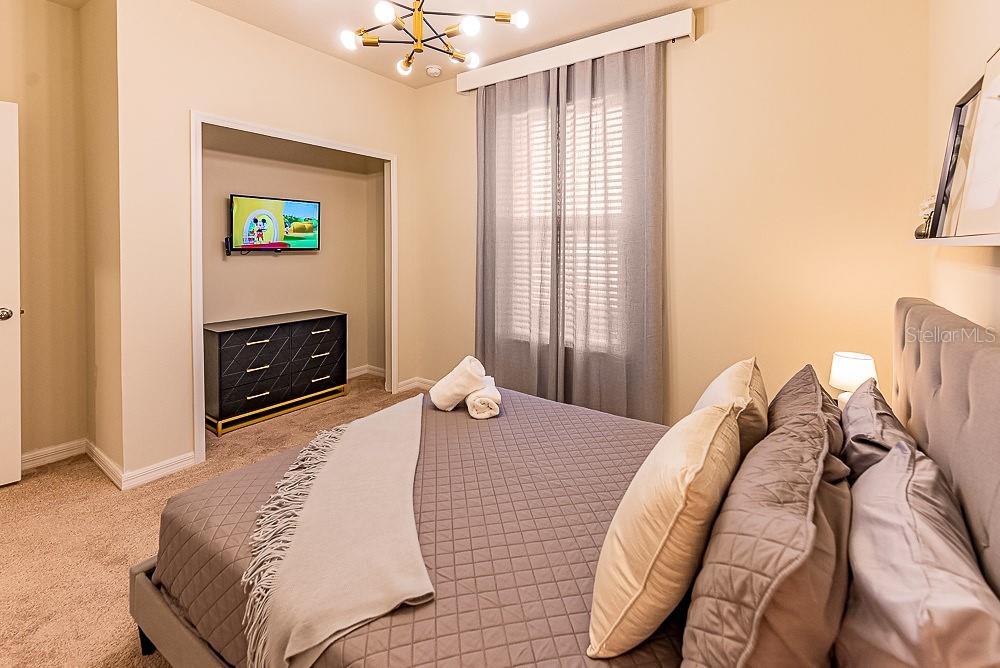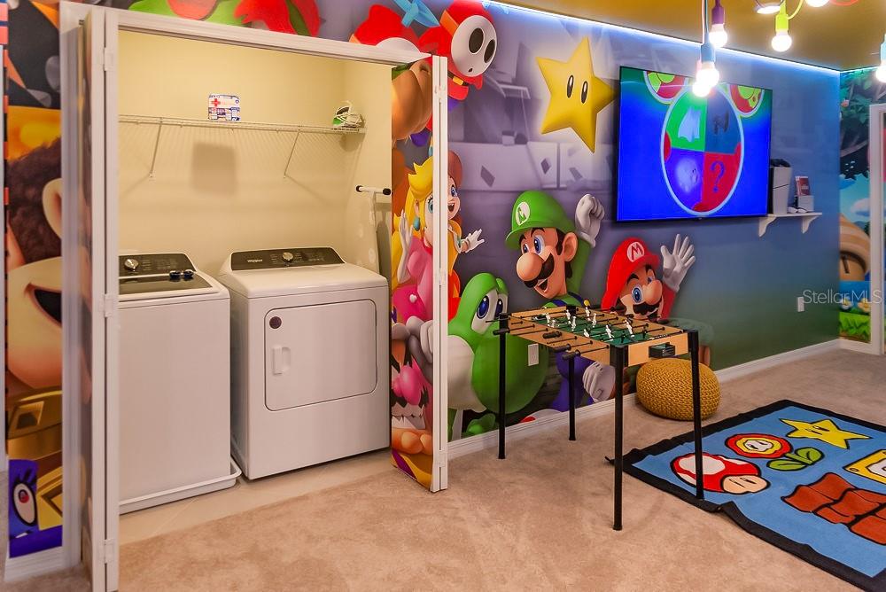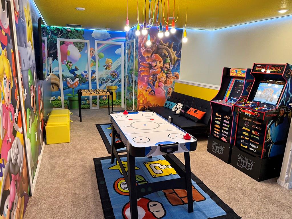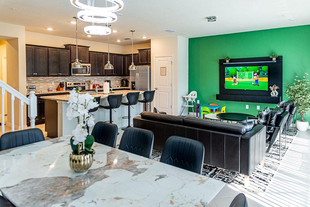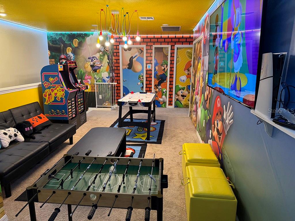 LOCATION, LOCATION, LOCATION! This unique townhouse won't last long on the market. Located just a few hundred yards from the Clubhouse and near a Walmart Supercenter, hundreds of restaurants, shopping centers, and several outlets, it's strategically positioned near major highways—minutes away from Disney and other world-renowned attractions.Strategically designed to accommodate up to 14 people, this property's profitability rivals bigger homes that cost hundreds of thousands more, making it an exceptional short-term rental investment or the perfect personal vacation home. The original dryer has been replaced with a larger, more efficient model to better serve bigger groups.The house has been professionally decorated by the best in the short-term rental industry, creating a one-of-a-kind home that's plug-and-play and ready to book guests from day one. Every piece of furniture was hand-picked to complement the home's style while ensuring durability and affordability for eventual repairs or replacements.With two luxurious suites, a restroom near the private heated pool, and a bedroom next to a bathroom on the first floor for guests who prefer avoiding stairs, this home satisfies the entire family. The designers incorporated cutting-edge technology upgrades: the pool heating system is controlled remotely, the front door operates with remotely generated codes, and five closets with electronic locks (all featuring fingerprint access) store extra supplies and linens for seamless back-to-back reservations.Three themed bedrooms and a Super Mario-themed loft with arcade games and entertainment will keep everyone engaged for days. No one will want to leave this house.