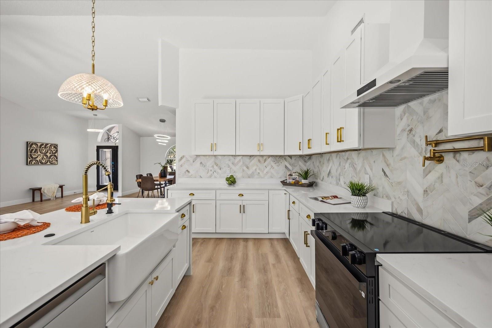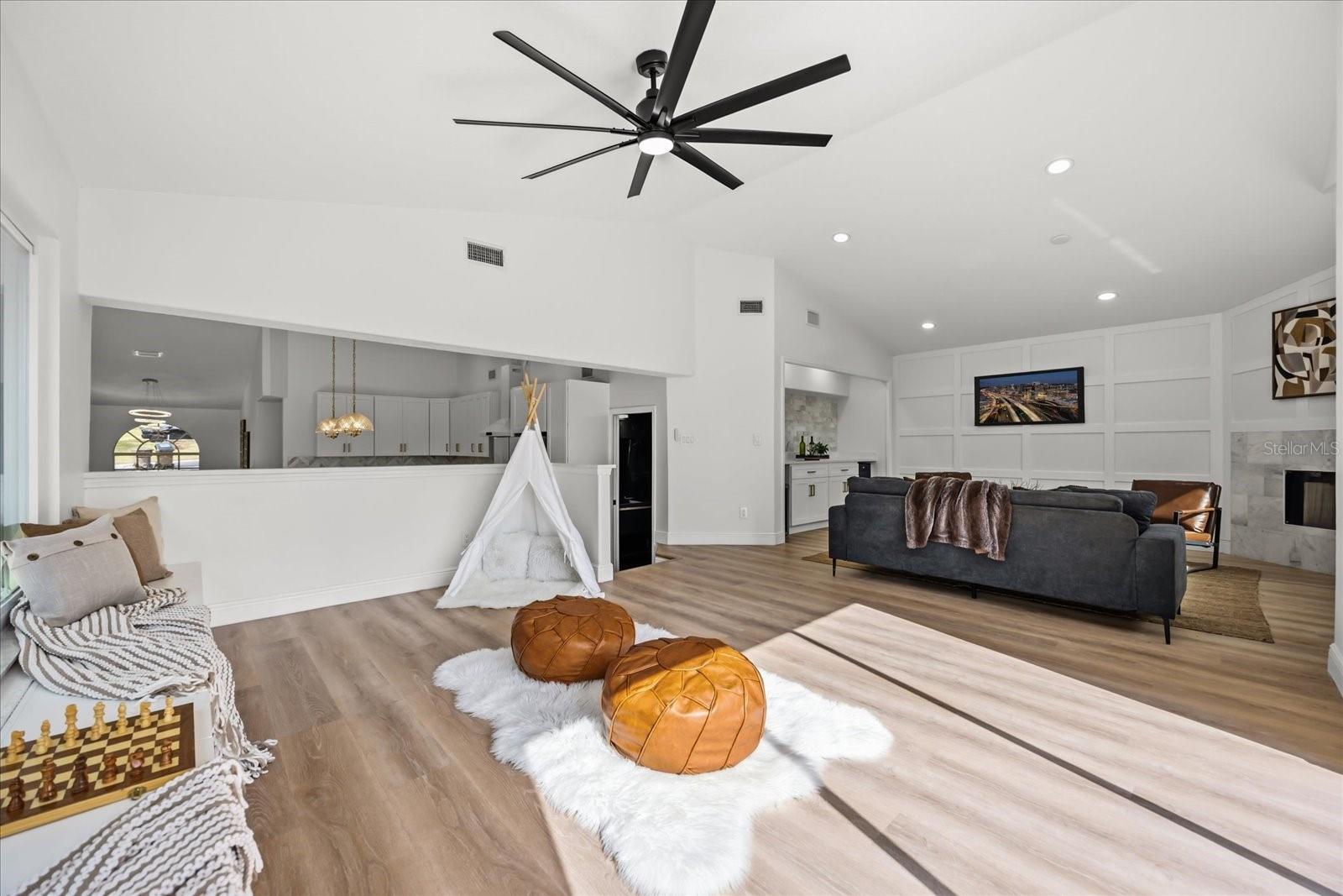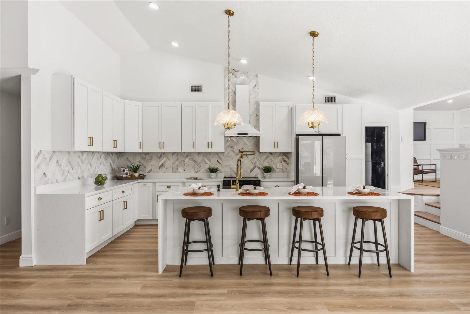Set on an expansive .4-acre homesite with private boat ramp and dock access to Crescent Lake—part of Clermont’s coveted Chain of Lakes connecting to Lake Louisa, Lake Minnehaha, Lake Minneola, and Lake Susan—this refined residence captures the ease of waterfront living with thoughtful modern updates and timeless design. A double-door entry opens to vaulted ceilings and an airy open-concept layout filled with natural light, complemented by seamless LVP flooring throughout and an expansive great room designed for everyday comfort. Just beyond, a dedicated gathering room serves as the true heart of the home, anchored by a wood-burning fireplace and enhanced by a stylish wet bar with beverage refrigeration—an inviting setting for relaxed evenings and memorable entertaining. Full retractable sliding glass doors create a seamless transition to the spacious covered lanai, blending indoor and outdoor living with effortless flow. The chef’s kitchen is appointed with solid wood shaker cabinetry, striking waterfall quartz countertops, a porcelain farmhouse sink, brand-new stainless smart appliances, and a four-seat island that naturally draws conversation. A formal dining room adds elegance for hosted dinners, while the privately positioned primary suite offers a tray ceiling, dual closets, direct lanai access with a tranquil peek of the lake, and a luxurious en-suite featuring dual vanities, a curbless walk-in shower, and a soaking tub. Two guest bedrooms are thoughtfully arranged on a split floorplan and share a beautifully updated bath with a sage green vanity and sleek finishes, complemented by an adjacent laundry room with cabinetry and utility sink. Notable upgrades include a 2021 roof replacement, all new double-pane windows, complete repipe plumbing, a new water heater, rain gutters, lush landscaping, and a side-entry two-car garage, all enhanced by a sweeping U-shaped driveway that elevates the home’s exterior presence. Blending space, light, and private chain-of-lakes access, this property offers a rare opportunity to live immersed in Clermont’s rolling hills and waterfront lifestyle while remaining just minutes from major shopping, dining, and everyday conveniences that make life effortlessly accessible.