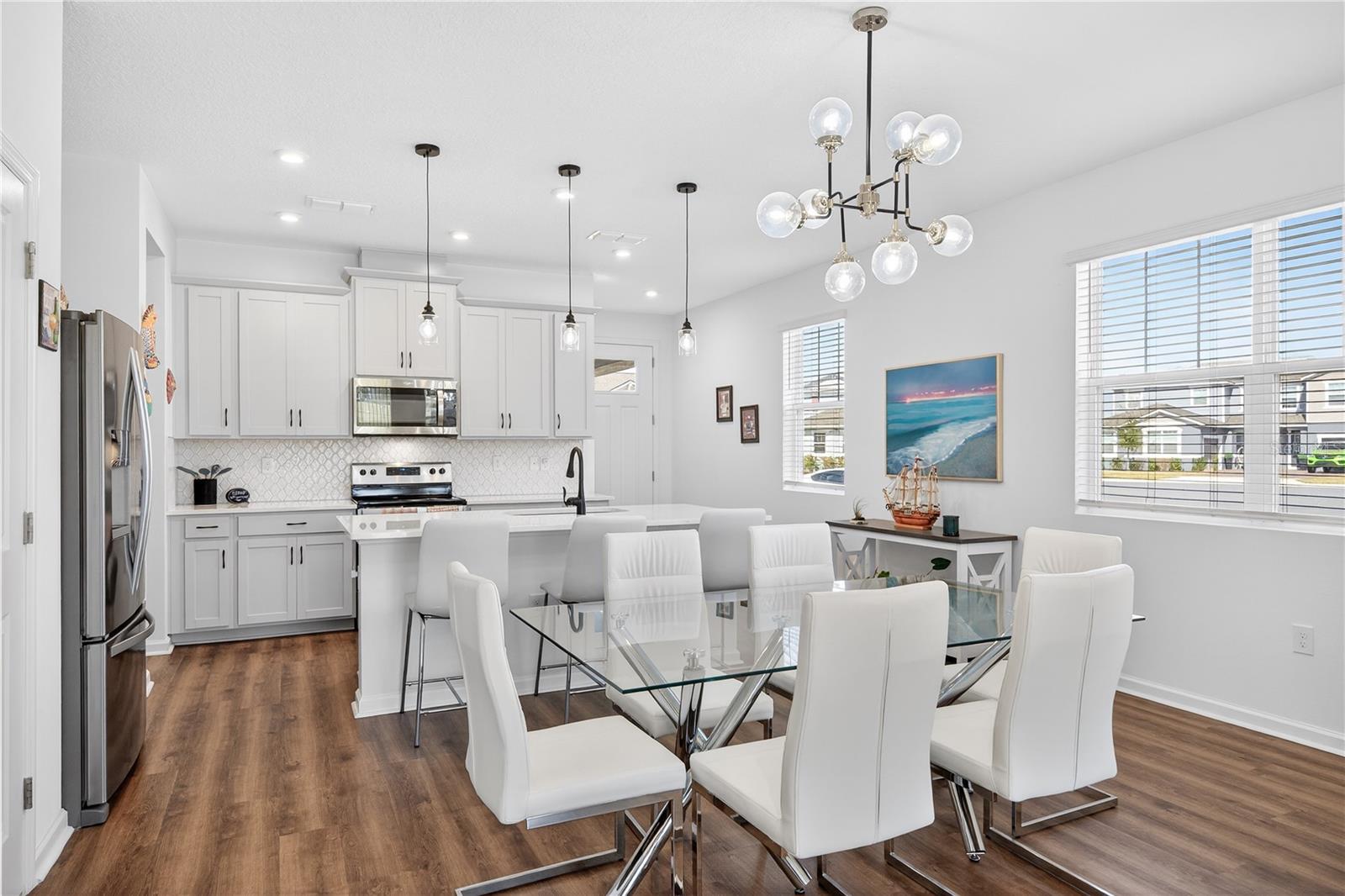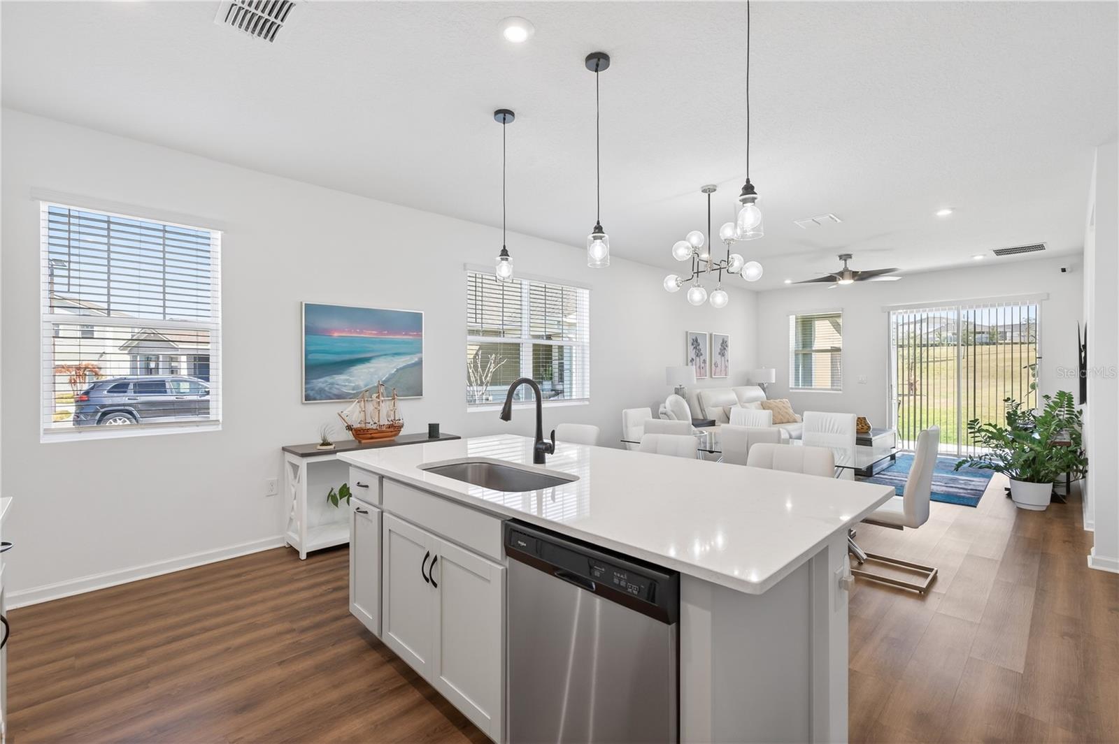 Experience refined, low-maintenance living in this BEAUTIFULLY designed, move-in-ready 3-bedroom, 3-bath villa with a versatile loft, ideally located in a desirable gated community on an oversized lot. The first floor features luxury laminate flooring throughout the main living areas, with two split bedrooms and two full bathrooms, including a serene primary suite. The updated kitchen showcases quartz countertops and stainless steel appliances, blending style and functionality. The primary suite offers a large walk-in closet, and the ensuite includes dual sinks, a large vanity, and a separate shower. Upstairs, the expansive loft provides additional living space, perfect for movie nights, game nights, or a media or lounge area, along with the third bedroom and a full bathroom, ideal for guests or multigenerational living. Enjoy effortless indoor-outdoor living on the covered patio and the convenience of all appliances included, upgraded ceiling fans and light fixtures throughout, and newly installed gutters (2026). The two-car garage is EV-ready with a dedicated charging outlet. Conveniently located near shopping and dining, with easy access to major highways, including Florida Turnpike, Hwy 50, Hwy 27, and the 429. Residents enjoy resort-style amenities, including a pool, playground, splash pad, dog park, and fitness center—offering a refined lifestyle with everyday convenience. CALL today to schedule a private tour.
