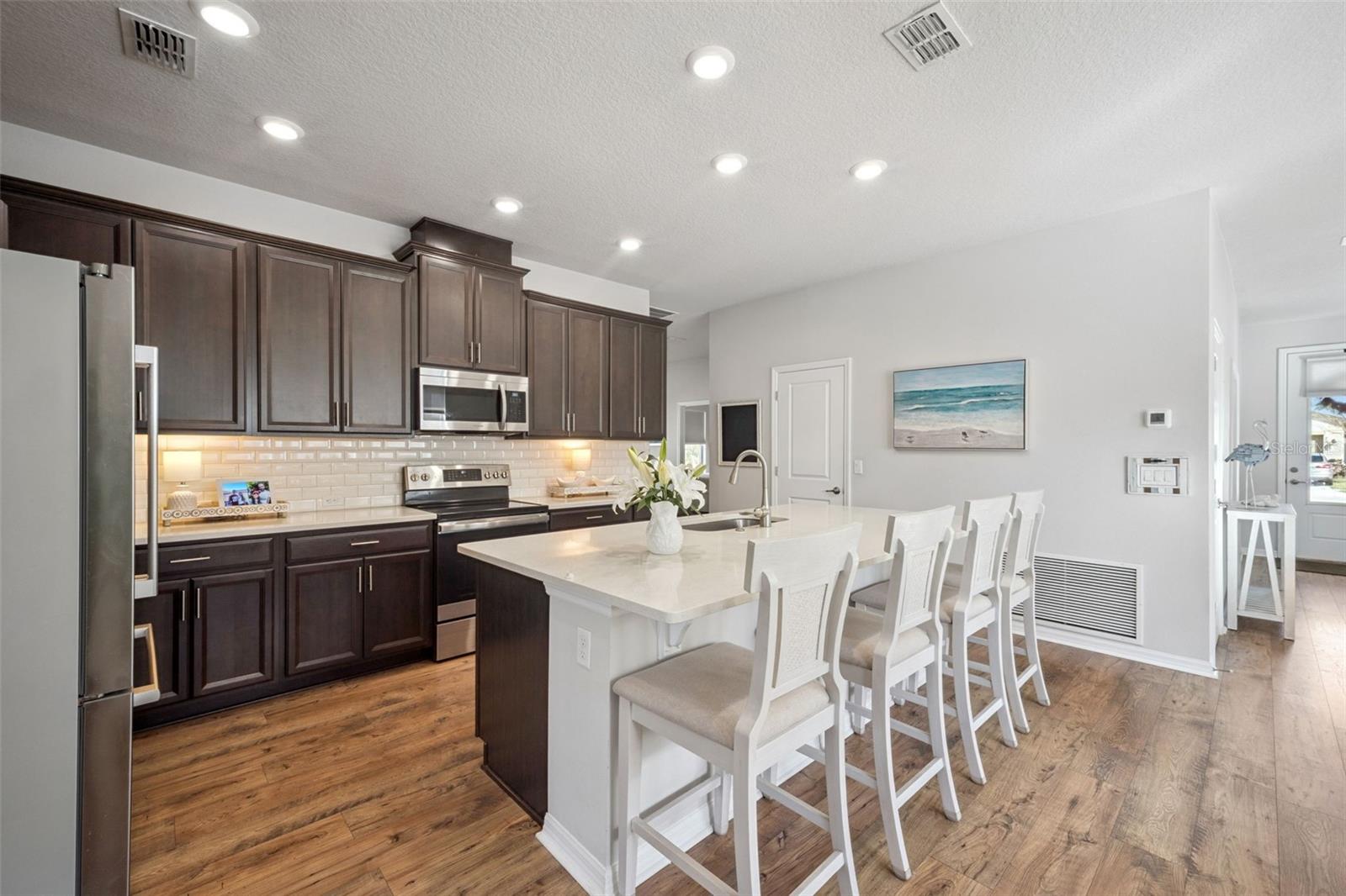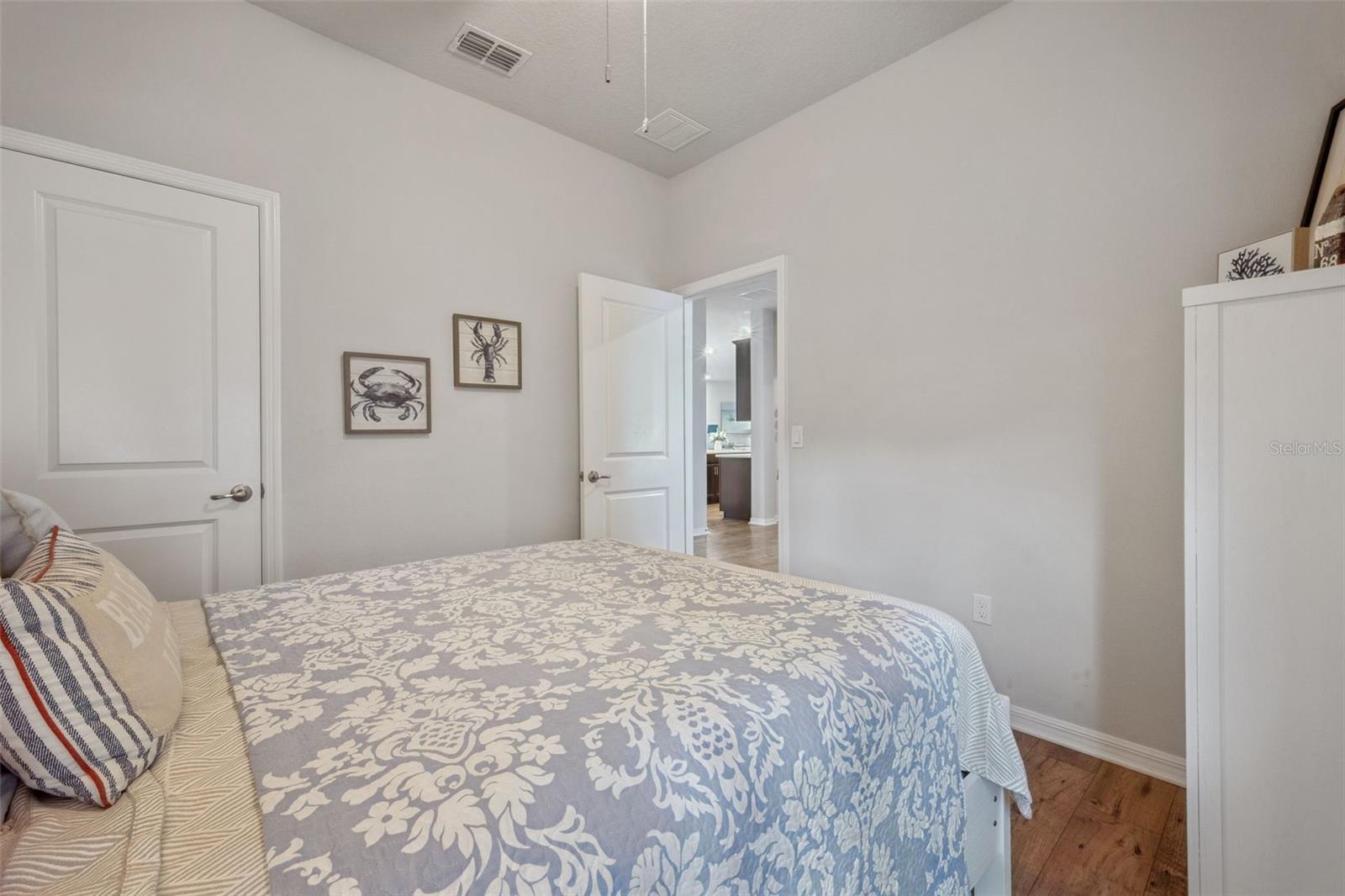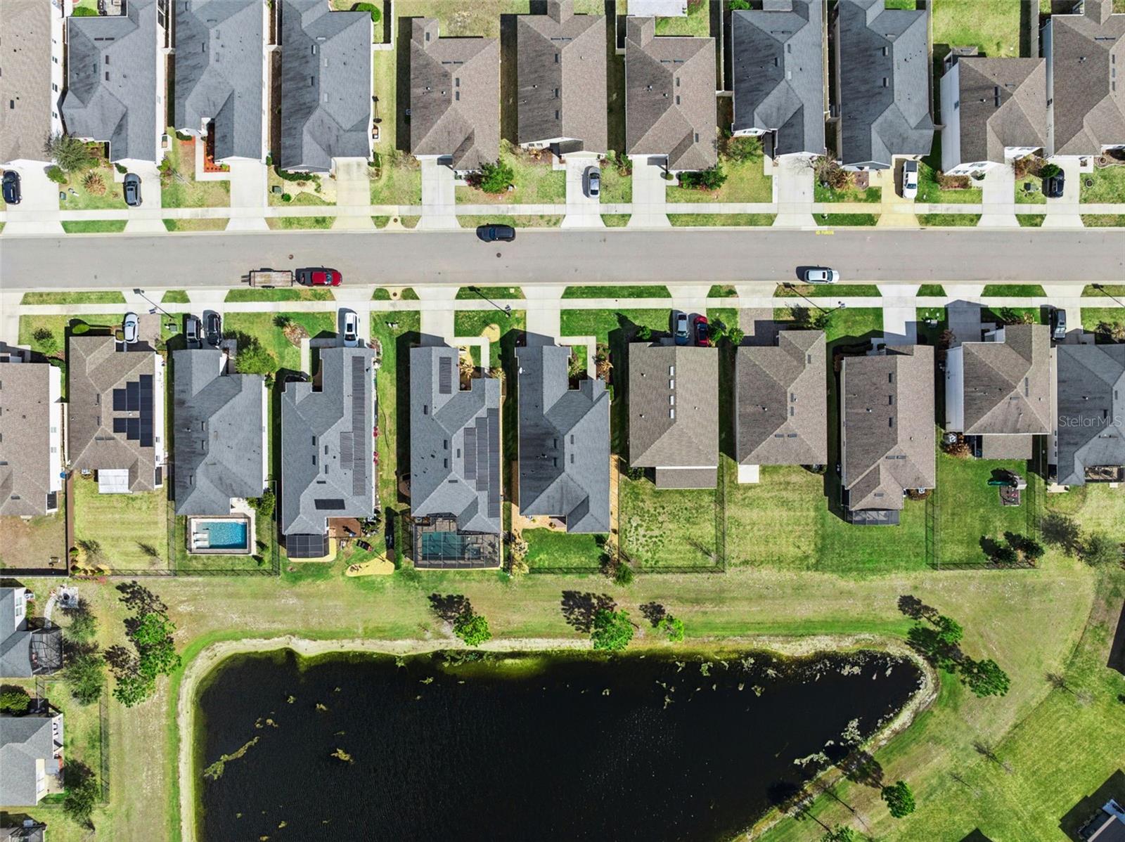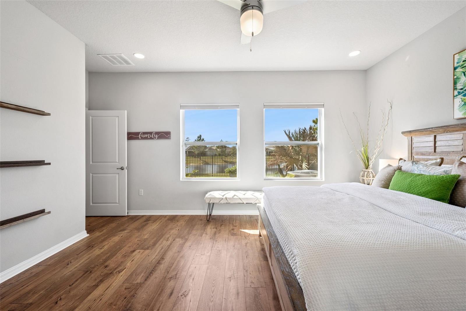Beautiful 3-bedroom, 2-bath home built in 2019 featuring a bright, open floor plan and thoughtfully designed living spaces. Enjoy peaceful water views the moment you enter the home, and from the family room, primary bedroom and covered lanai creating a relaxing indoor-outdoor living experience. A private study with elegant French doors provides the perfect work-from-home option, while a versatile retreat area is positioned between the secondary bedrooms—ideal for a home office, playroom, or media/computer space. The home features durable, scratch-resistant laminate flooring throughout and a stylish kitchen with quartz countertops, walk-in pantry, and stainless appliances (all replaced in 2024). Step outside from your family room to a spacious covered lanai that truly extends the living space outdoors. This shaded retreat offers the perfect setting for morning coffee while watching the tranquil water views, or relaxing evenings with friends and family. The covered design allows you to enjoy the outdoors rain or shine while staying cool and comfortable, and it overlooks the fully fenced, beautifully manicured backyard, providing both privacy and a serene backdrop. With plenty of room, the lanai is ideal for entertaining or simply unwinding while taking in the peaceful waterfront scenery. Located in the GATED community of Serenoa Village 2, residents enjoy convenient access to Walt Disney World Resort, shopping, dining, and major highways including Florida State Road 429, U.S. Highway 27, and U.S. Route 192. A future connector road to Disney parks is expected in 2026, adding even greater convenience. The HOA fee includes cable and internet, and residents enjoy resort-style amenities including a clubhouse with planned weekly events and private event room, 24-hour fully equipped fitness center, fireplace gathering area, pools, splash zone, dog park, and scenic walking trails. This exceptional home offers comfort, style, and an unbeatable location—ready for its new owner to move right in!