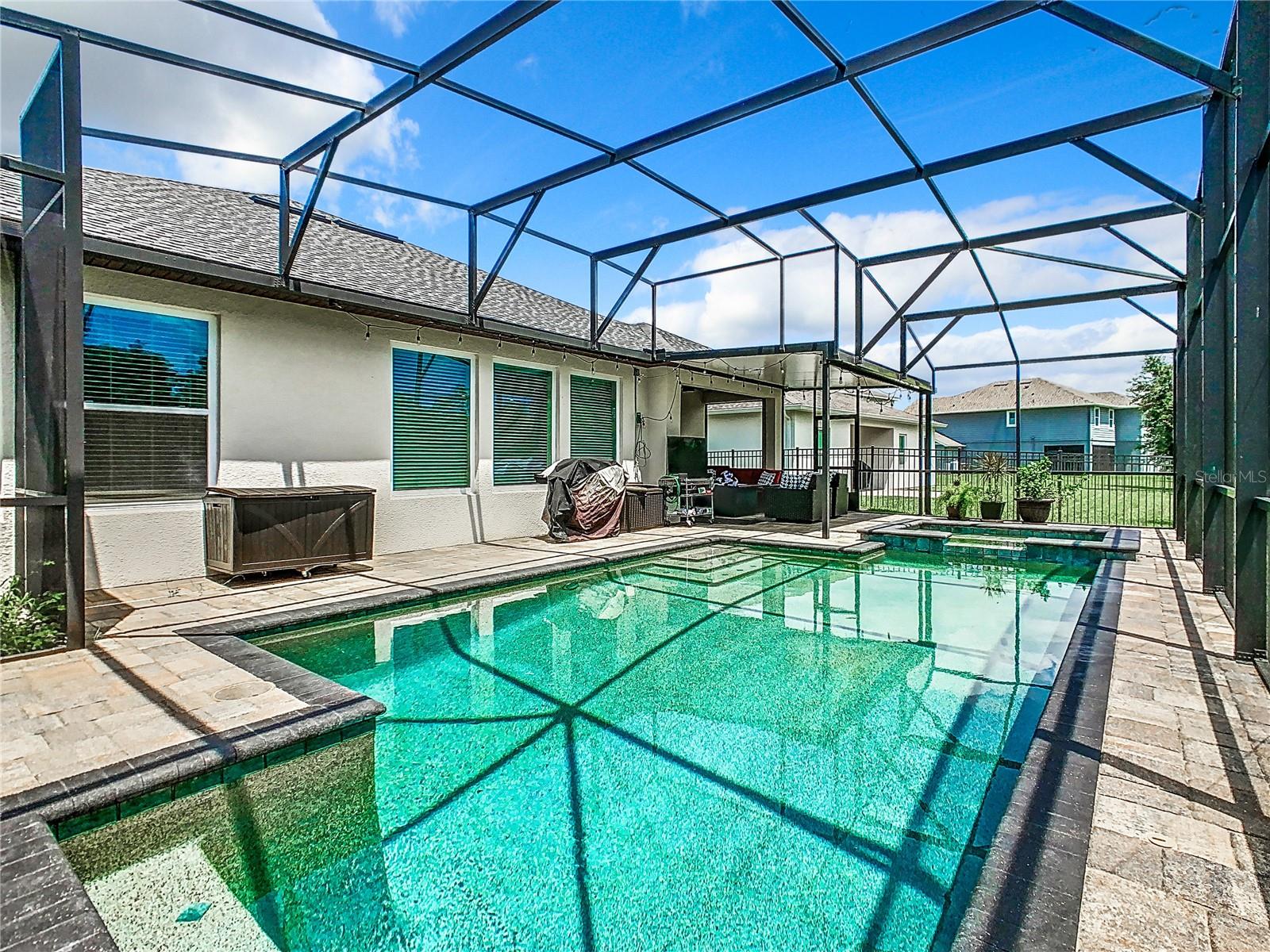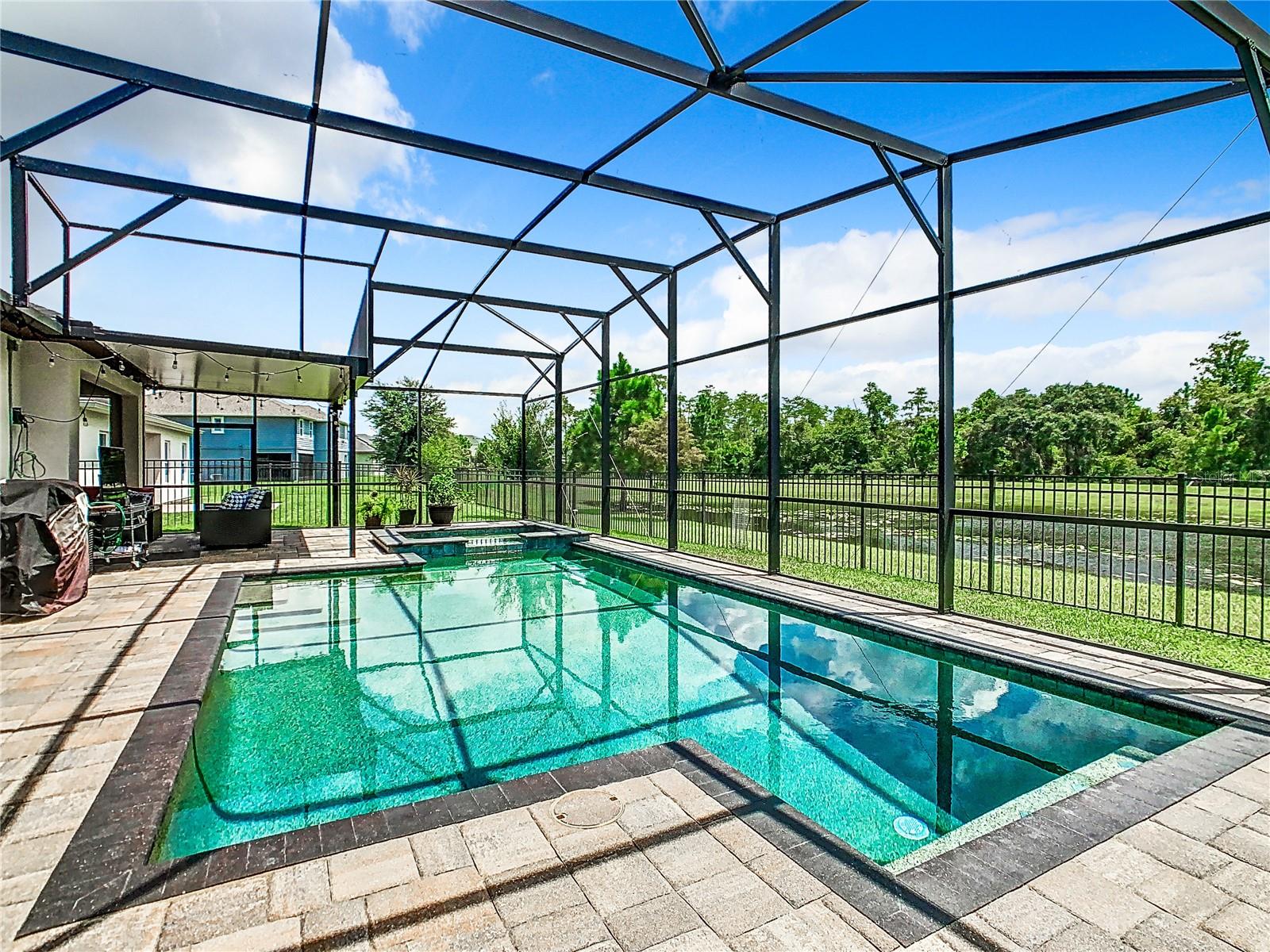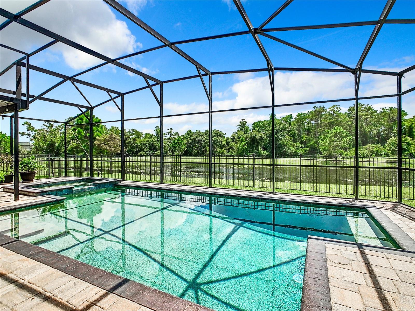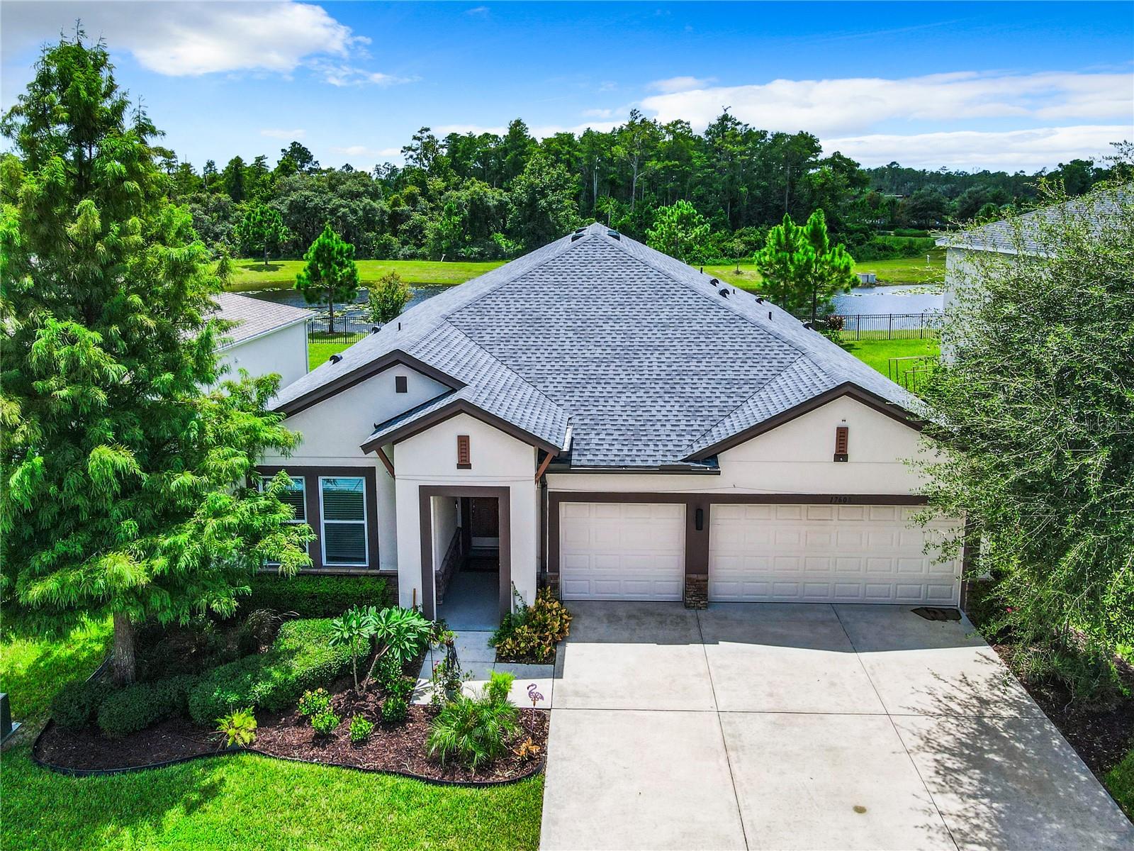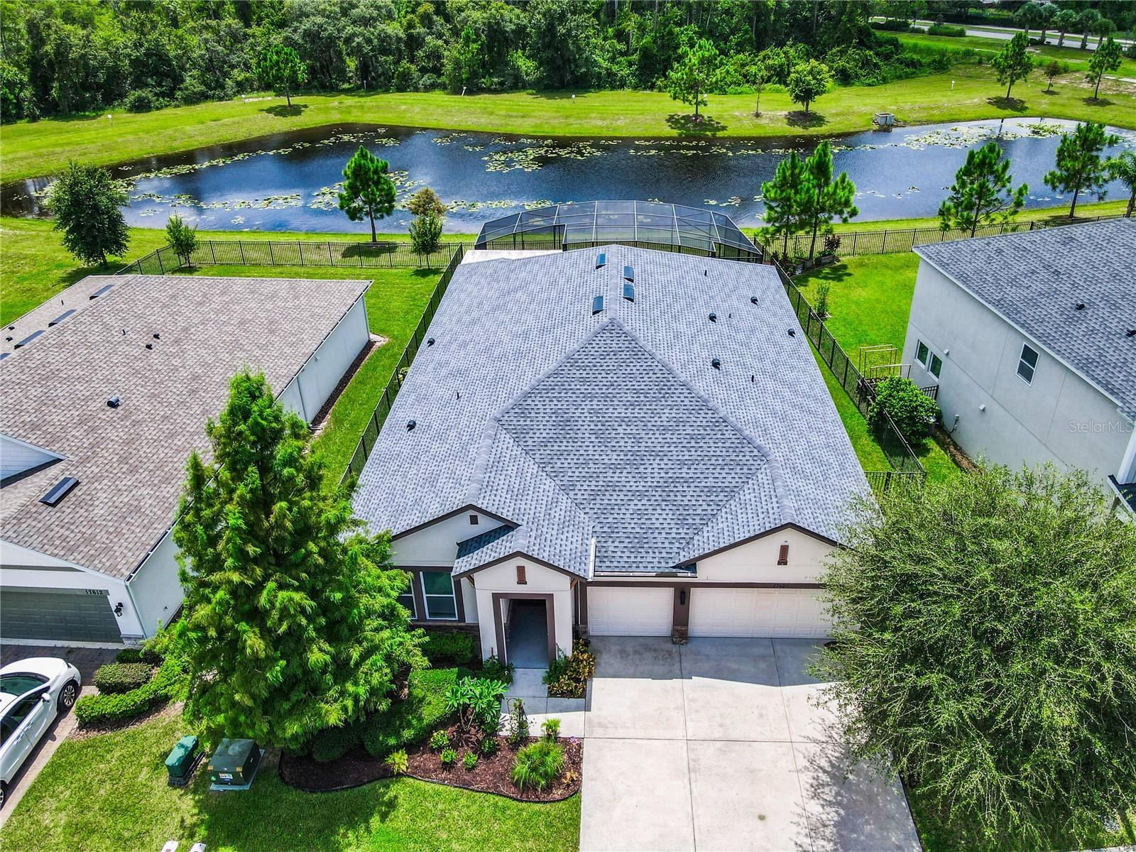 Florida living at its best—everything you could want. Four bedrooms, three bathrooms, a three-car garage, a private pool/spa overlooking a pond, no rear neighbors, and a fully fenced yard in the Gated Village 2 of Serenoa. Built in 2018, new roof in 2023 (due to 2023 hailstorm). Walk into your designer entry hall, with bedroom 4 and its ensuite bath 3 on the left (now used as an office). You will pass the formal dining room/flex room across from the mud entrance from the garage. Down their separate hallway are bathroom 2, bedrooms 2 and 3, and the inside laundry room. The large island is great for everyday meals and entertaining and opens up to your extensive family area, which overlooks your relaxing pool area. The saltwater pool/spa is heated with your private propane tank. Pool surround pavers have been recently sealed for low maintenance and enjoyment. Just sit back and enjoy the view and quiet of the pond and trees and no rear neighbors. The primary suite has a large walk-in shower, tons of cabinet and c