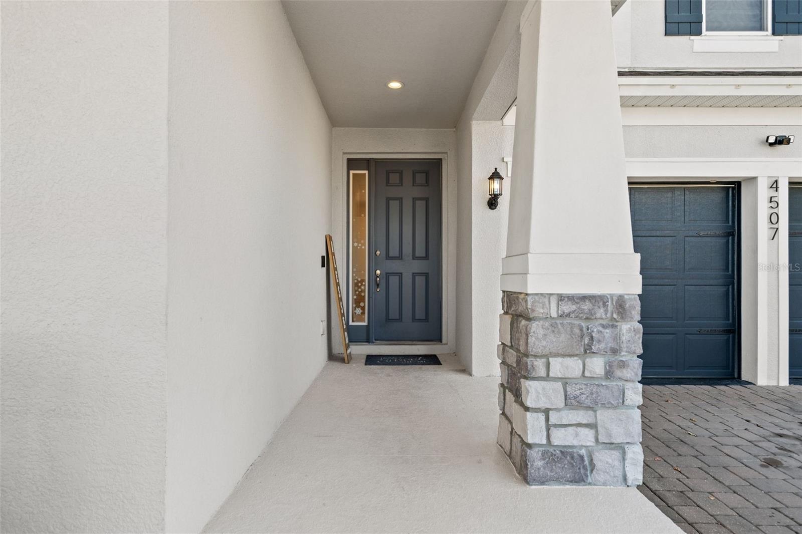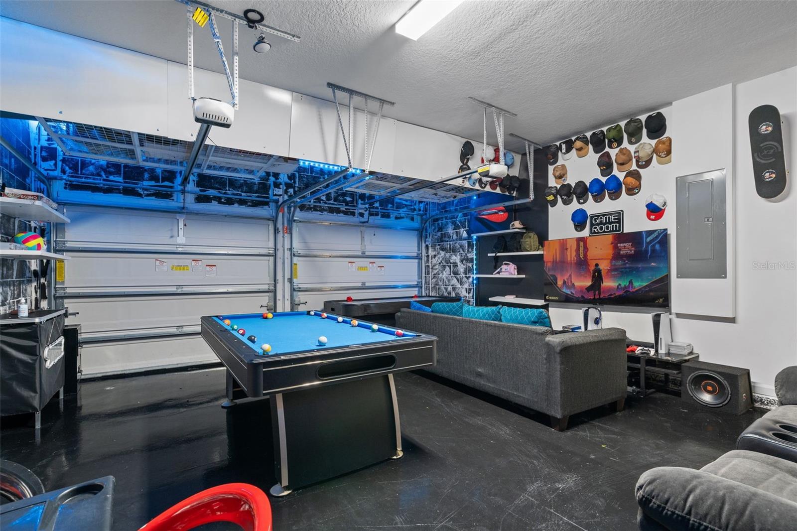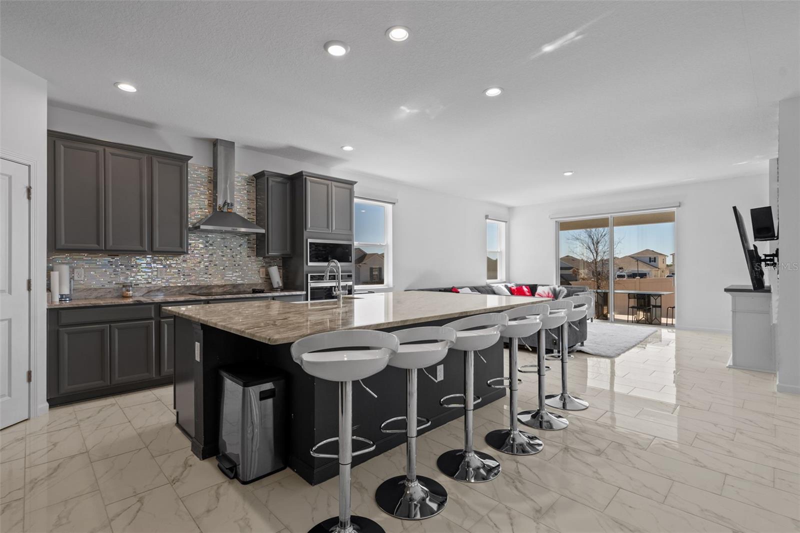 Move-in-ready 5-bedroom, 3.5-bath home located in HARTWOOD LNDG, featuring great curb appeal, a paver driveway, and a welcoming covered front porch. Inside, enjoy a bright open-concept layout with oversized tile flooring, recessed lighting, and a spacious living area that flows seamlessly into the kitchen—perfect for entertaining. The chef-style kitchen offers a large granite island with bar seating, gray cabinetry, stainless-steel appliances, designer backsplash, and built-in oven/microwave. Sliding glass doors lead to a covered lanai and a fully fenced backyard for privacy and outdoor enjoyment. Upstairs includes a generous loft/bonus room ideal for a media room, playroom, or second living space. The primary suite is spacious with a modern accent wall and an en-suite bath with dual sinks, granite counters, and a glass-enclosed shower. Dedicated laundry room included. Plus, a converted garage game room adds extra space for fun and entertaining.