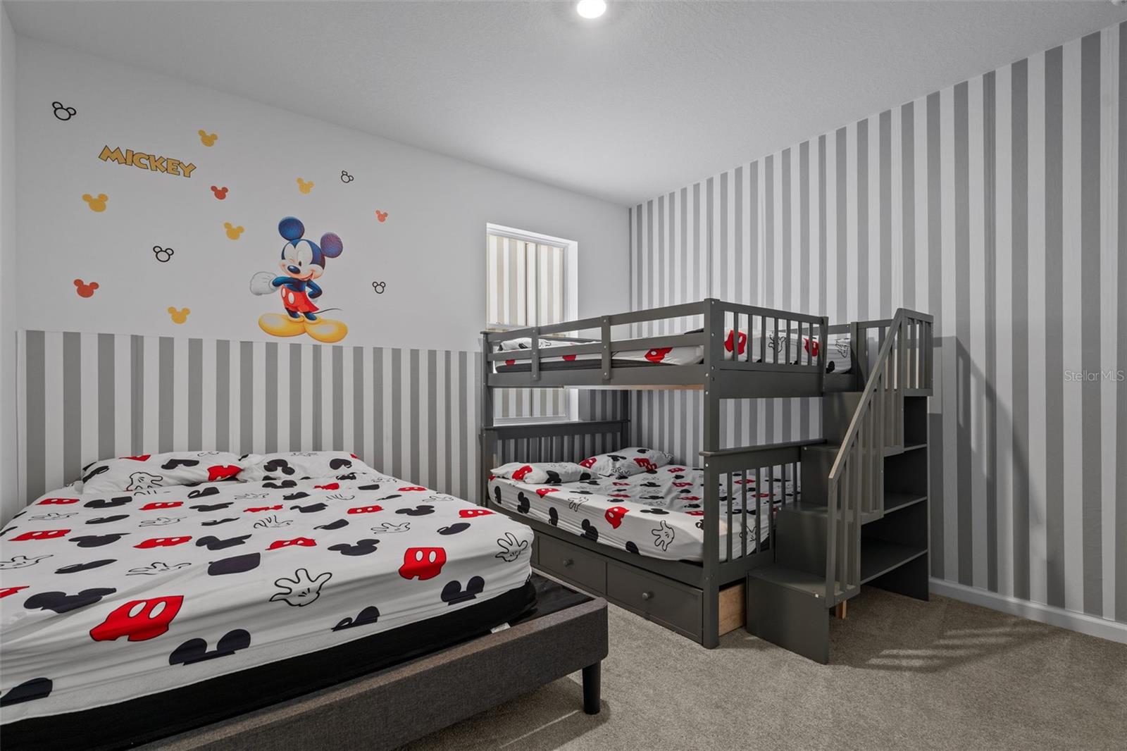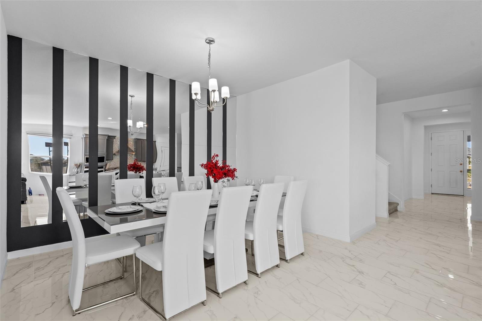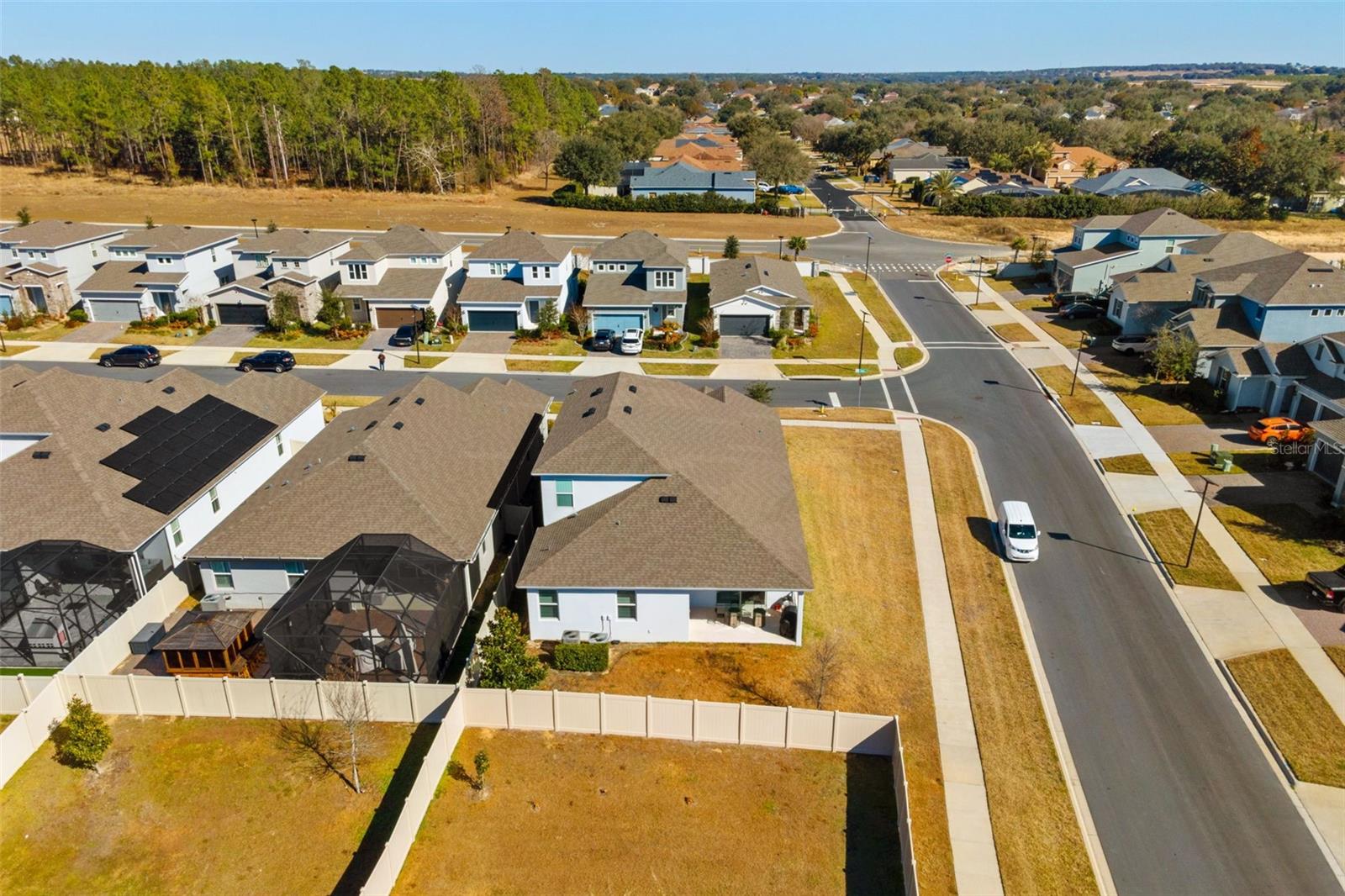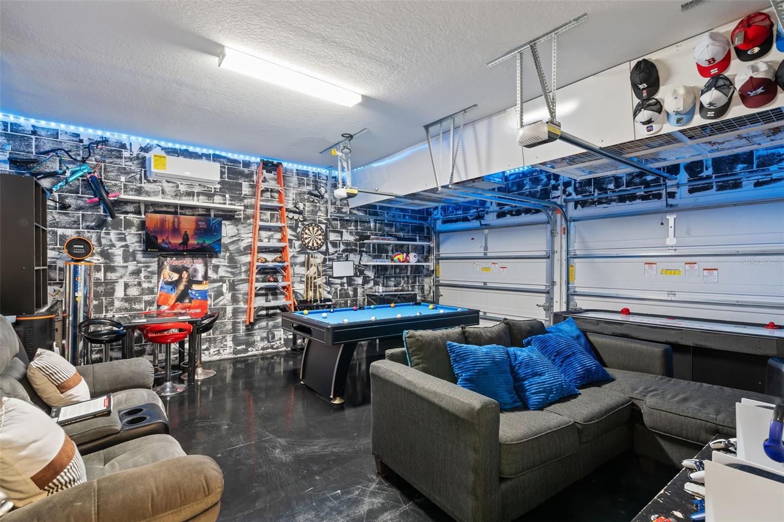 Move-in-ready 5-bedroom, 3.5-bath home located in HARTWOOD LNDG, featuring great curb appeal, a paver driveway, and a welcoming covered front porch. Inside, enjoy a bright open-concept layout with oversized tile flooring, recessed lighting, and a spacious living area that flows seamlessly into the kitchen—perfect for entertaining. The chef-style kitchen offers a large granite island with bar seating, gray cabinetry, stainless-steel appliances, designer backsplash, and built-in oven/microwave. Sliding glass doors lead to a covered lanai and a fully fenced backyard for privacy and outdoor enjoyment. Upstairs includes a generous loft/bonus room ideal for a media room, playroom, or second living space. The primary suite is spacious with a modern accent wall and an en-suite bath with dual sinks, granite counters, and a glass-enclosed shower. Dedicated laundry room included. Plus, a converted garage game room adds extra space for fun and entertaining.