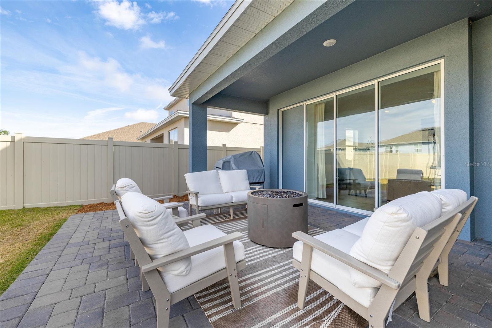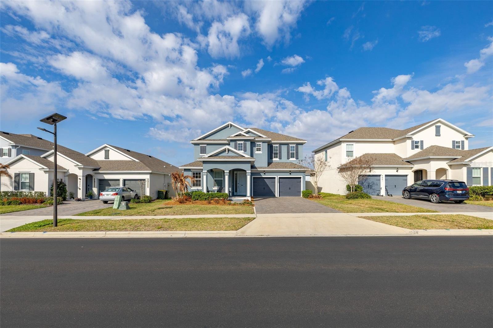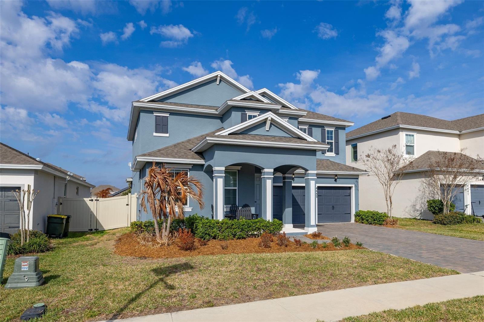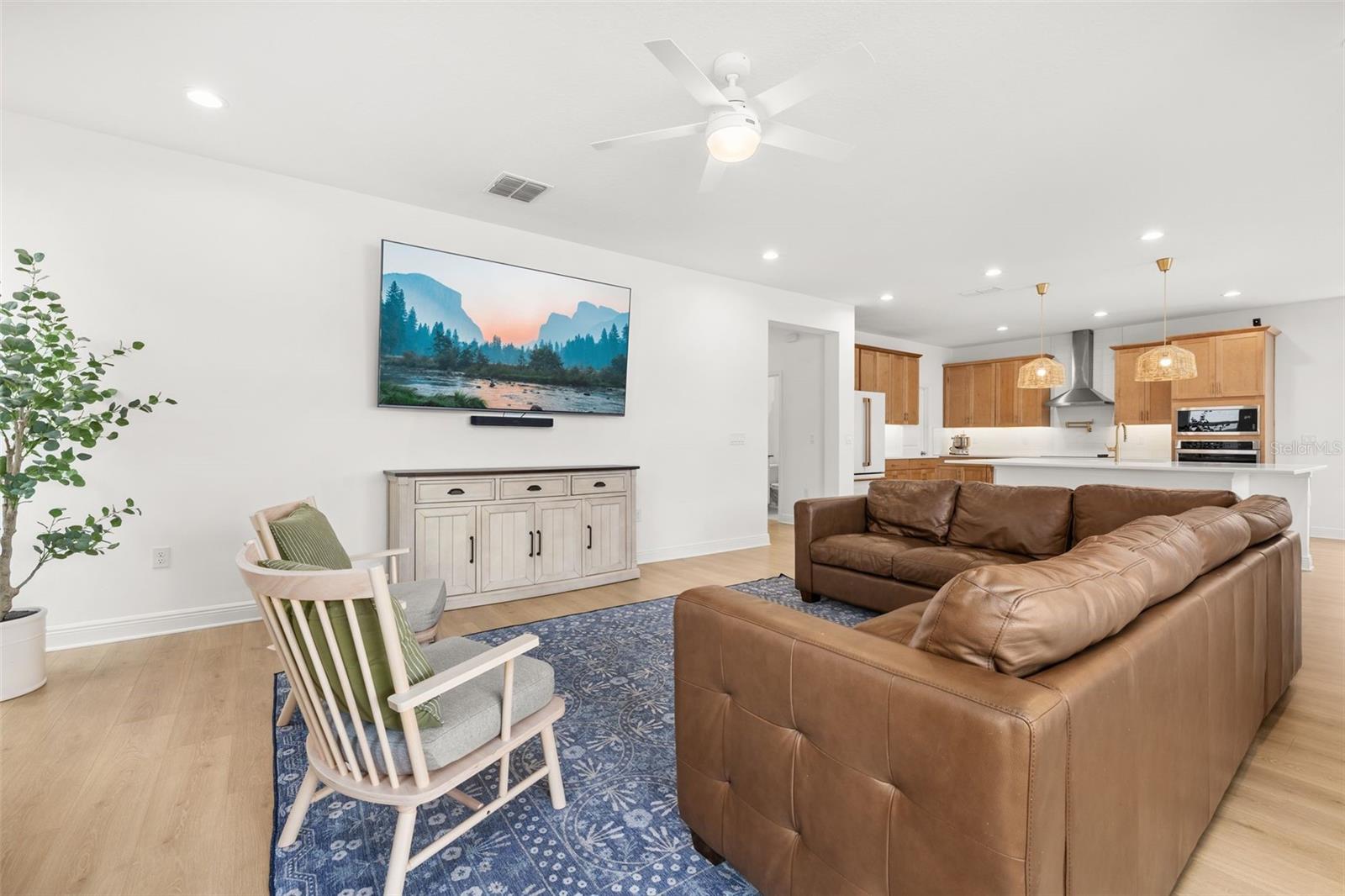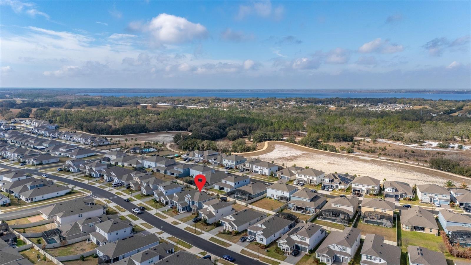 Immaculate 2023-built 4-bedroom / 3-bath home that shows like new, offering a bright, fresh, and inviting atmosphere filled with natural light throughout. The kitchen is thoughtfully designed for both style and function, featuring warm-toned 42” cabinetry, an oversized quartz island, and a convenient water pot filler above the cooktop—perfect for cooking with ease. The stunning GE Café Series white refrigerator with gold accents pairs beautifully with the upgraded gold-tone hardware and finishes. A spacious walk-in pantry provides excellent additional storage. Luxury vinyl plank flooring runs throughout the first floor, while upgraded carpeting adds comfort upstairs and in the bedrooms. The home features a spacious two-car garage complete with an electric vehicle charging station and additional overhead storage. Central vacuum in the garage adds everyday convenience. The downstairs bedroom and a full bathroom provide the perfect setup for hosting family and friends. Upstairs, a versatile loft area offers the ideal space for a home office, media room, or flex space. The primary suite provides a peaceful retreat with a serene ensuite bathroom featuring a standalone soaking tub, separate shower, and crisp, modern finishes. Two additional well-sized bedrooms share a Jack-and-Jill bathroom. Sliding glass doors open to a covered, pavered patio—perfect for year-round enjoyment. A 6-foot privacy fence surrounds the sizable backyard, which offers ample space to add a pool if desired. Residents enjoy a cabana-style community pool and dog park. Ideally located near Highways 27 and 50 with ample shopping/dining options, including the new Clermont Costco, as well as near Lake Louisa State Park, the Olympus Project, and just about 30 minutes to Disney parks. This home is truly move-in ready and waiting for you.