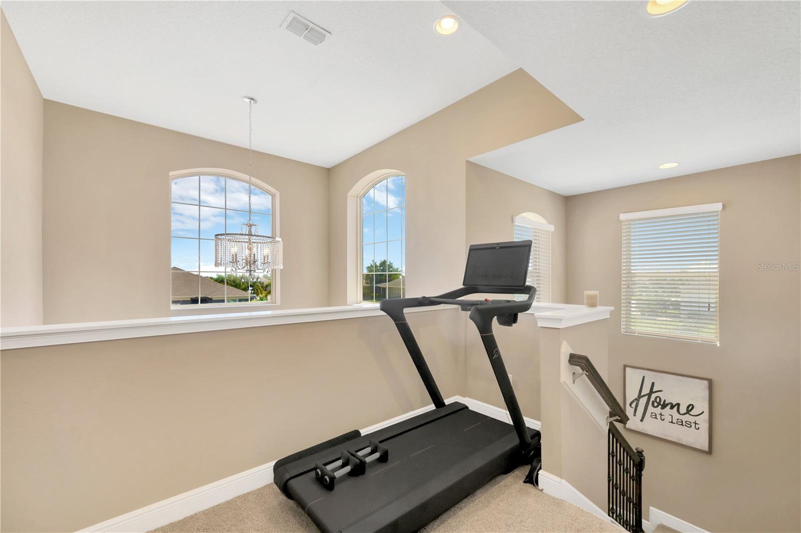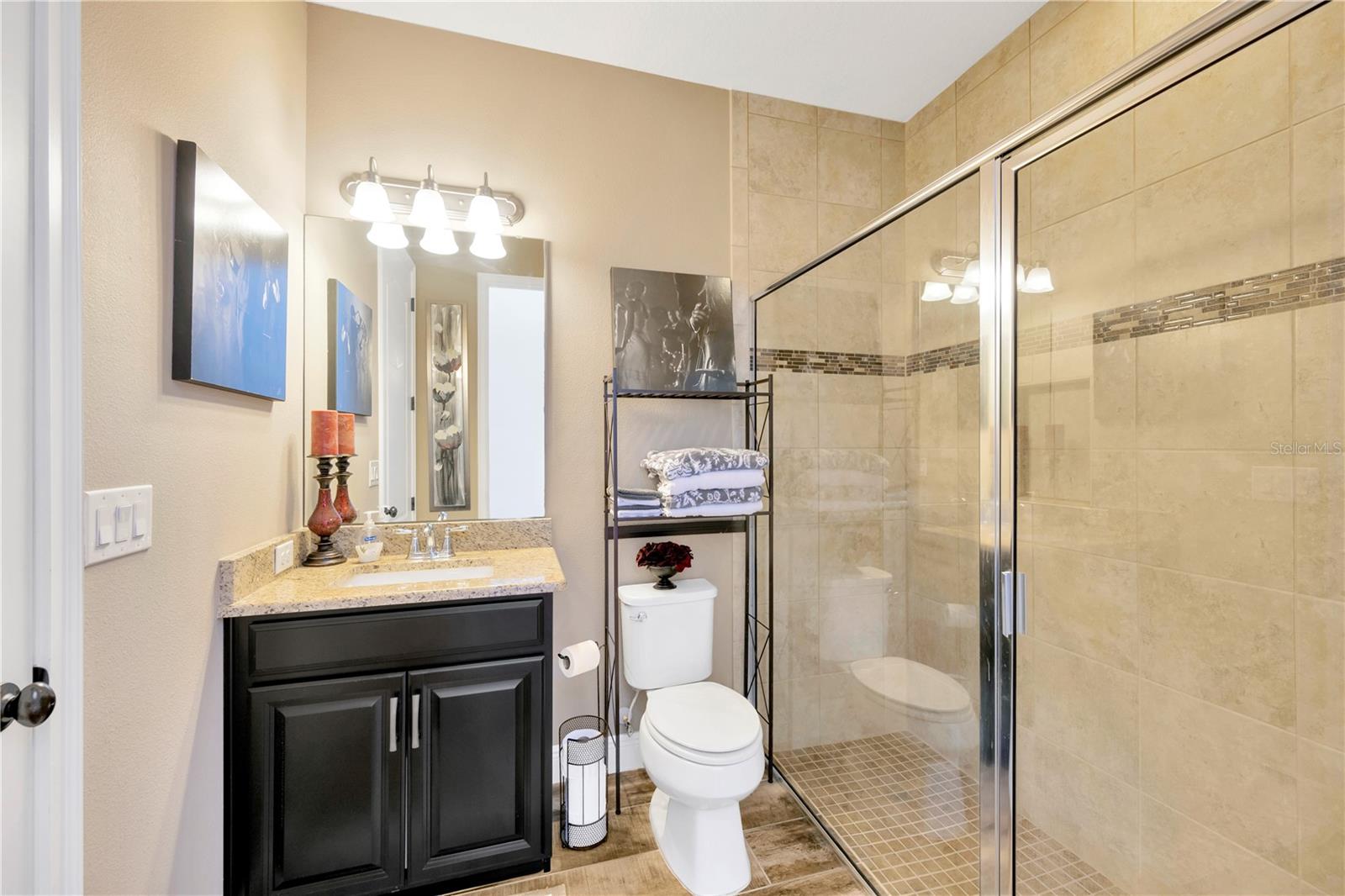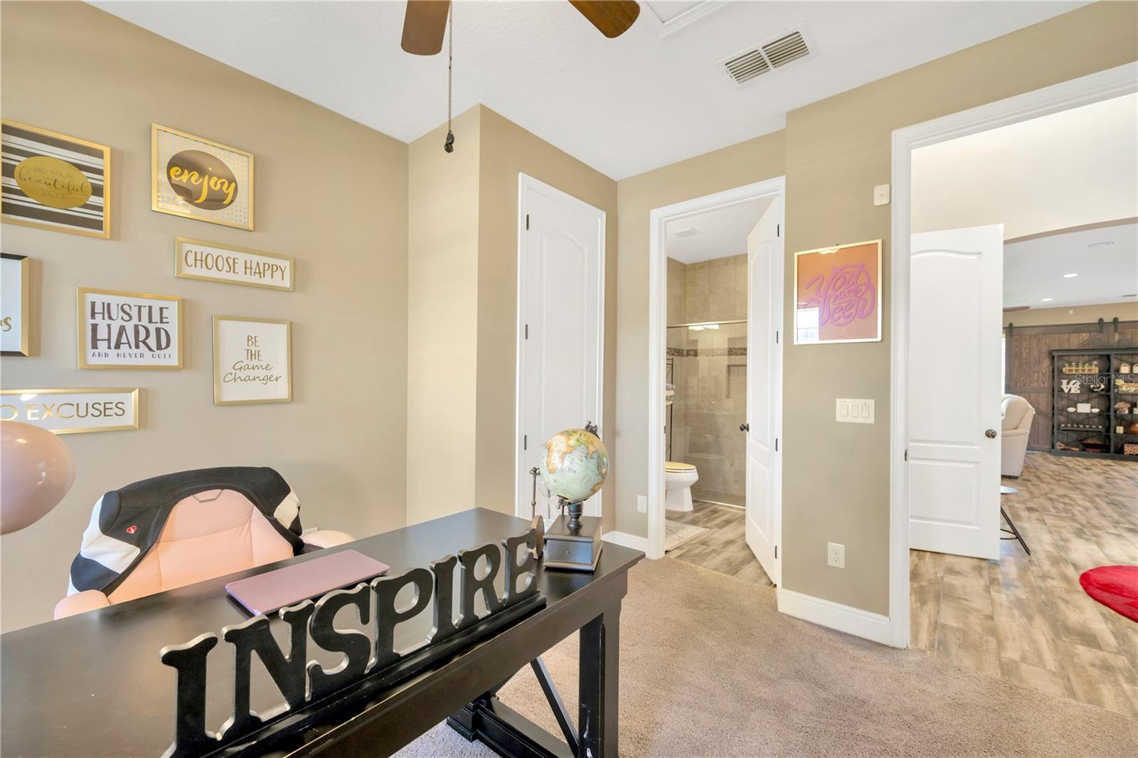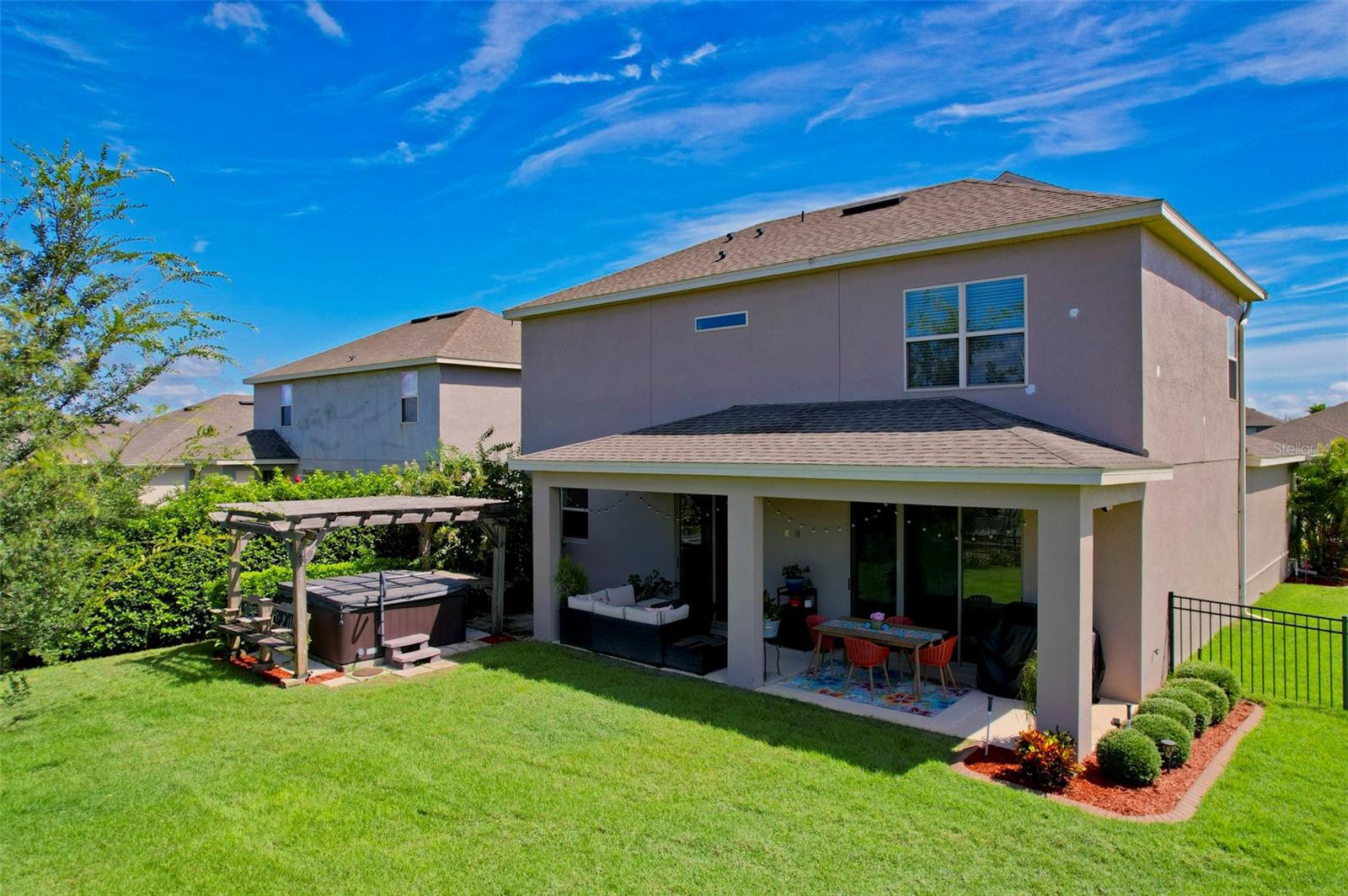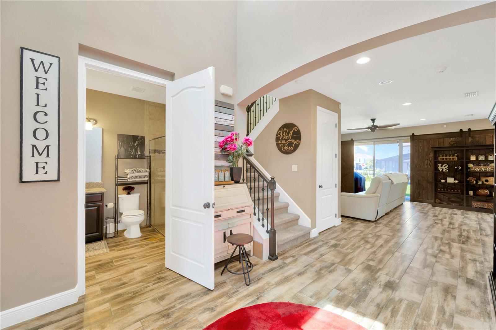 Welcome to this charming home in Highland Ranch, set on an oversized corner lot that offers both tranquility and fantastic curb appeal. As you step into the grand foyer, you'll be welcomed by an abundance of natural light from above. The open-concept kitchen, dining, and living area is perfect for spending time in the heart of the home. The kitchen features elegant espresso cabinetry, a spacious island with plenty of storage, and a gas stove. An added bonus is the downstairs bedroom with an ensuite bath, which can be used as an office or a versatile multi-purpose room. Heading upstairs, you'll notice the stylish iron spindles along the staircase and the cozy loft area at the top, perfect for a reading nook. The primary suite is a private retreat, offering ample space and a beautifully tiled shower that's perfect for a relaxing escape after a long day. Outside, you can unwind under the covered lanai or relax in the jacuzzi, complete with a pergola for shade. The community offers an amenity center with a large swimming pool coupled with a splash pad for little ones, perfect for cooling off on hot days. Enjoy other outdoor activities including a playground, basketball court, and an outdoor fire pit. There's even a dog park for your furry friends. Just outside the main entrance, you'll find a local trail ideal for rollerblading, biking, walking, or running. Nearby, you'll find shopping and dining options in Historic Downtown Clermont, and while you're there, be sure to visit the fabulous Waterfront Park. Enjoy the convenience of being in close proximity to Orlando and its theme parks, Winter Garden, and the area airport.