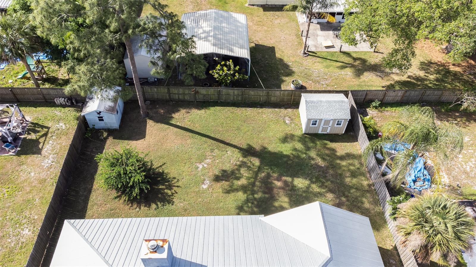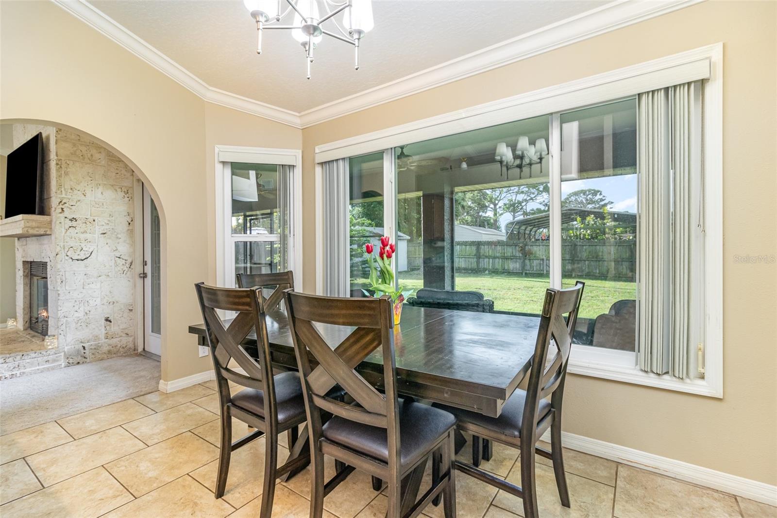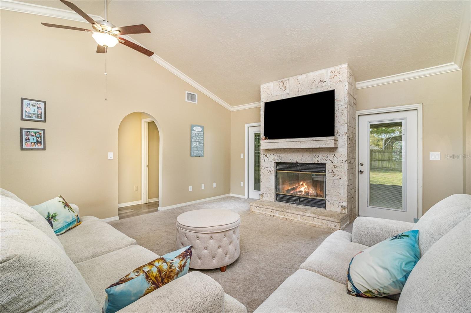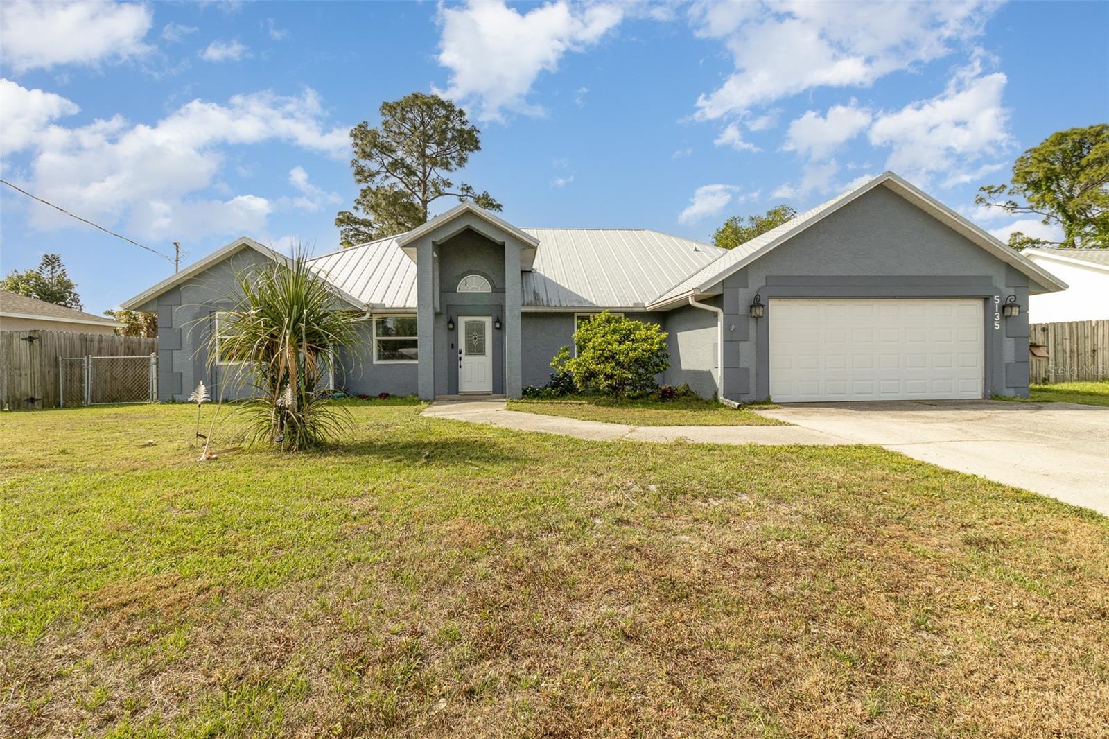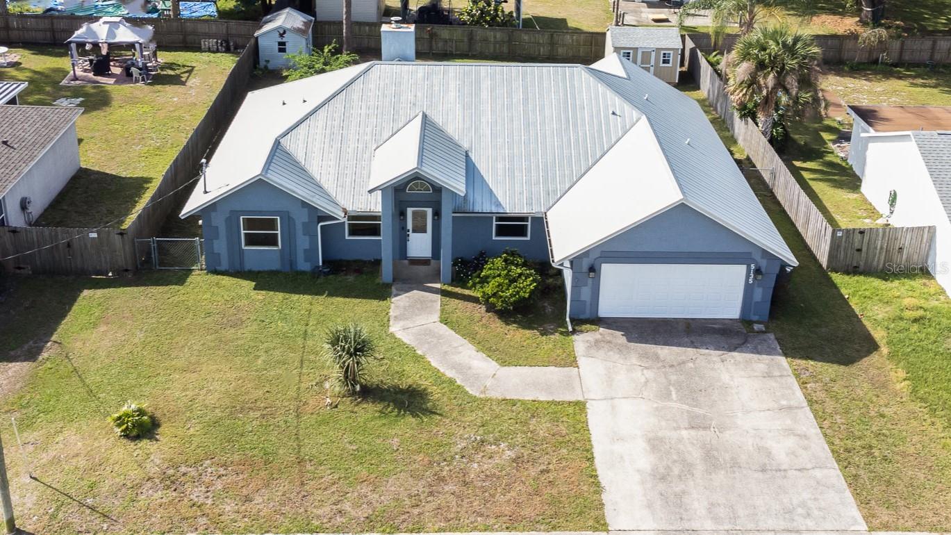Beautiful home boasting numerous special features! Vaulted ceilings accented by crown molding welcome you into light and bright living room centered on stunning coquina stone fireplace. Architectural arches used throughout for soft modern feel. Spacious kitchen, stainless appliances, granite counters, breakfast bar & breakfast nook overlook fenced peaceful back yard. Separate formal dining for entertaining. Sprawling primary bedroom also with vaulted ceilings & private door to screen enclosed back porch. Walk-in closet & bathroom to envy! Double sinks, ample storage, Roll/Walk-in shower PLUS jetted Walk-IN tub with micro exfoliating bubbles and LED lighting. Spacious bedrooms have laminate floors in split plan for privacy, one with direct access to trussed screen porch. Metal Roof and Impact Windows! 2021 AC. Indoor Laundry Room. Central vacuum system. Added bonus of air conditioned out building. Perfect flex space for workshop/crafts, she shed/man cave! Plus Additional storage shed!